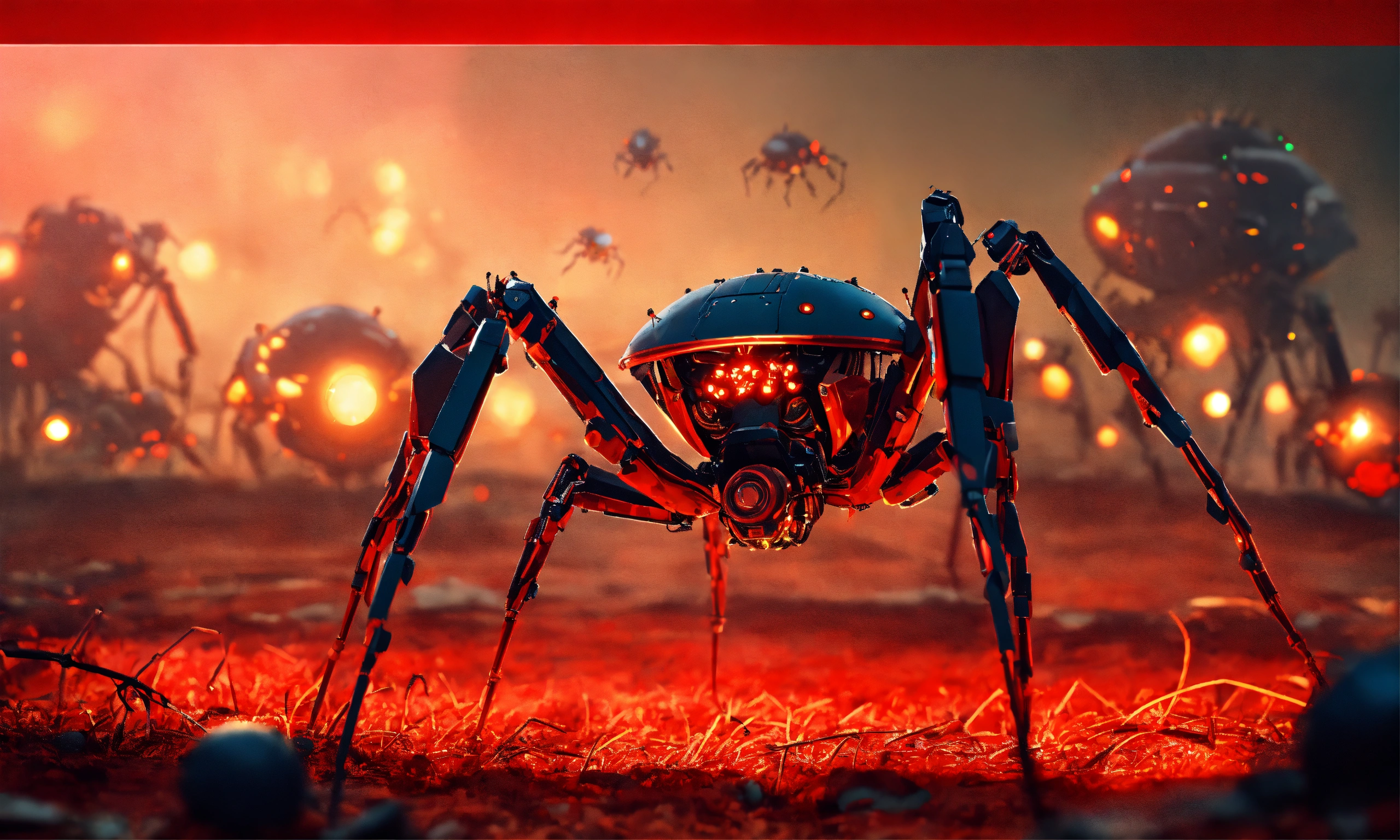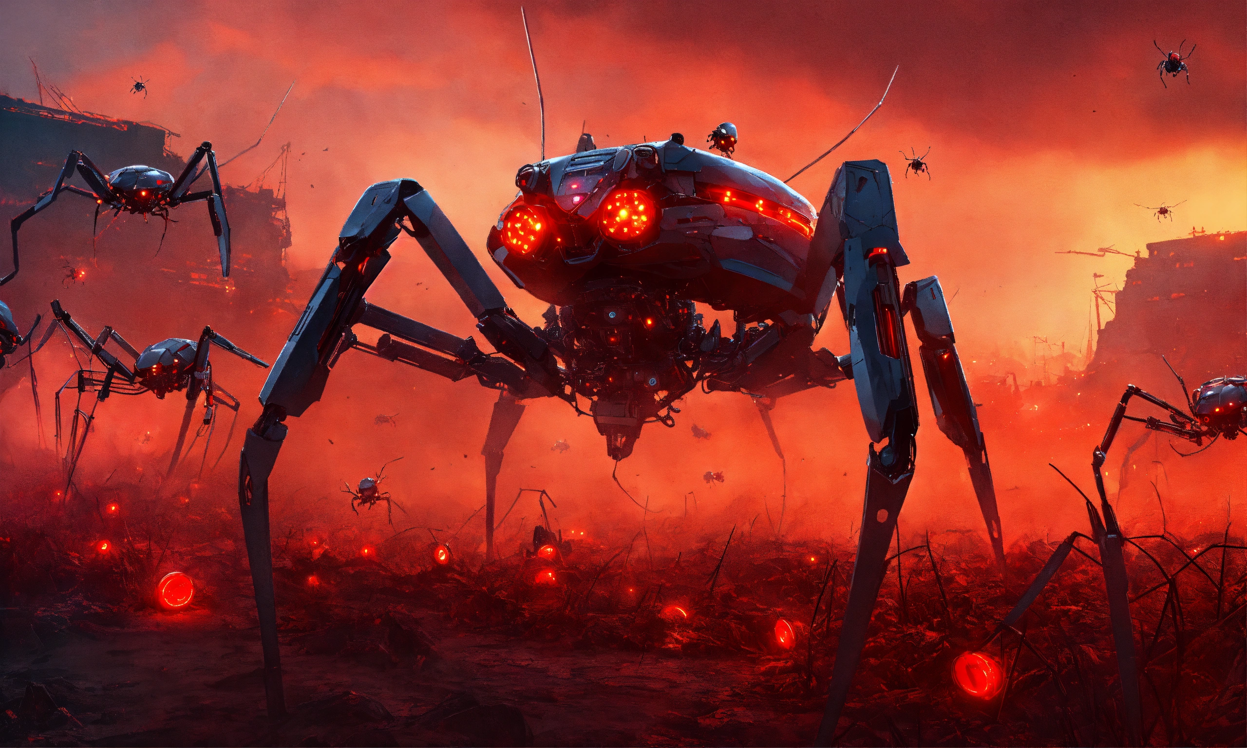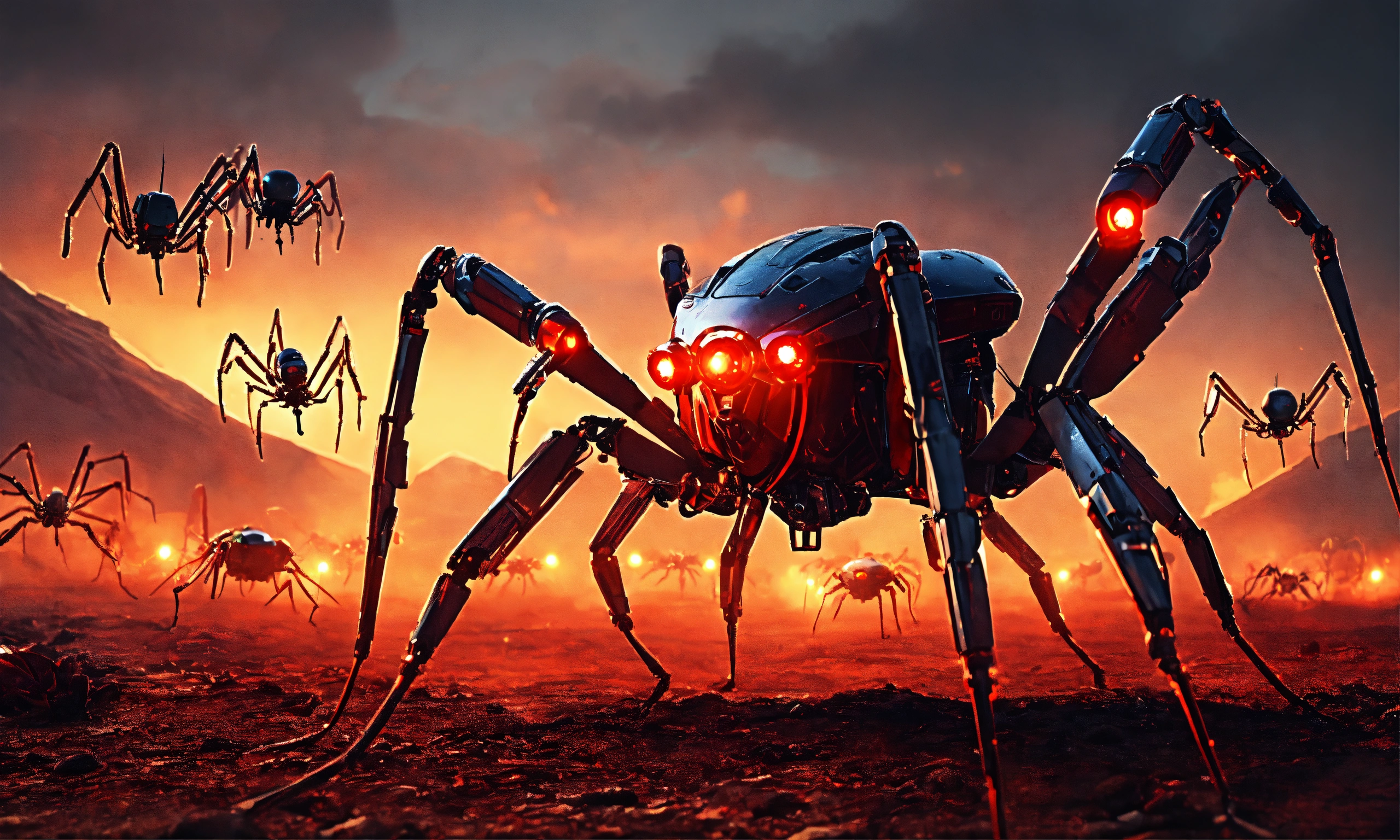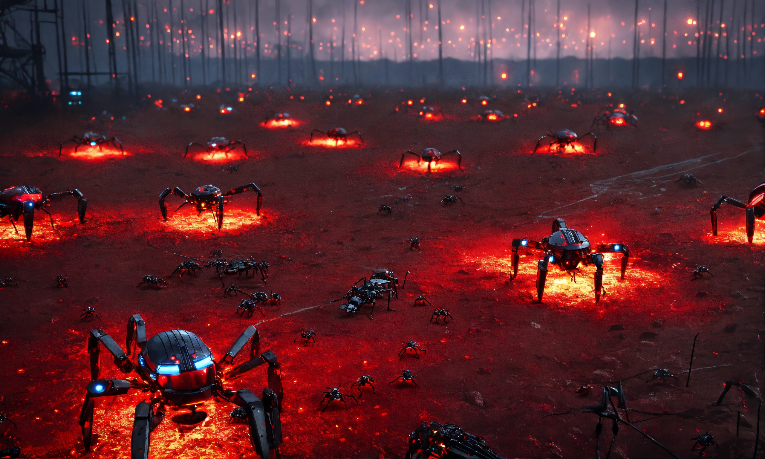 Robotic bug invasion in a wasteland, multitudes, hundreds of mean looking spider bots with red lights and eyes, attack, hi-tech