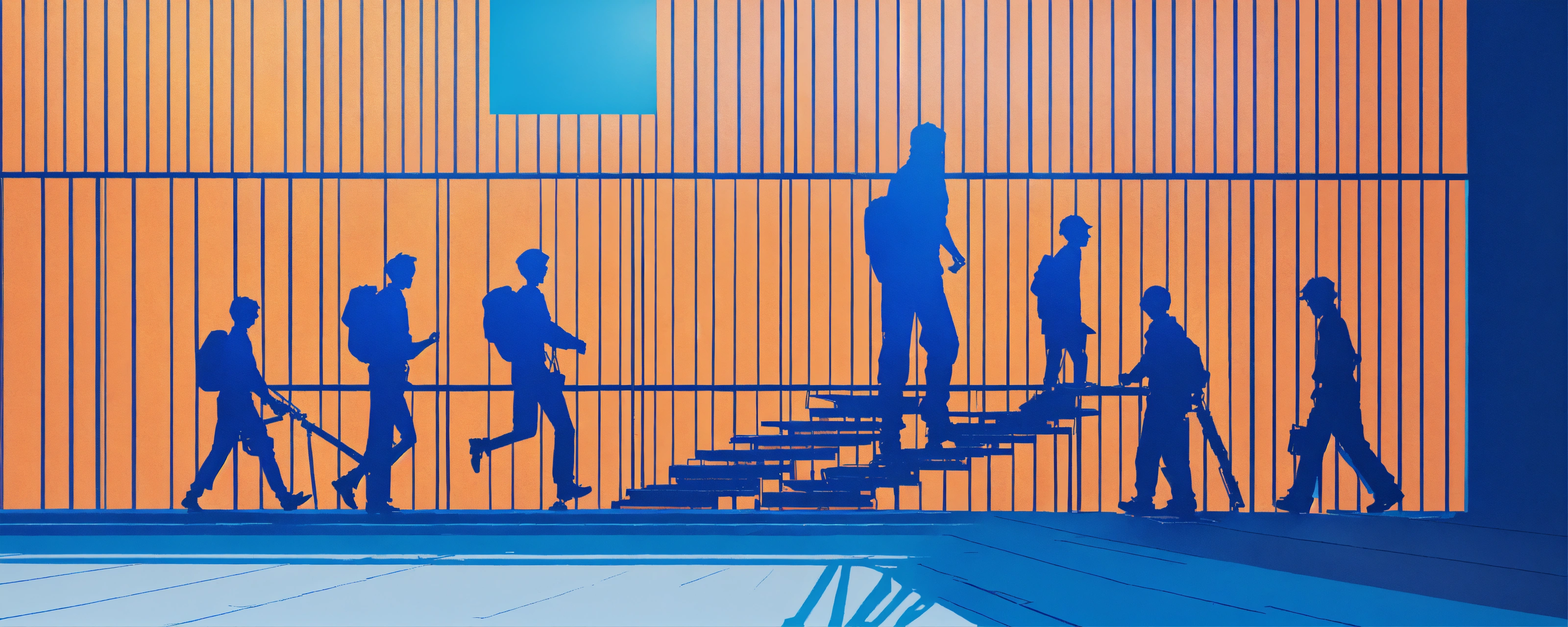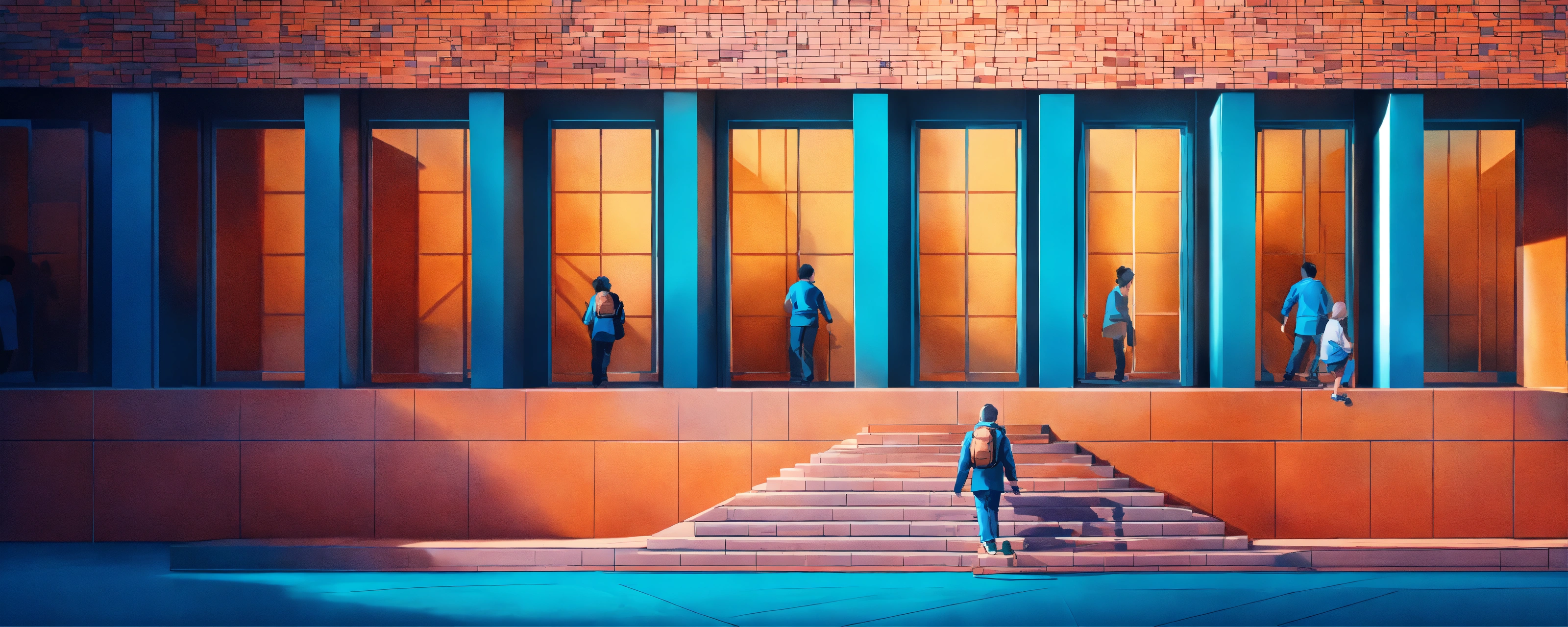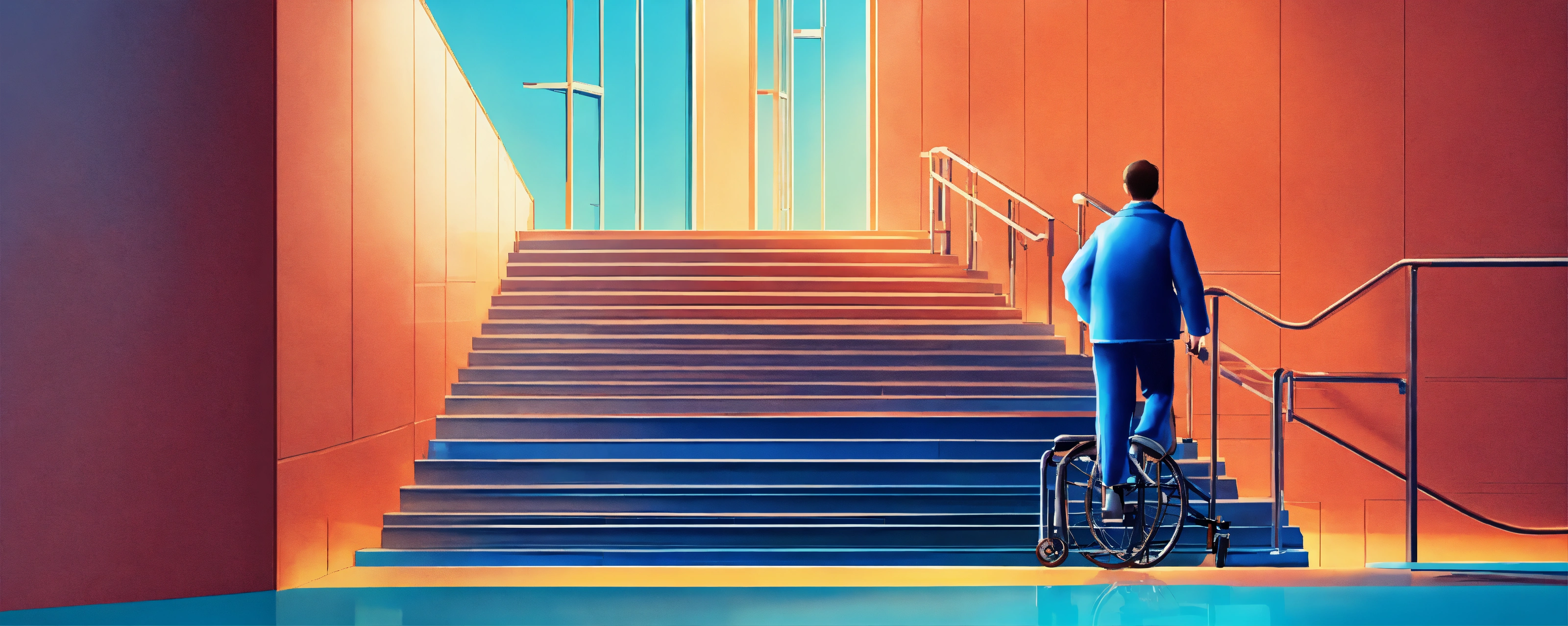 Disabled person climbing the entrance stairs of a school. blue background, shiny texture, gradient from the center. figures with a three-dimensional appearance using shading, light and perspective techniques. colors that contrast with background. clean and modern style. the image that is not very loaded. subtle lighting that enhances three-dimensional figures and adds depth to the image