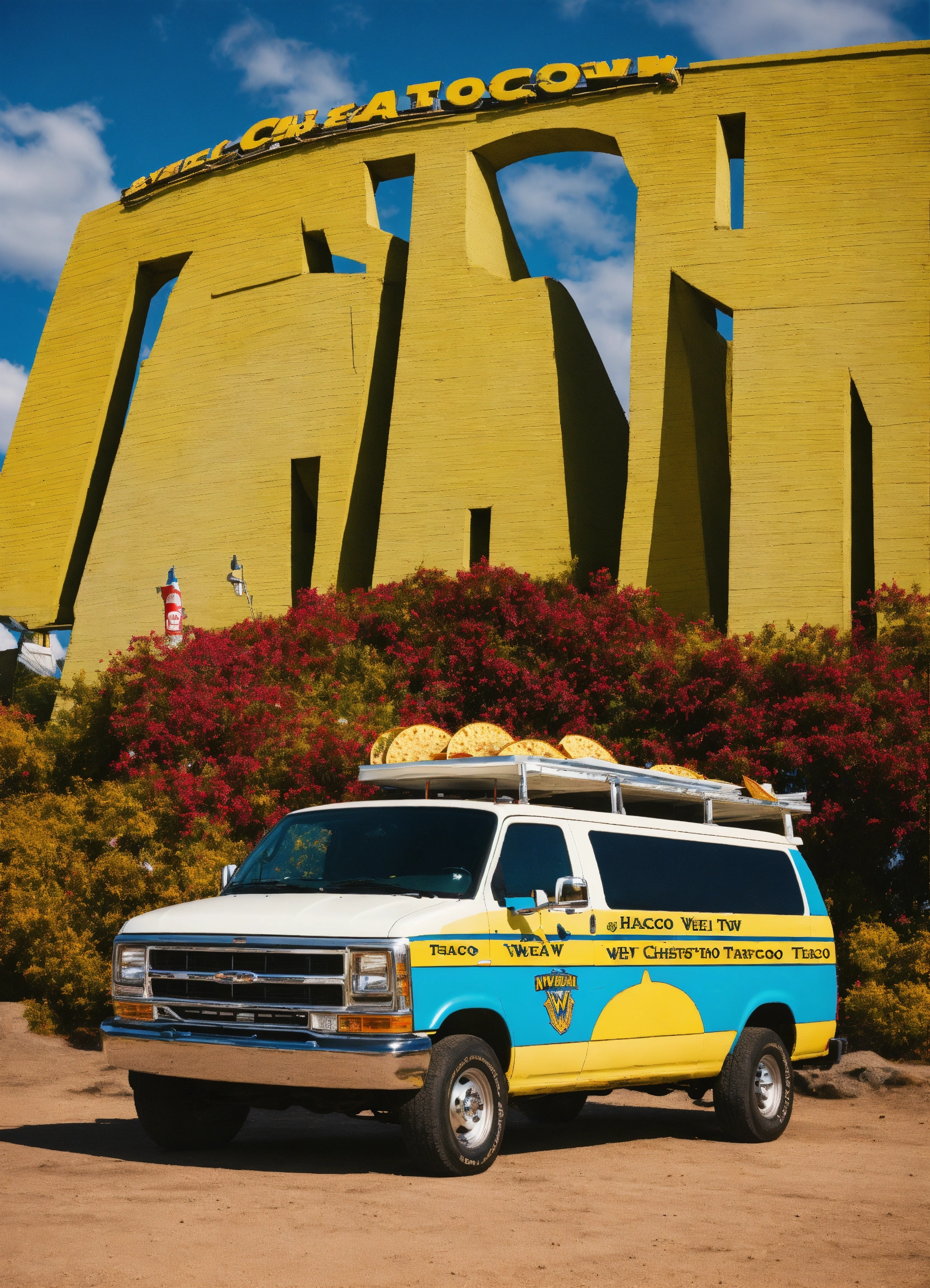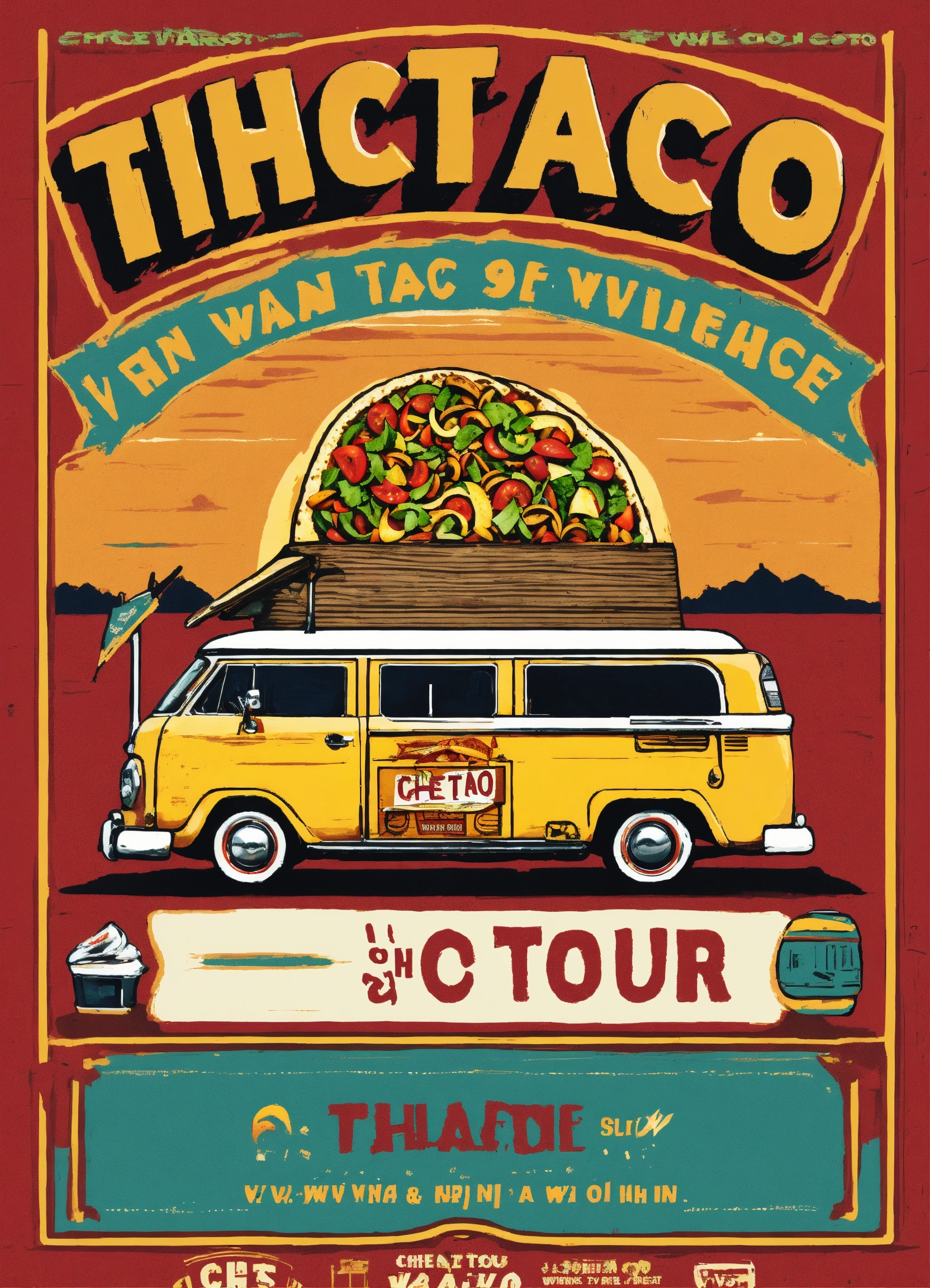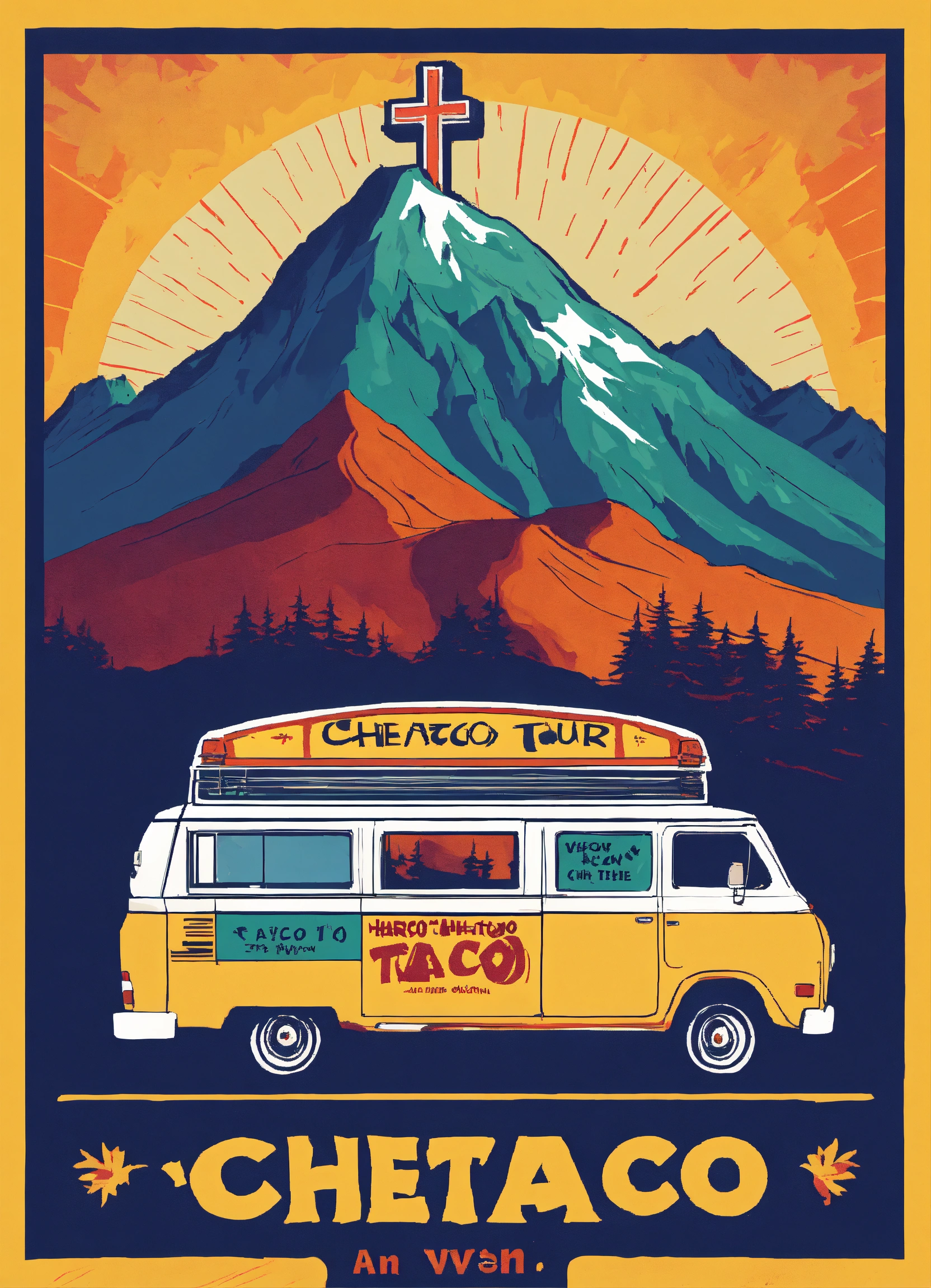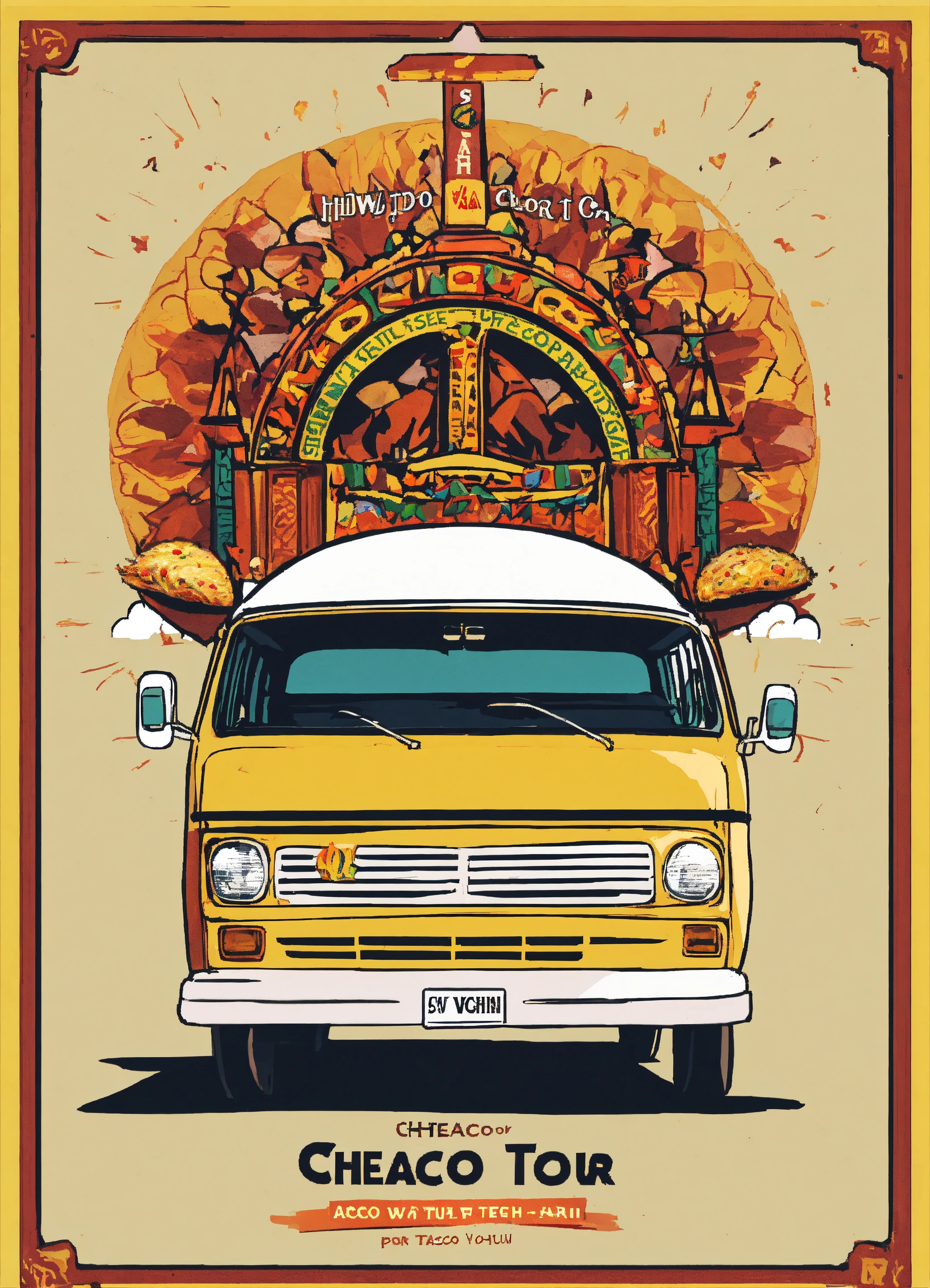 A wv van with a pastor taco on the top and "chetaco tour" text logotype