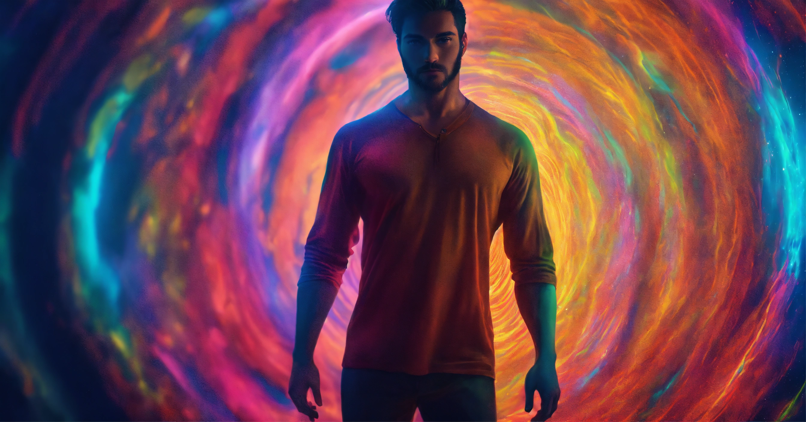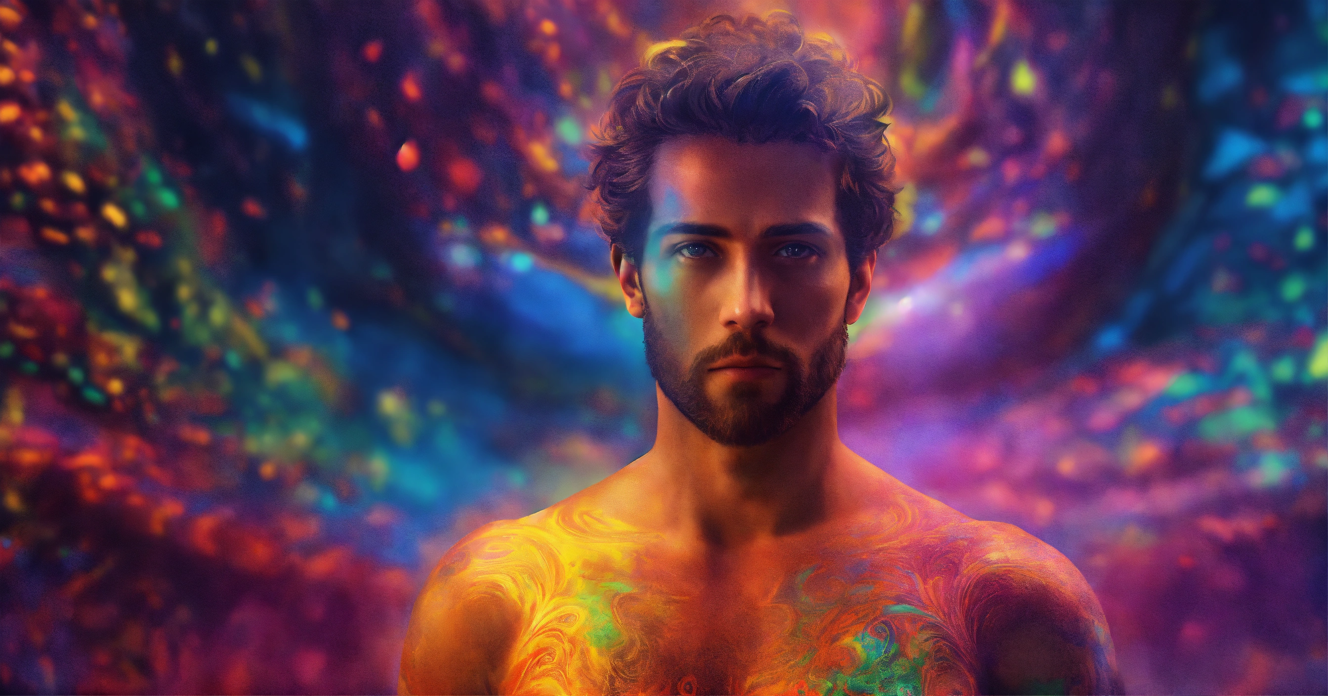 The human soul, well built man standing looking at the camera, soul floating around him, aura, 4k resolution, psychedelic colours, photo realistic