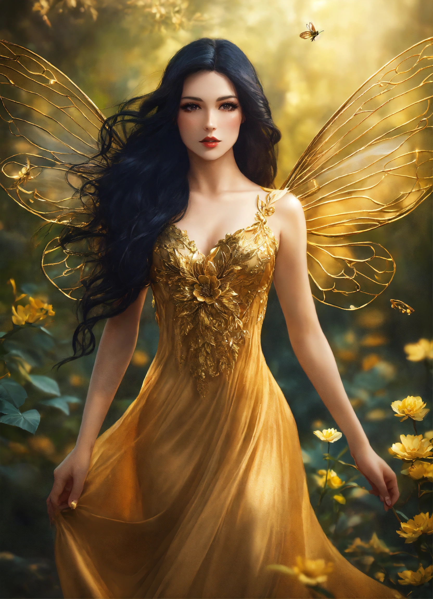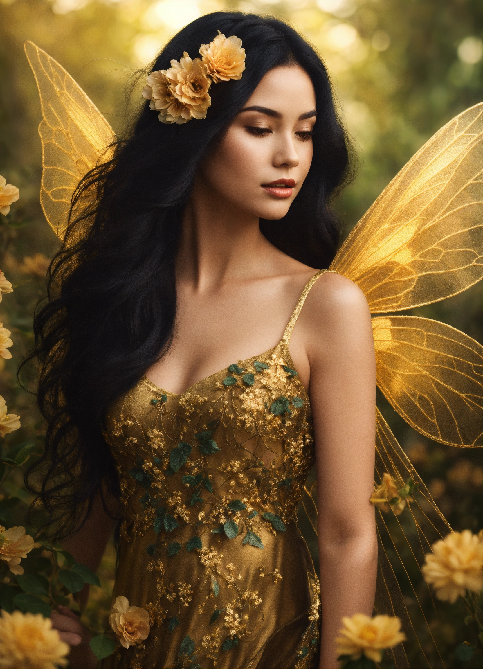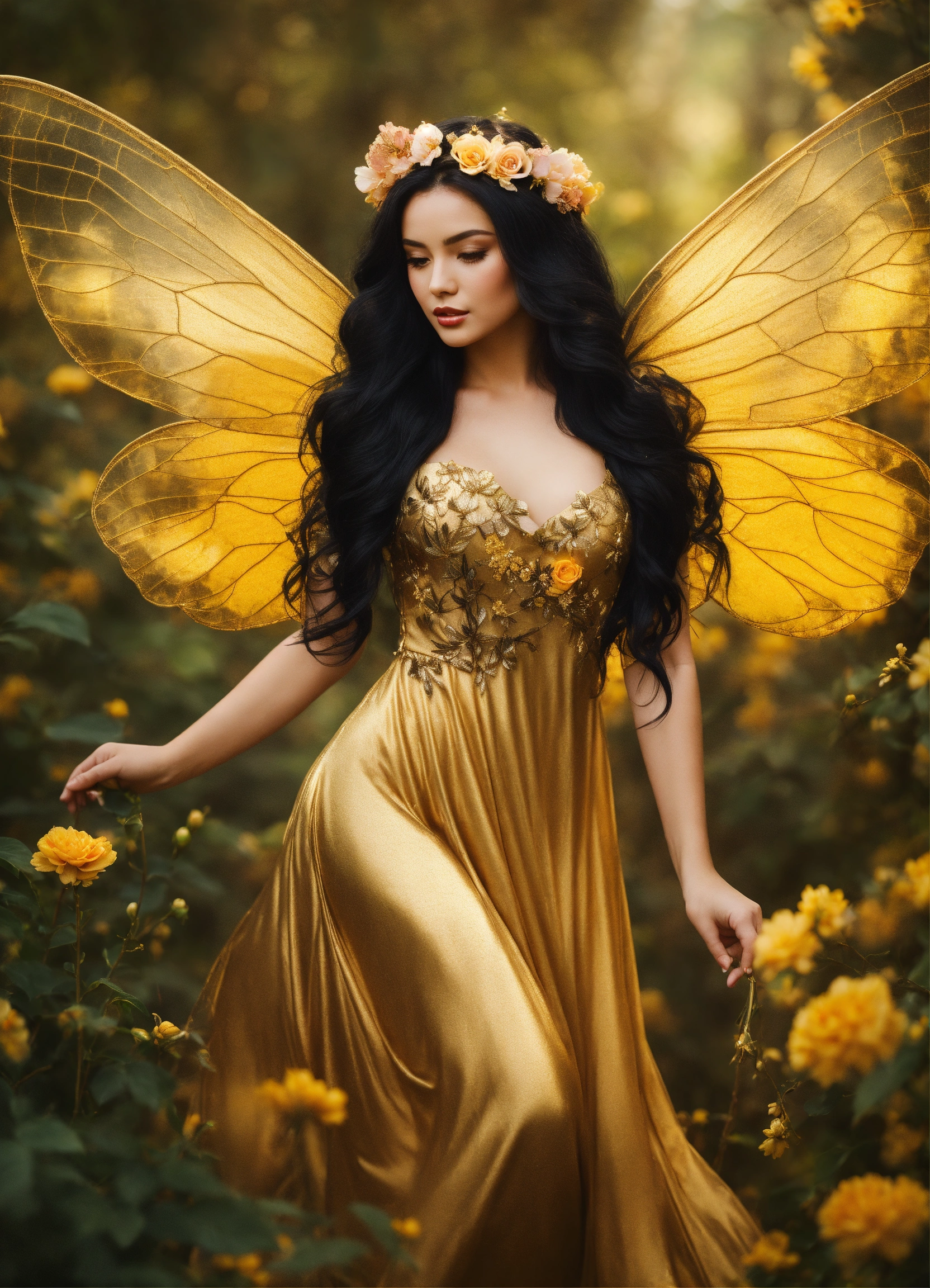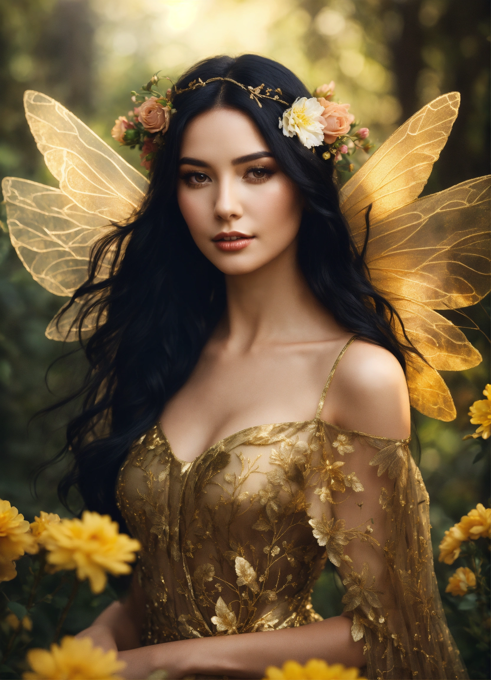 A beautiful shapely brunette fairy woman with gossamer wings long black hair dressed in a gold dress with beautiful flowers and nature around her