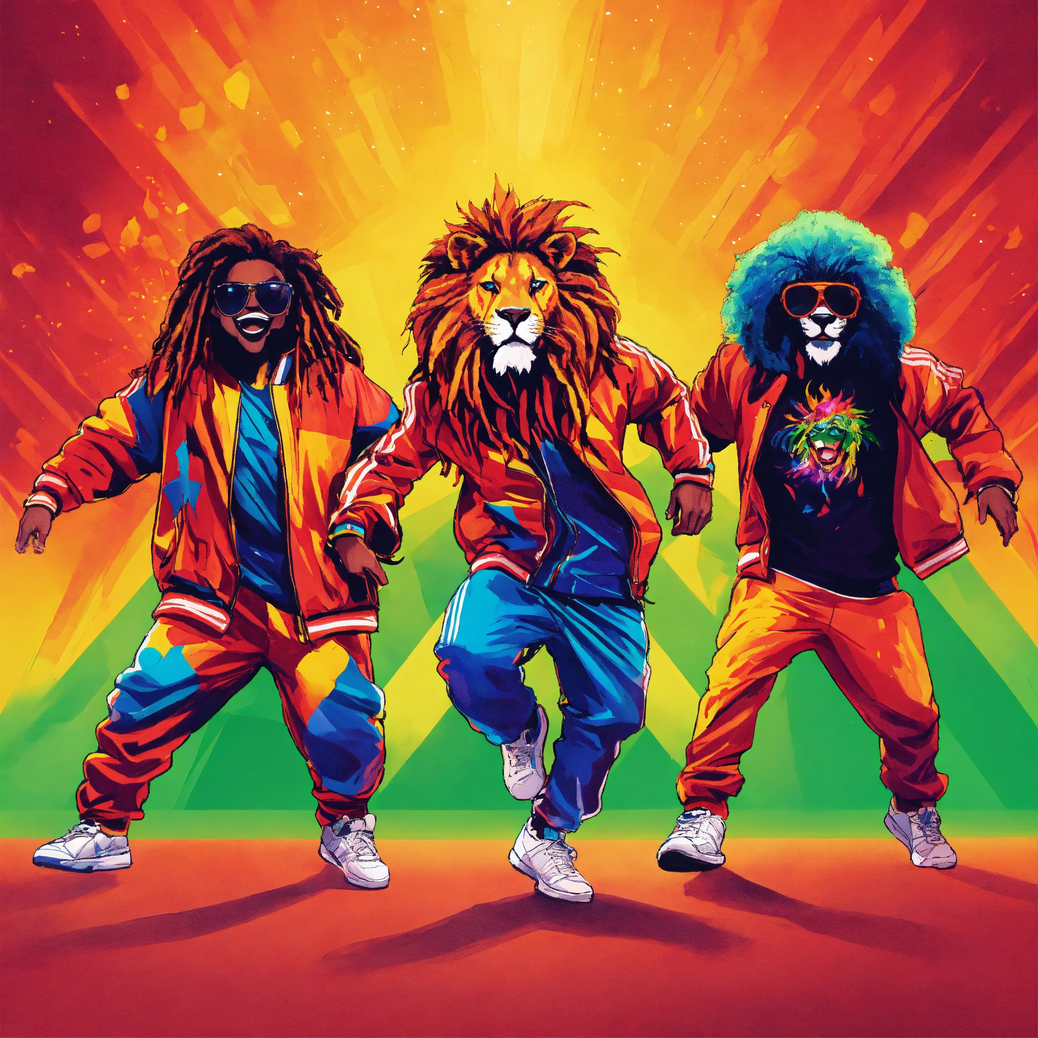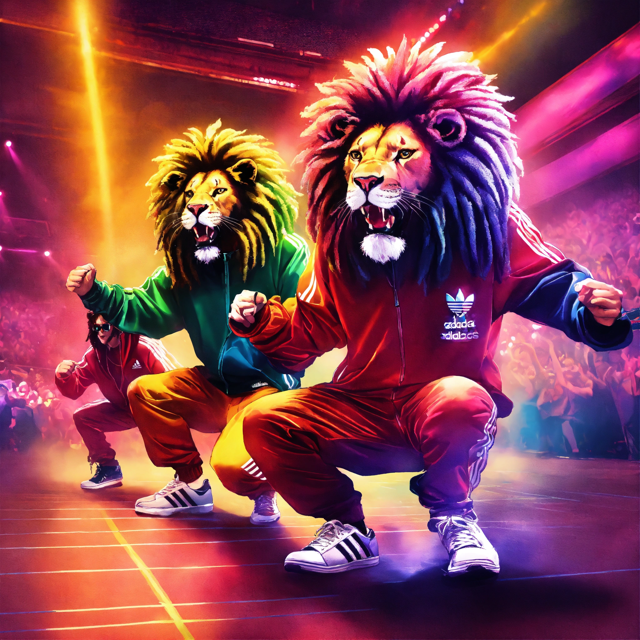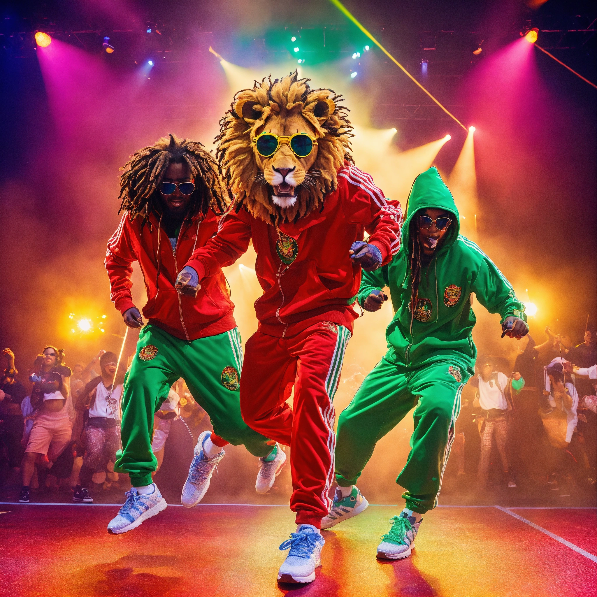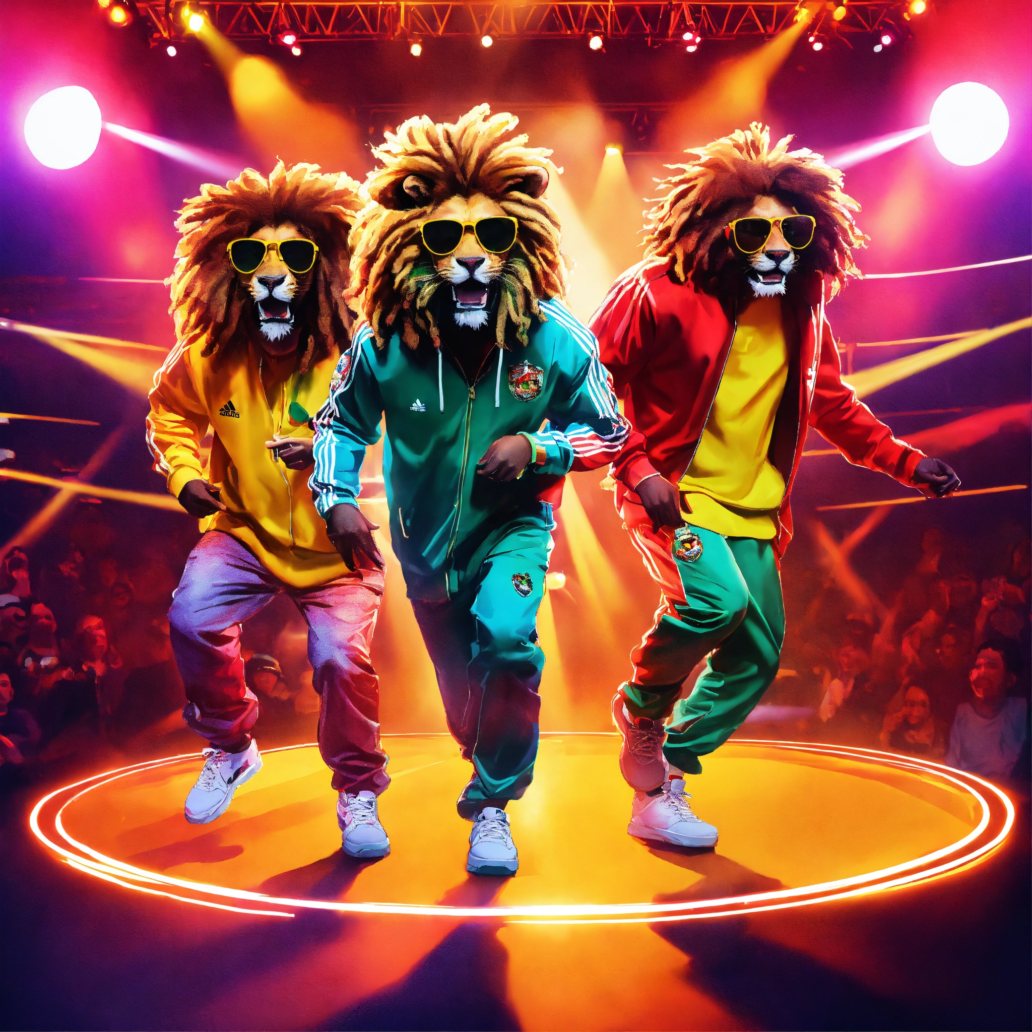 Artistic image type of image illustration prompt description create an electrifying illustration featuring three rasta lions wearing trendy sunglasses, dressed in adidas jumpsuits, showcasing their breakdancing skills like the jabbawockeez on a dynamic stage. the stage will be the focal point, with a massive and exuberant crowd cheering them on. the atmosphere will be filled with vibrant and colorful lights, creating a mesmerizing light show. a hazy mist of smoke will envelop the stage, adding to the energy and excitement.