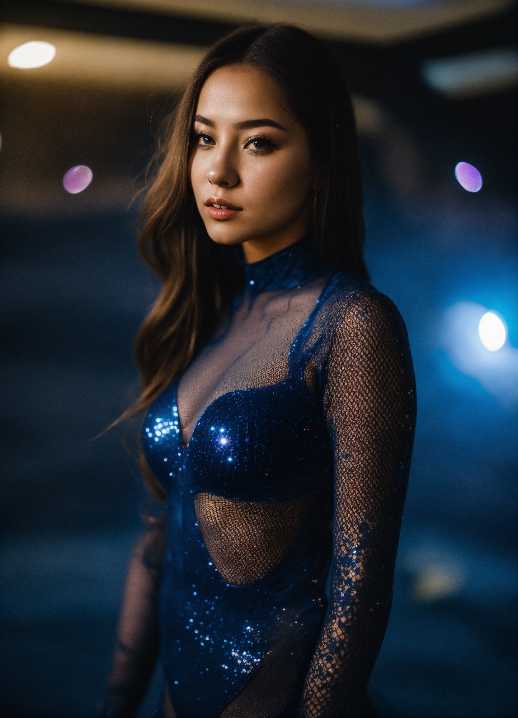 A real photo of a 23 year old girl, she is wearing a dark-blue fishnet catsuit, in the sky we see the galaxy