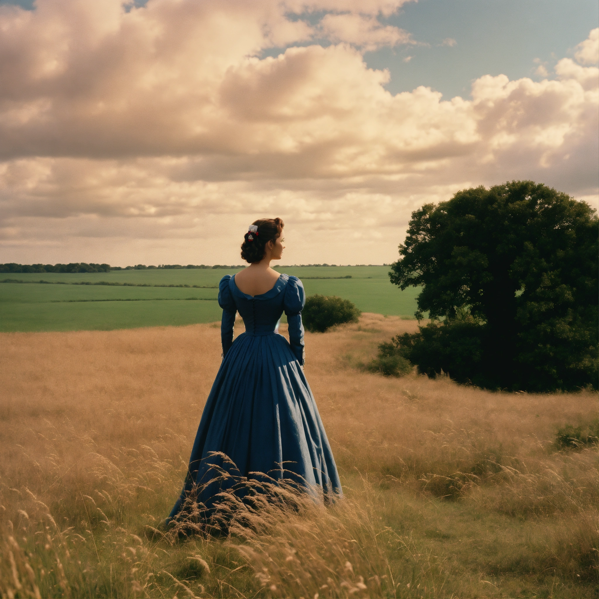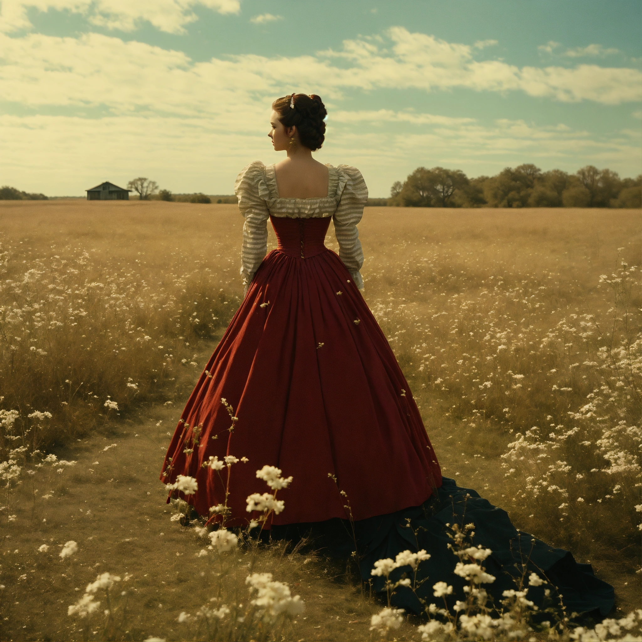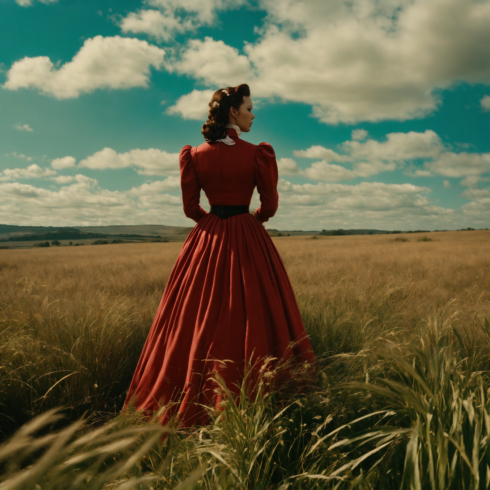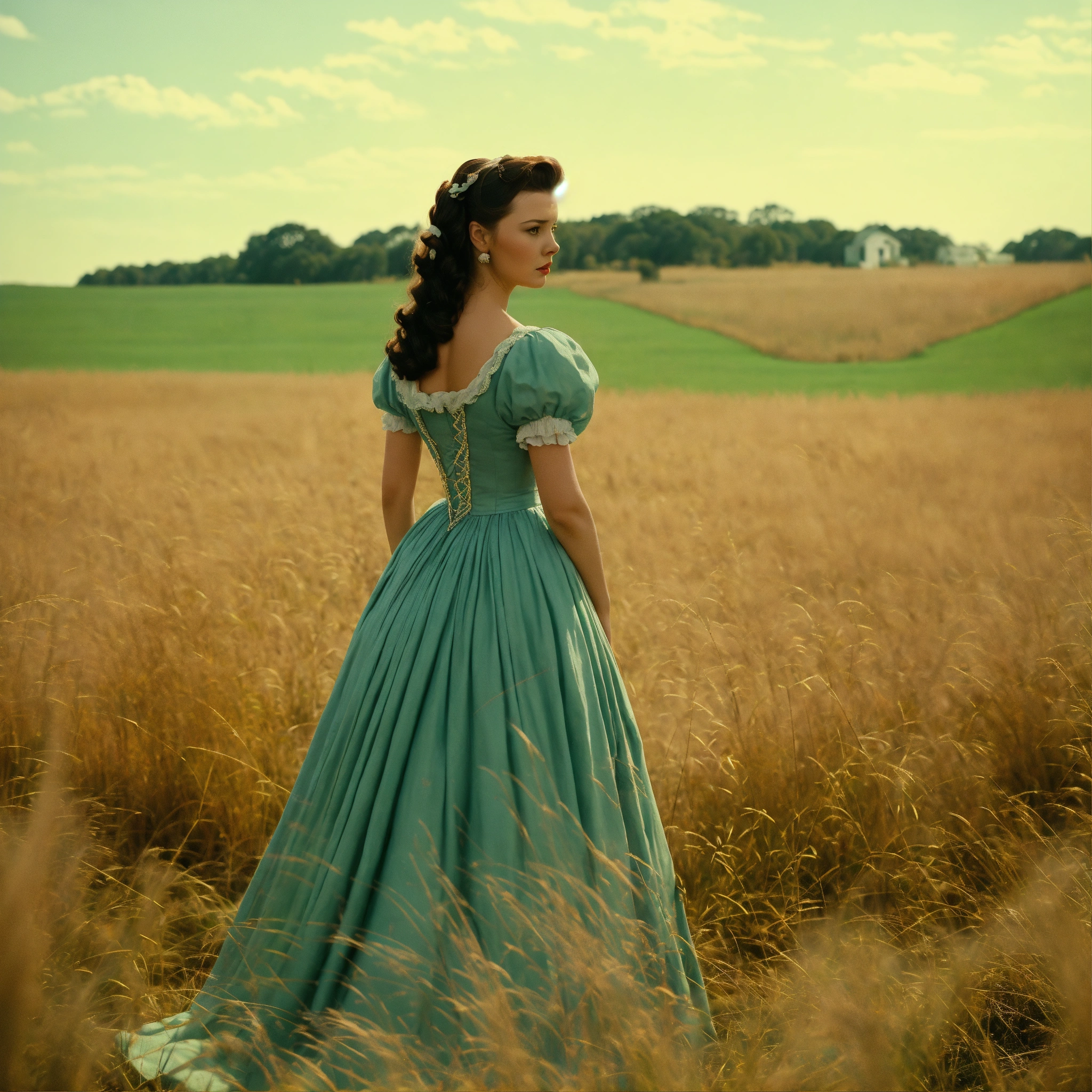 A photographic film still from gone with the wind, scarlett o'hara standing in a vast field, rear view, shot from below, 4k wes anderson colours