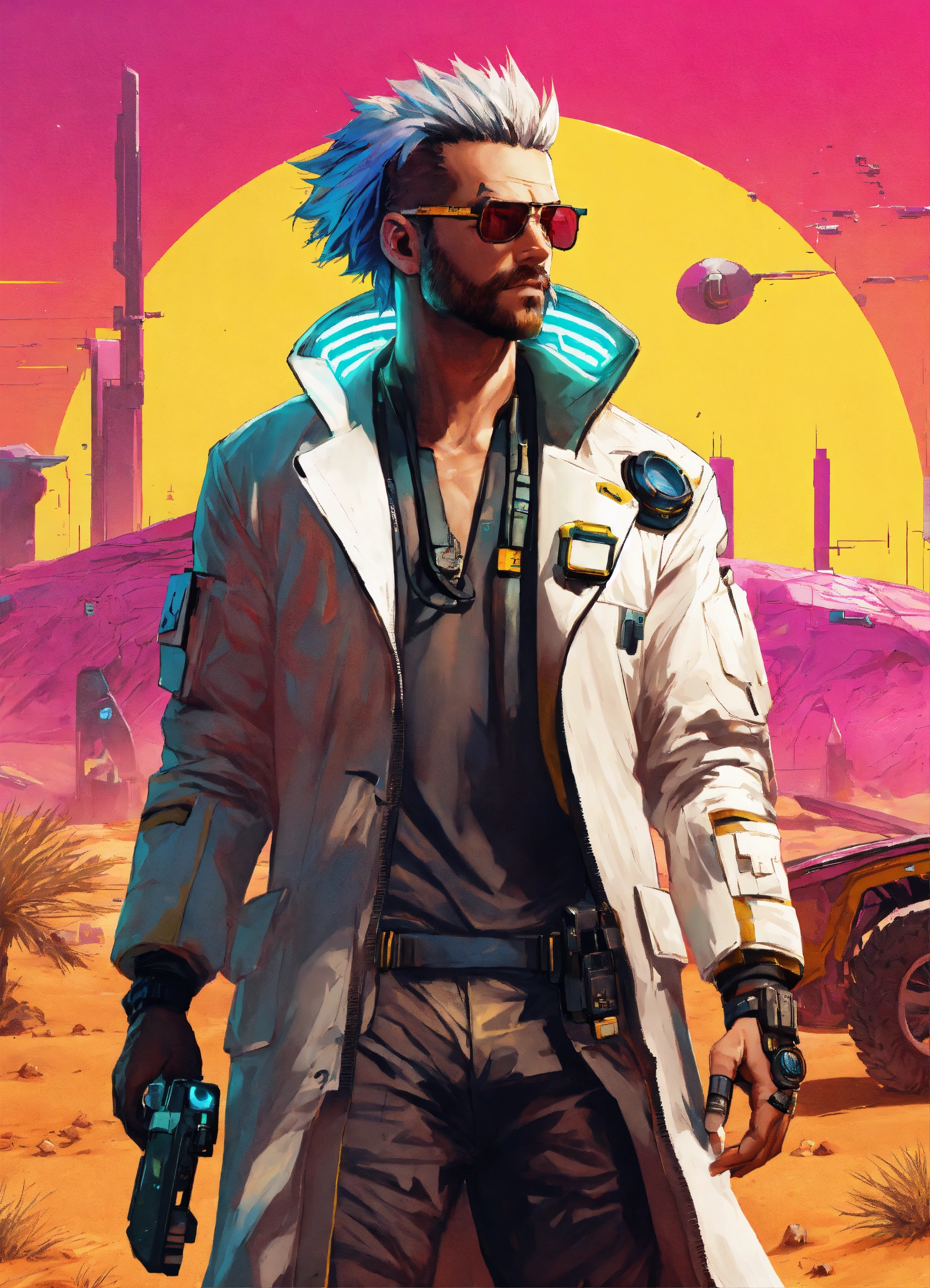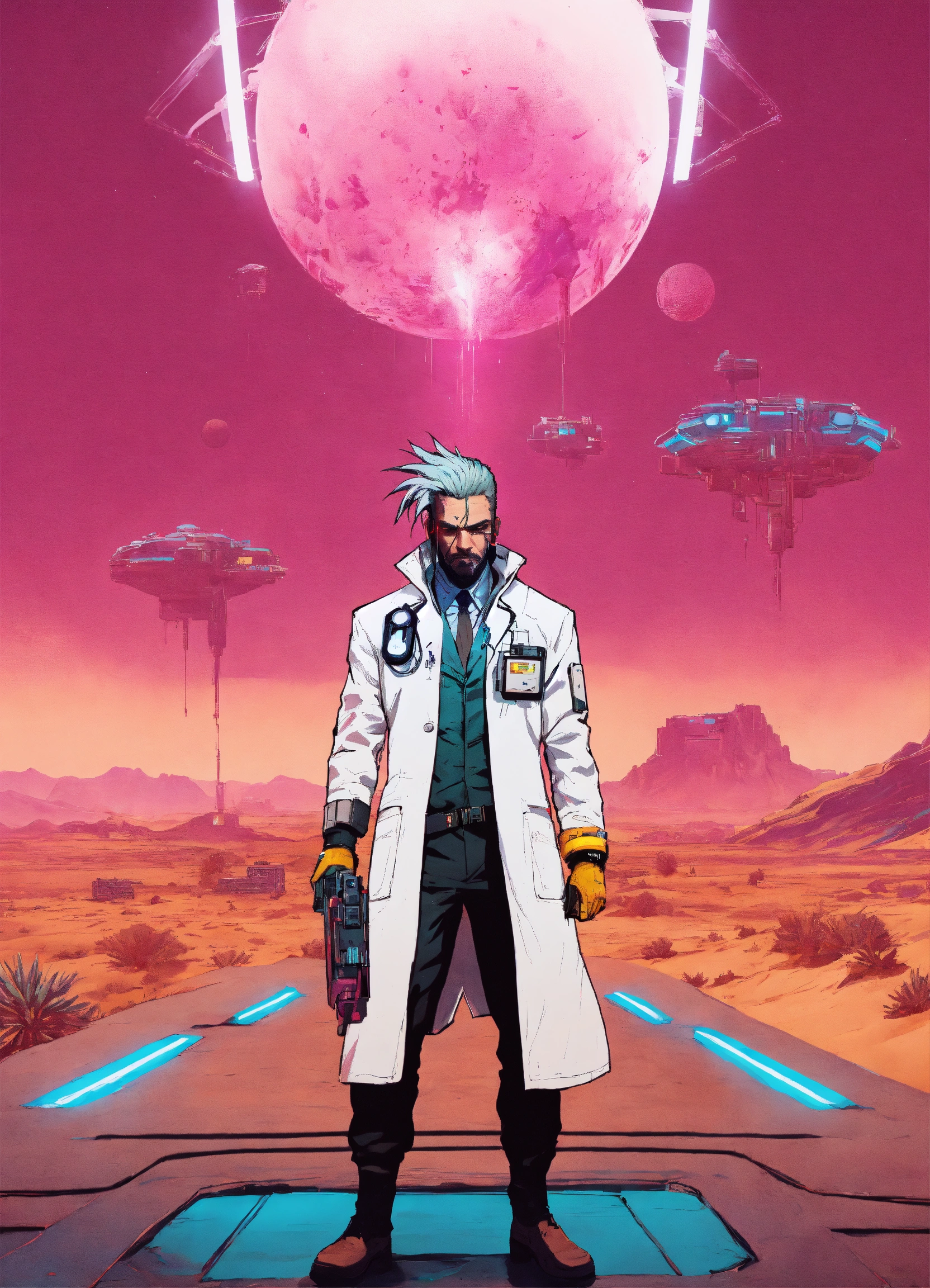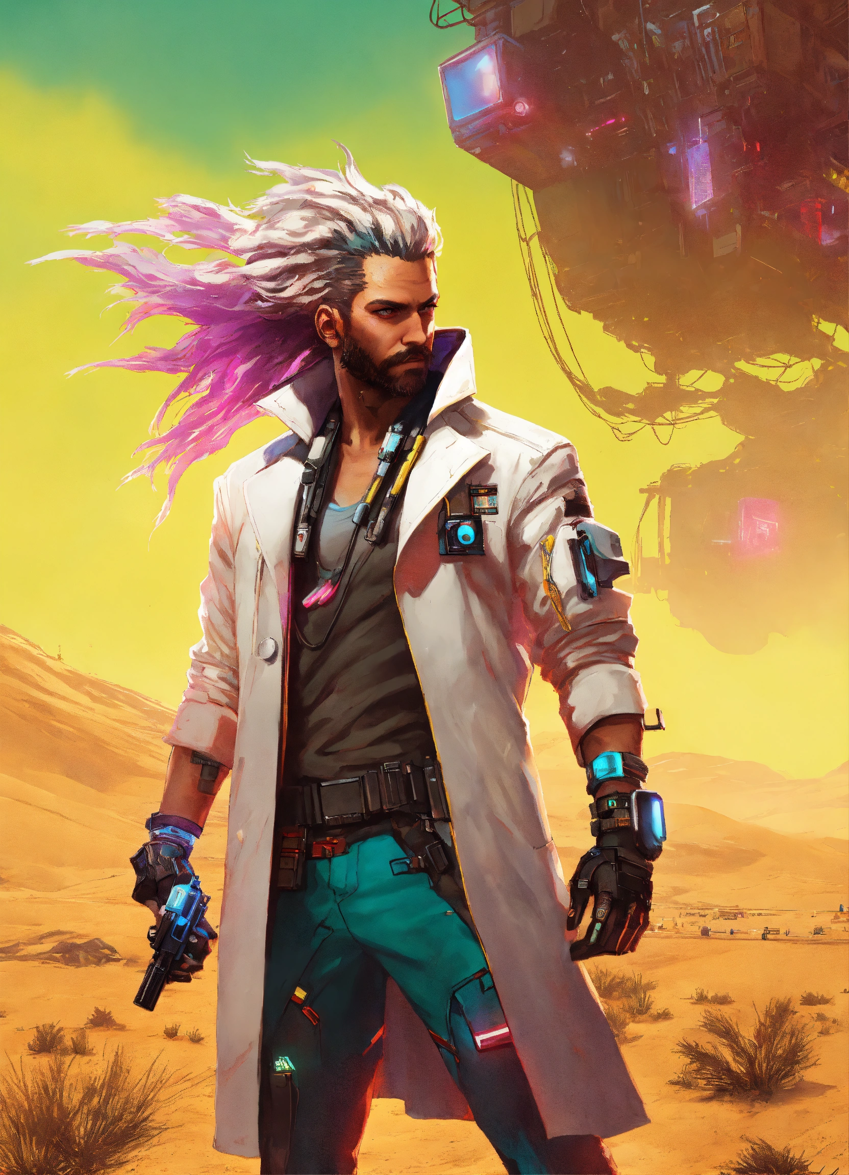 Cyberpunk male mad sciences, doctor crazy hair and white coat in the desert cyberpunk 2077 poster art style