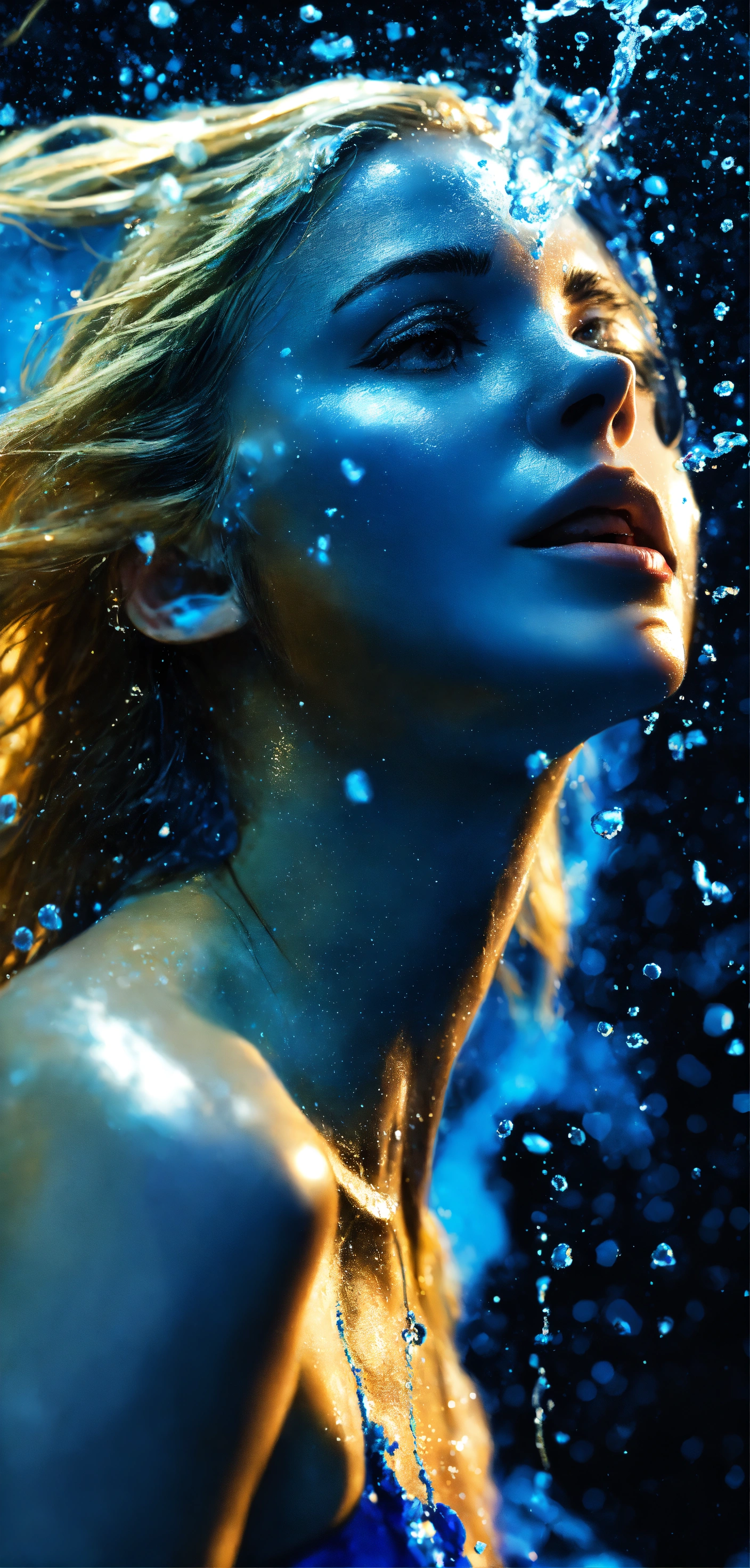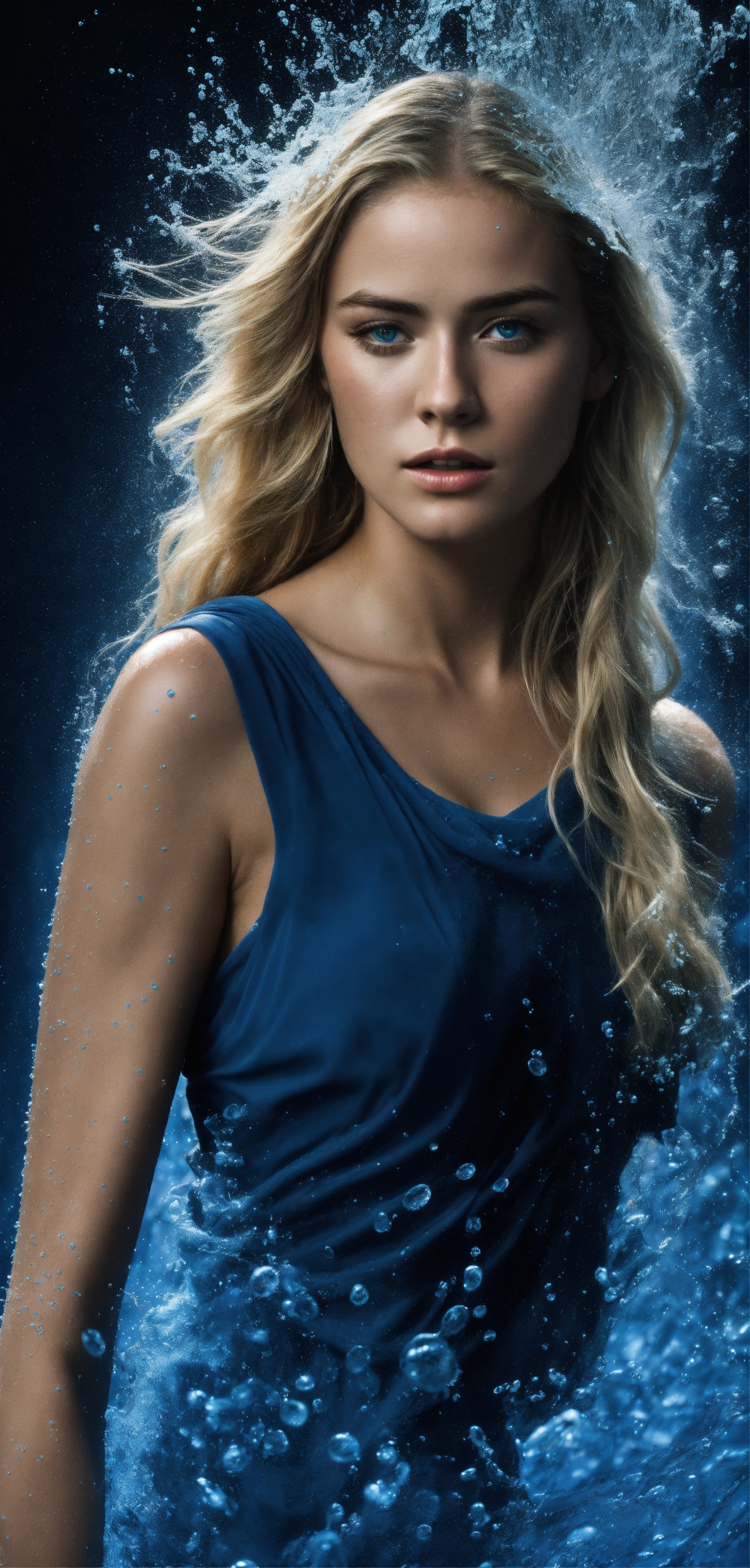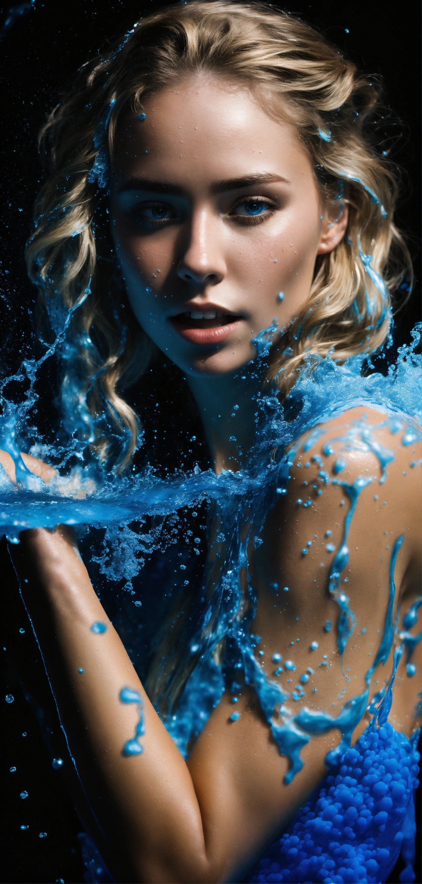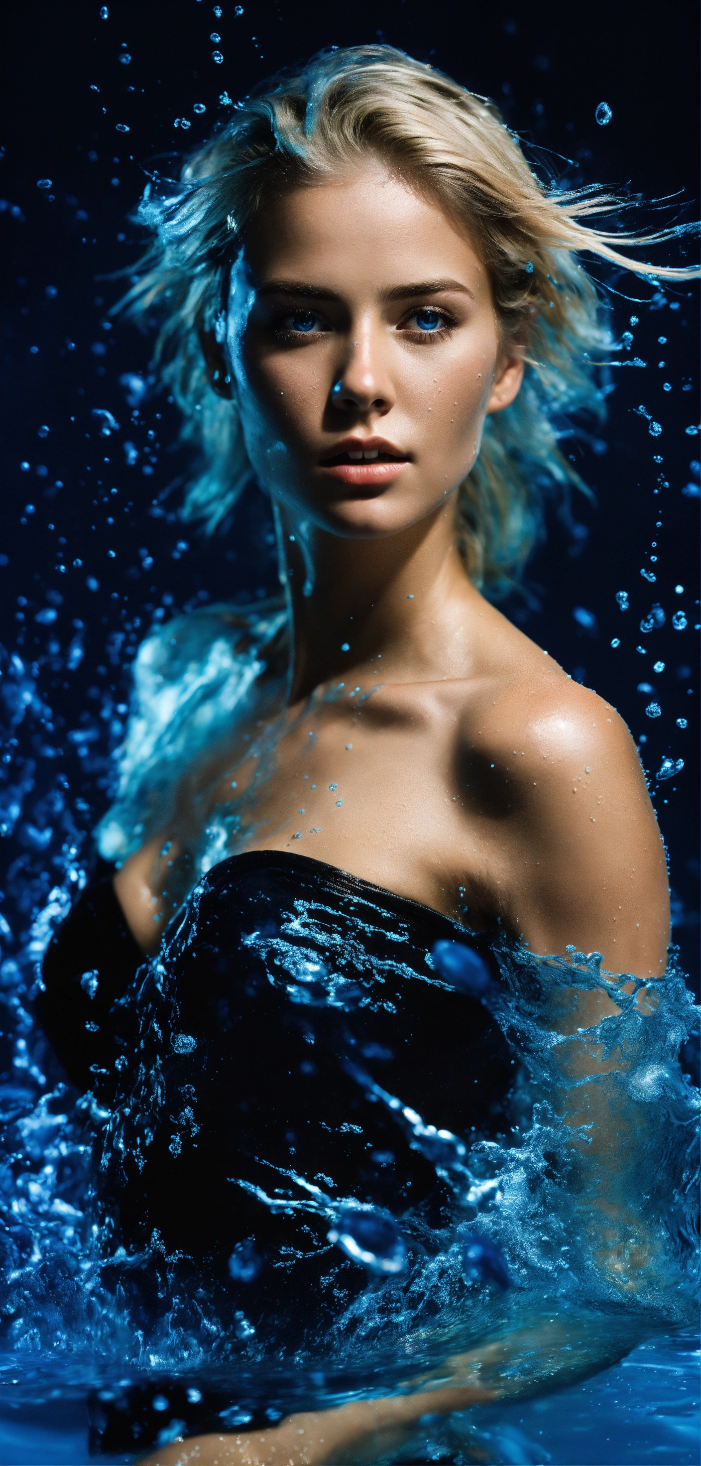 Photo 16k, ultra realist, variant movie "blue lagoon" blond woman, made of blue transparent water splash, realistic, black bg, photo fusion. photo sfx