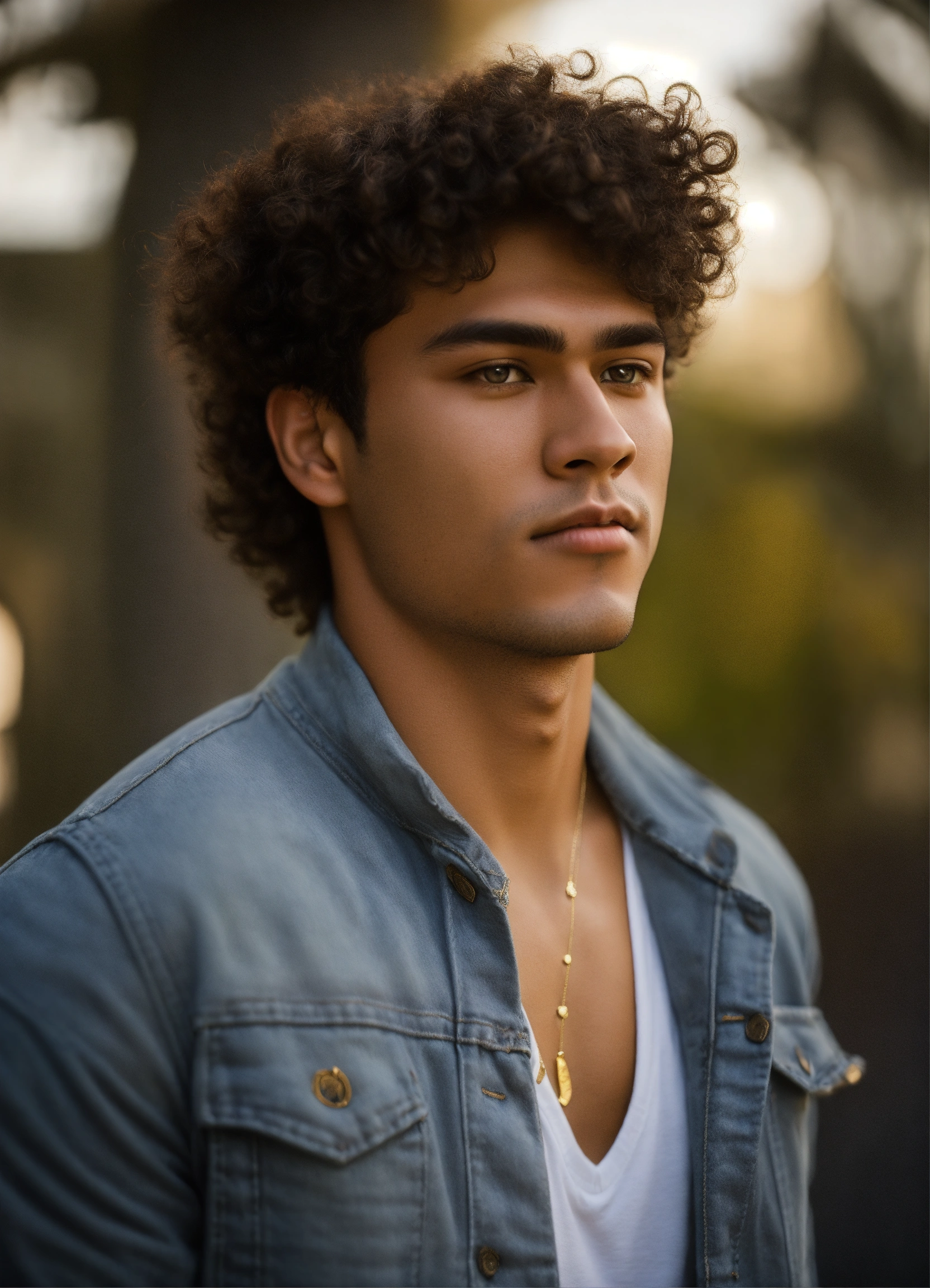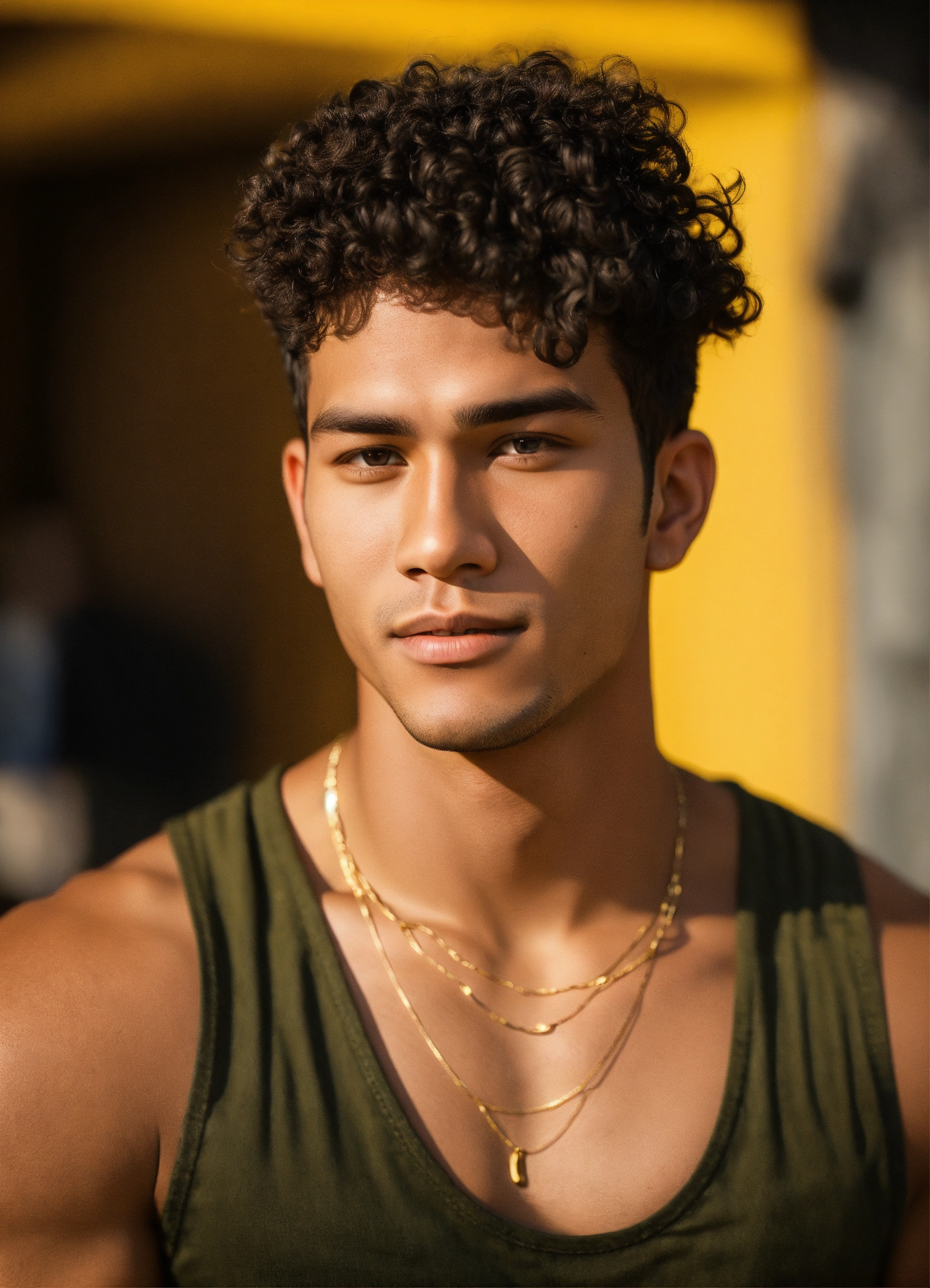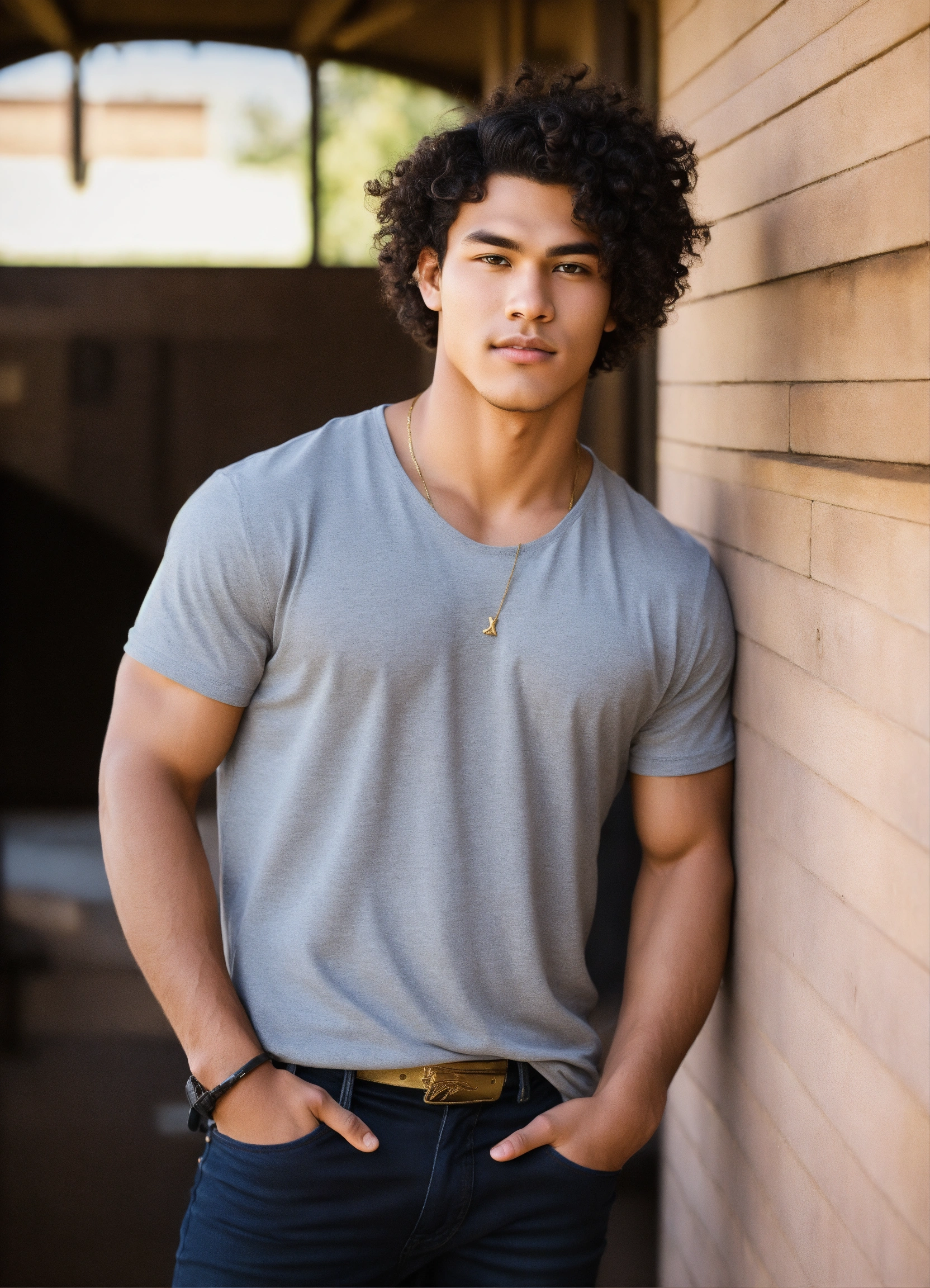 Handsome indigenous 21 year old male college student. with gold skin, grey eyes, tall muscular build. curly hair, clean shaven, black jeans, and jordans. confident demeanor.