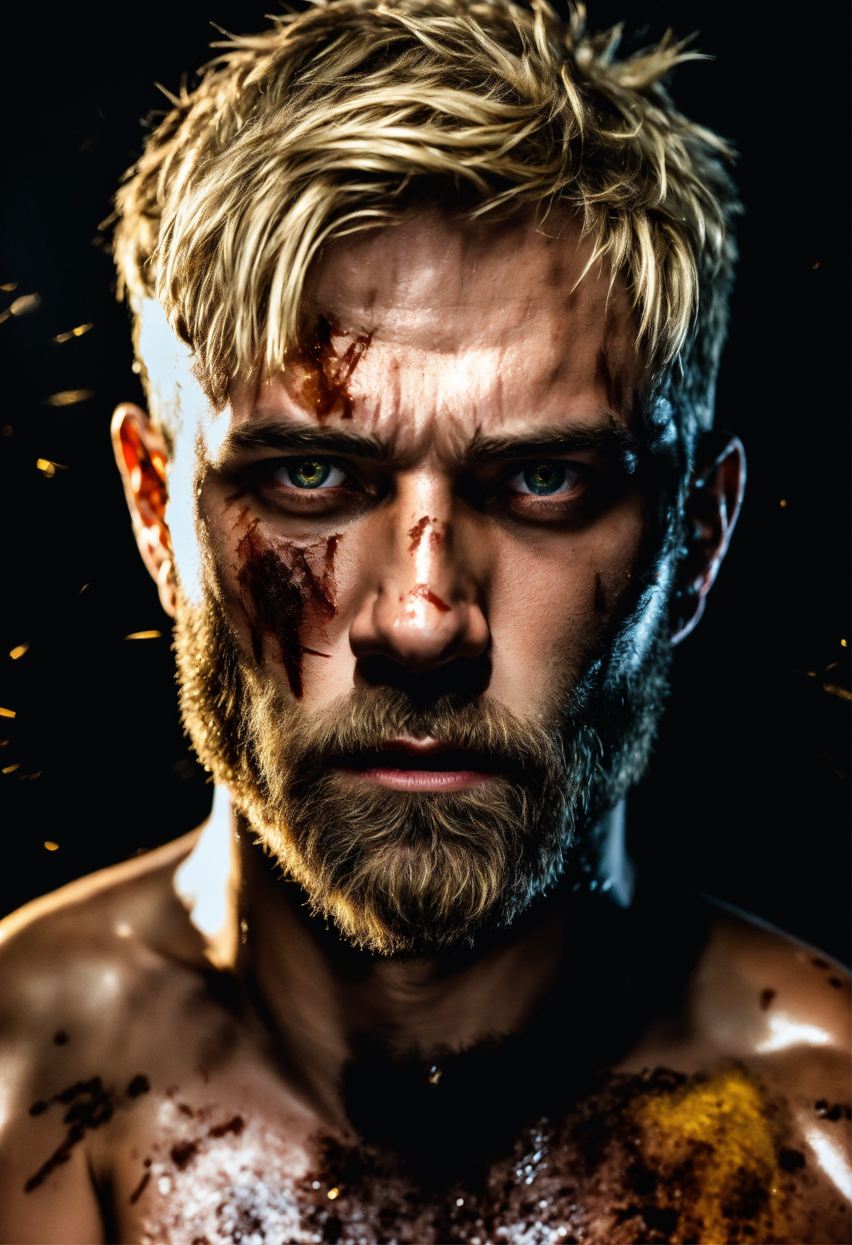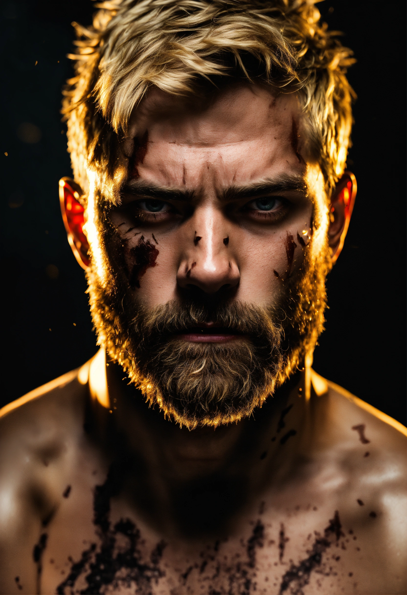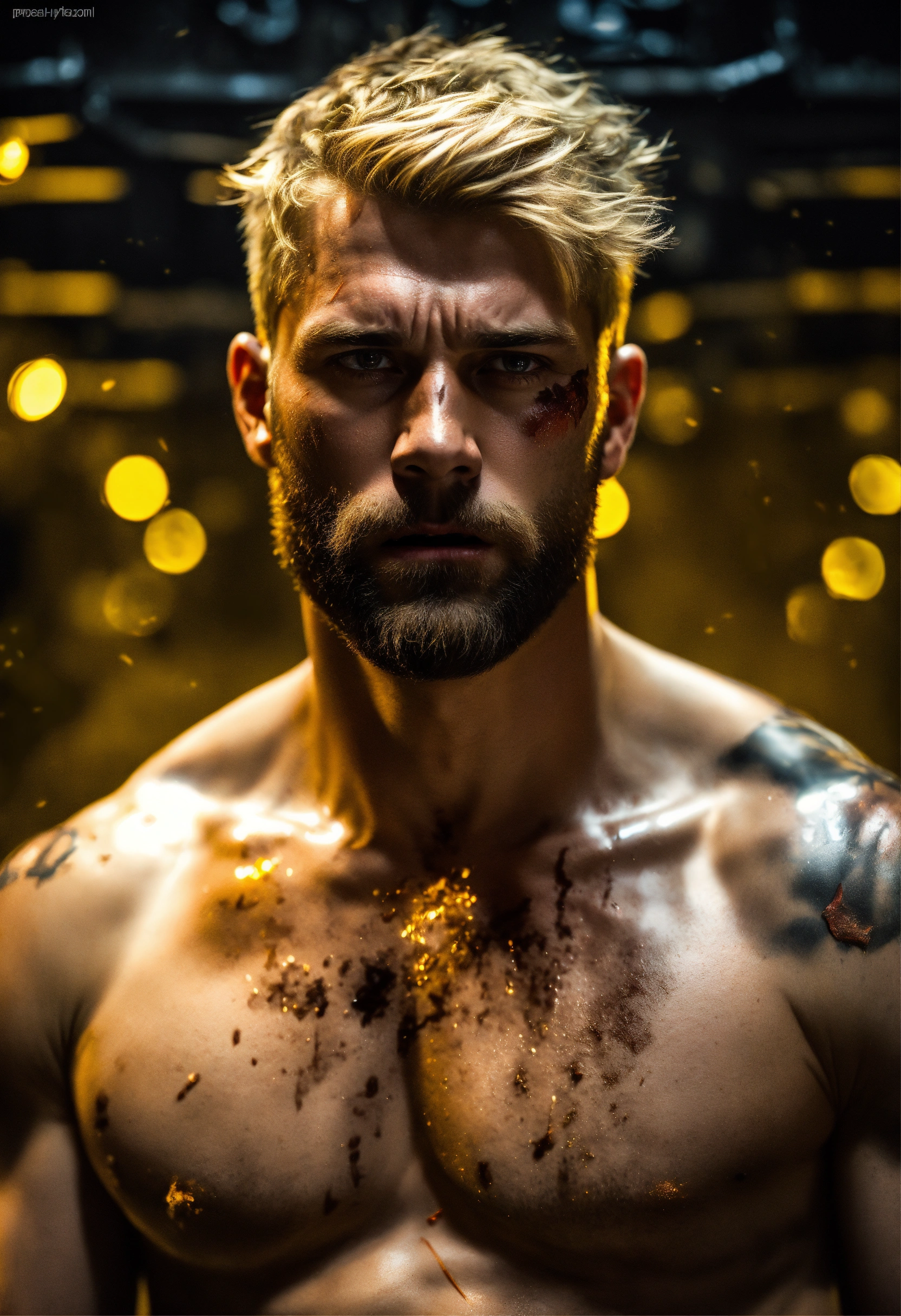 A highly detailed half body photo of a white 35-year-old man, blonde messy short hair, brown-yellow eyes, a little beard, with a lot of battle scars, shirtless, angry expression, strong body, with a dark background with leds, dramatic illumination, hyperdetailed, hyperrealistic, 8 k.
