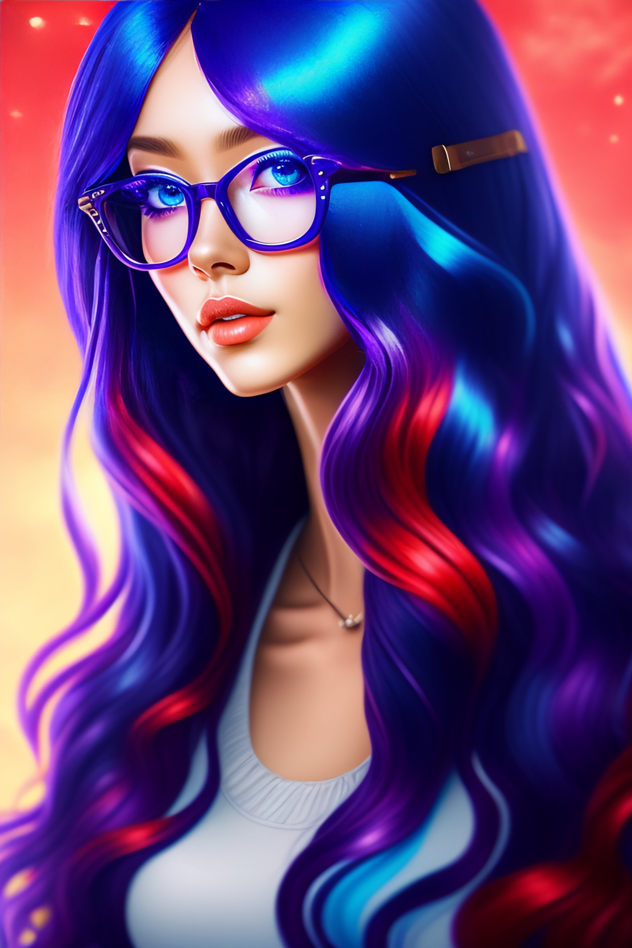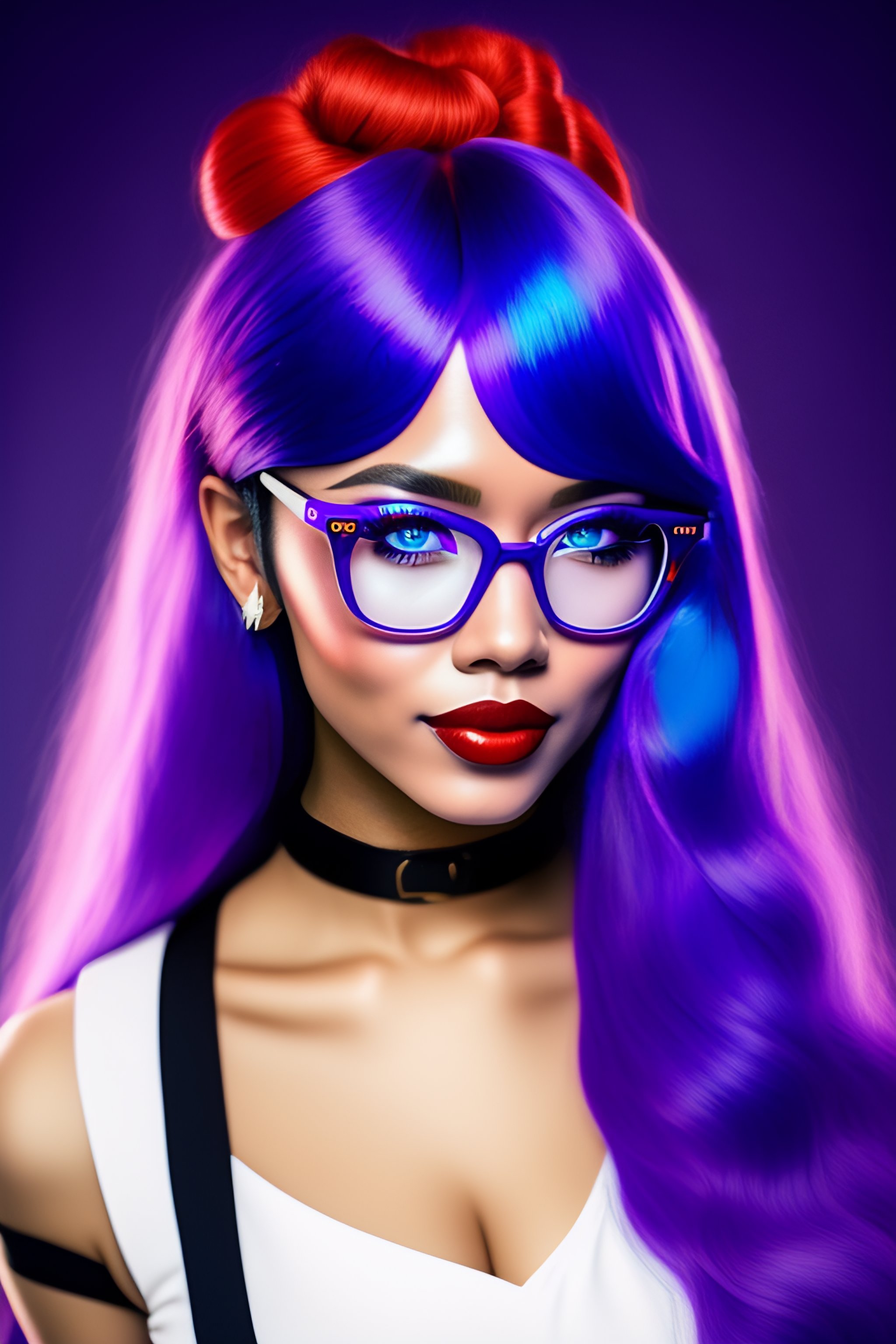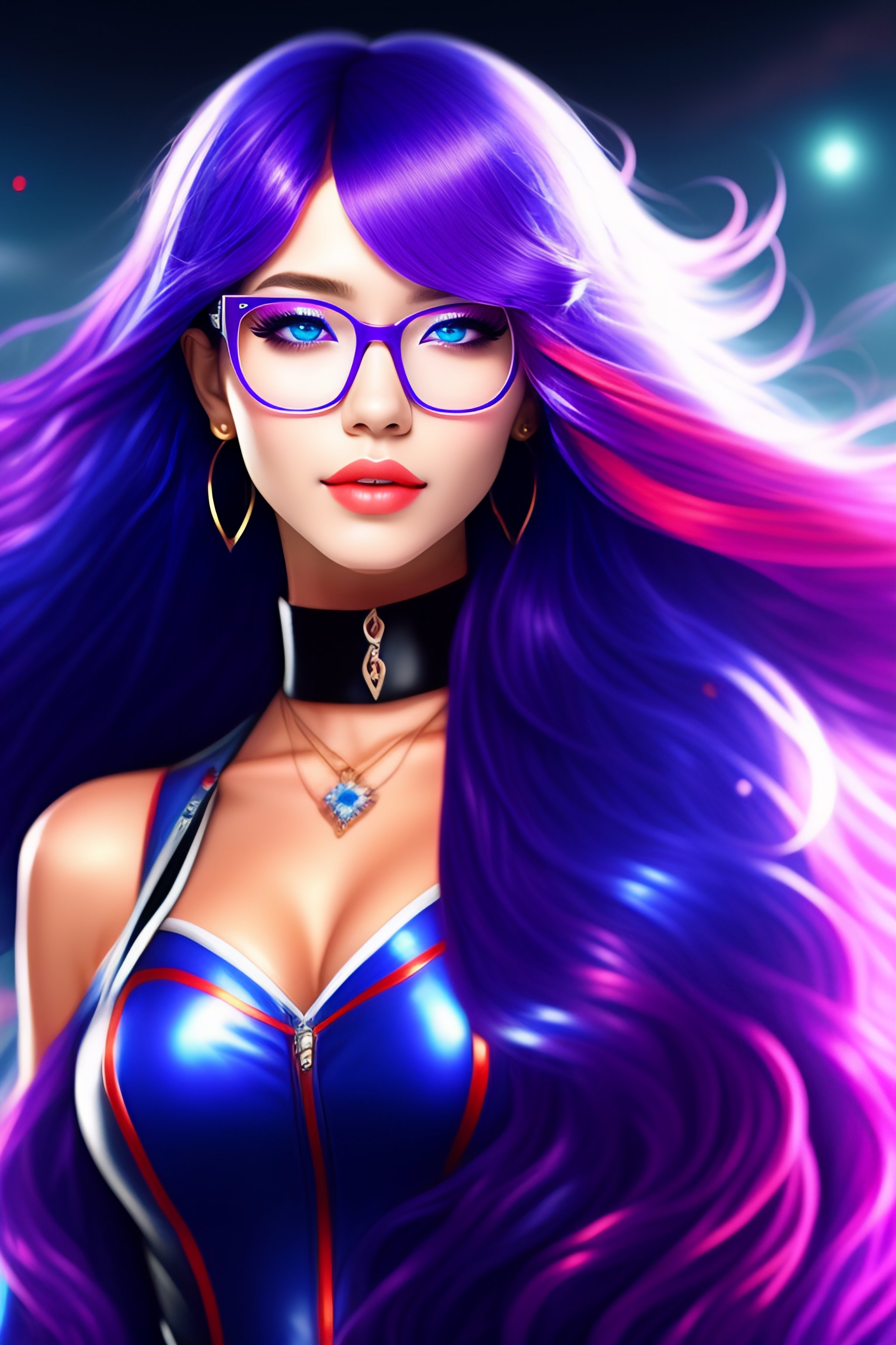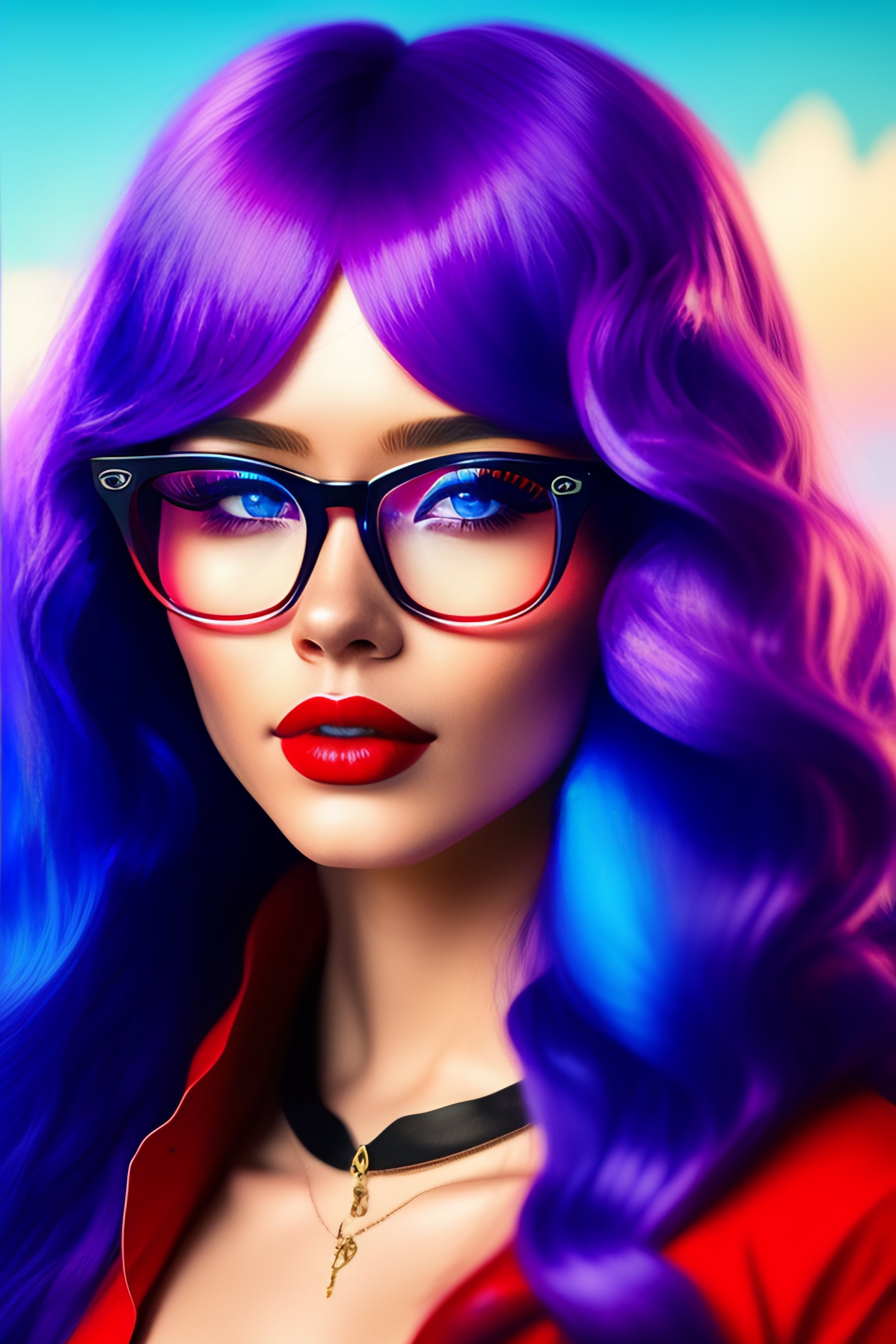 Long purple hair with blue streaks, red and blue eyes, with glasses and red outfit with black anime girl