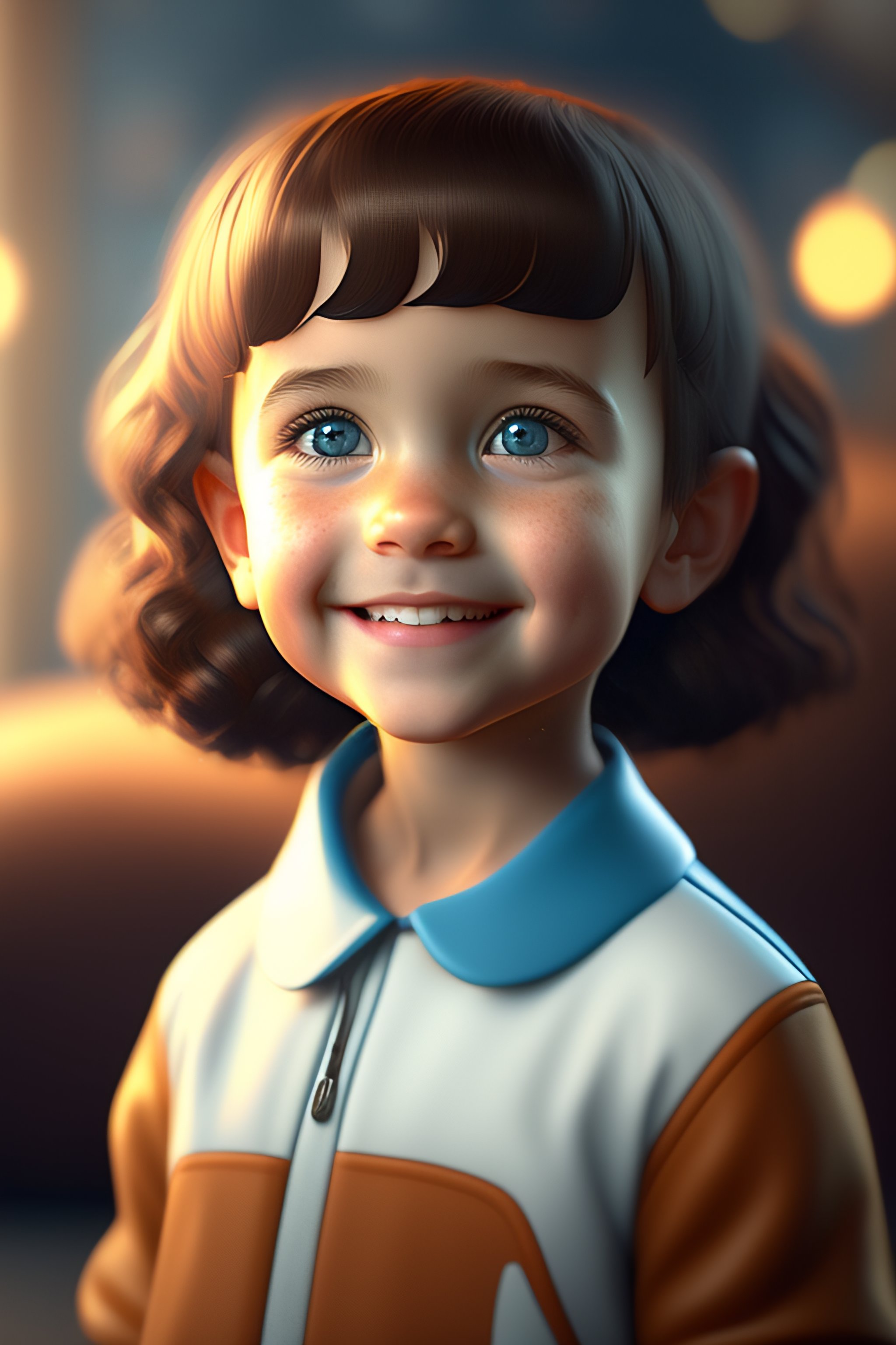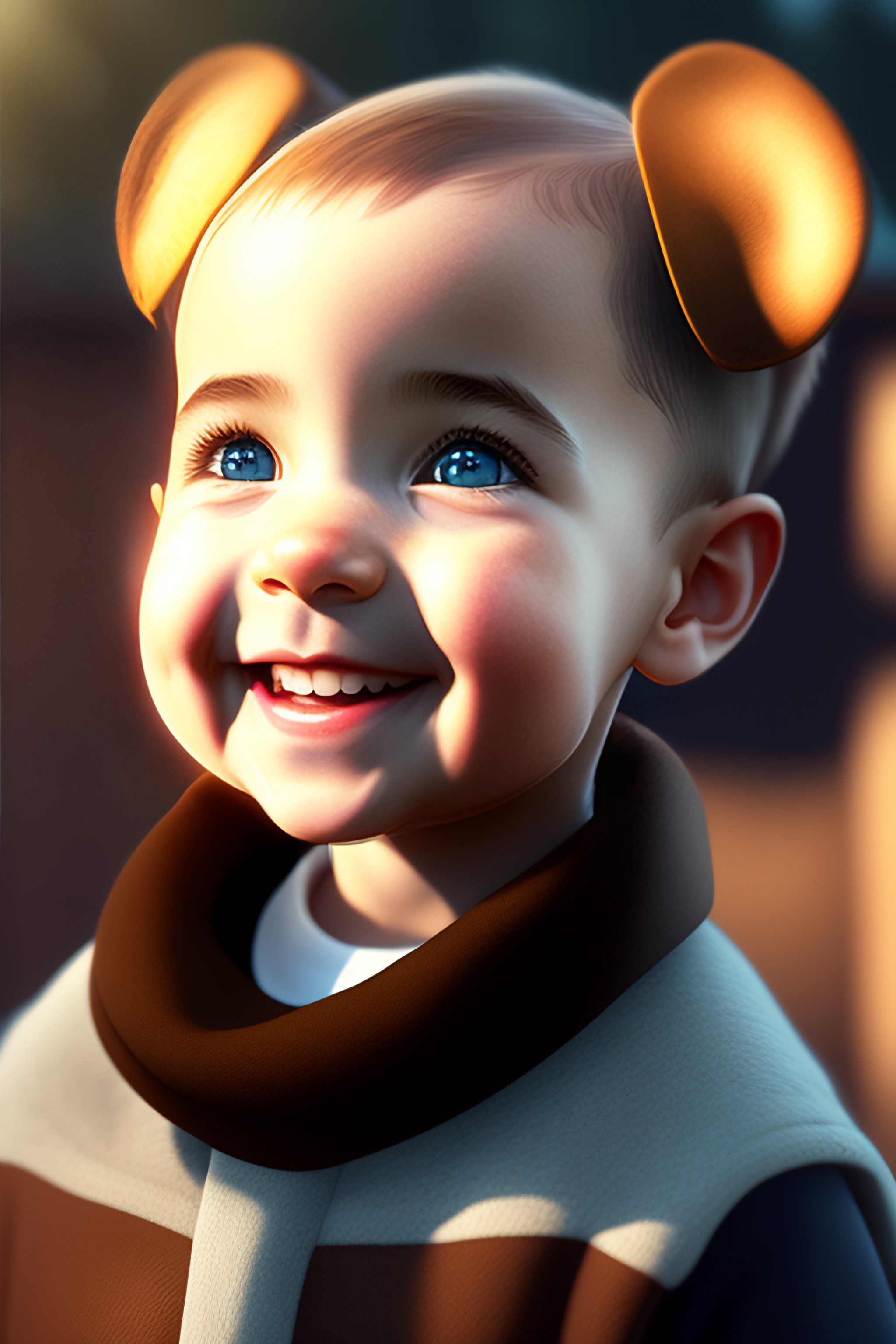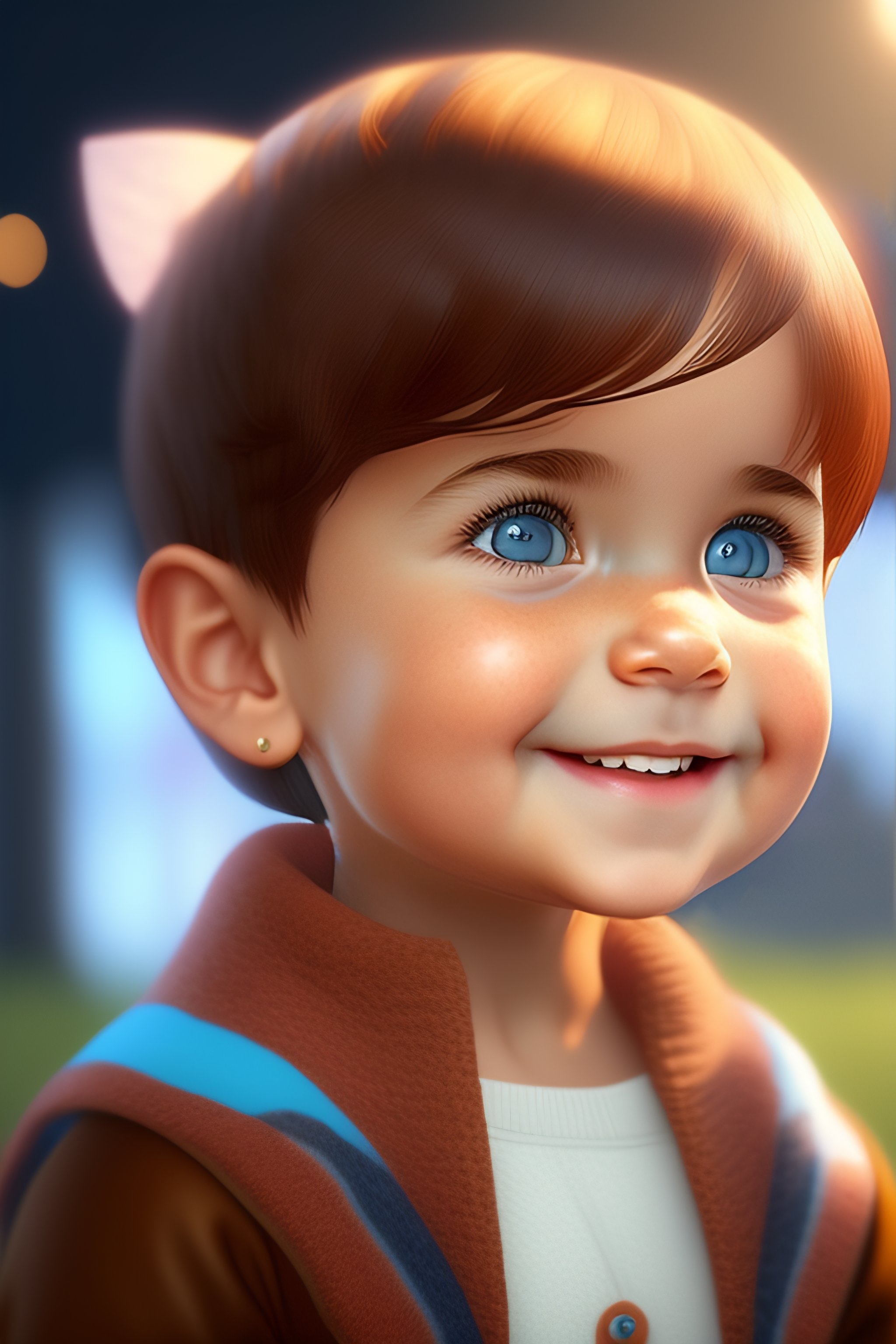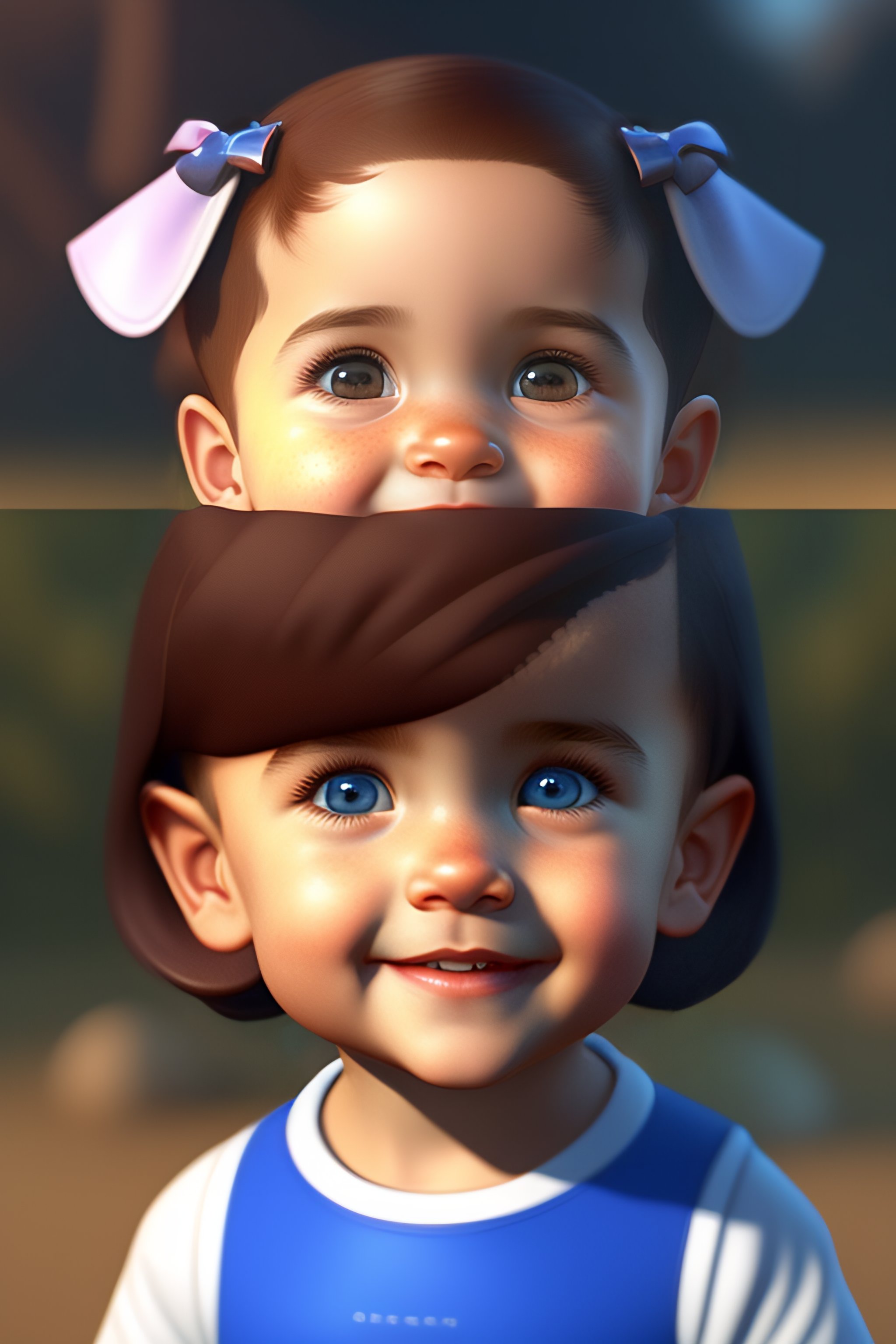Short haired girl, baby, blue eyed, brown hair, almost no hair except on top of her head, smiling at happy brown dog with floppy ears. soft lighting, ambient lighting, pixar render, trending on artstation.
