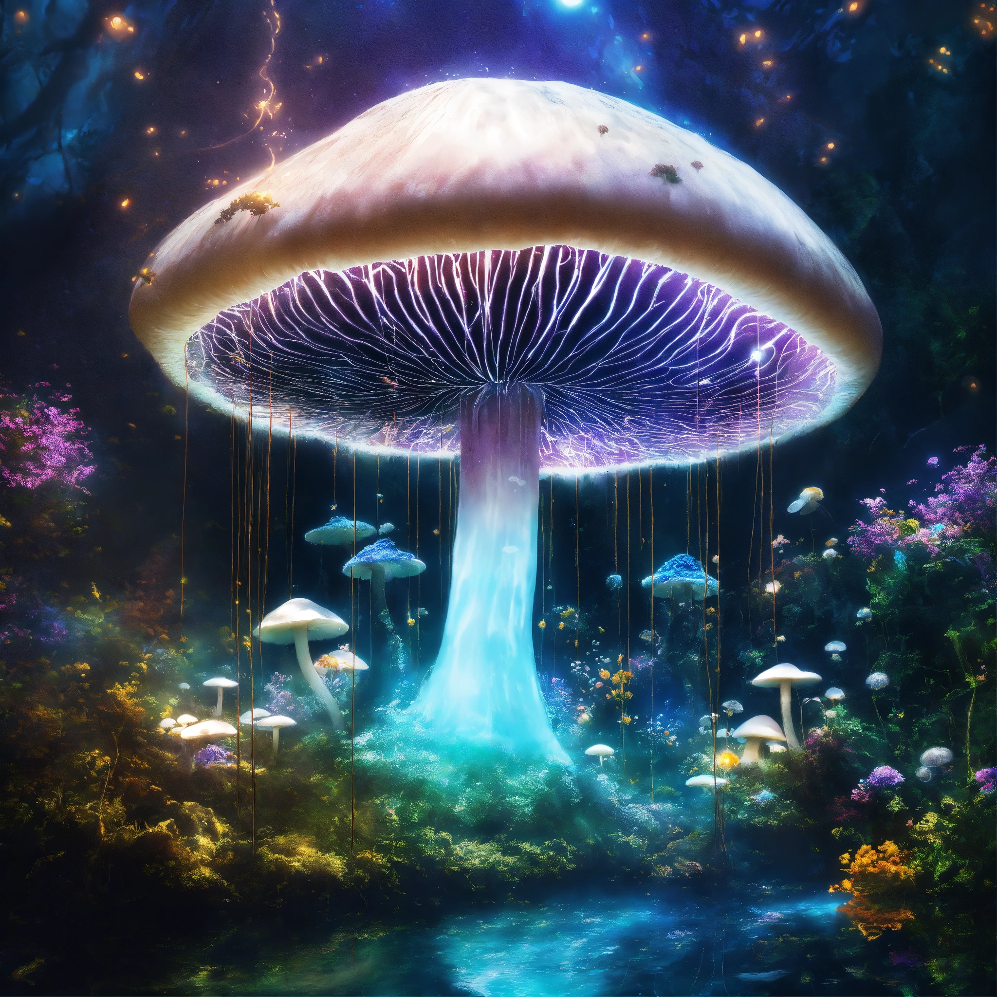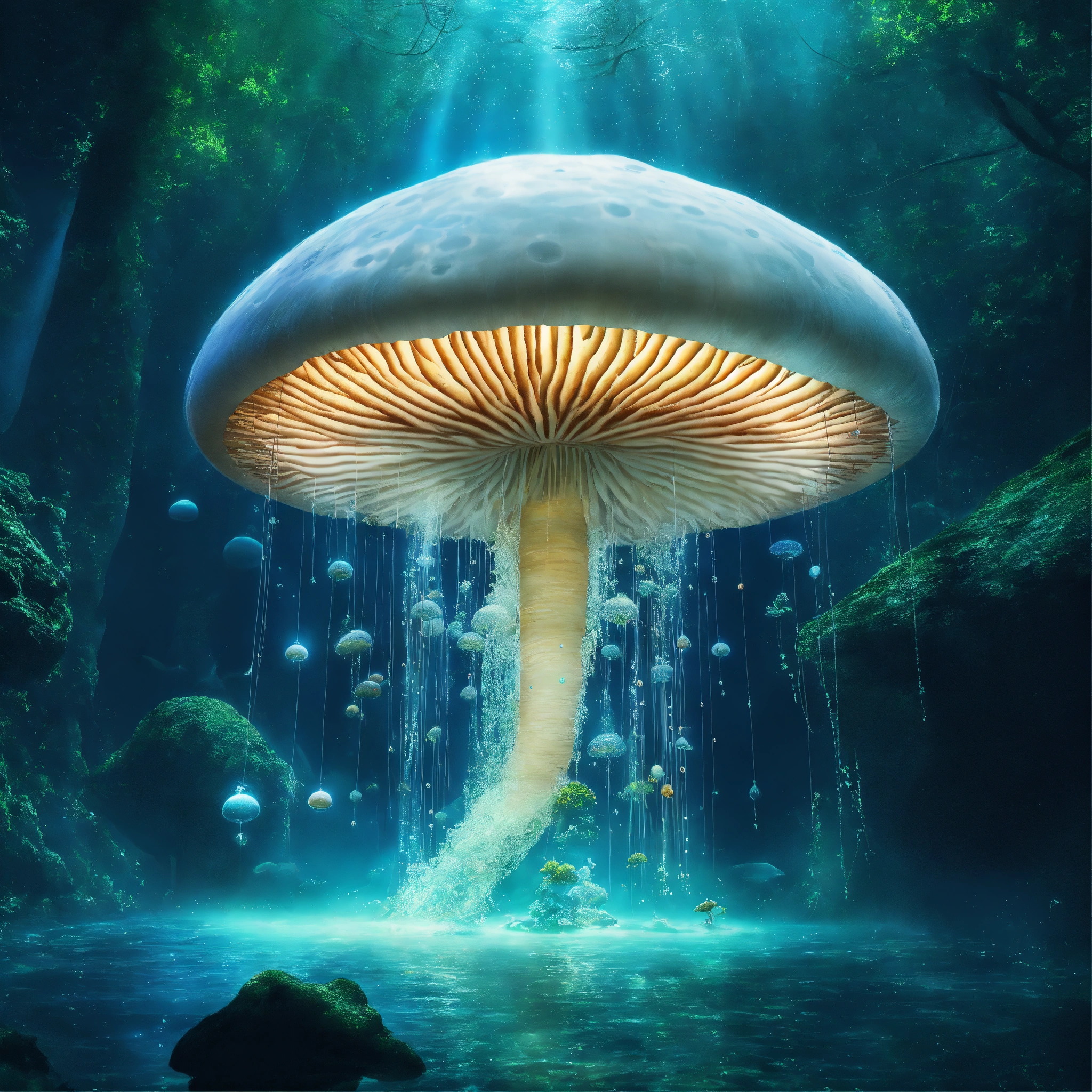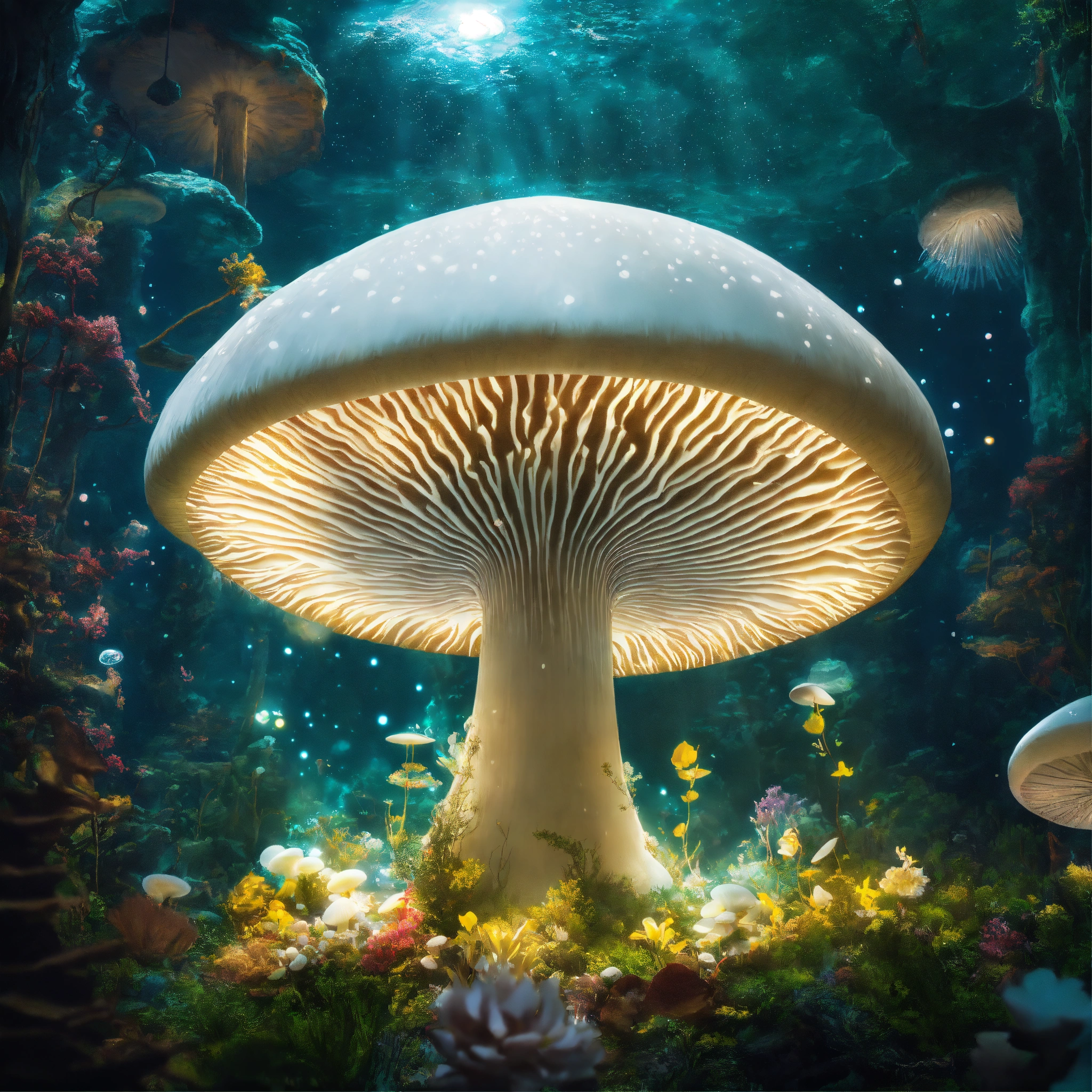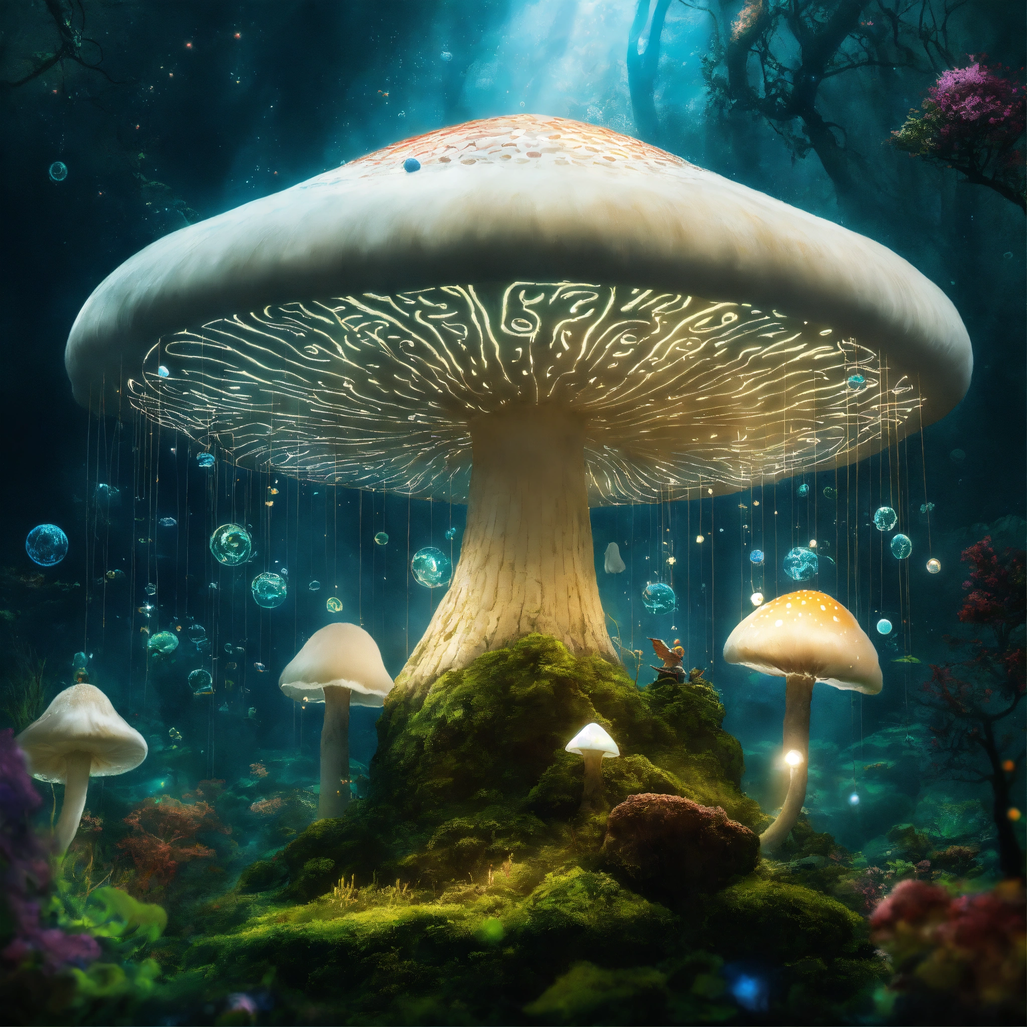 Underwater long exposure photography, a giant white mushroom flying in the cosmos with orbs and portals, x-ray style, in the style of tim burton, lion king, the chronicles of narnia, beauty and the beast, and peter pan. with sacred geometric patterns on the body. enchanting aura. the chronicles of narnia, wizard of oz, and alice in wonderland background