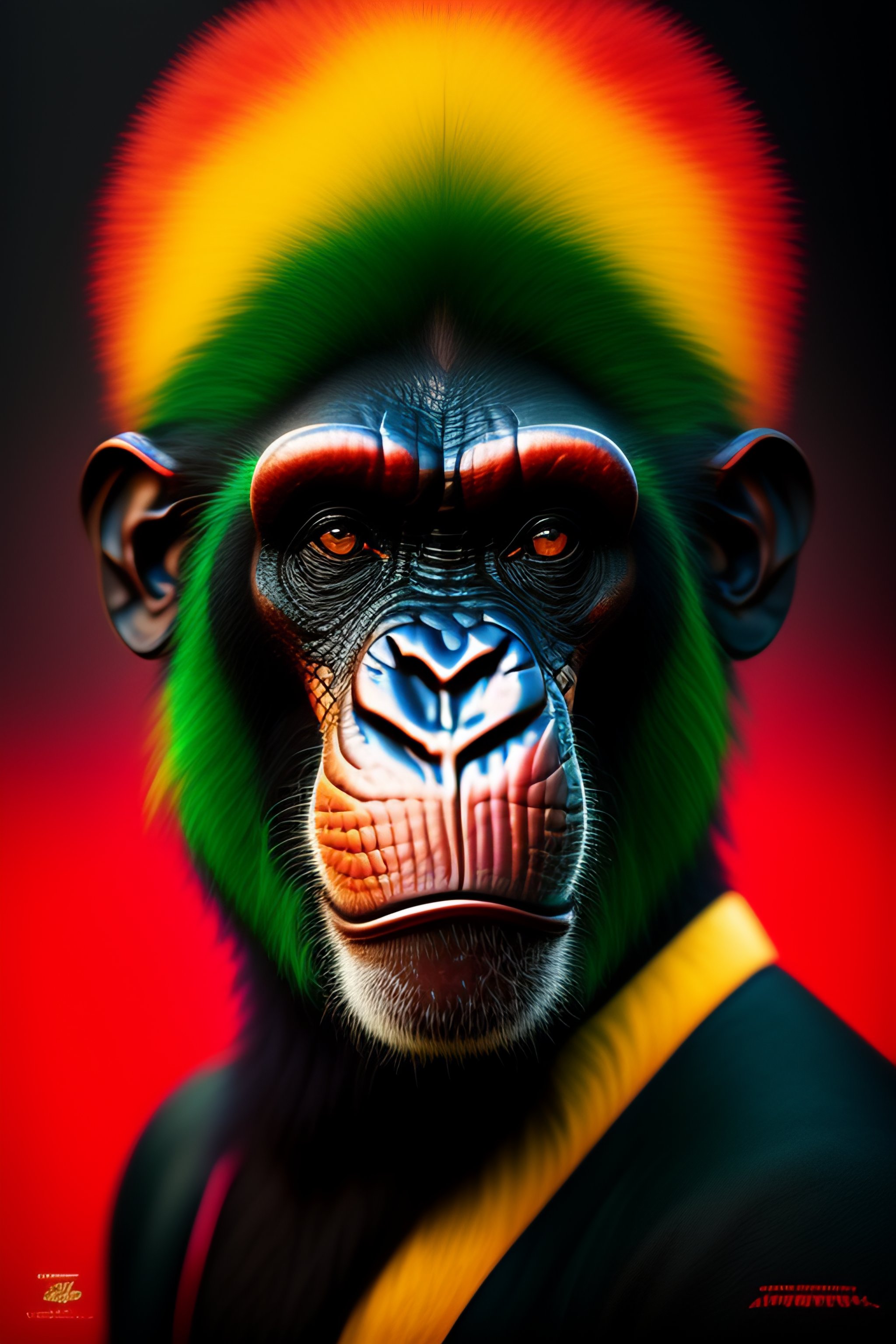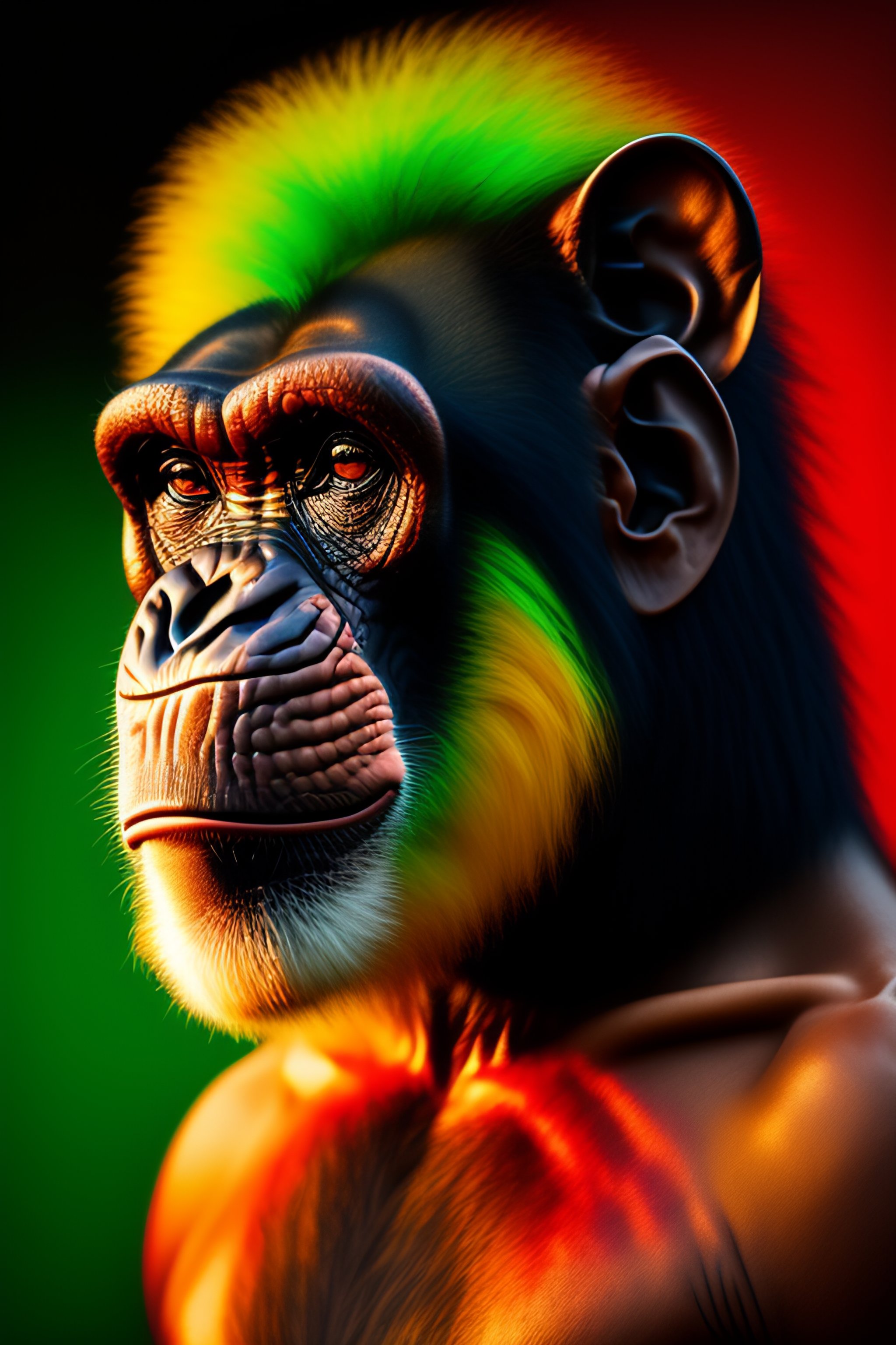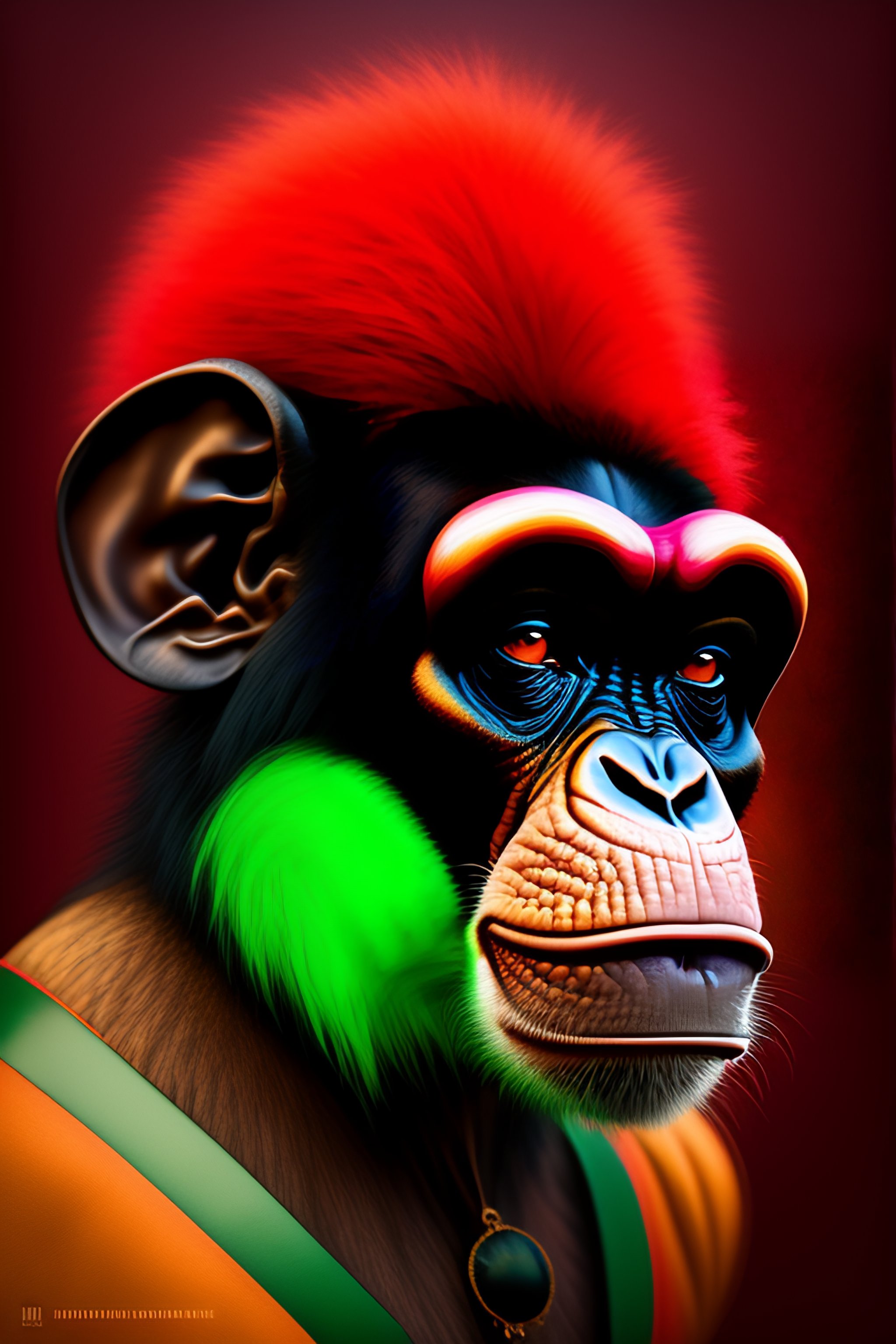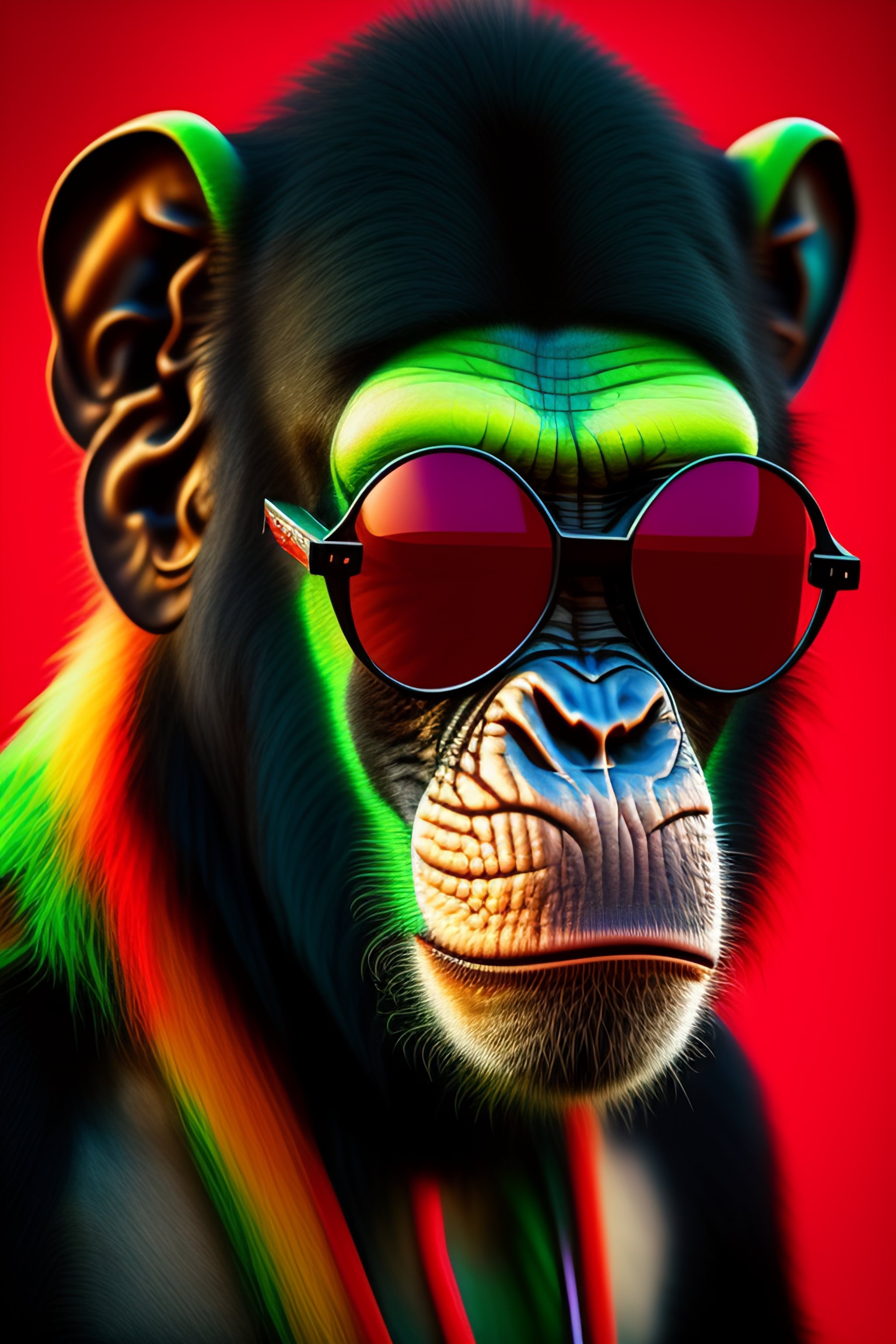 Retrato de un chimpancé payaso disfrazado de lobo con una cresta punky roja y blanca en la cabeza y con gafas de sol negras y la piel de la cara verde