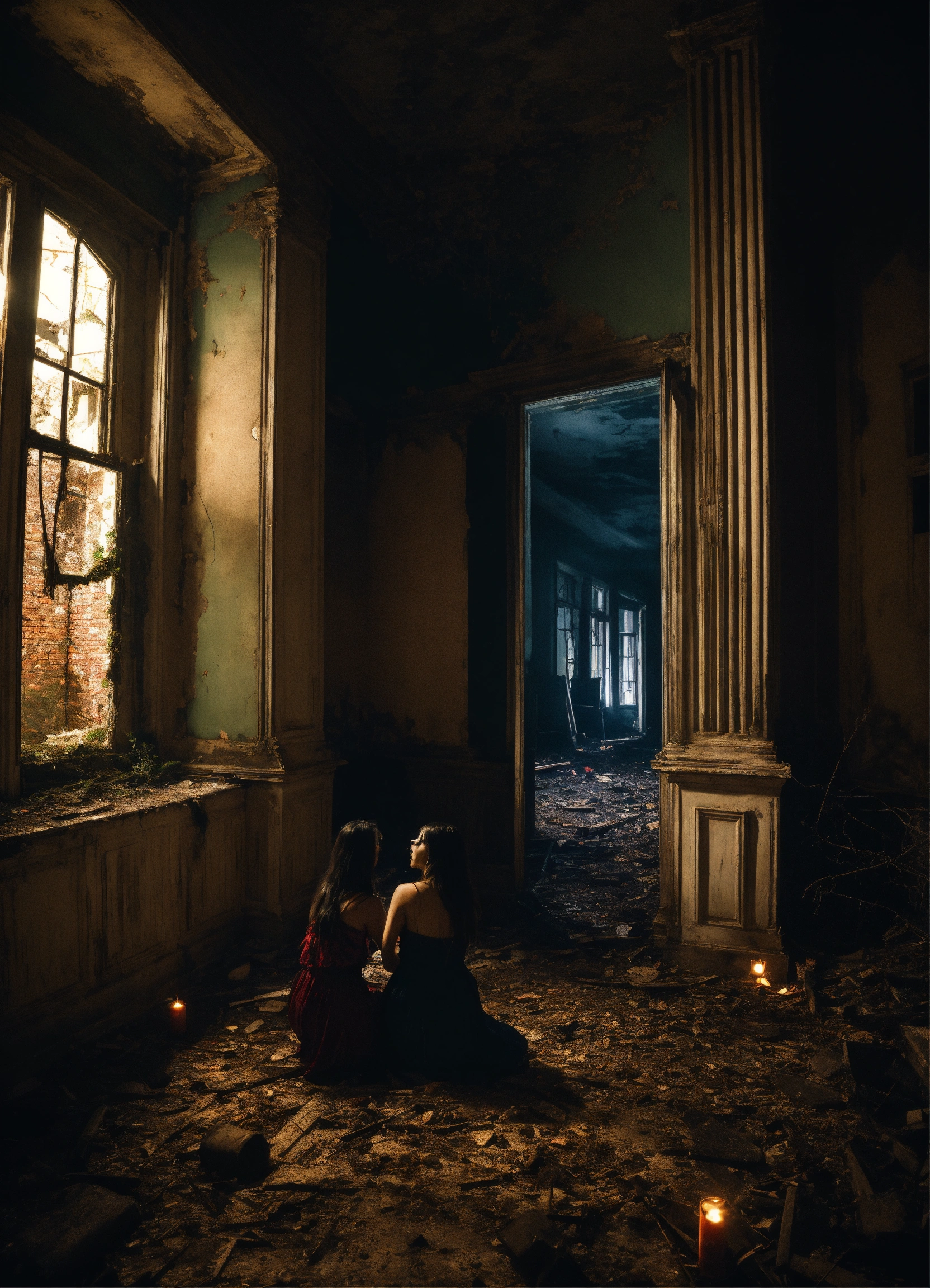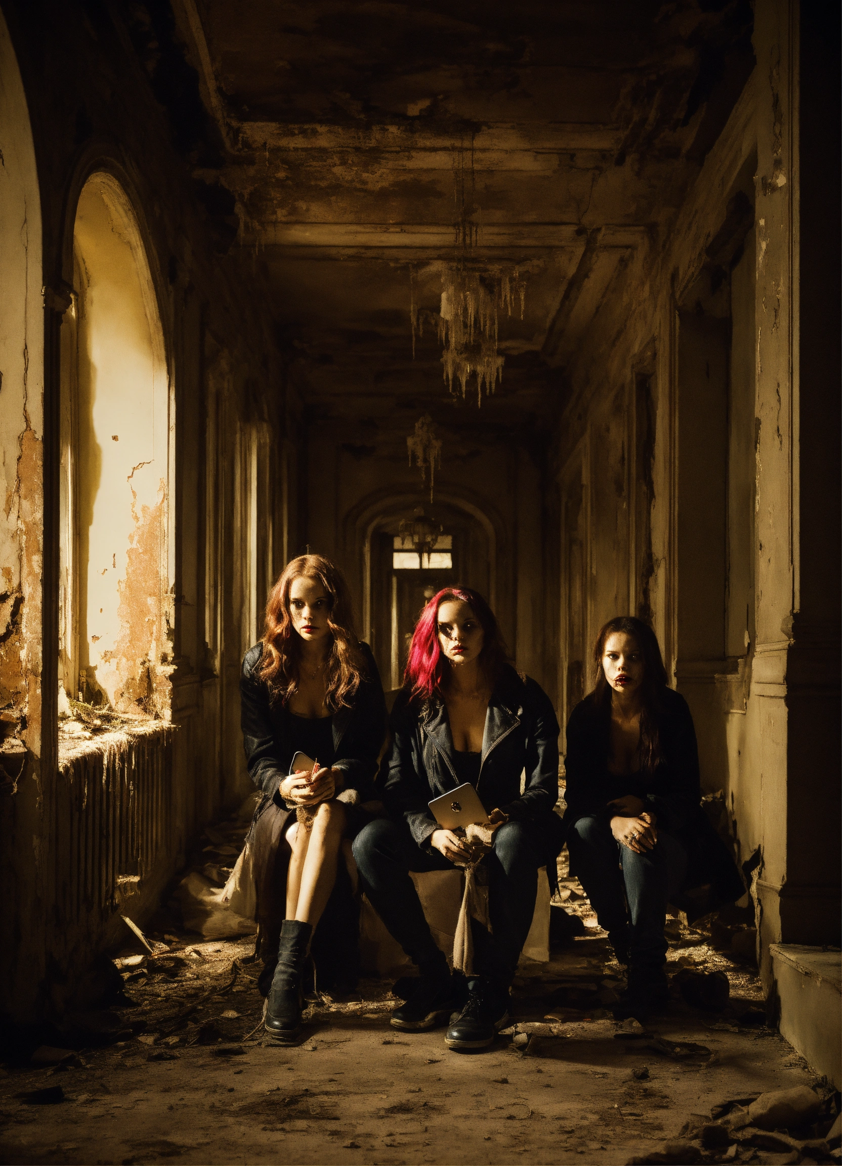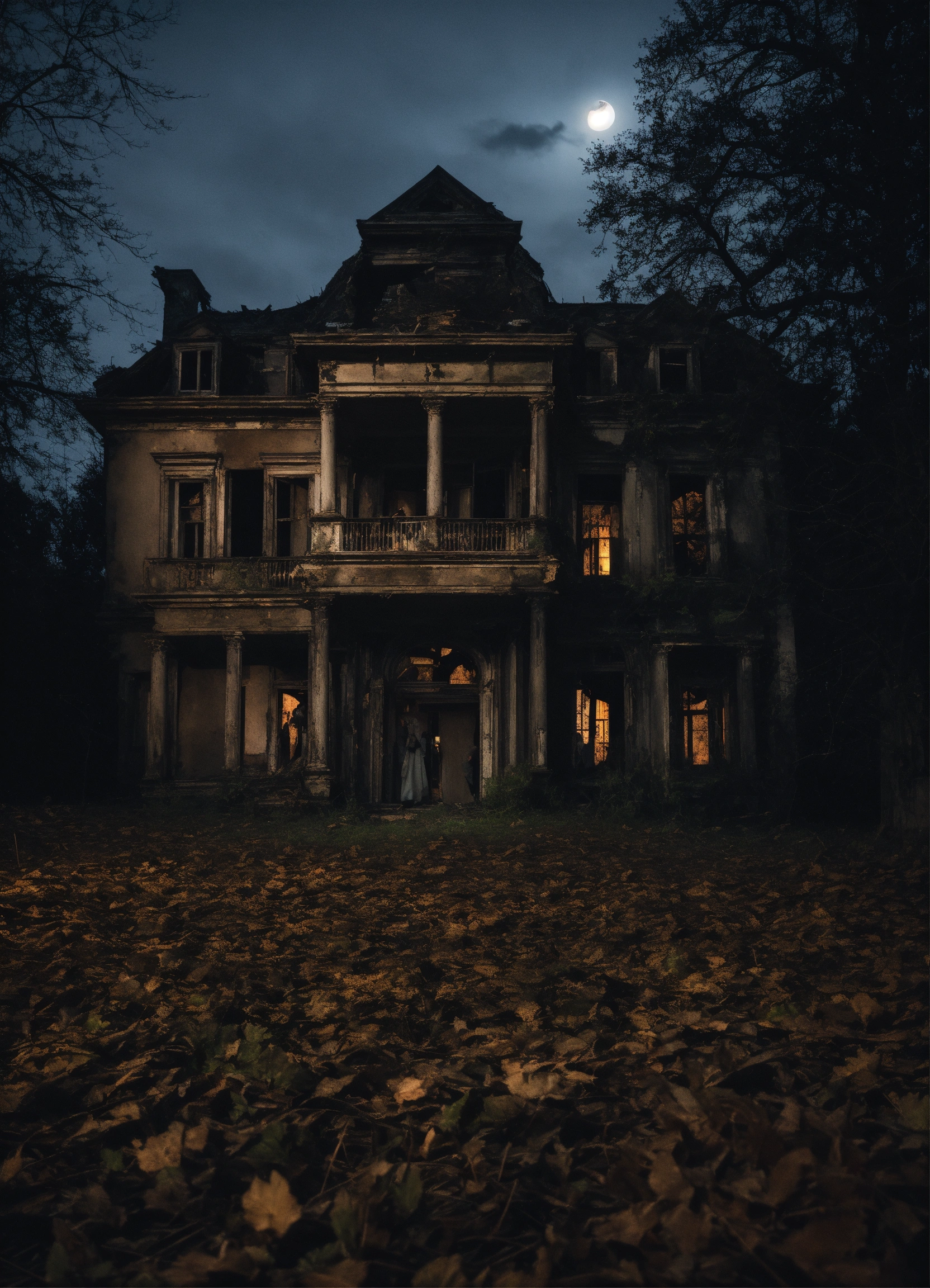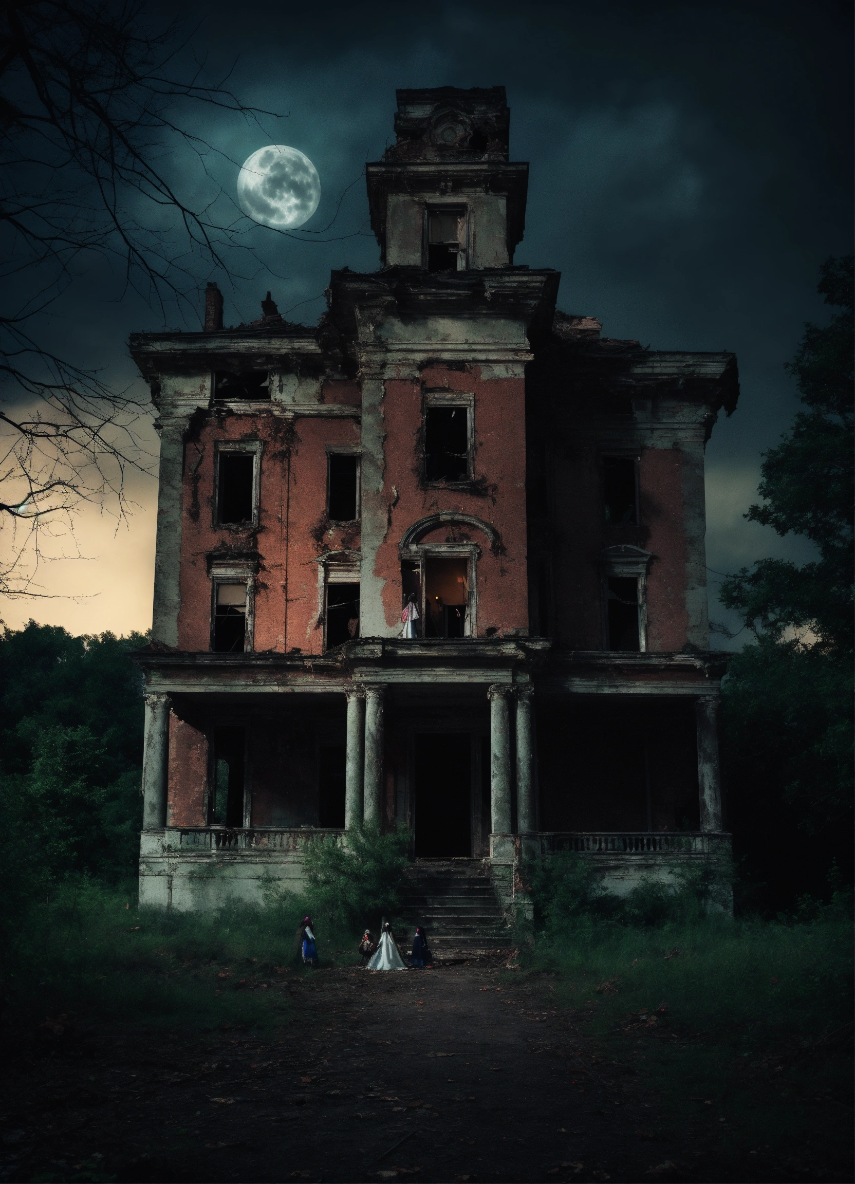 Create an image with a group of friends nearby or in an abandoned mansion at night, make a scary scene