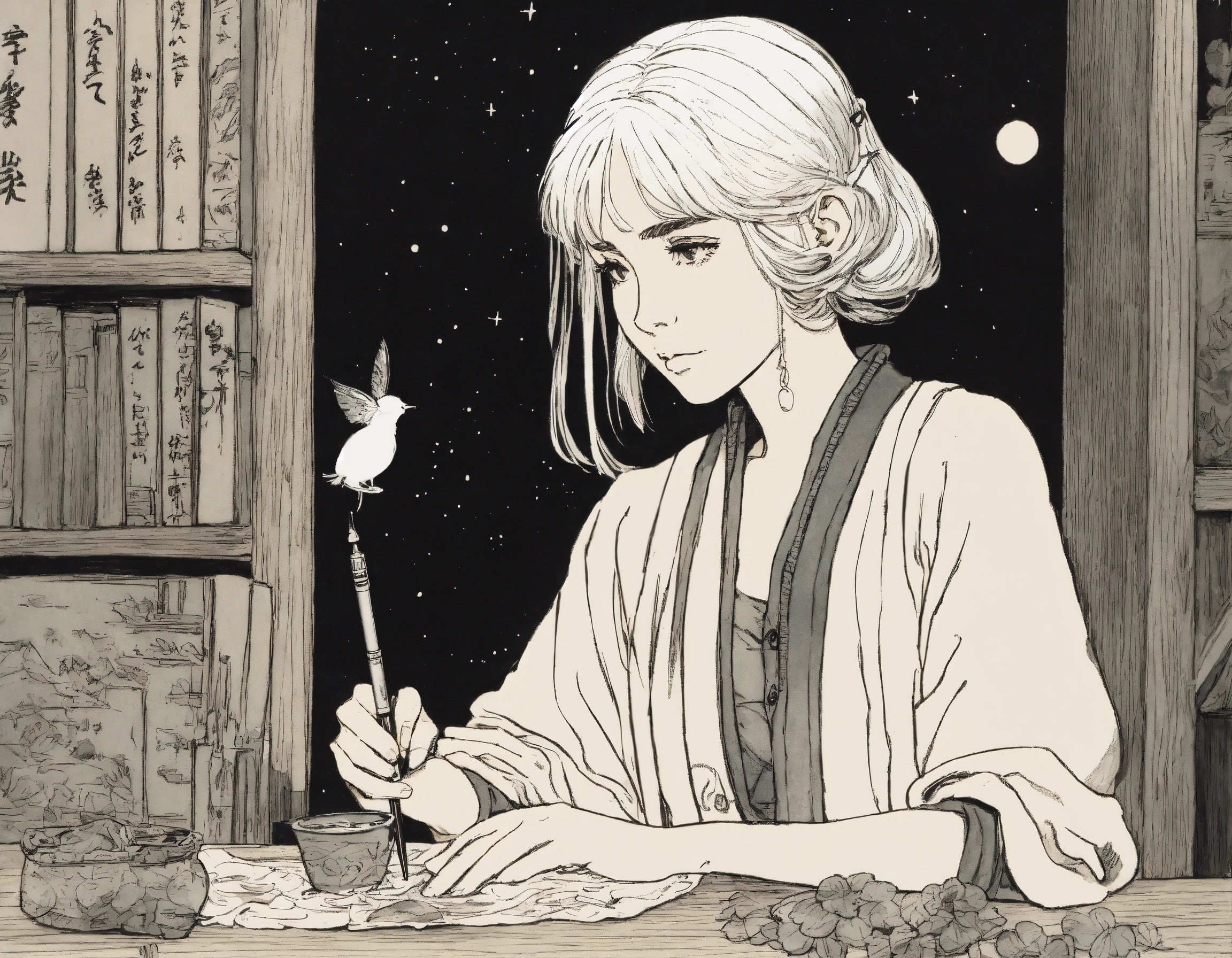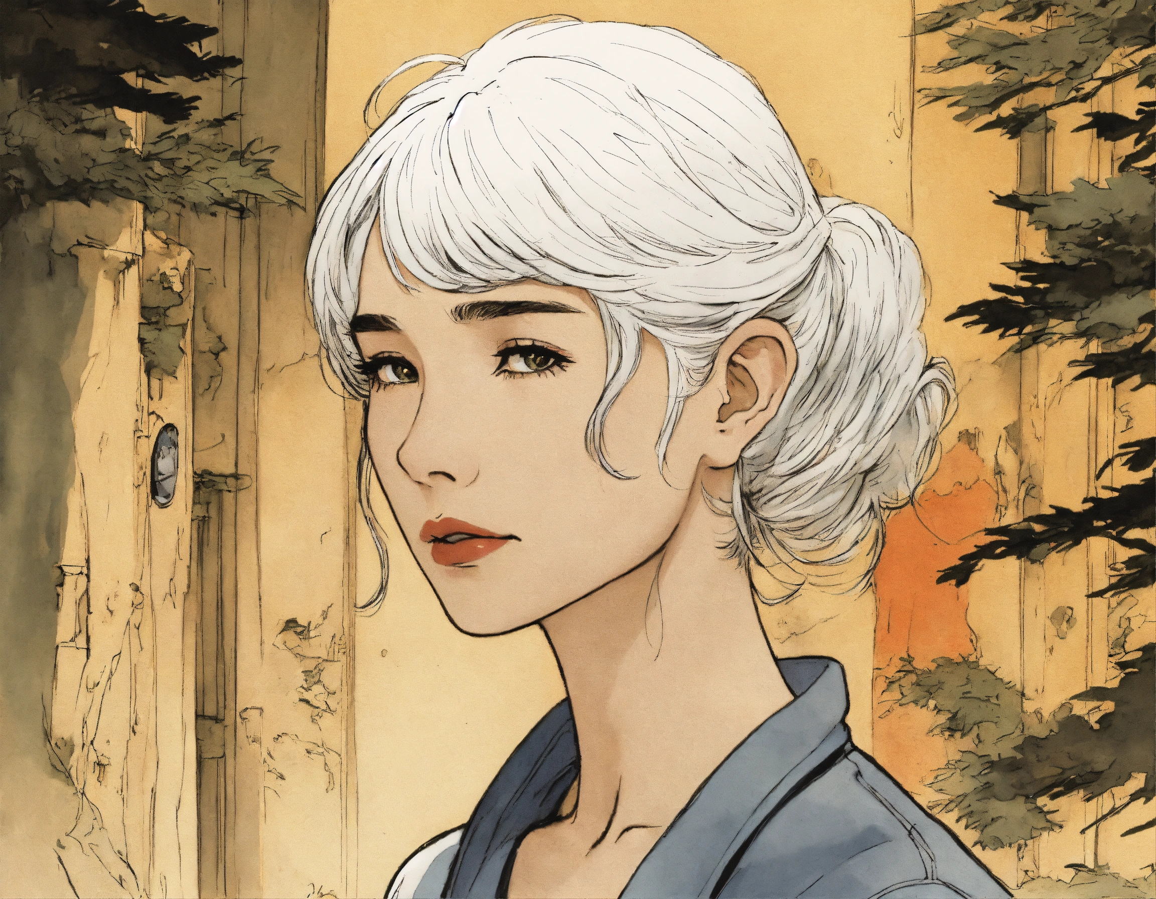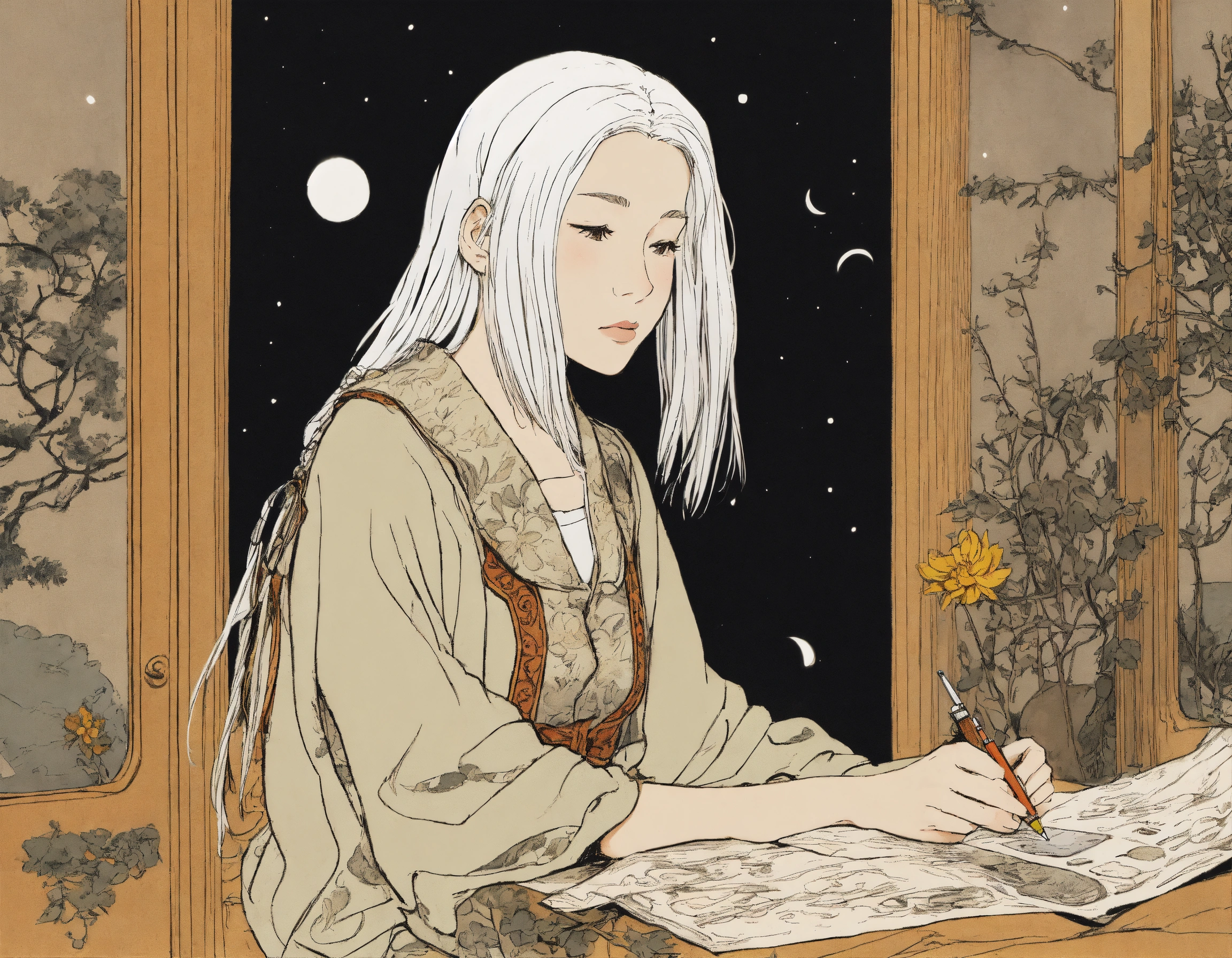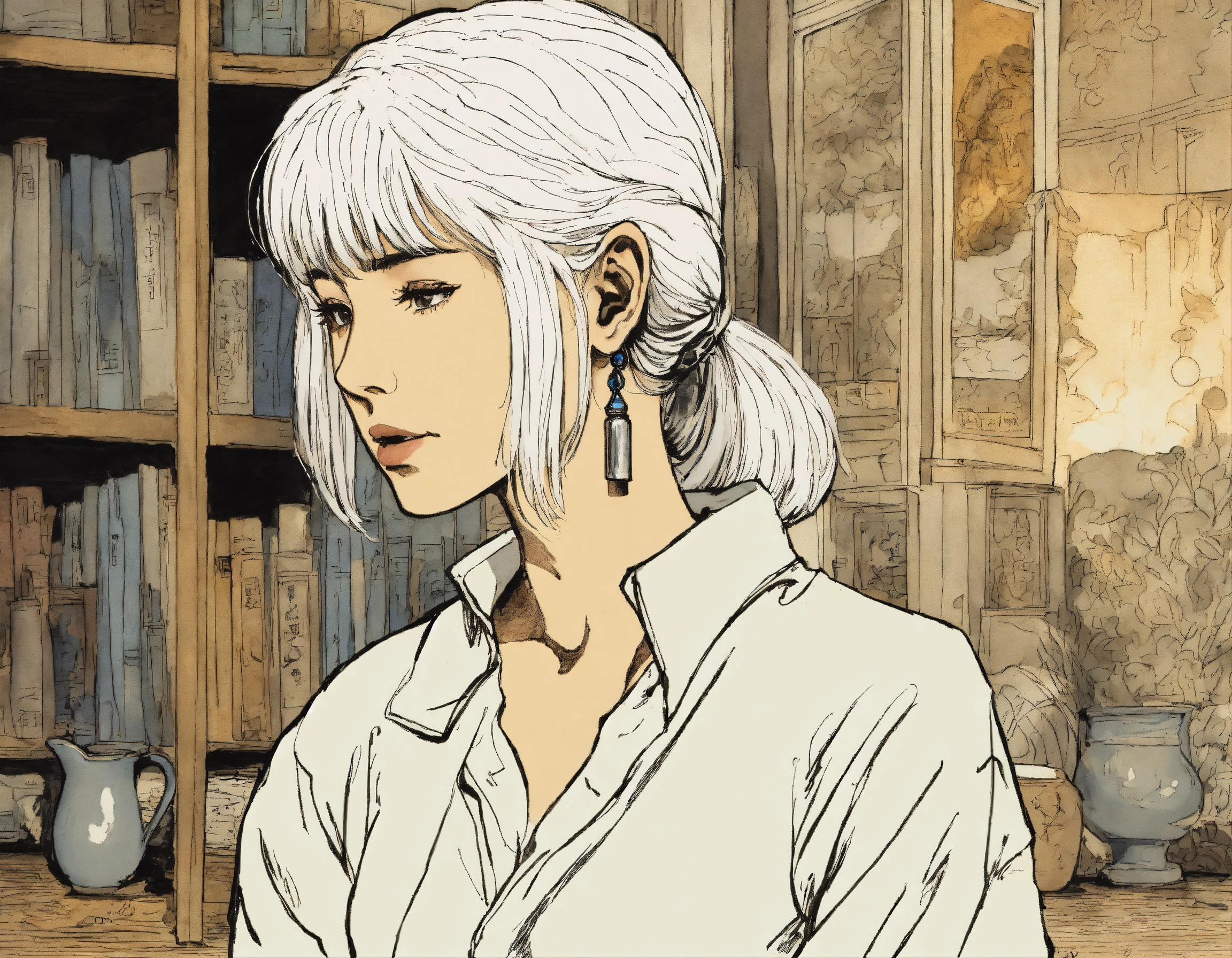 Illustration of a young woman with white hair, bang. gloomy, magic, by hergé, ink and pen, masterpiece. whole body. workshop. studio ghibli.