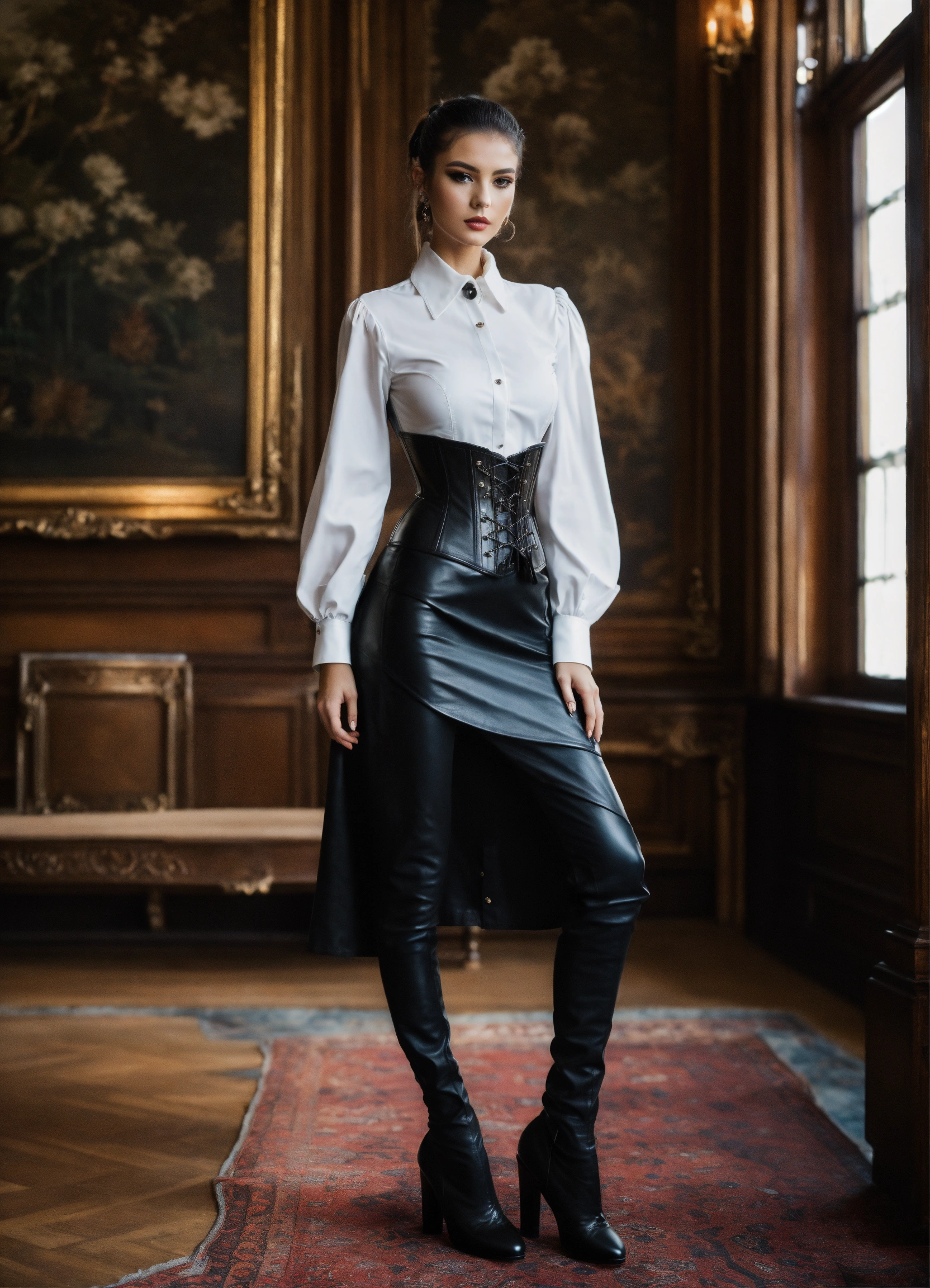 Stunning french seductress woman fashion model, brunette straight high ponytail, black leather corset, long strict victorian governess wide black long leather shirt dress with long big puff sleeves and big buttons, mansion room, white office shirt, eyeliner makeup