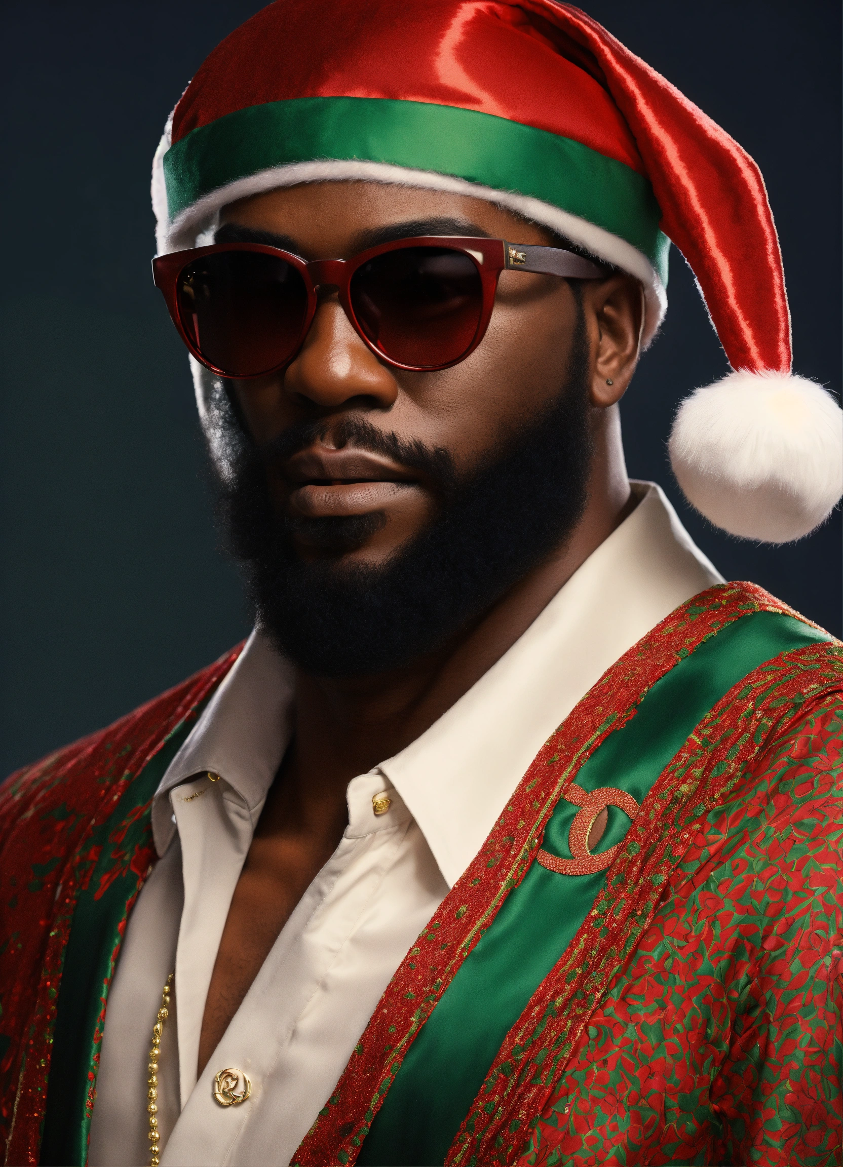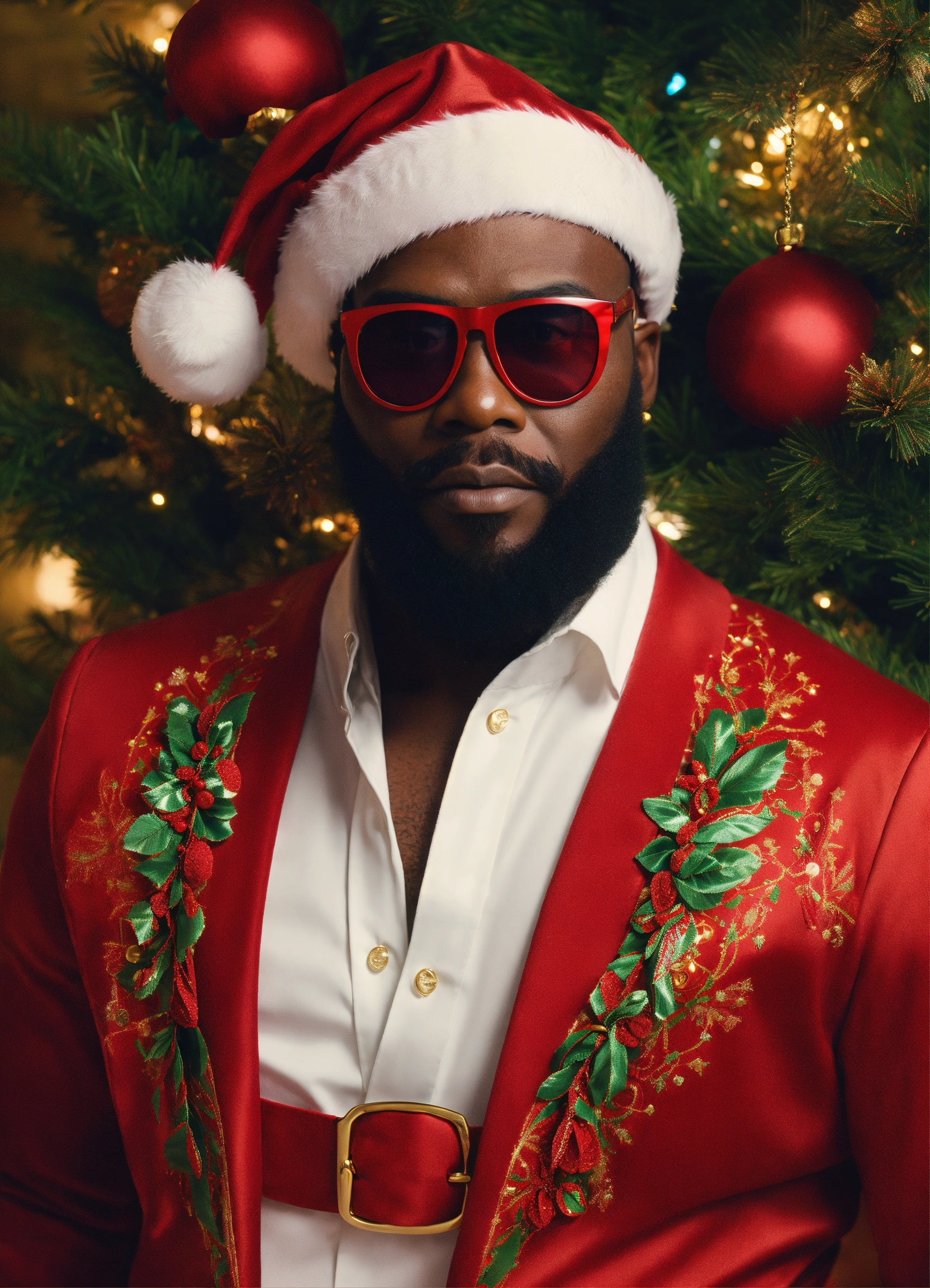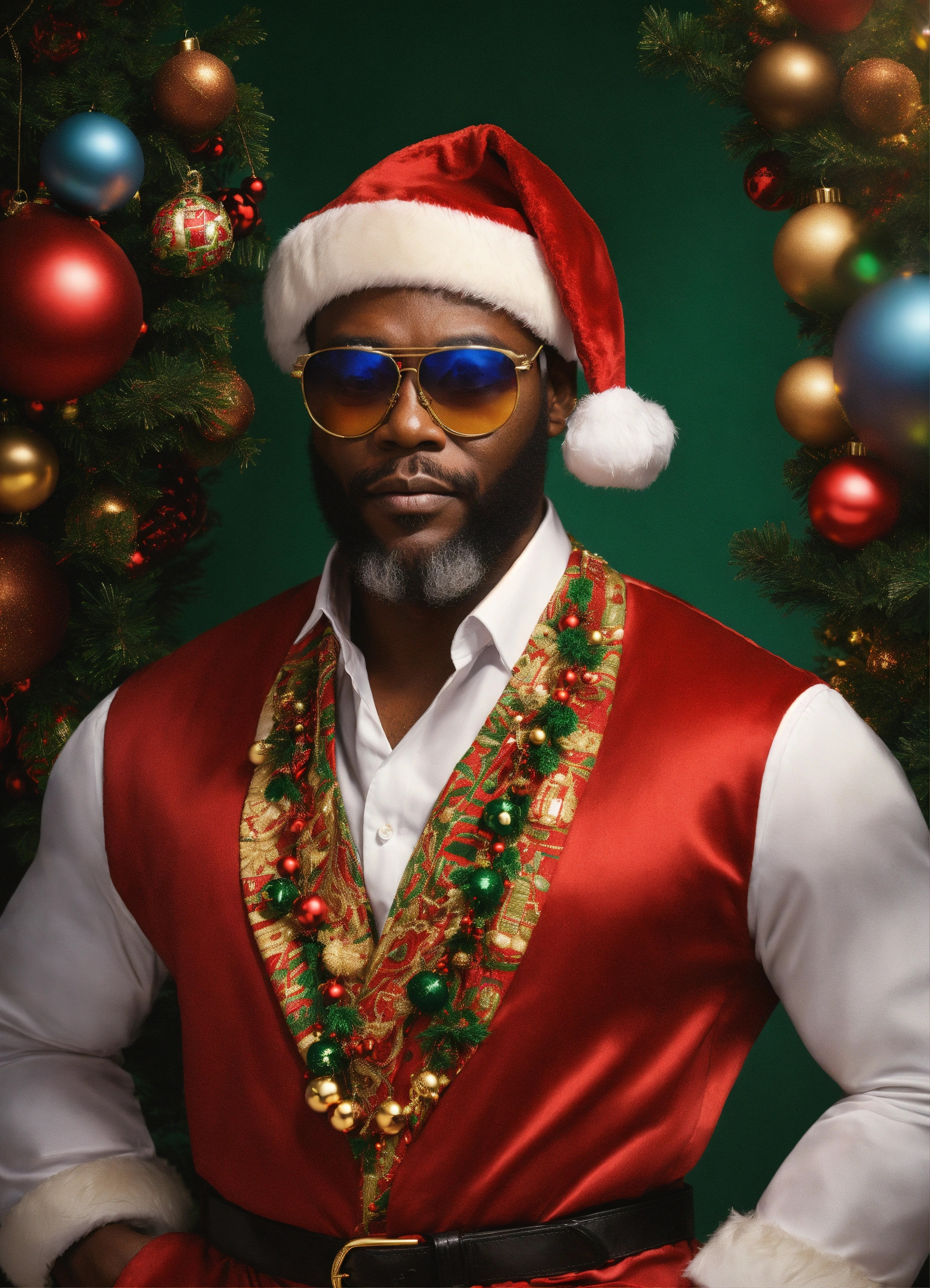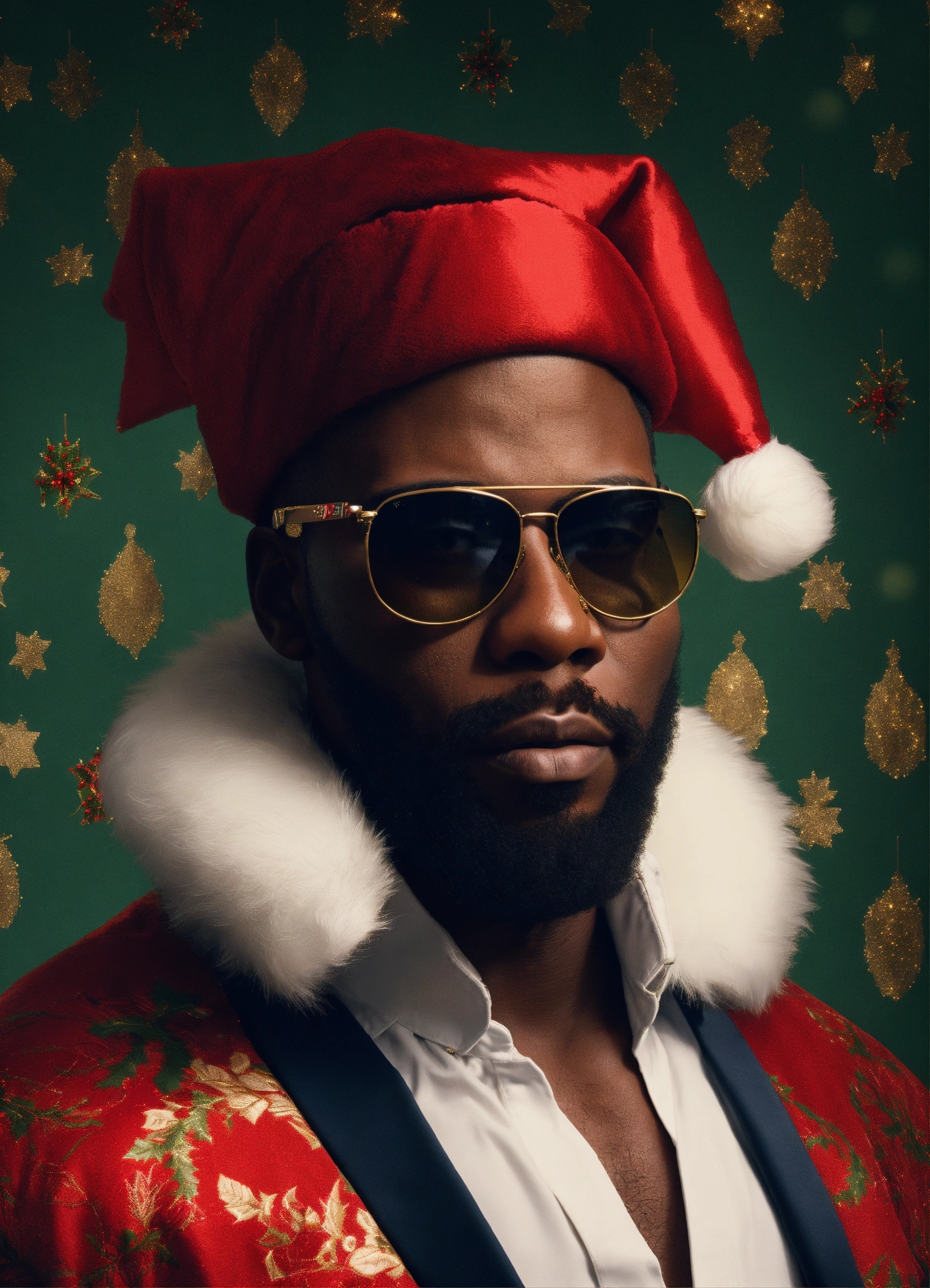 A extremely handsome modern african american santa claus, wearing sunglasses and a traditional costume, inspired by gucci. --v 5.0