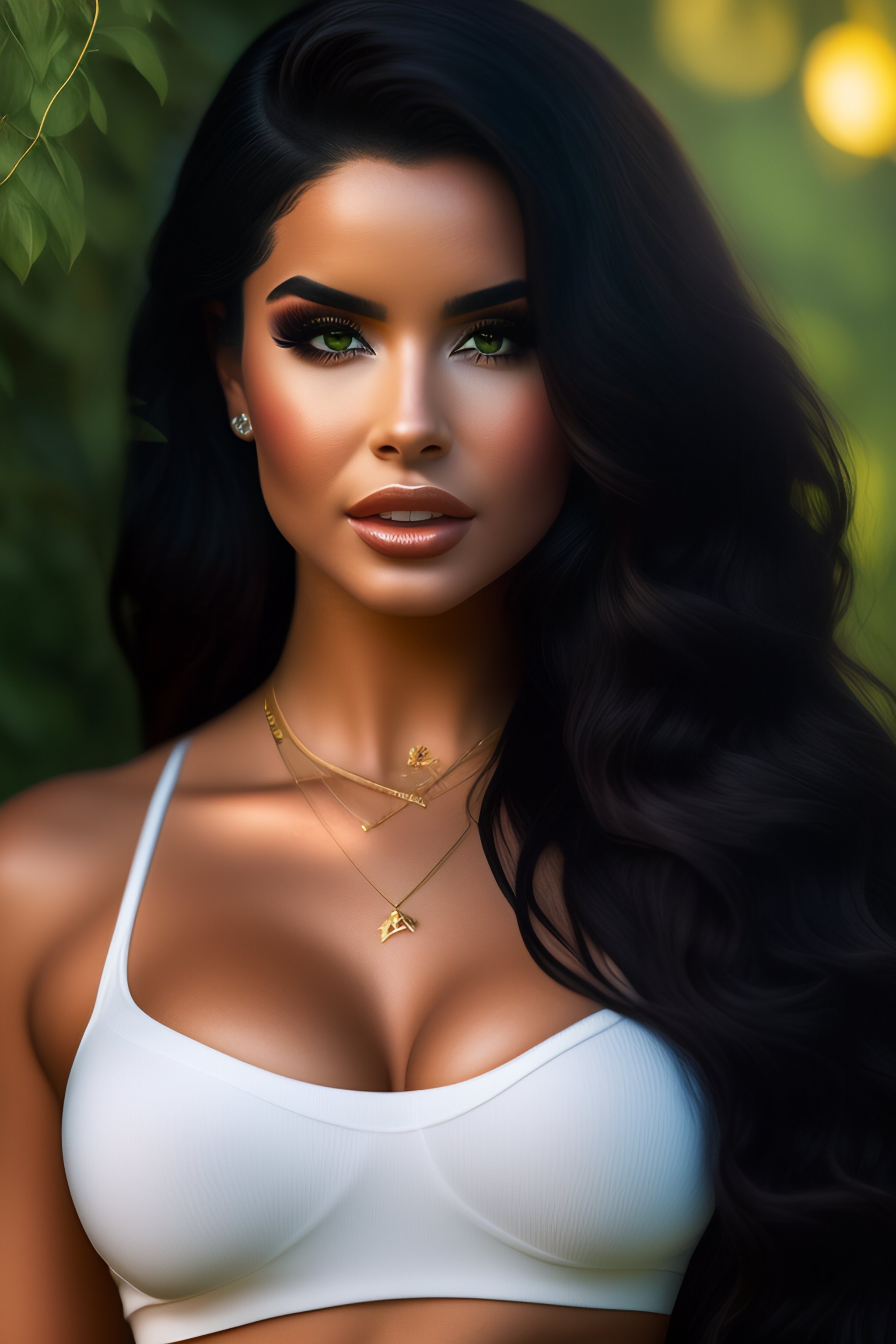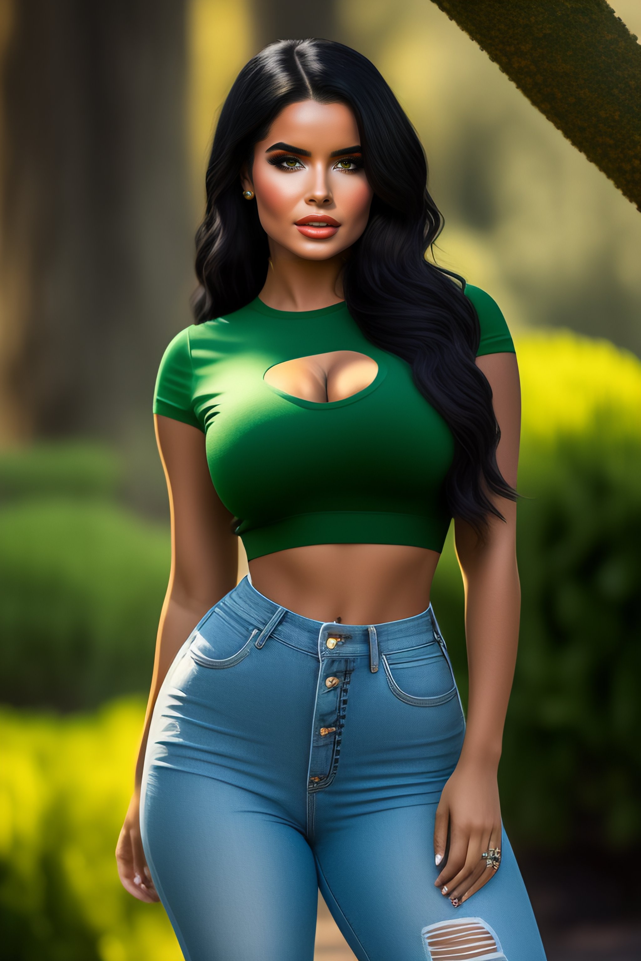 Full body length studio photos of demi rose with black hair and green eyes, wearing t-shirt and jeans, beautiful face, photorealistic, high details, 8k, branches