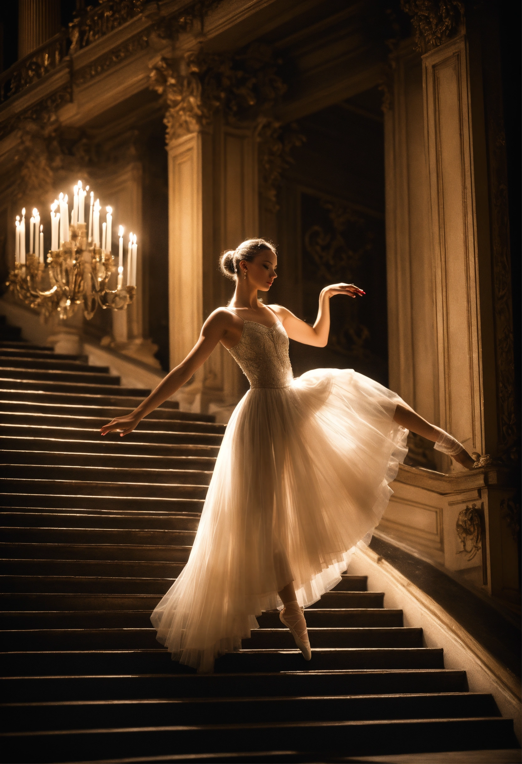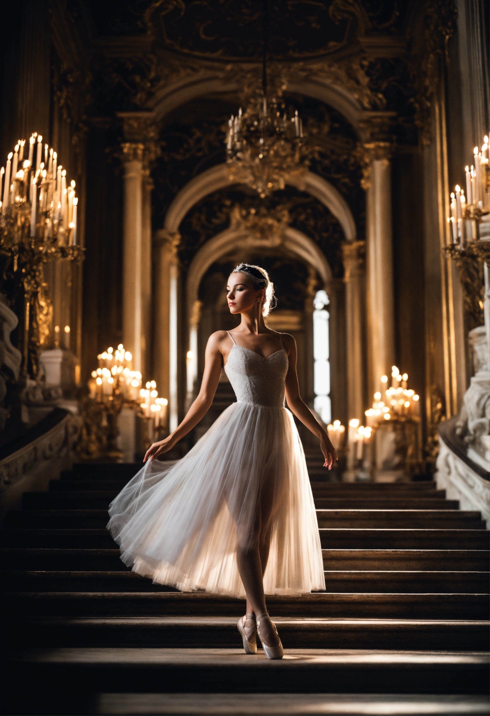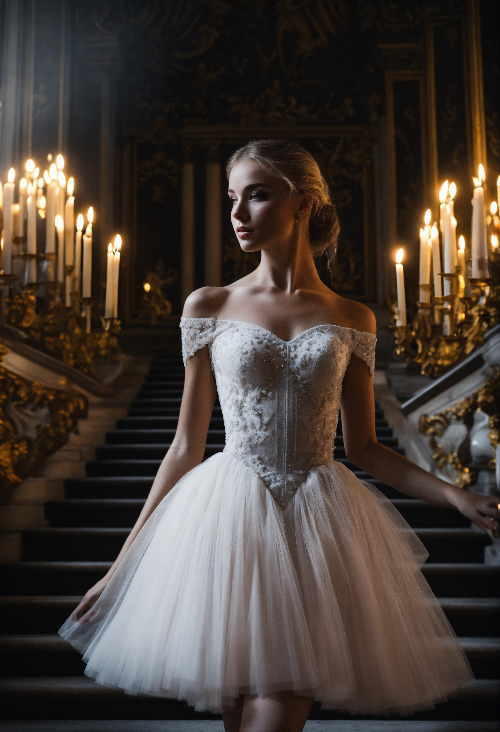 Photo black and white 16k, focus on the face, close-up on the ballerina, dancing ballet dancer, blonde woman, with ballerinas, with a beautiful white short dress with a transparent design, backlighting behind the dancer, photography, on a staircase of the palace of versailles, with candles, ultra quality, realistic photographic rendering, cinematic, photo with canon eos 5d mark iv, cinematic, realistic, black background, photo fusion, sfx photo.