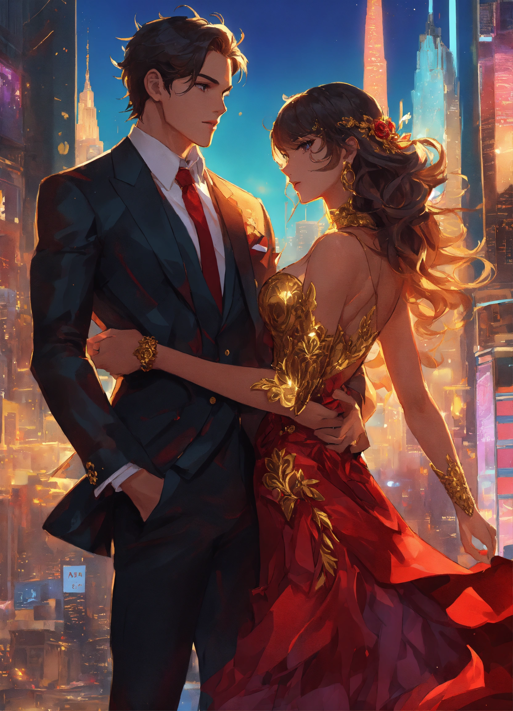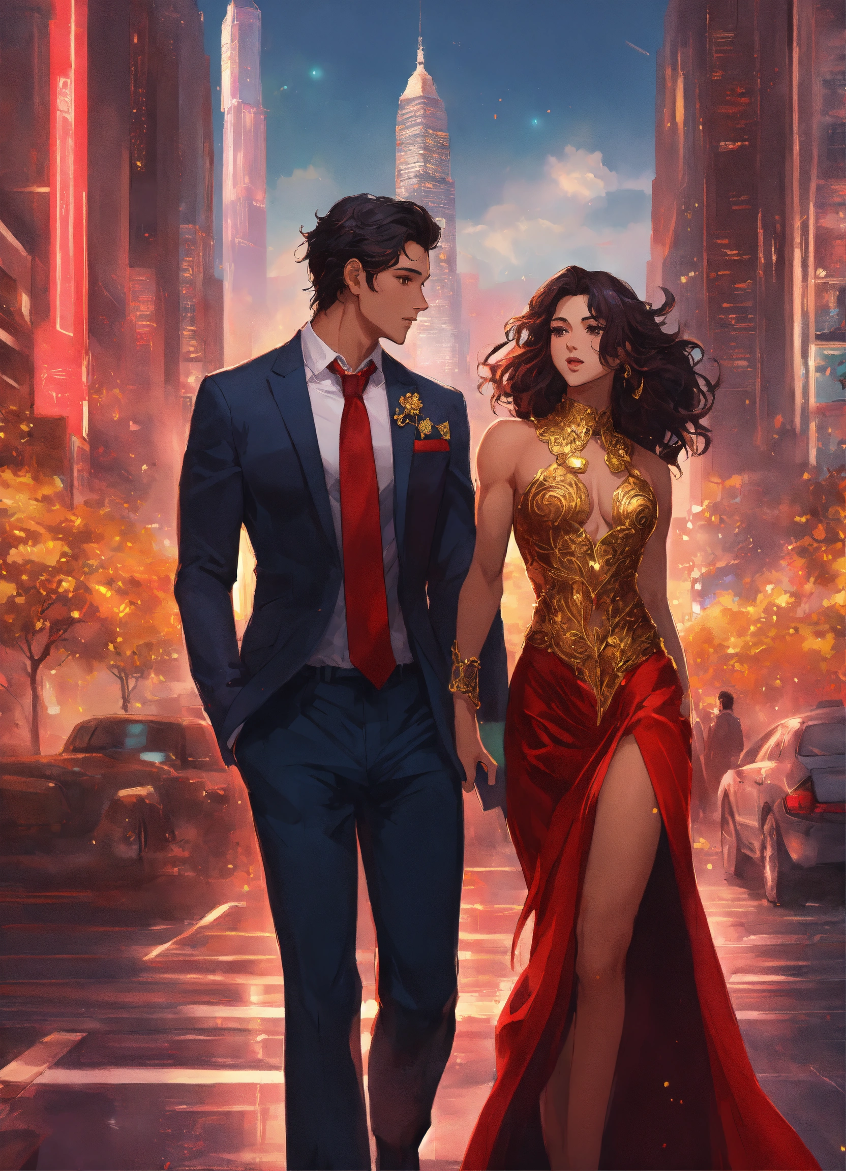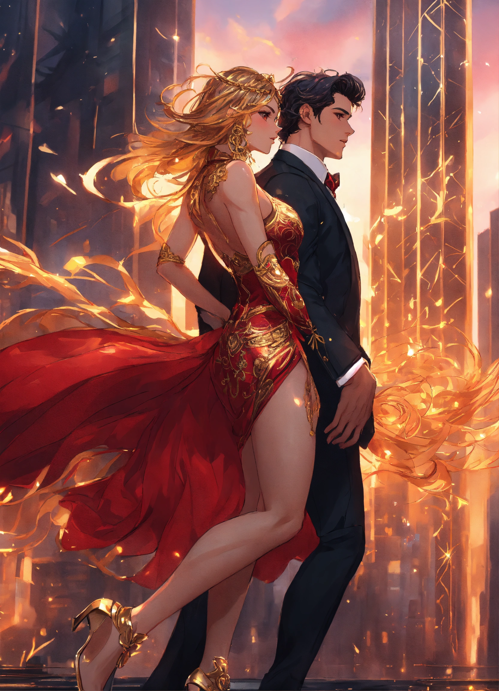 Illustration of beautiful city with crystal skyscrapers, vibrant colors, fair skin, the young man wears a intricate black suit with gold ornaments and a tie, has wavy black tousled hair, the woman wears a red dress with gold adornments that shows legs, she has muscles, maximalist, 8k photo, animestyle, by artgerm, trending on artstation