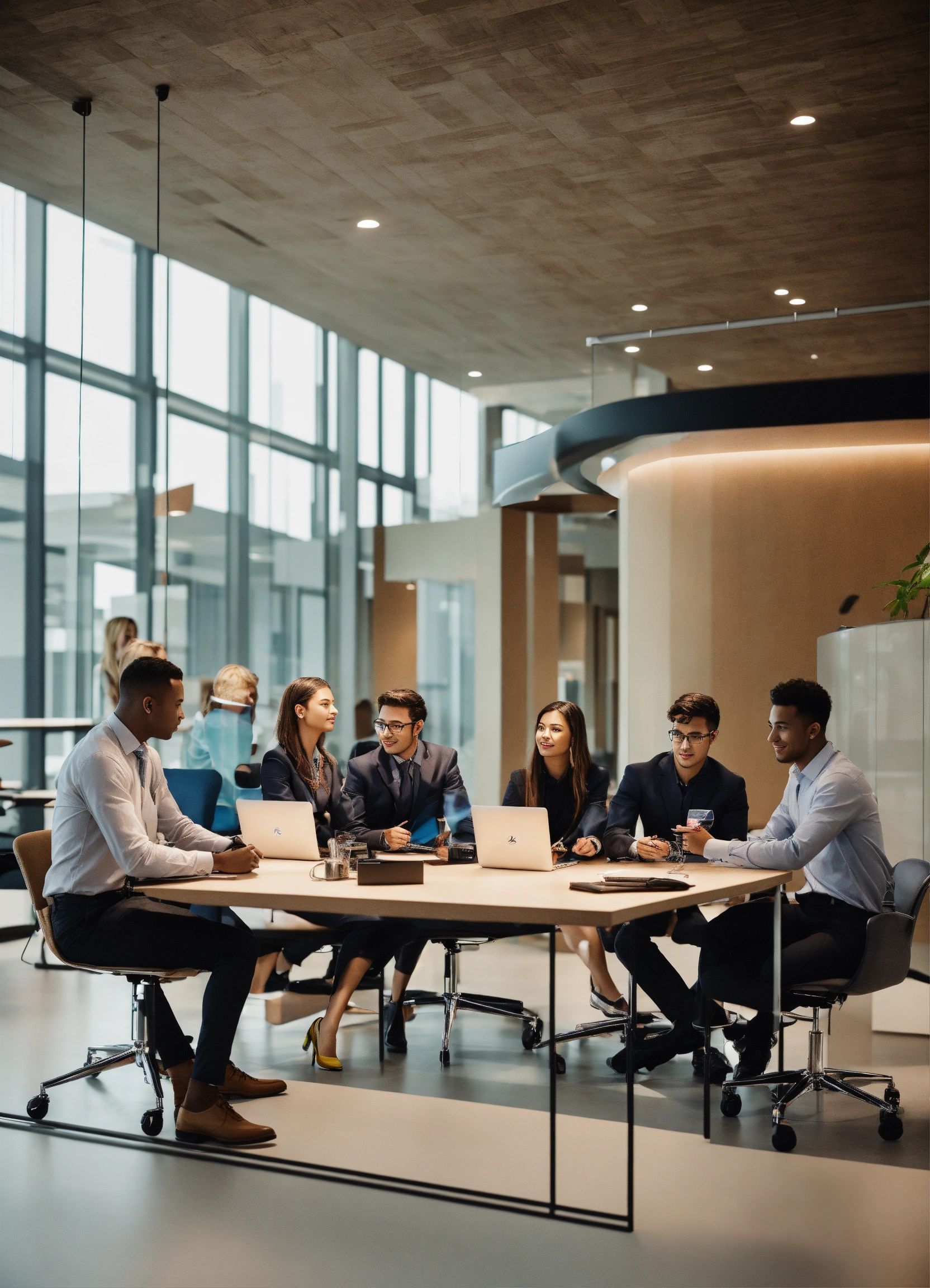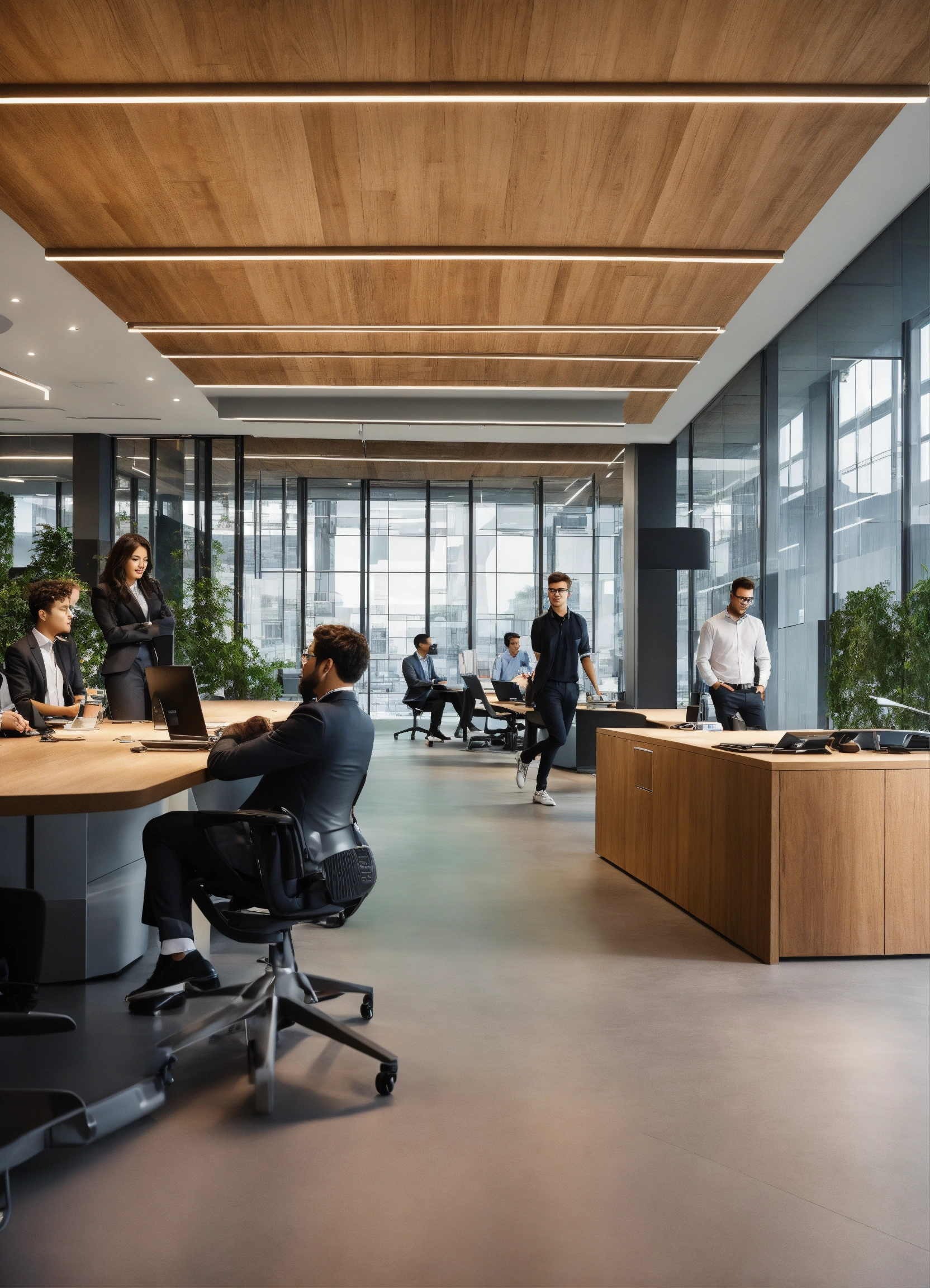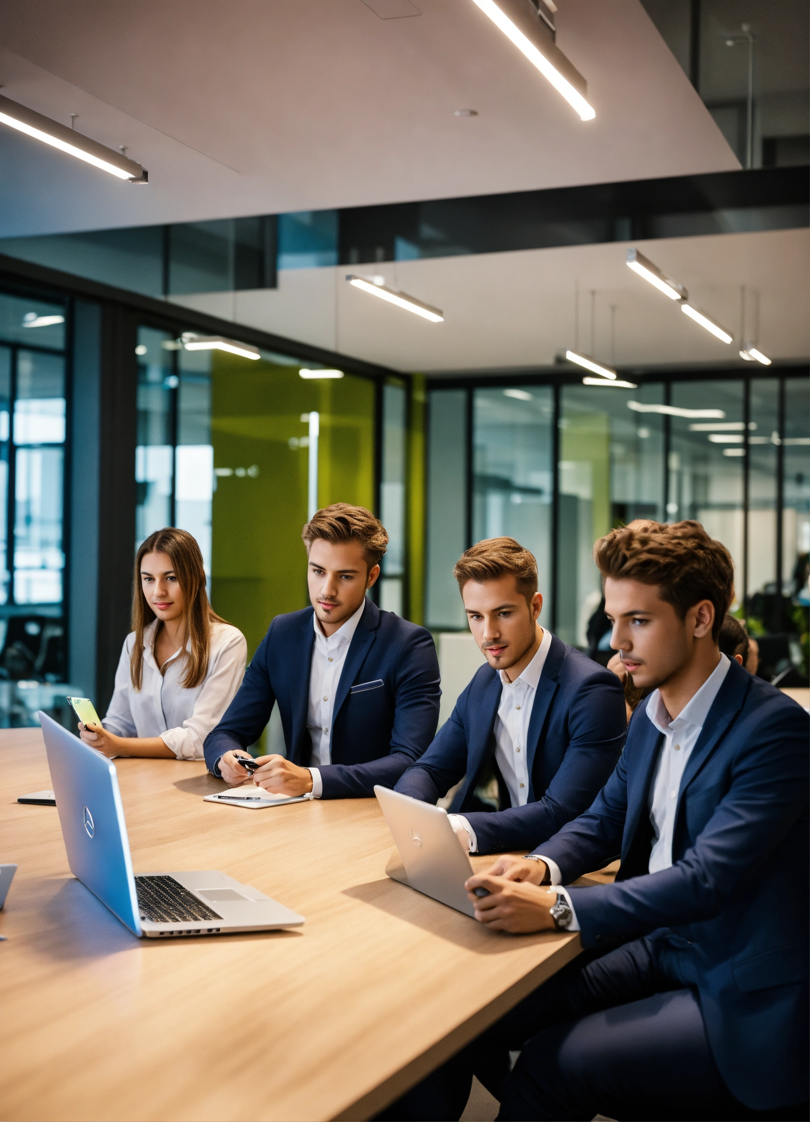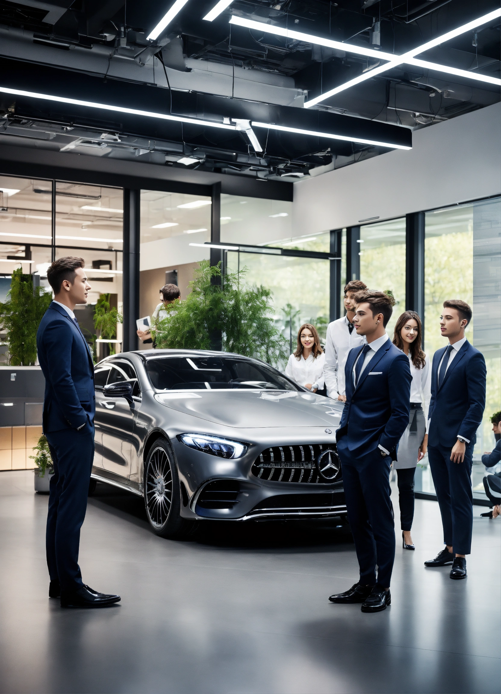 A group of 5 people one girl and four guys working in mercedes-benz office in the future