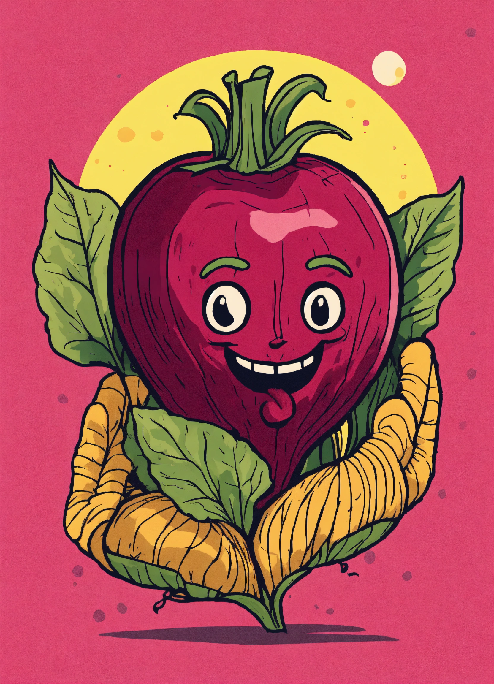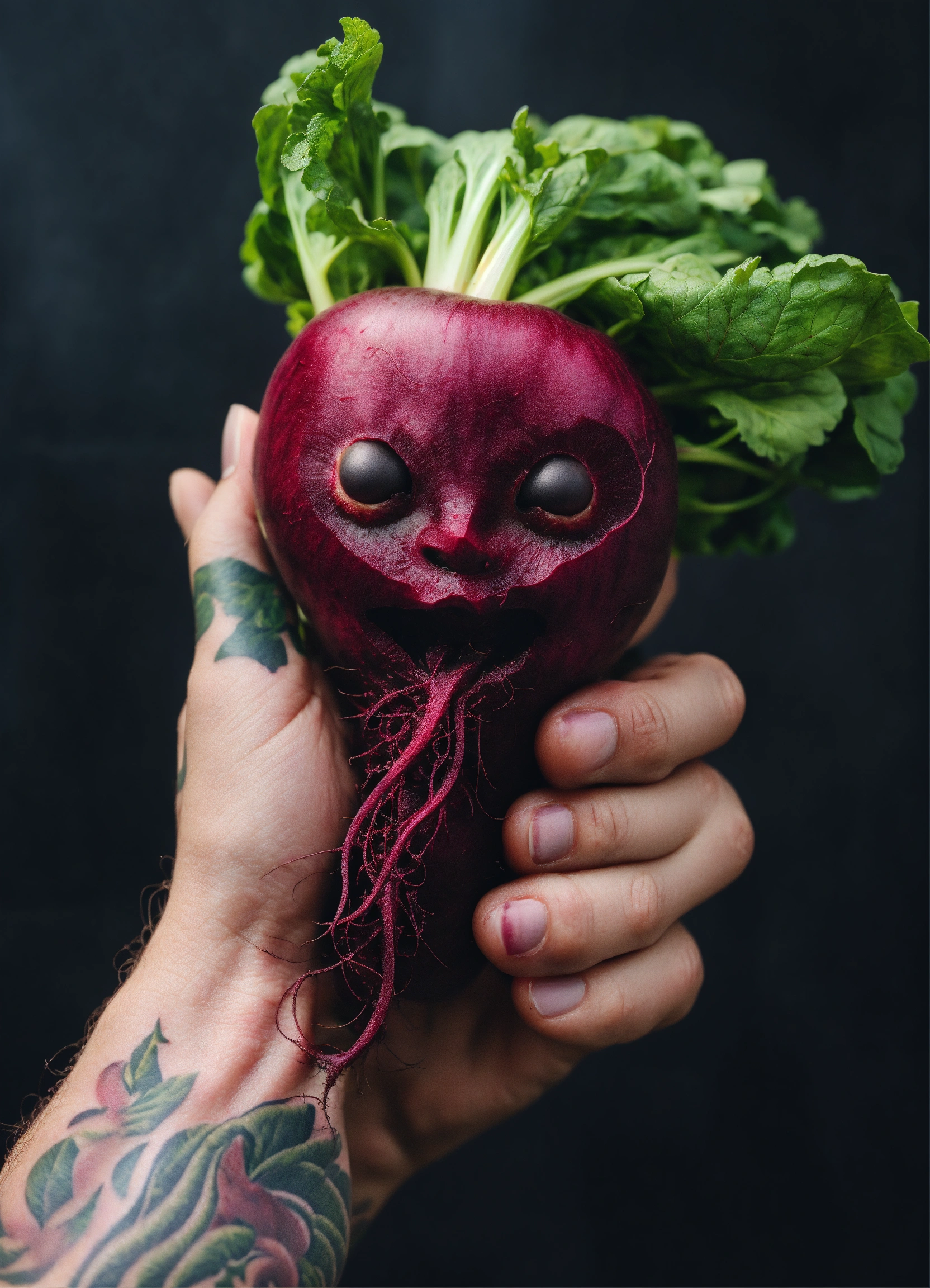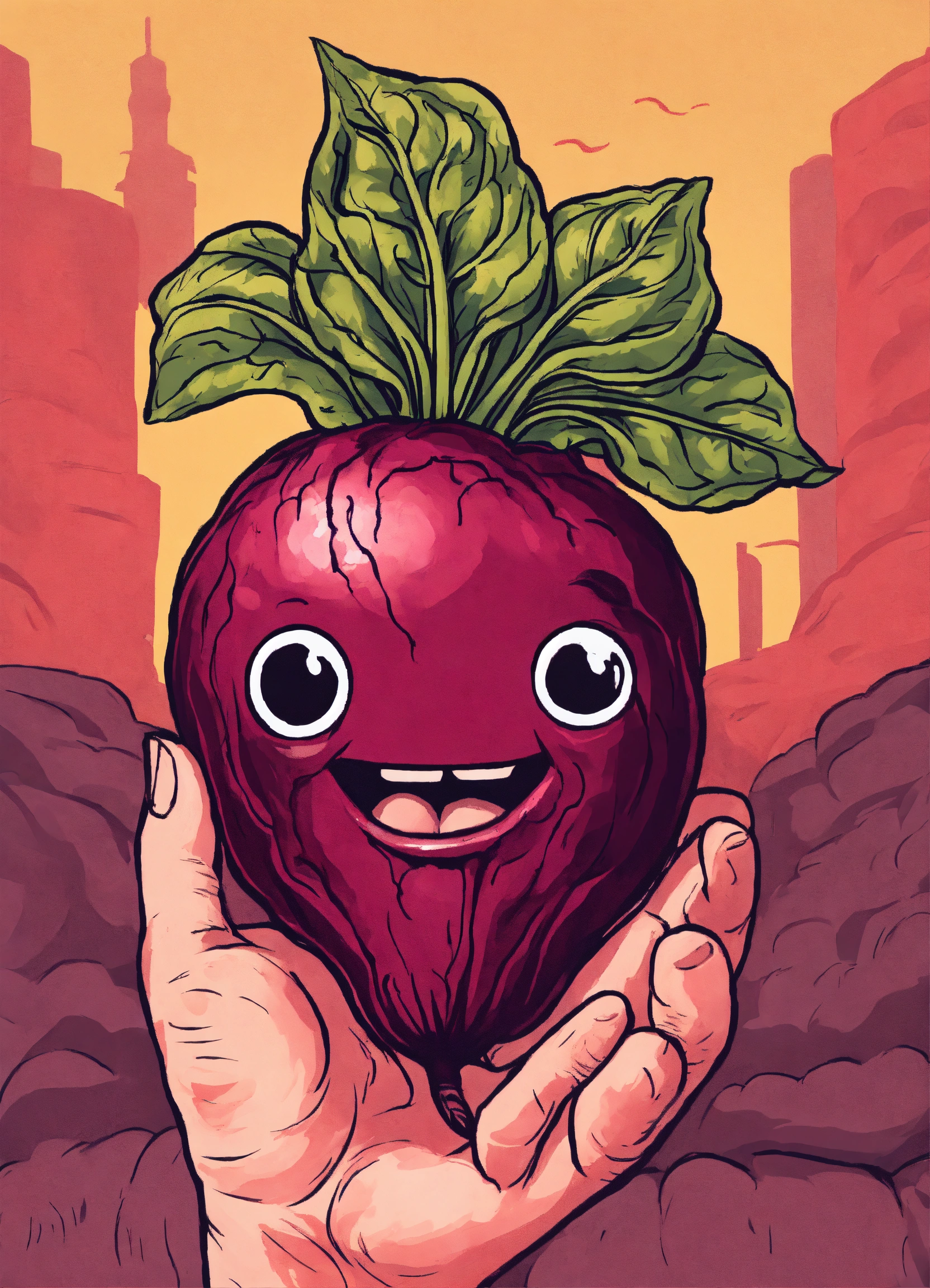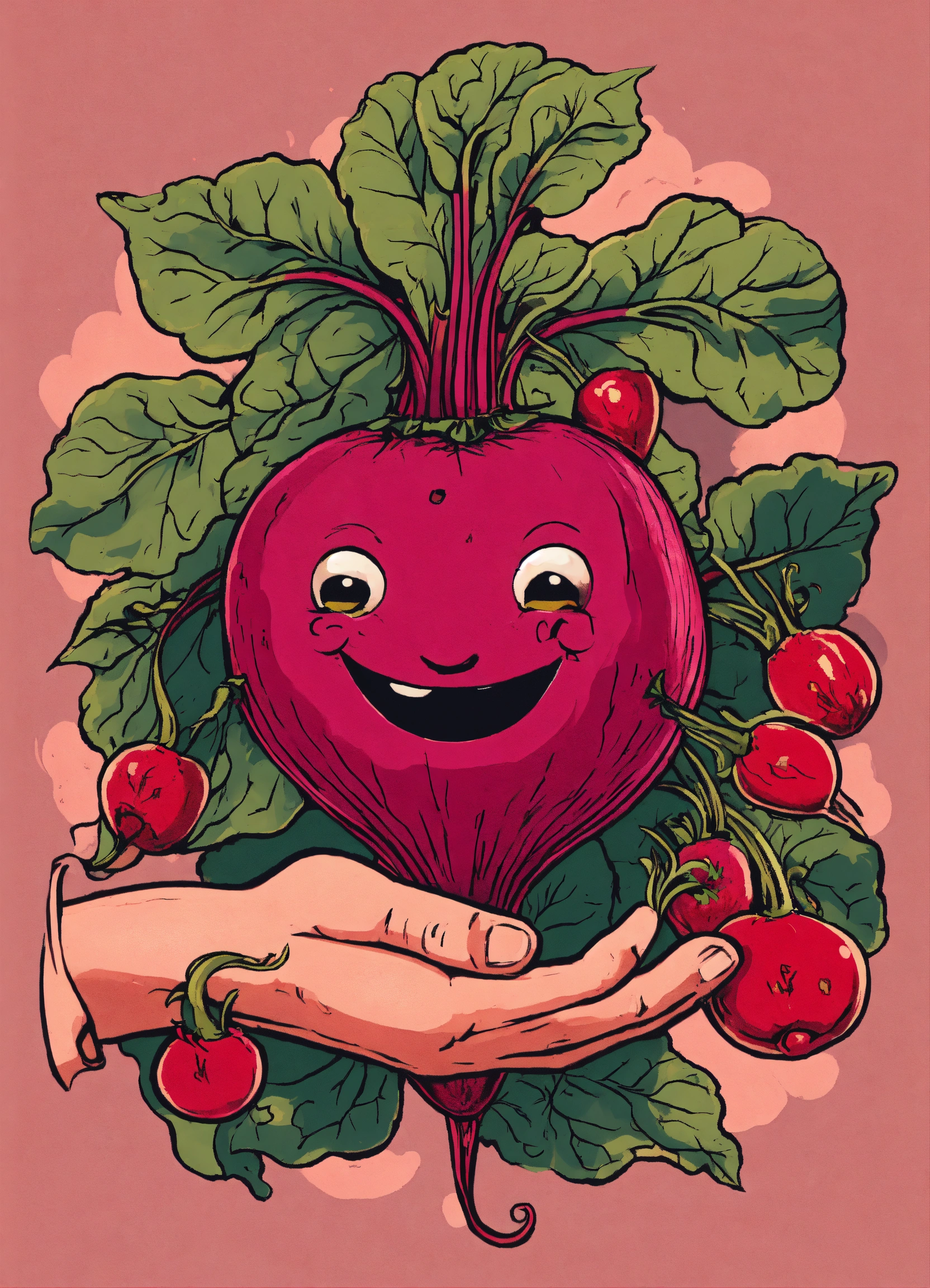 Tattoo style beetroot being held by a large hand and the beetroot has a face that is expressing bliss