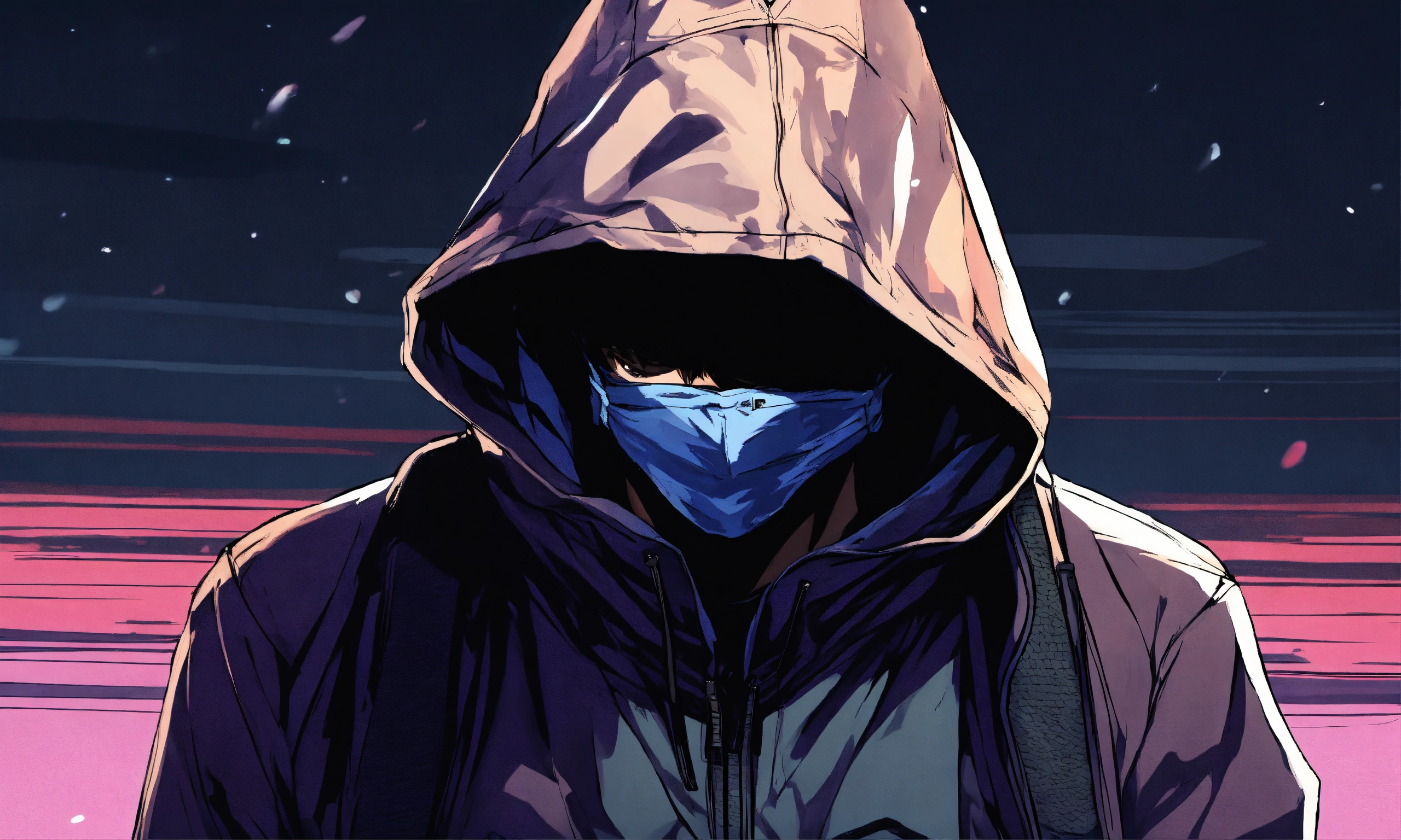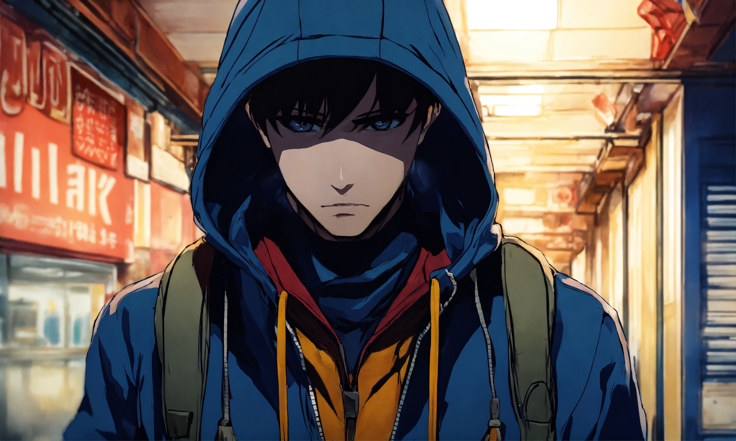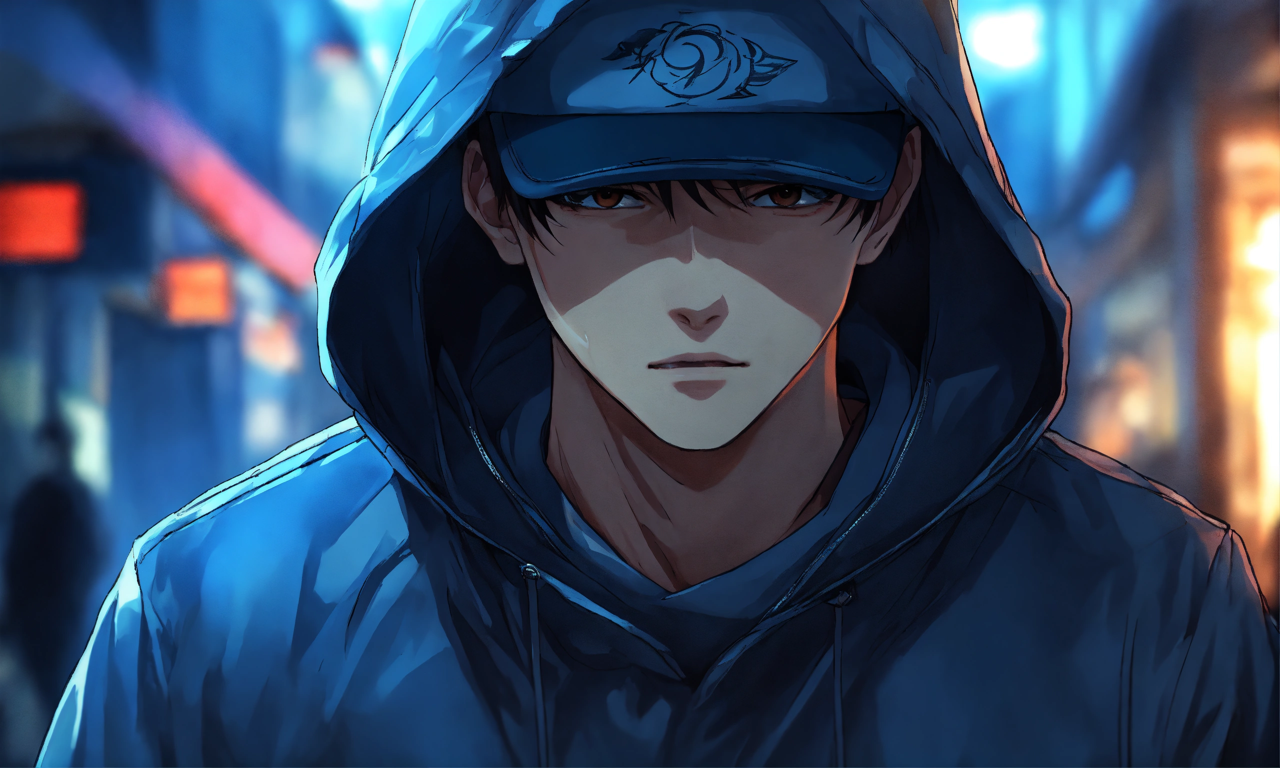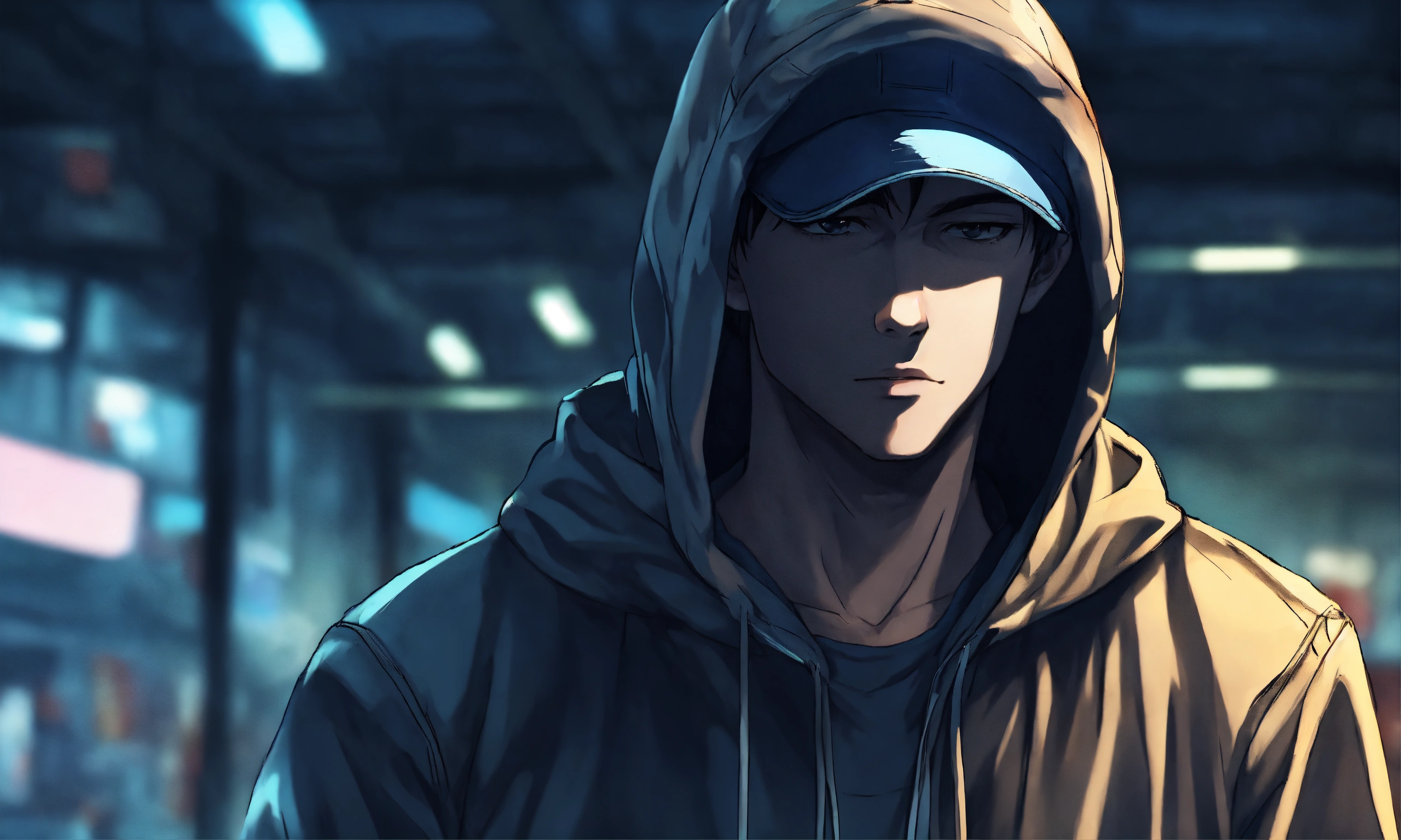 Well-fitting man equipped with hoodie and cap hiding upper face in anime manga style