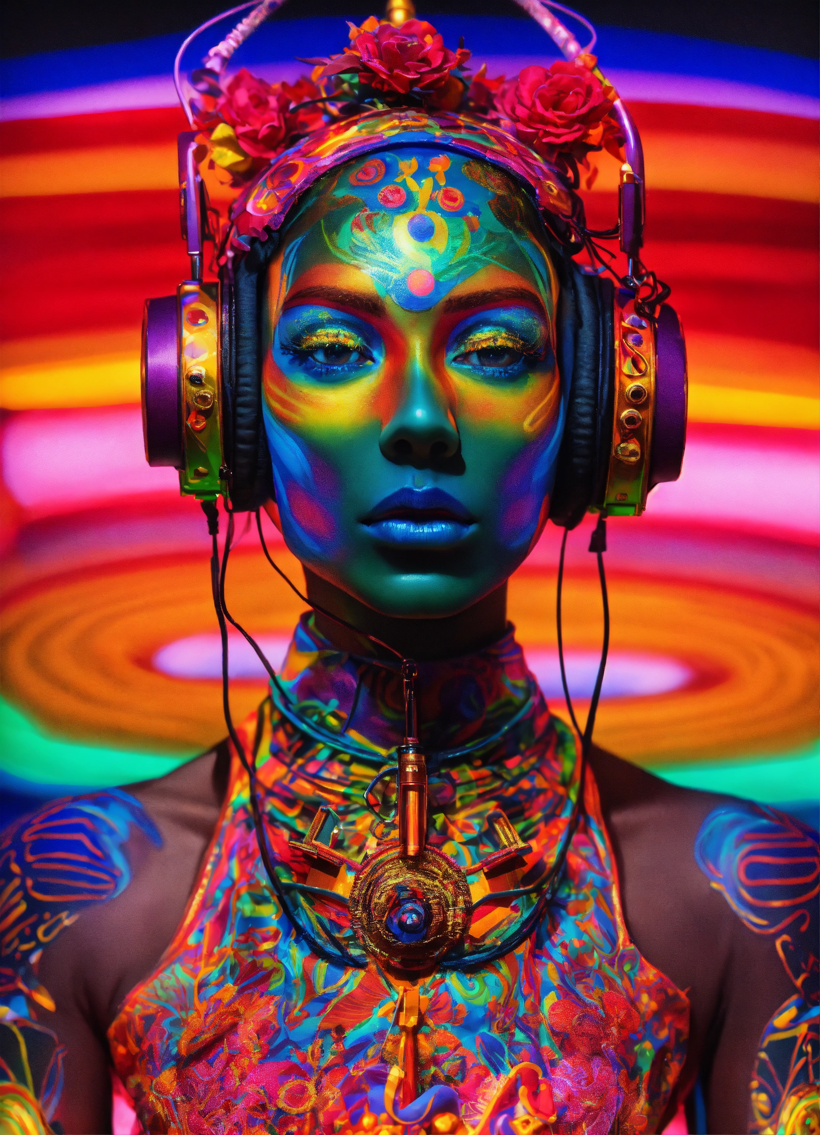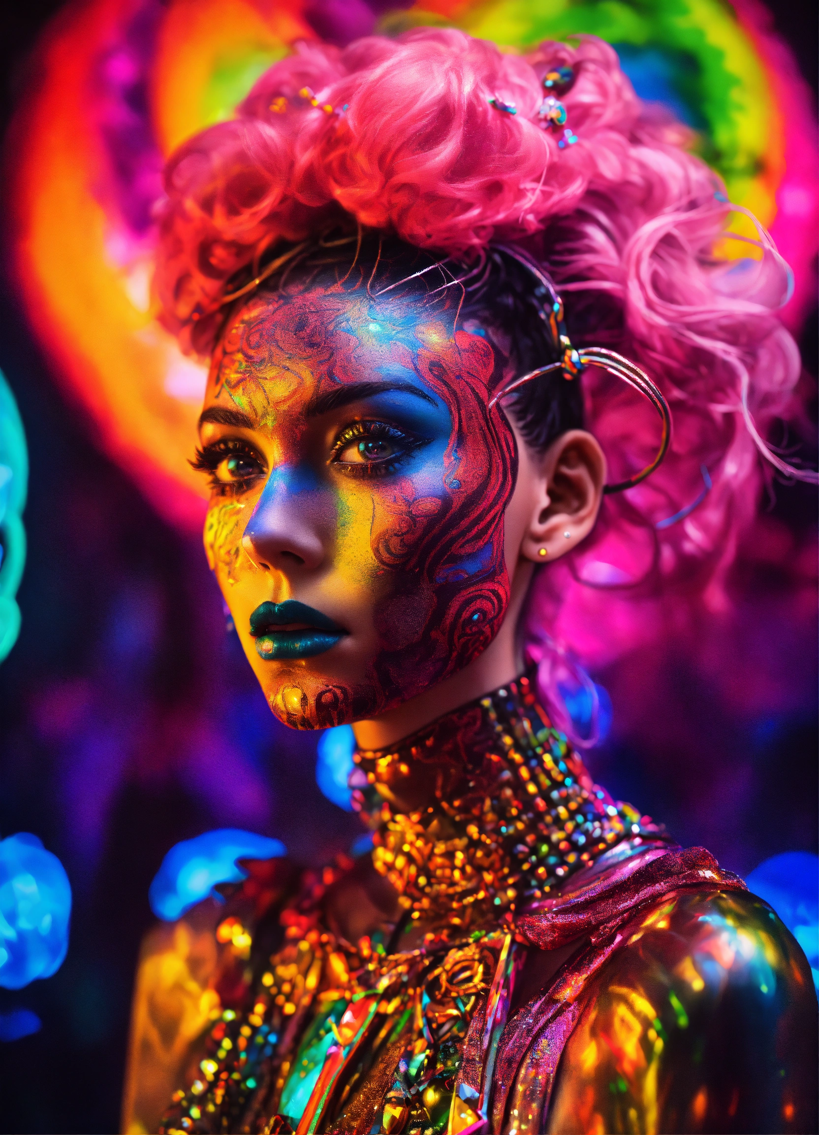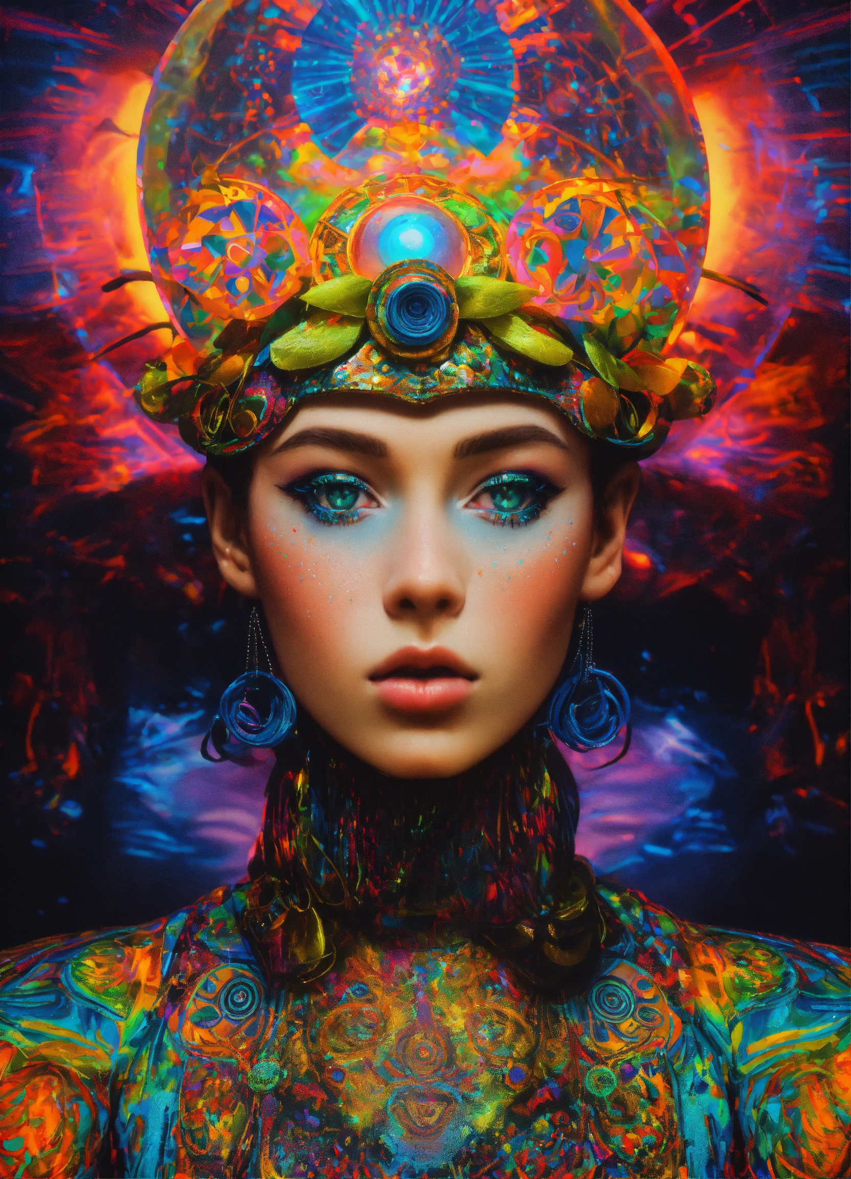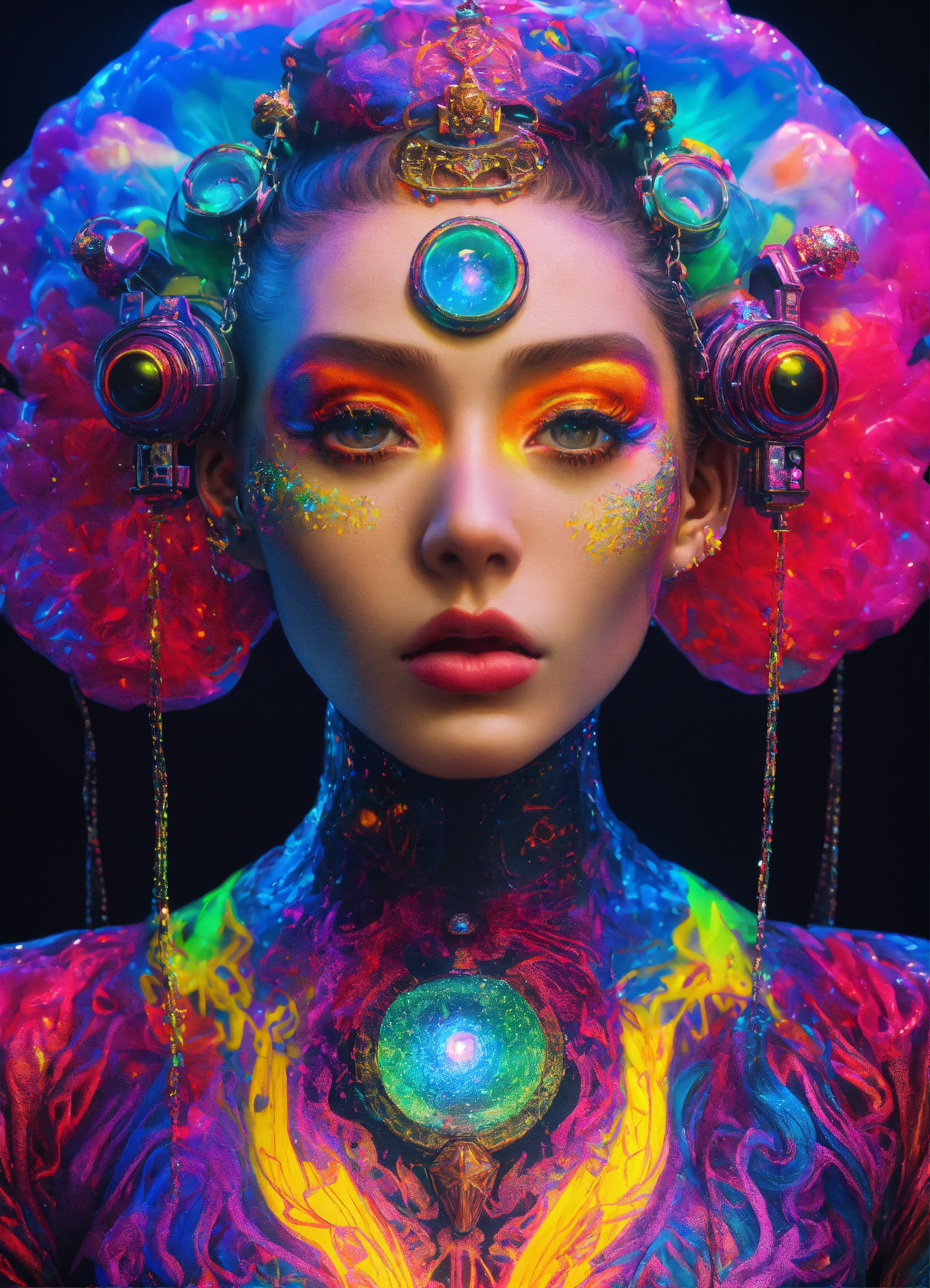 Photorealistic 3d 35 mm portrait of ai god dmt psytrance grimes punk rock anime haute couture costume, baptized in a cosmic alex grey painting in a dmt black laser light neon black rainbow glitter holographic techno club art by salvador dali and holy mountain the movie.