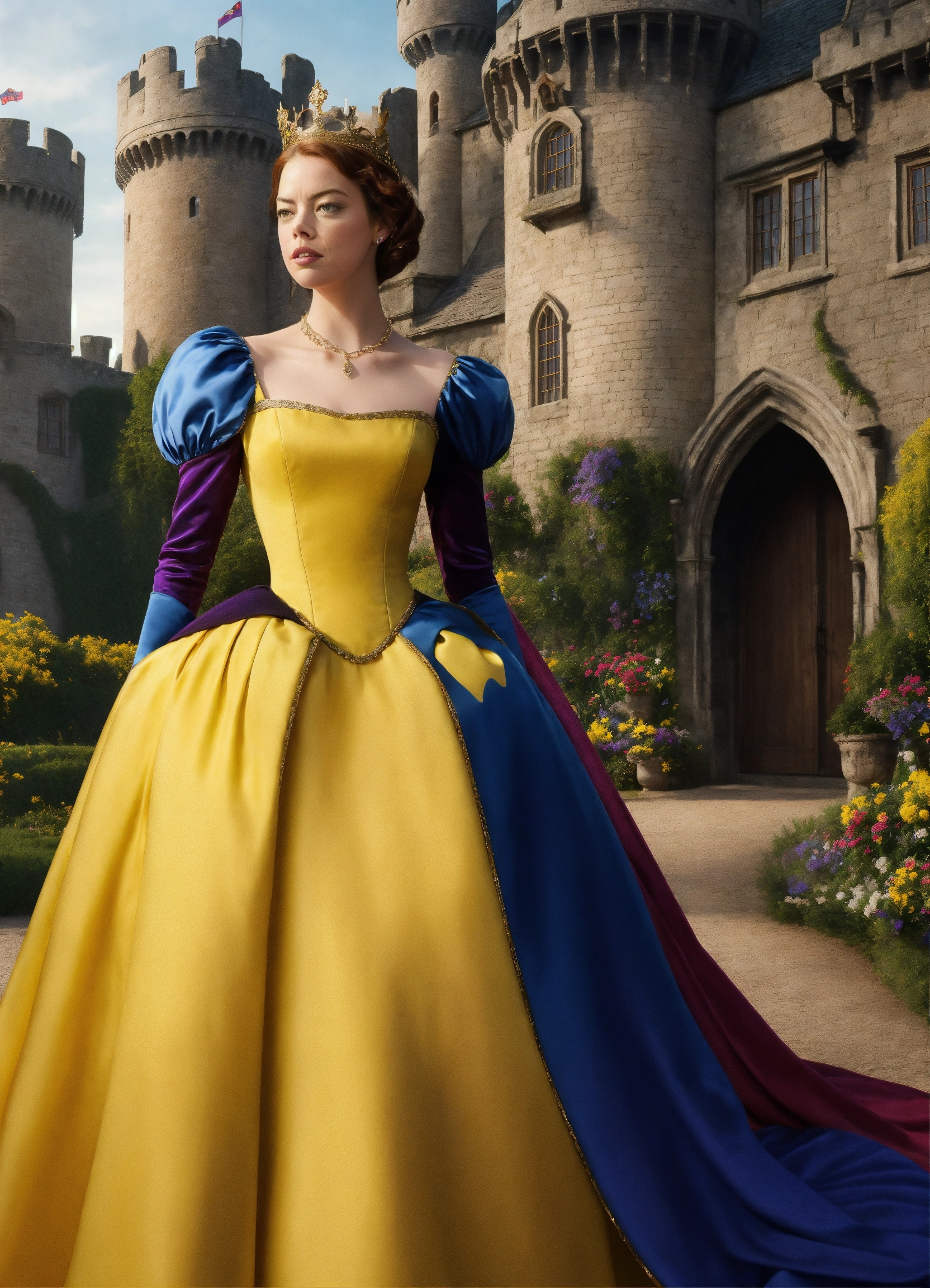 Emma stone in the role of a live-action snow white, wearing the yellow and blue dress. and amber heard in the role as the character of the evil queen, wearing the purple and black gown with a crown. setting is outside of a castle during the day. very realistic.
