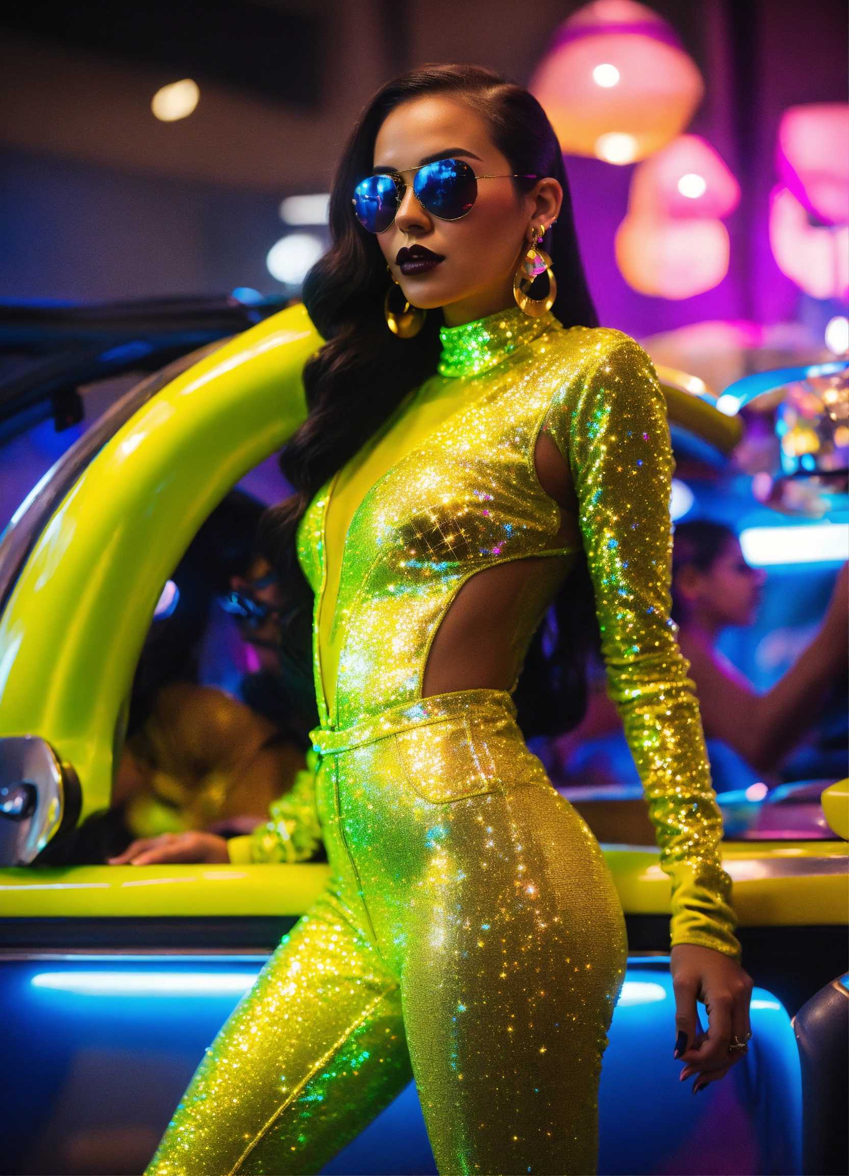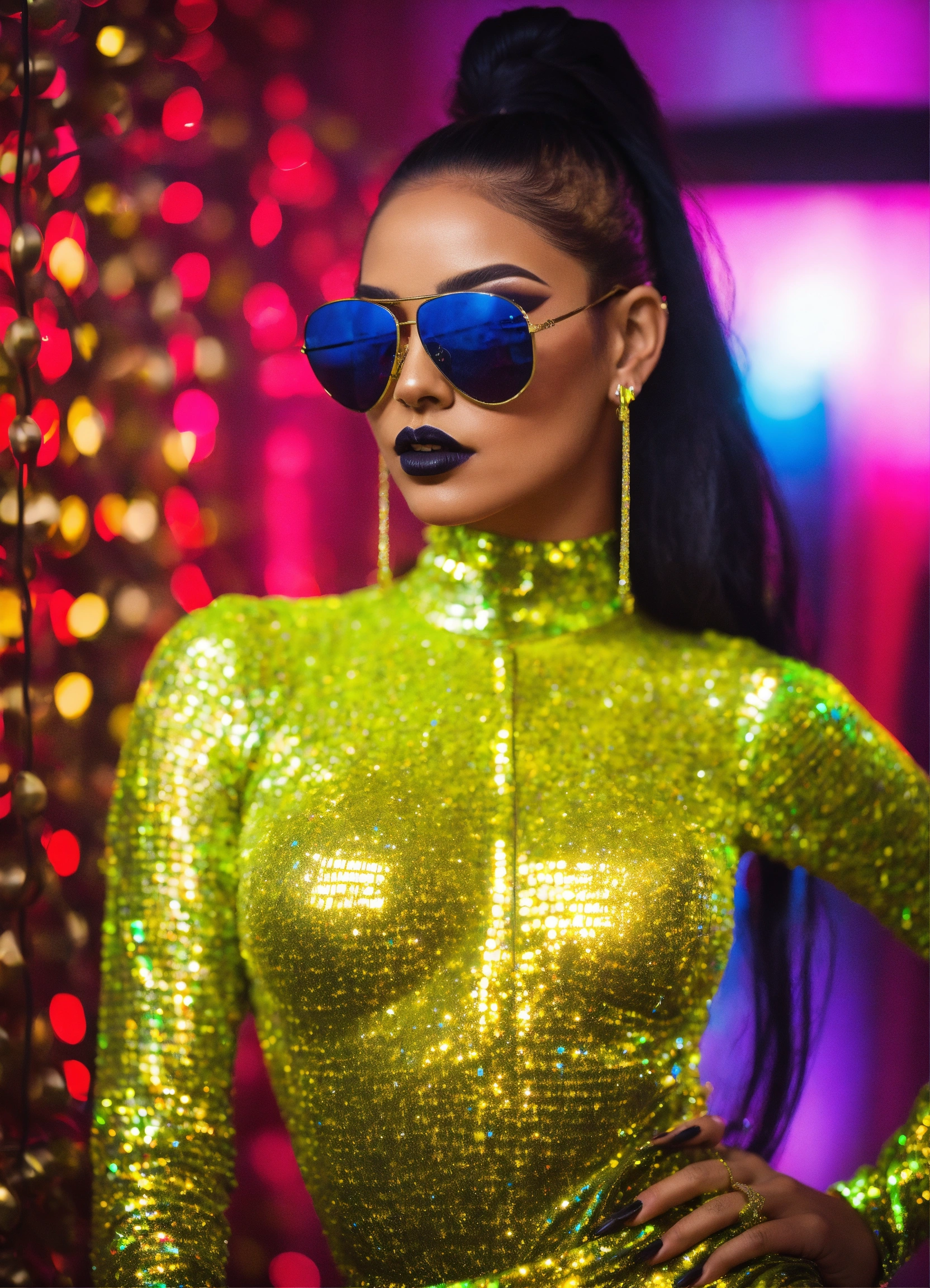 Petite latina woman with long high ponytail wearing aviator sunglasses and futuristic style sparkly yellow neon bodysuit with high heels and heavy makeup and dark lipstick and long earrings