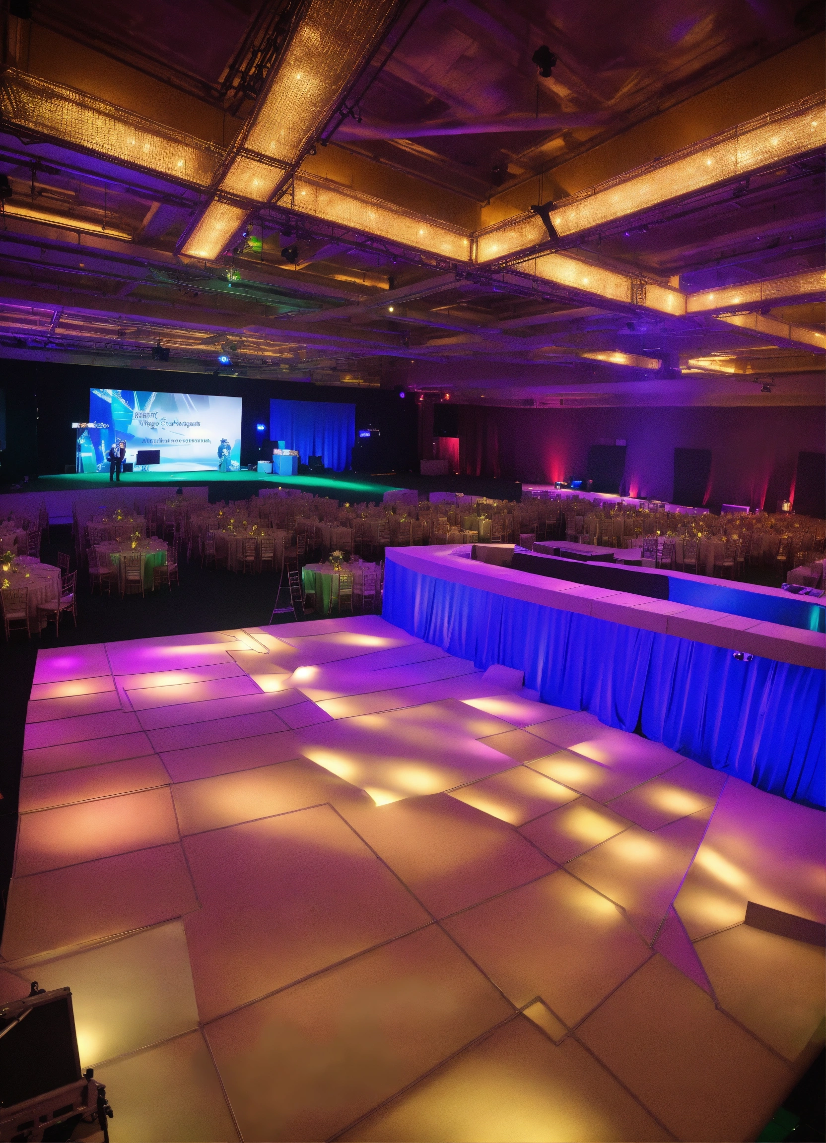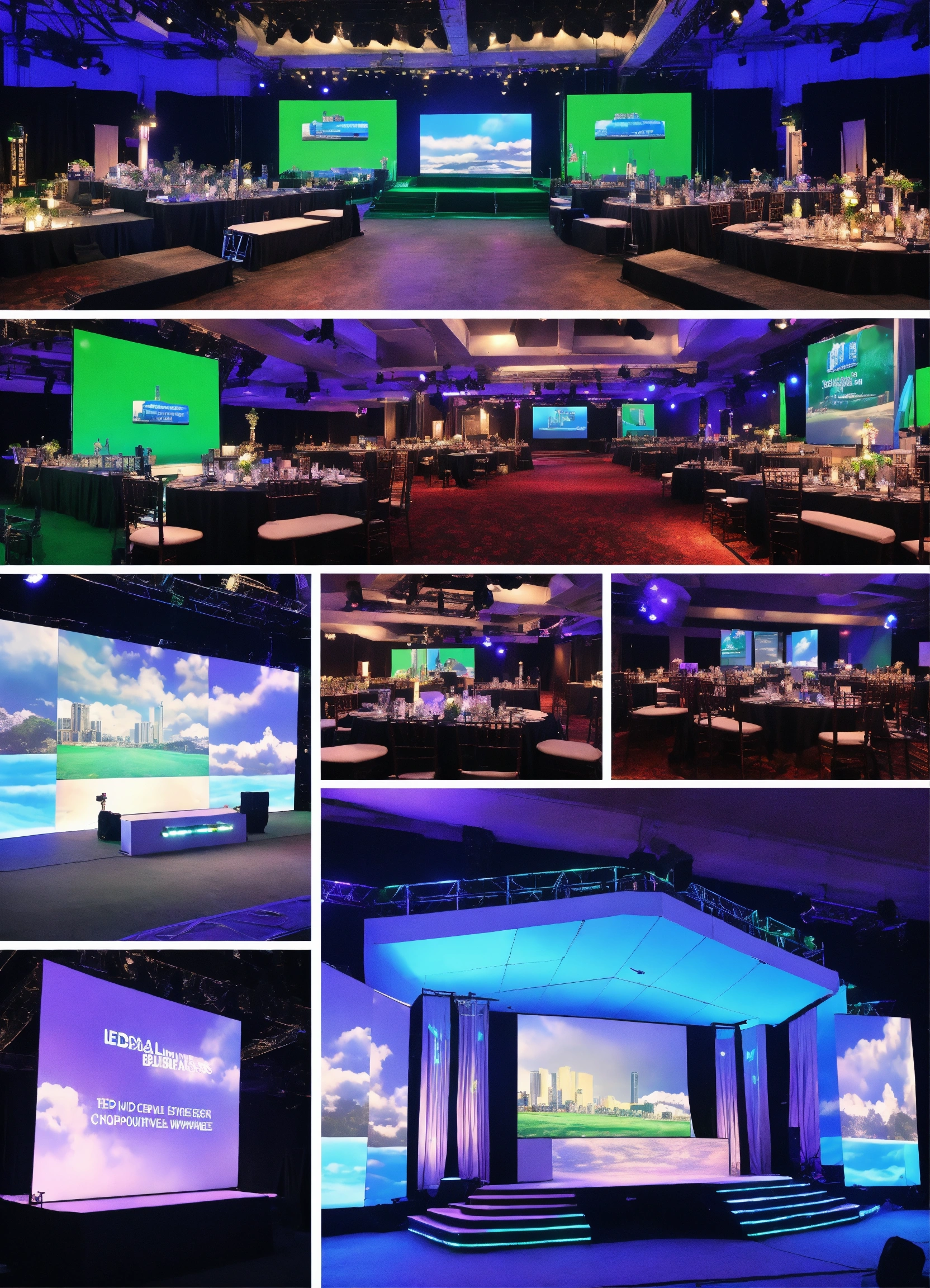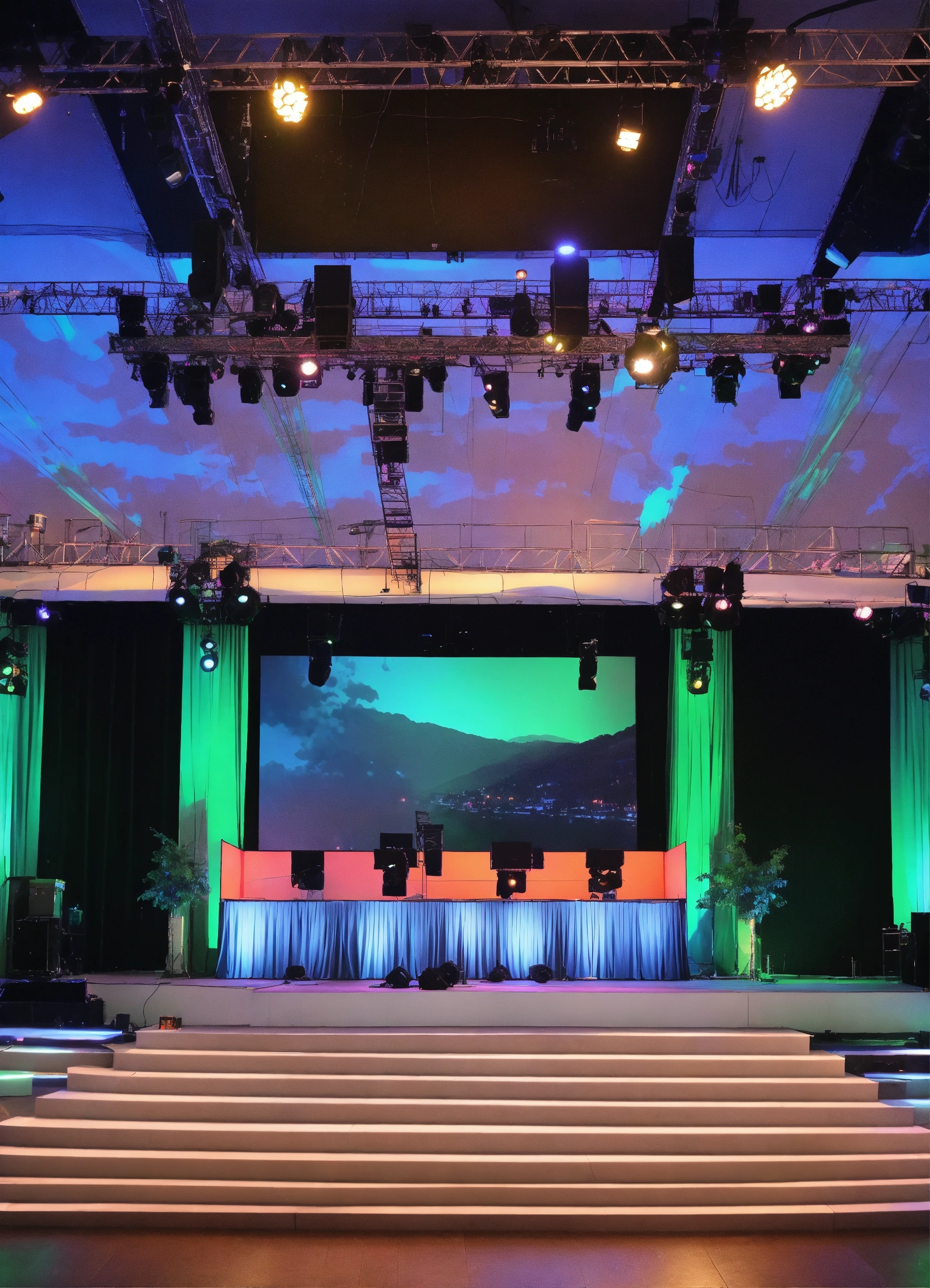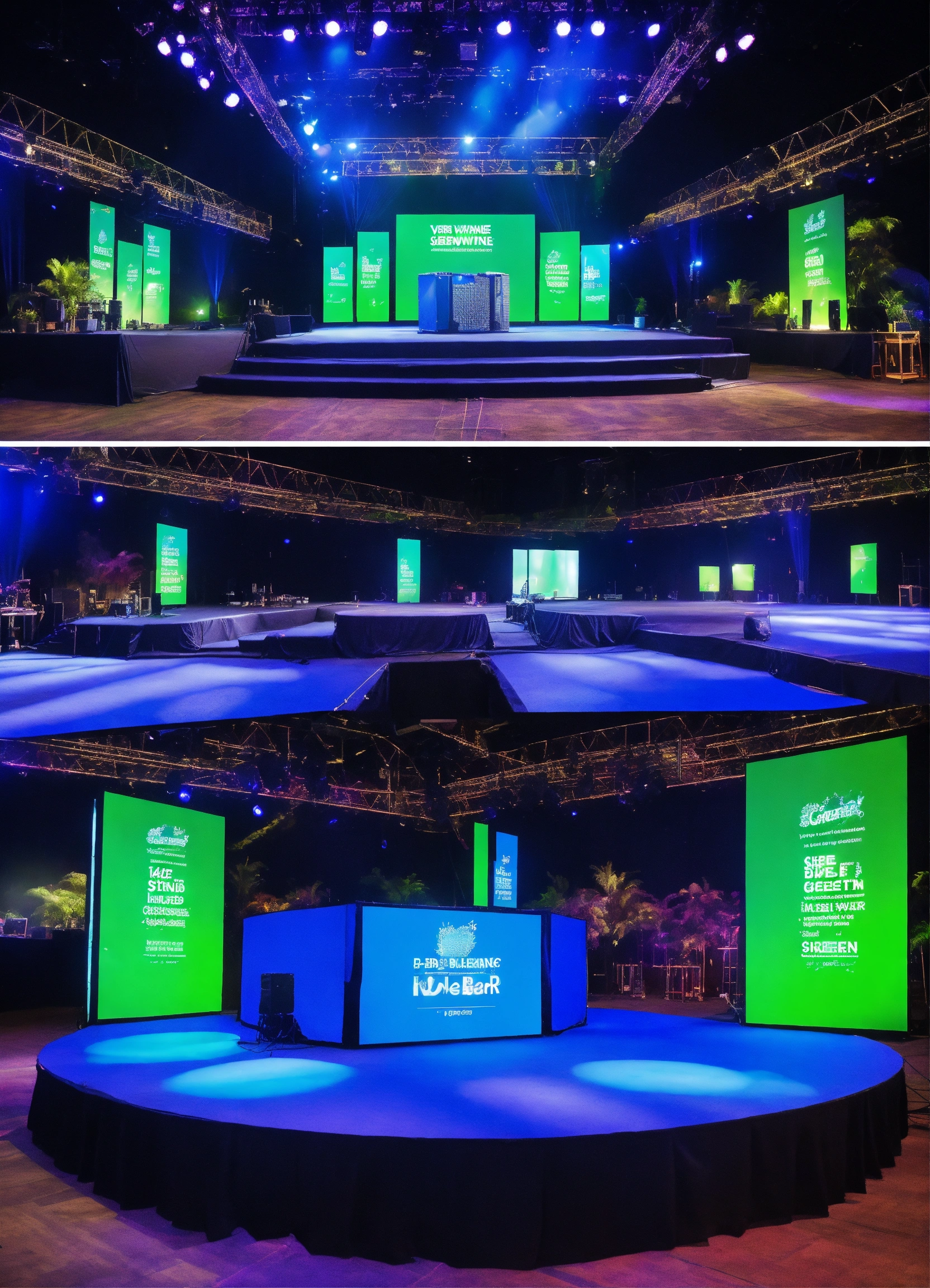 Design a medium size stage for a corporate achievement ceremony with led screen main screen with 4 side vertical led screens for display, add truss system with lighting towards the stage, add nice glamorous steps to the stage with lights including a premium skirting on the side as a decor, incorporate the theme to be about raising the bar in the business world, use blue white and green colors