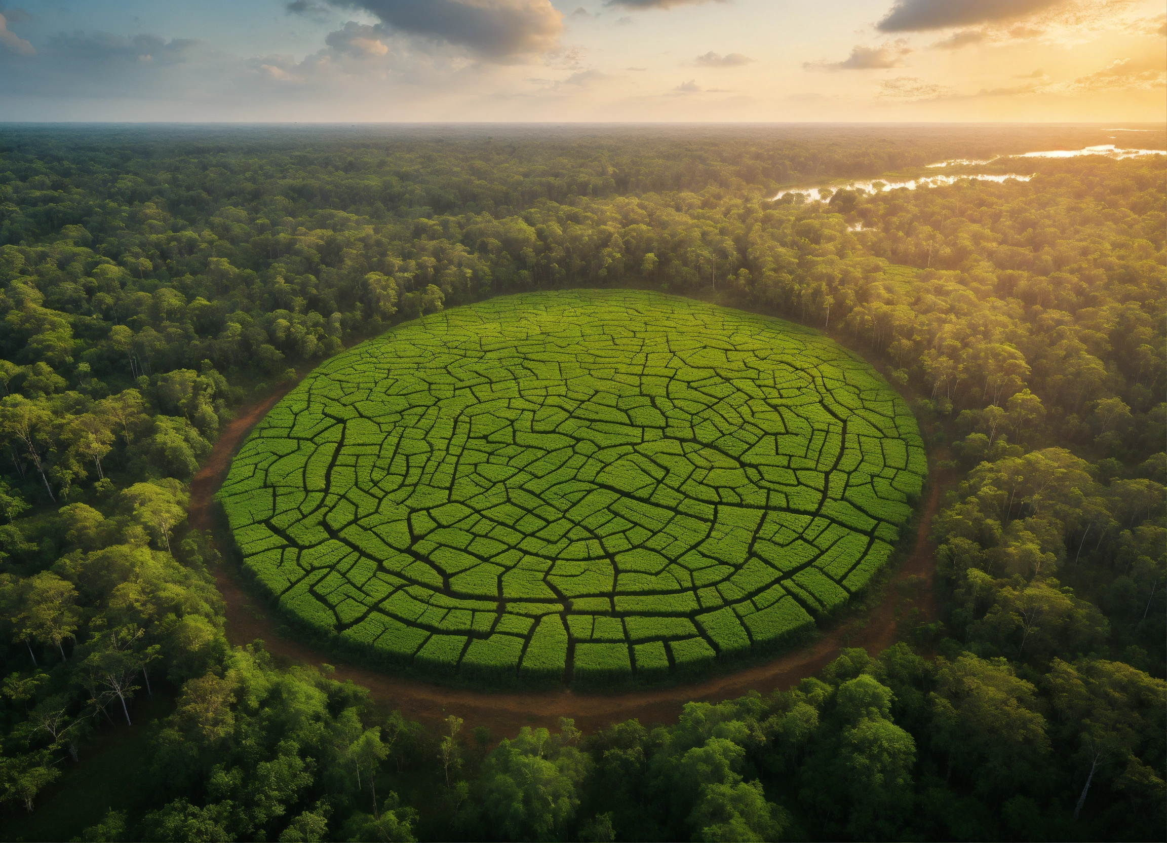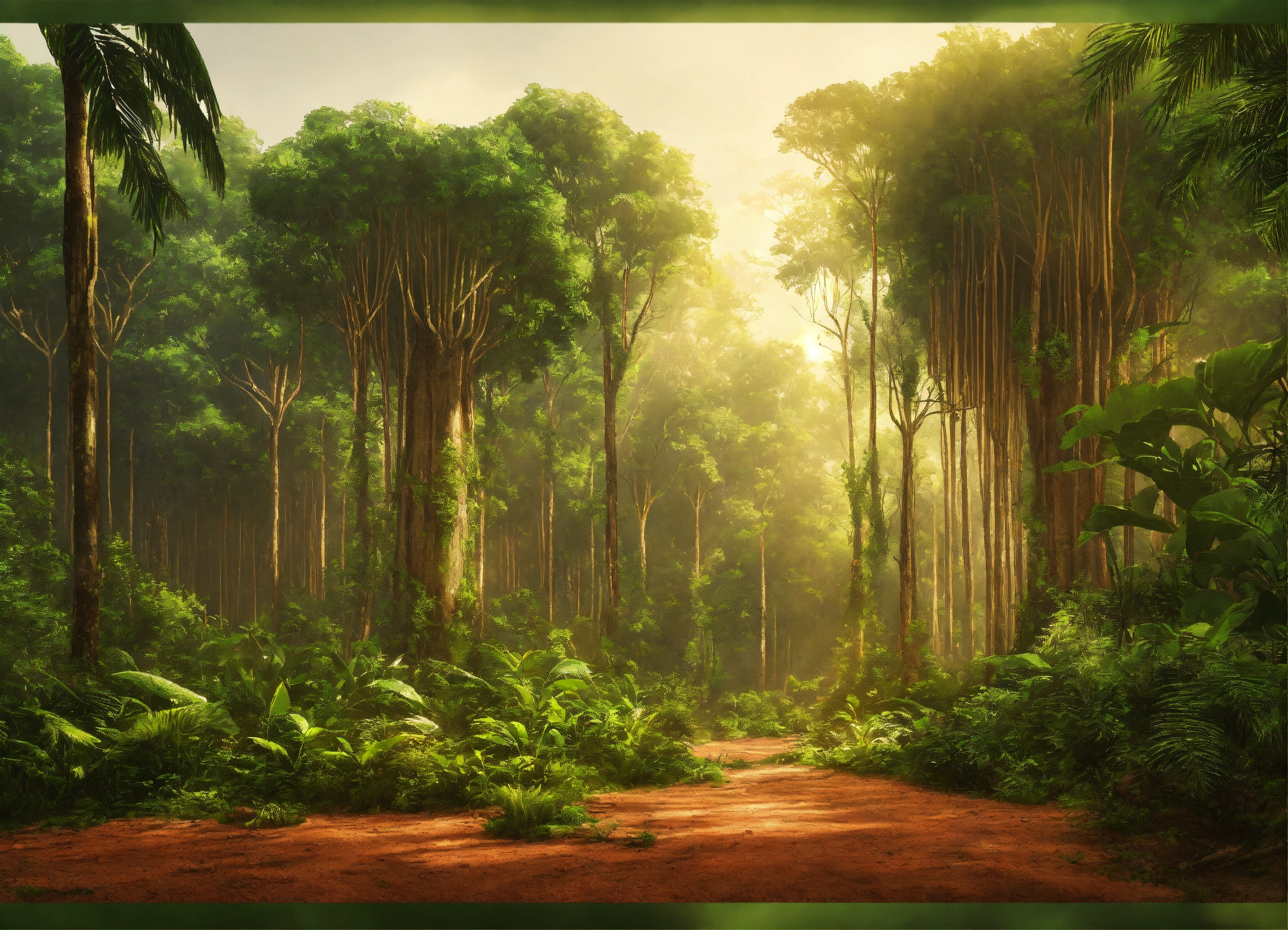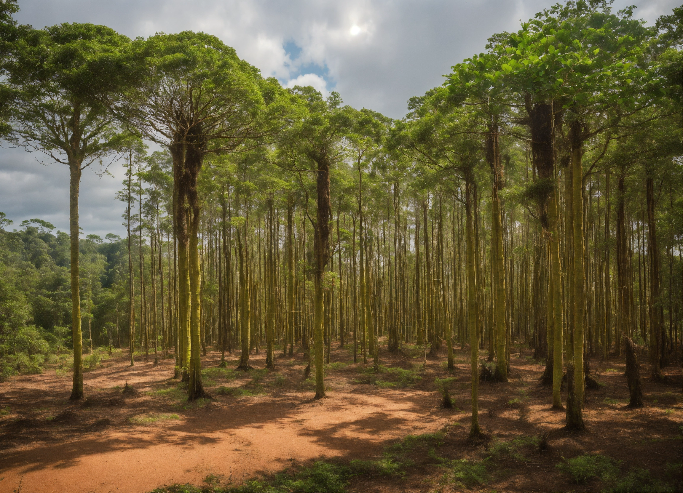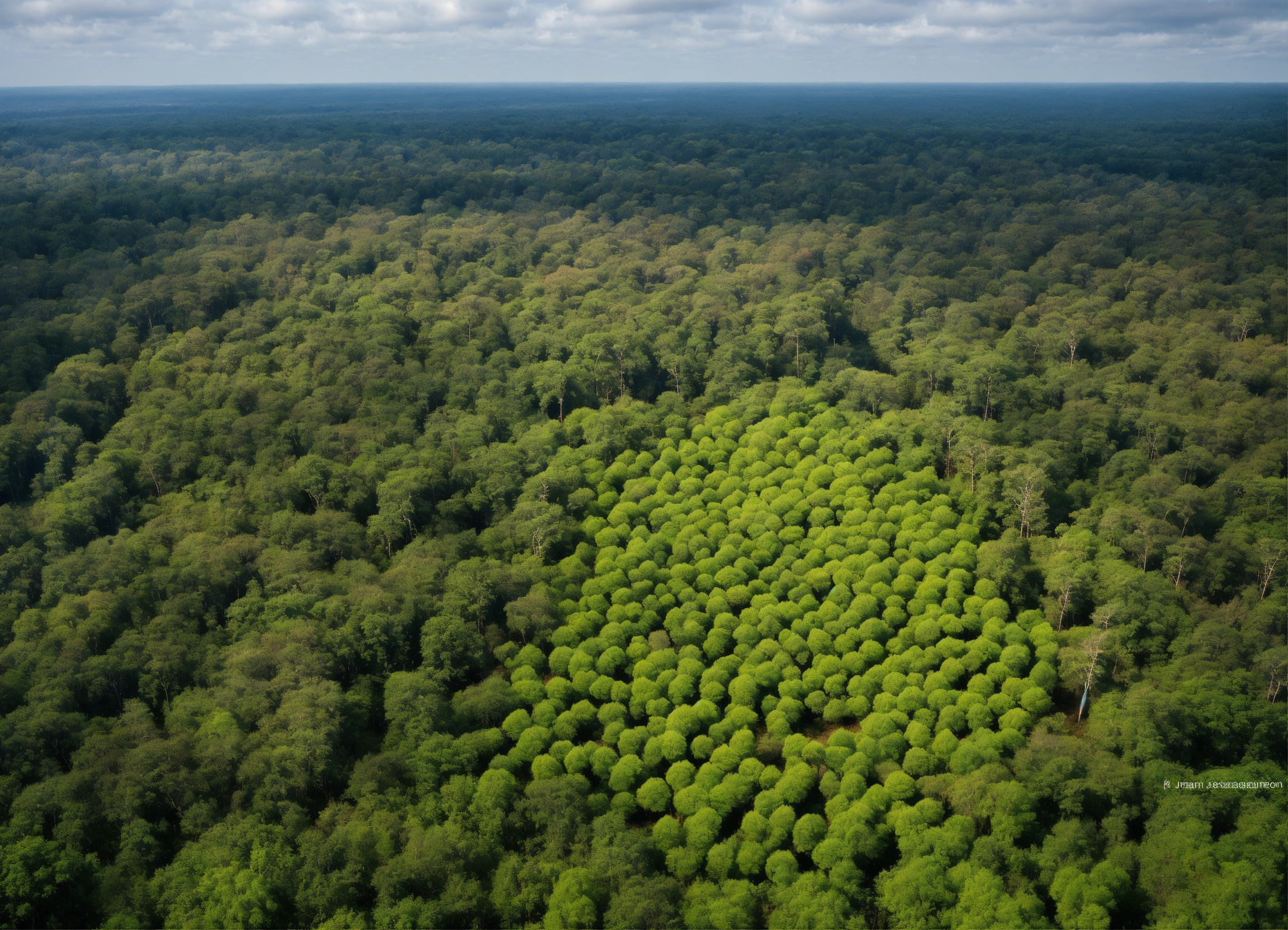 Déforestation, forêt amazonienne, la plupart des grands arbres coupés, jeunes arbres plantés par une association, style fantastique, pas réaliste