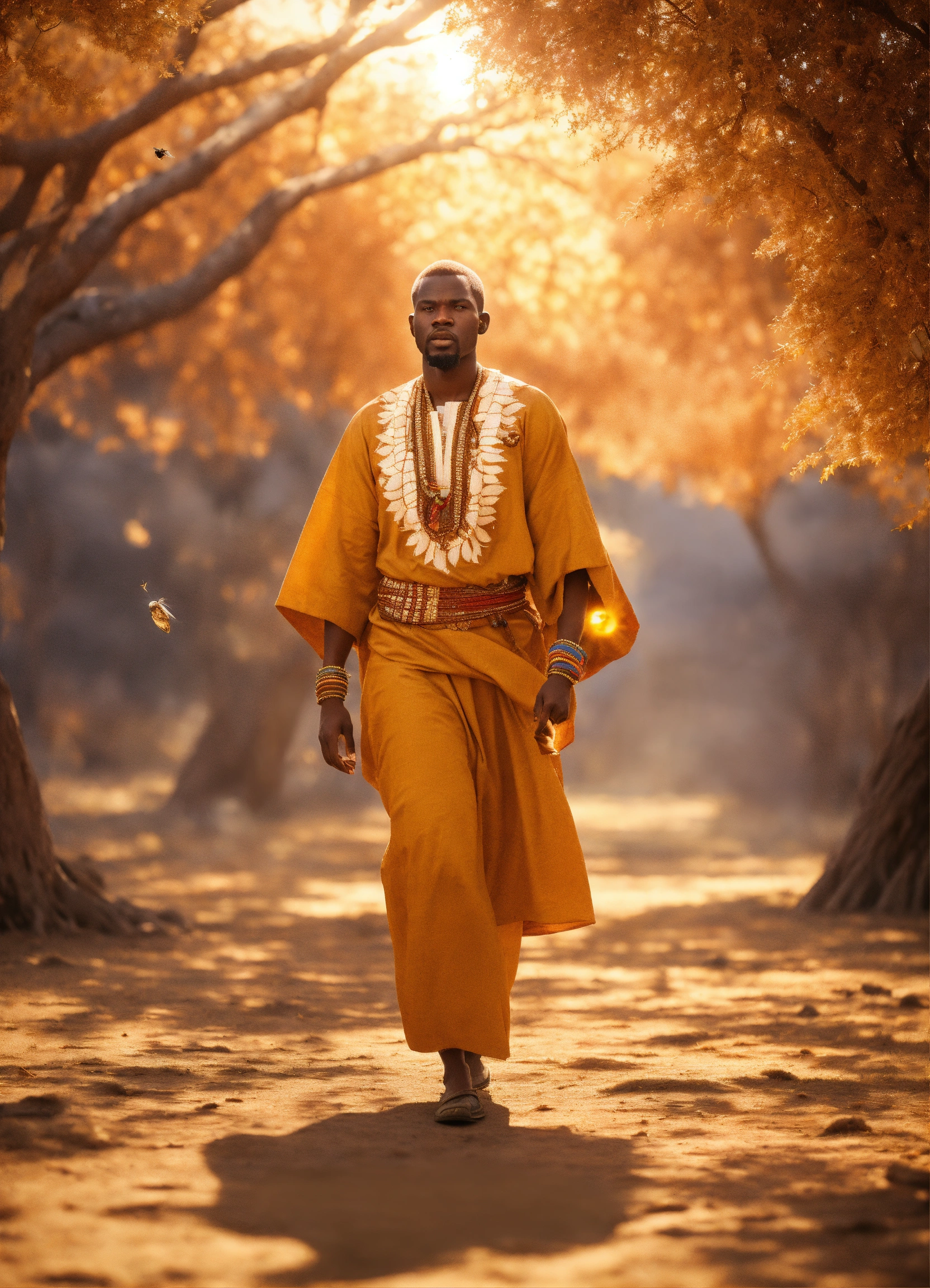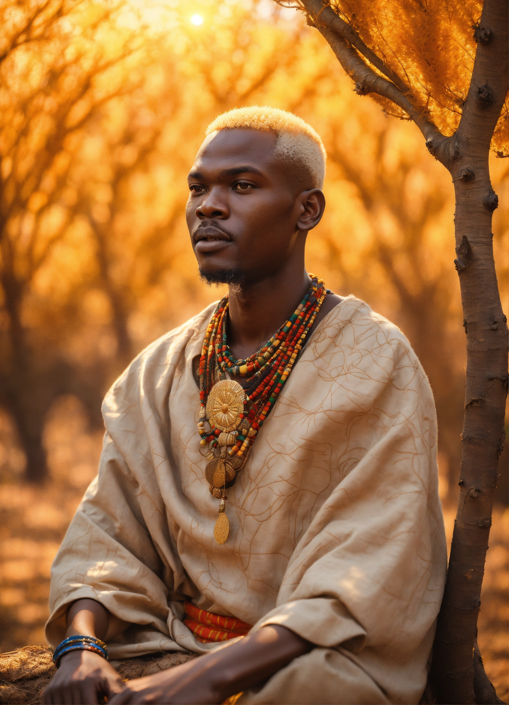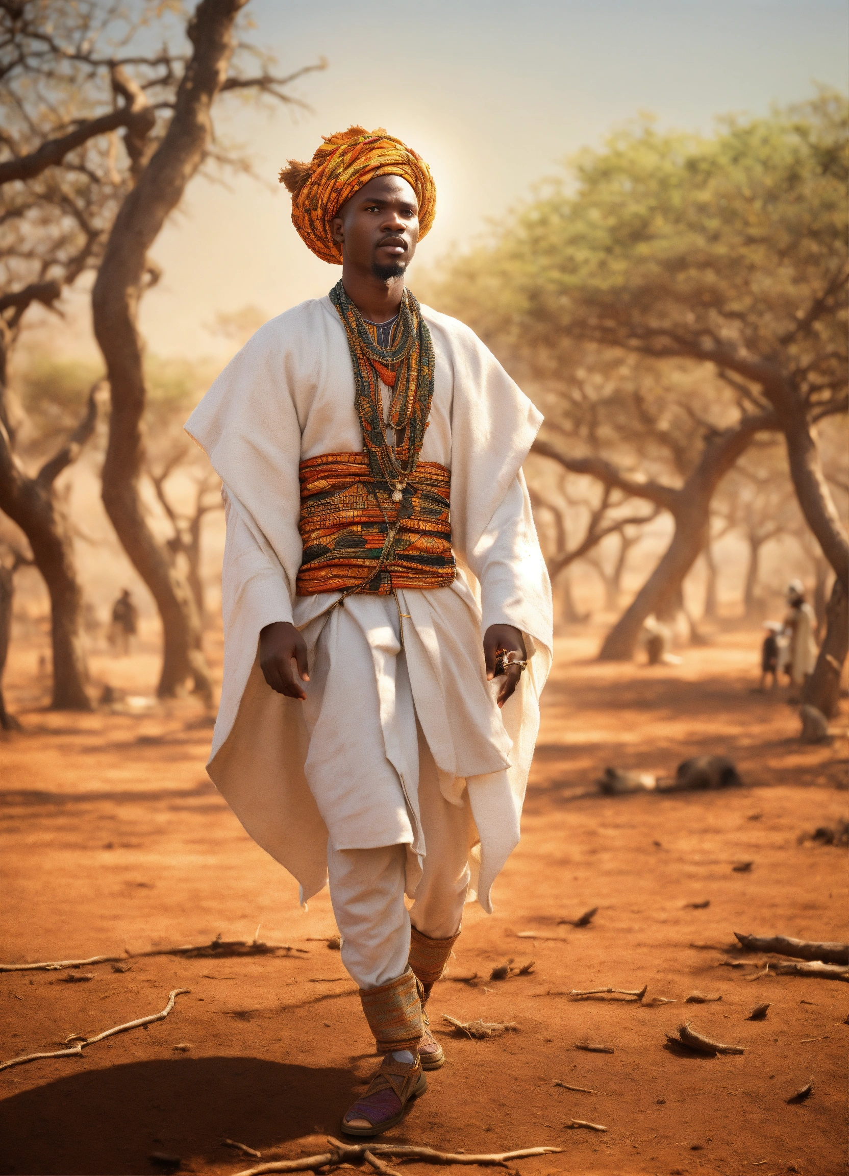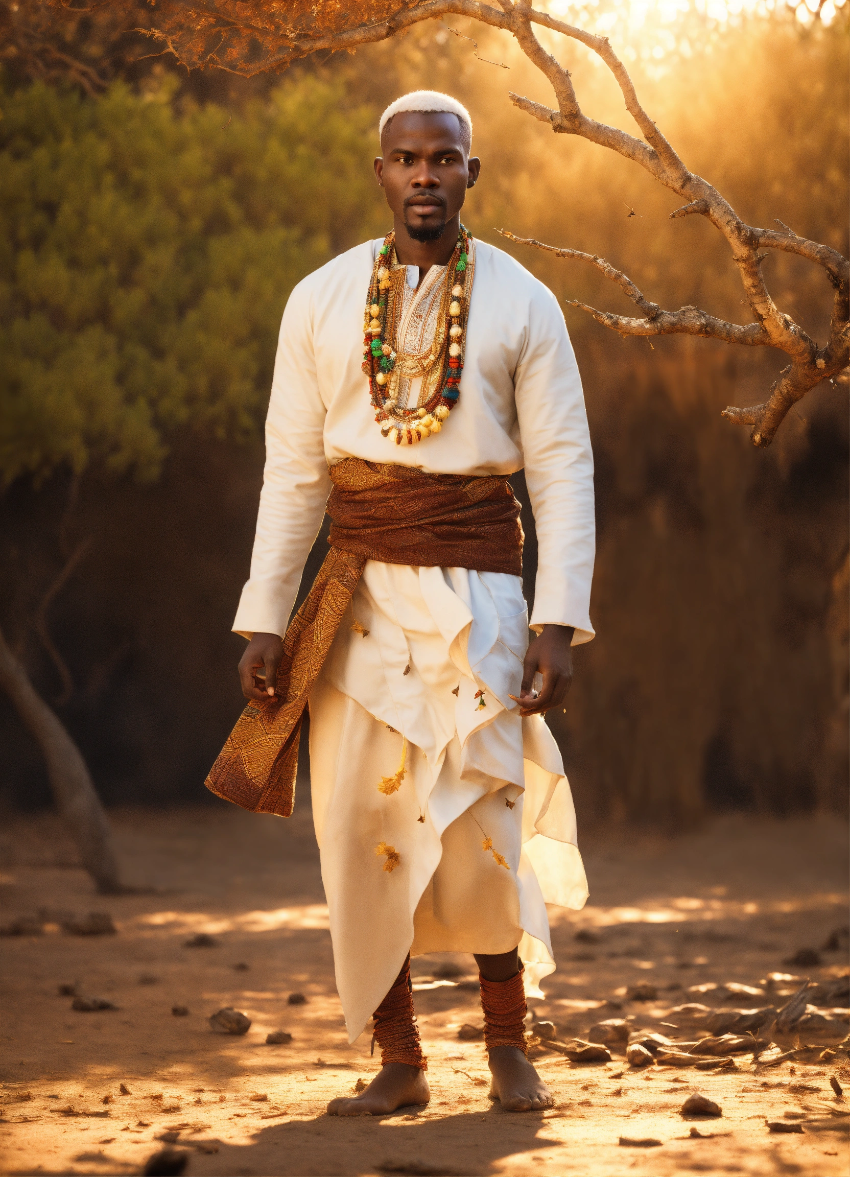Handsome african albino omolu man with ginger hair with african traditional clothes, on brown earth with dry leafless trees, with blowflies flying full length view with bright sun in background, greg rutkowski, ultra detailed, volumetric lighting
