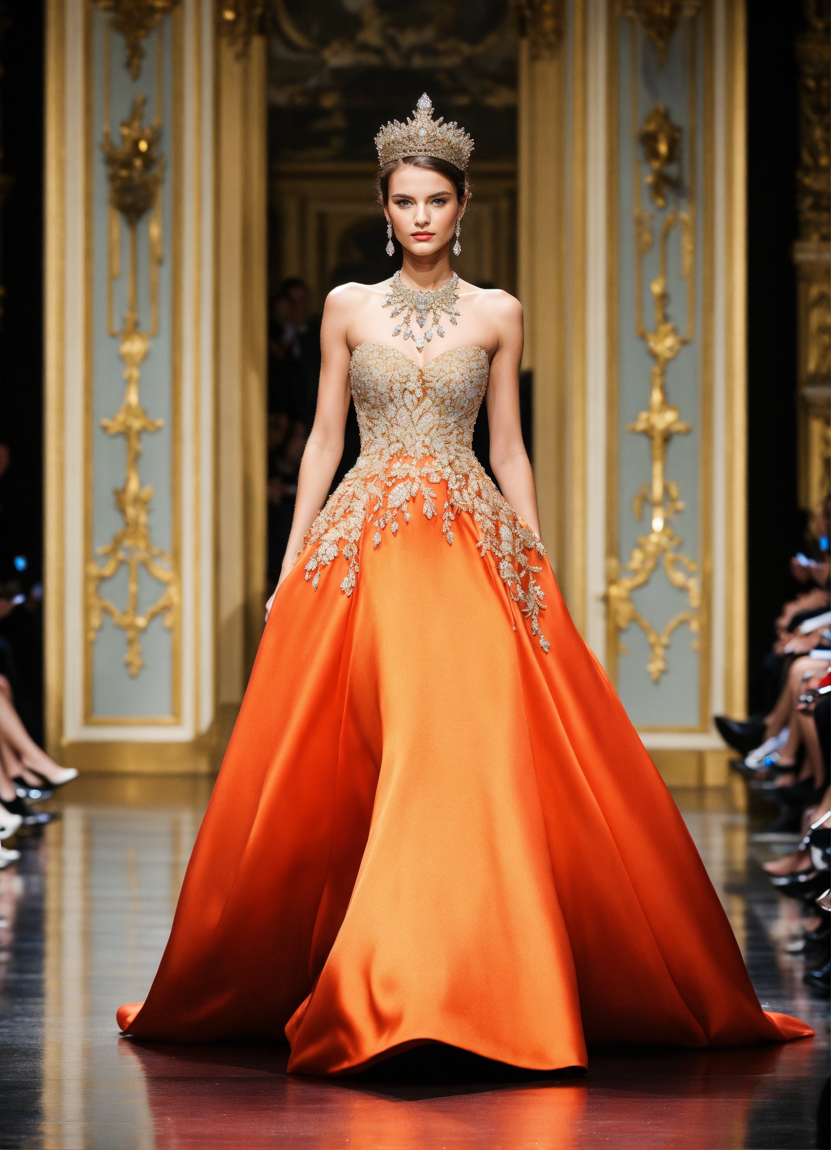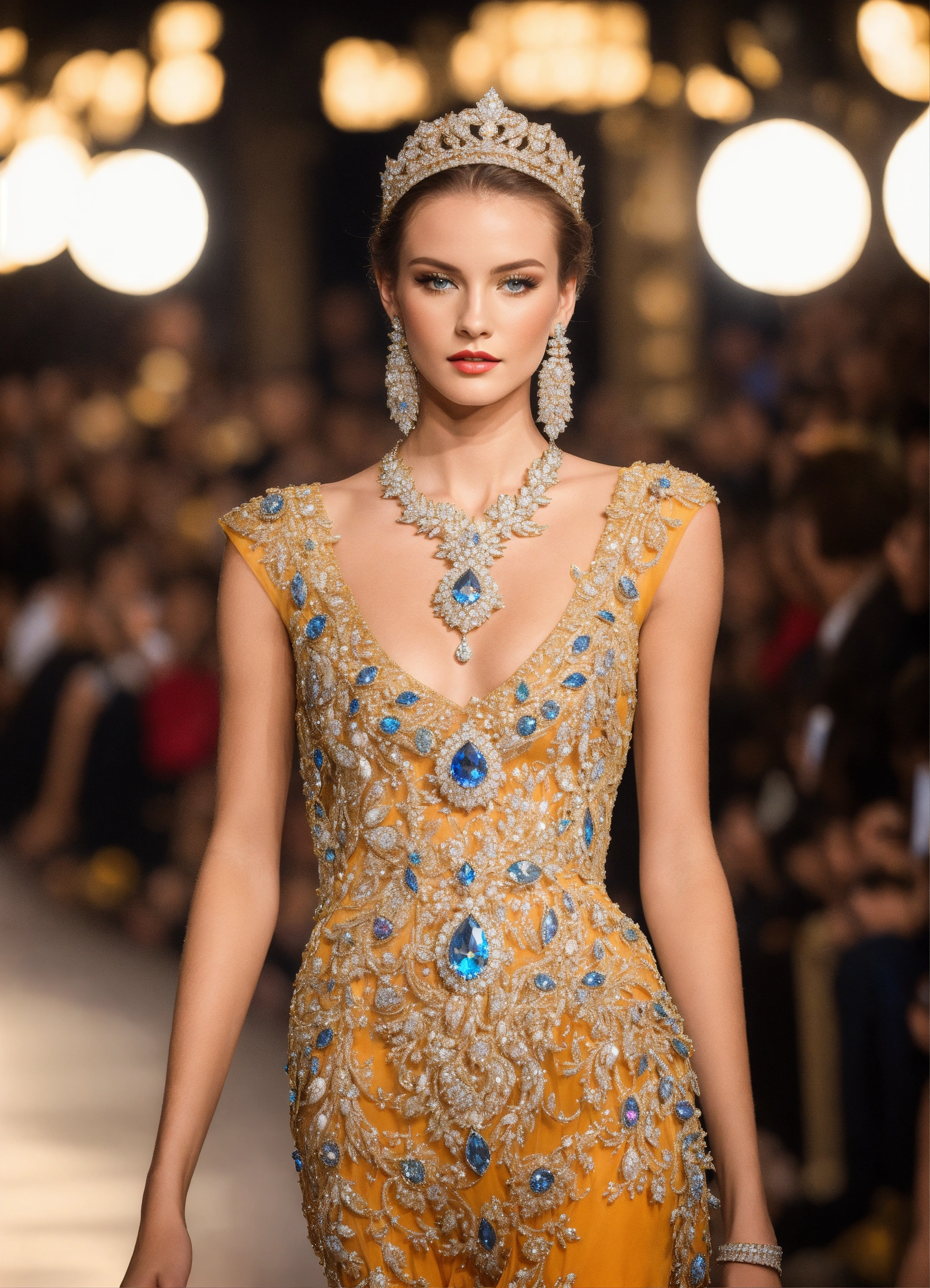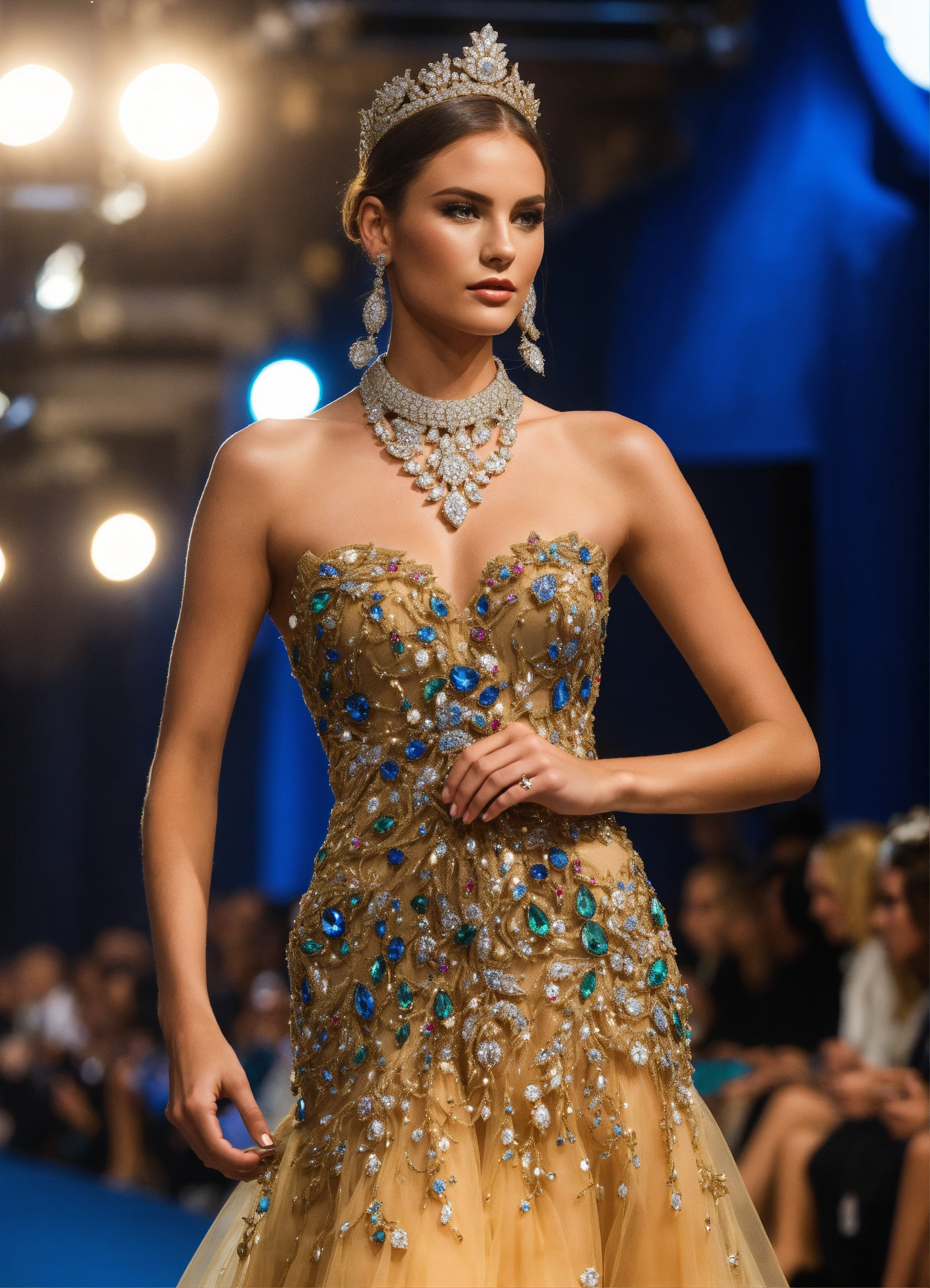 Female fashion model in royal gala dress with diamond and jewlery on the catwalk