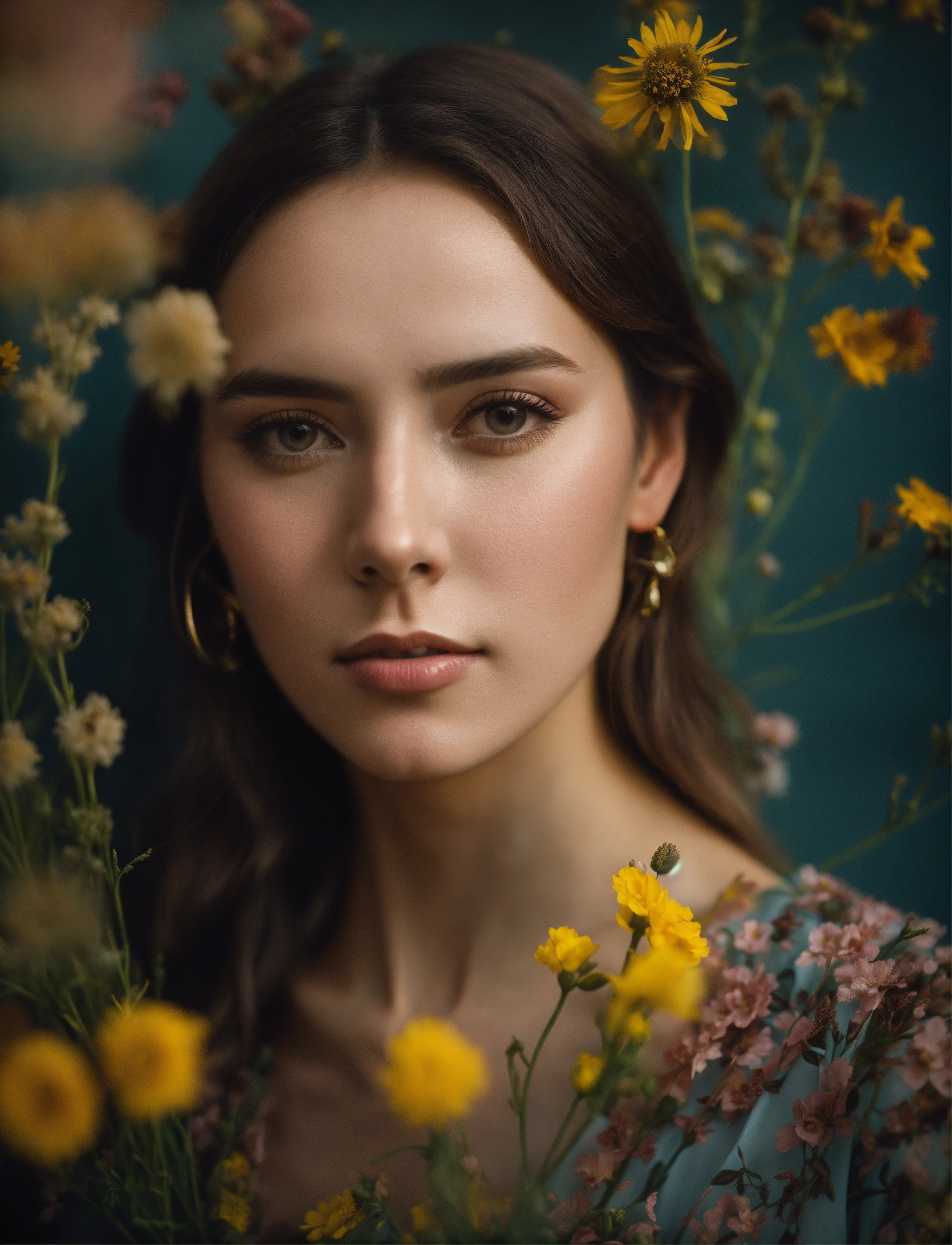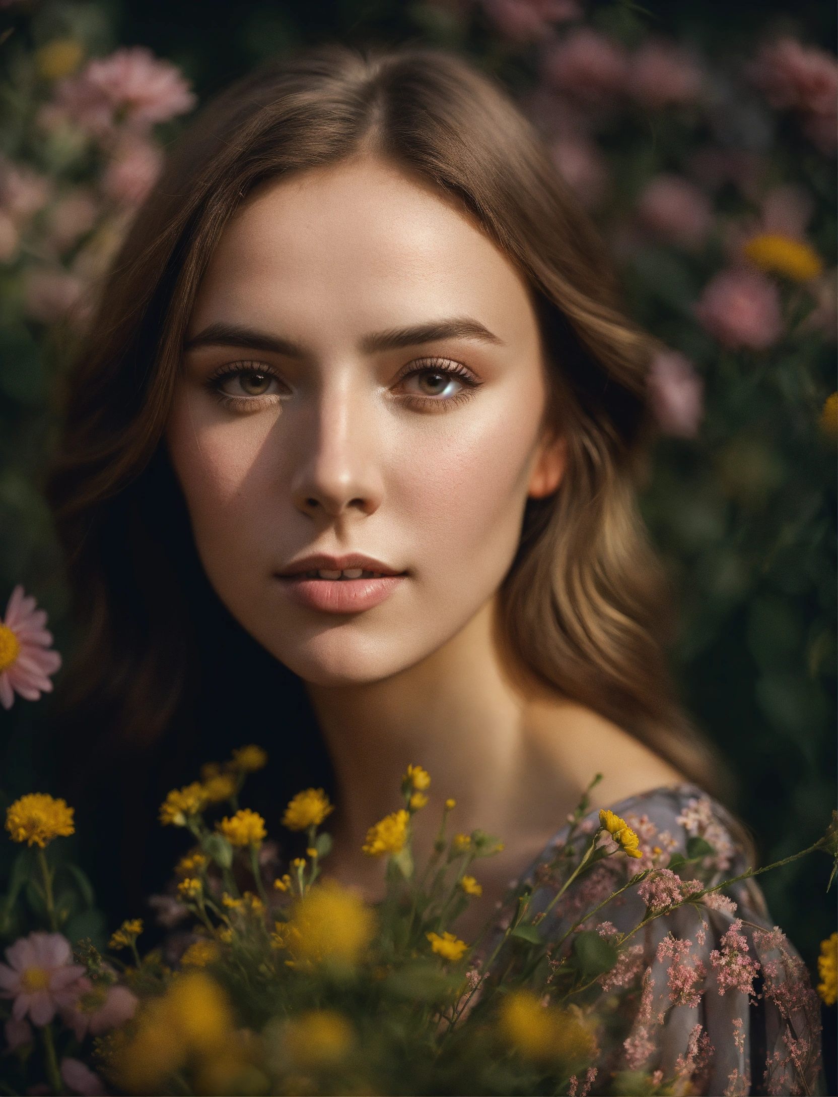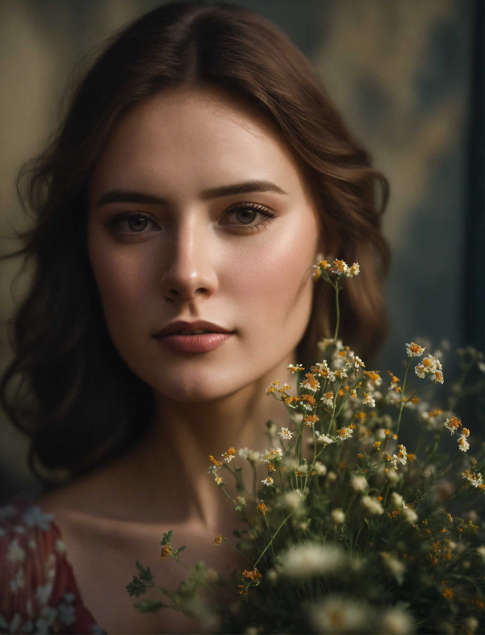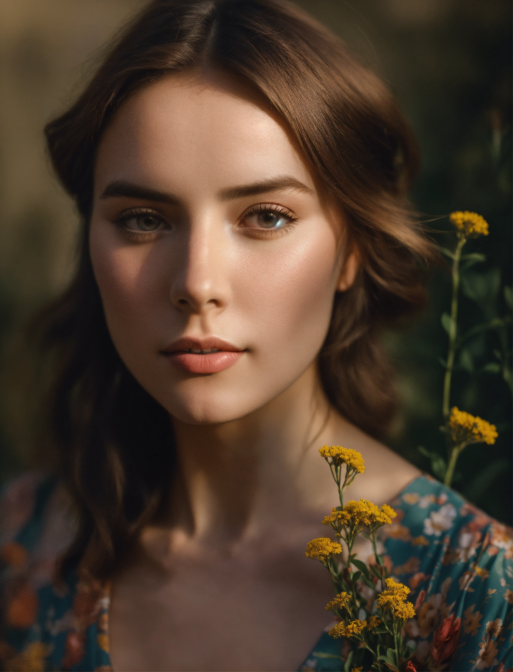 A beautiful award winning full length portrait of a dusky maiden wearing a chic floral dress, she is outdoors, holding a dainty bouquet of precisely arranged wild flowers, minimalistic composition, very dramatic lighting, in the style of wes anderson, hints of david lynch, rule of thirds, hasselblad x2d, portrait lens, magical mood