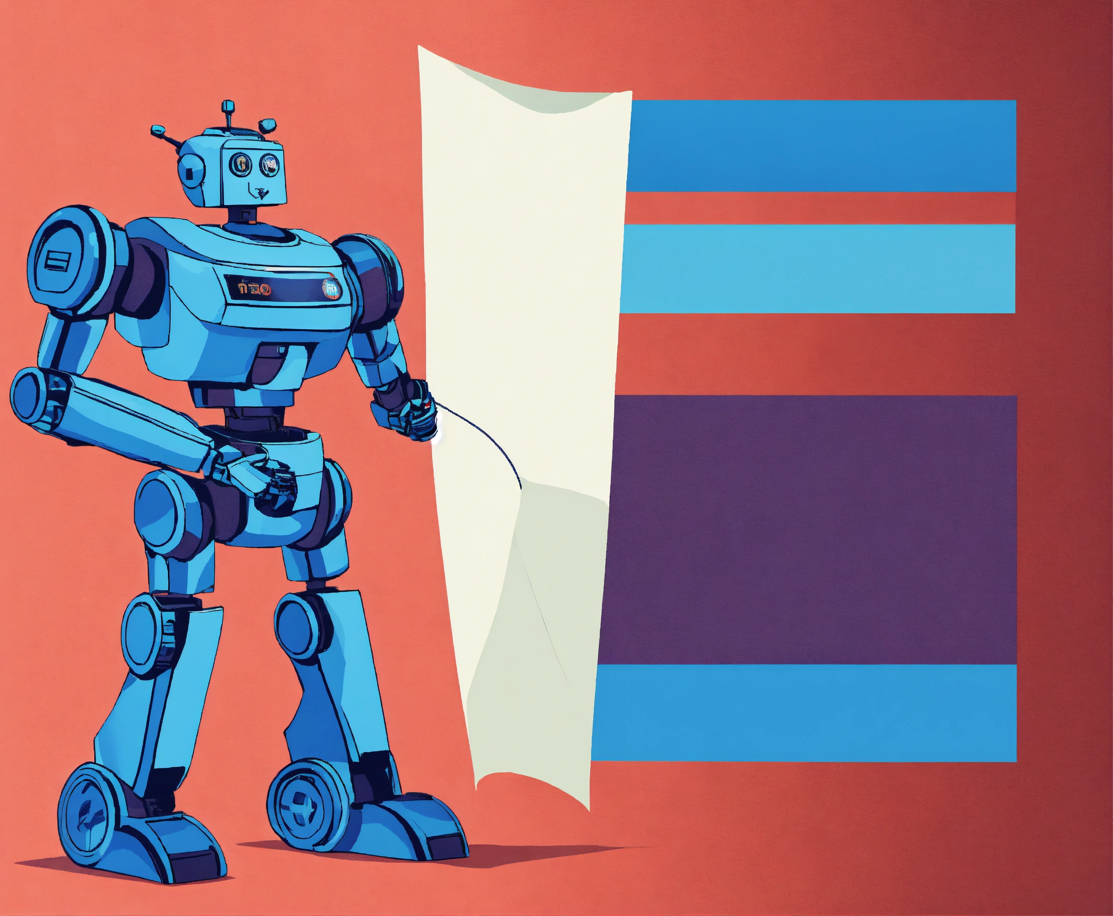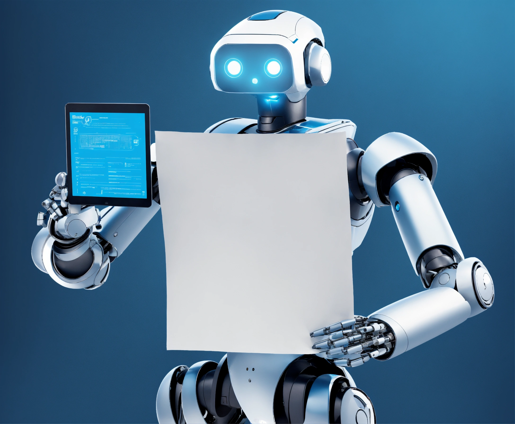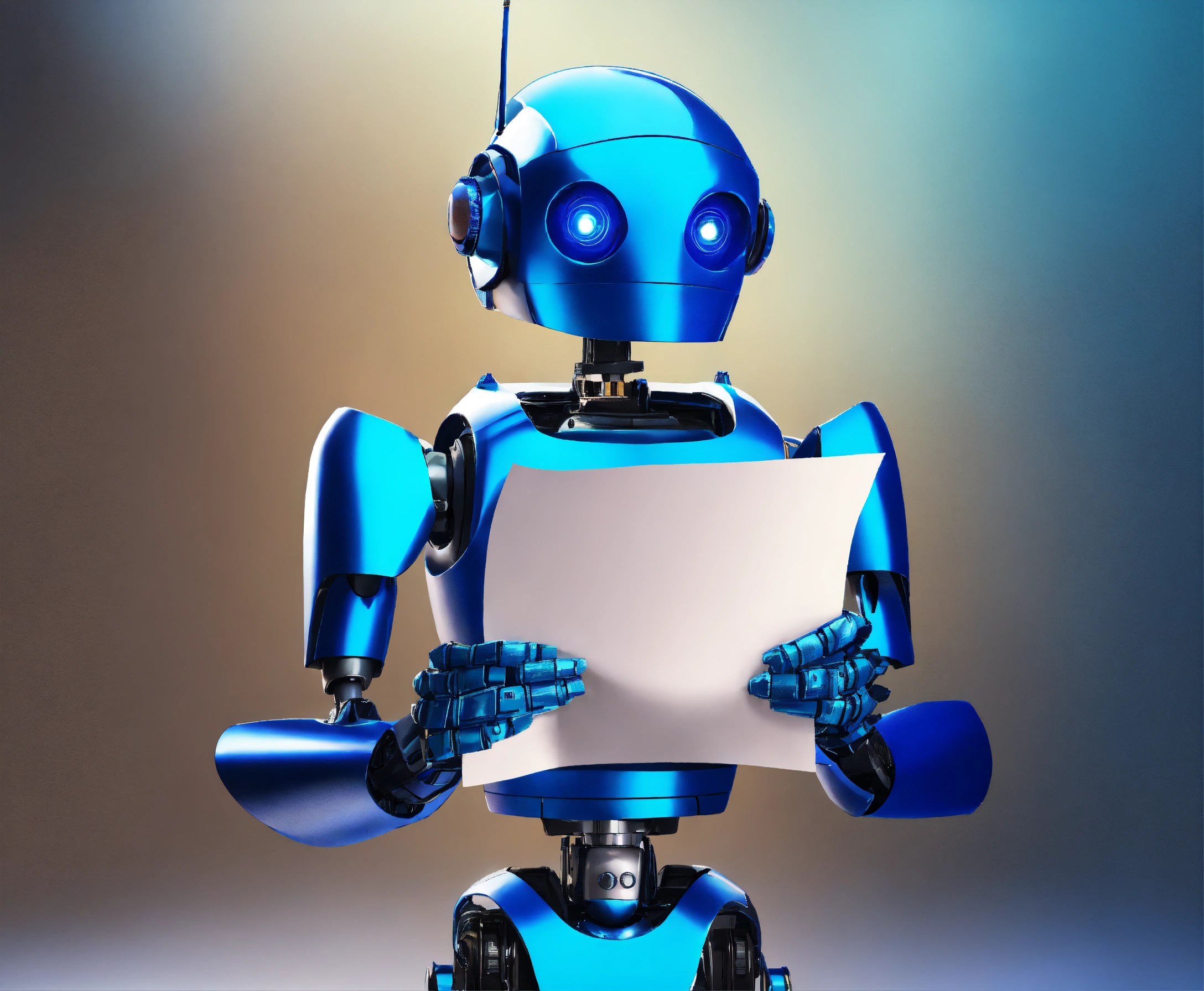 Metallic blue background with an ai robot holding a sheet of paper that says i agree