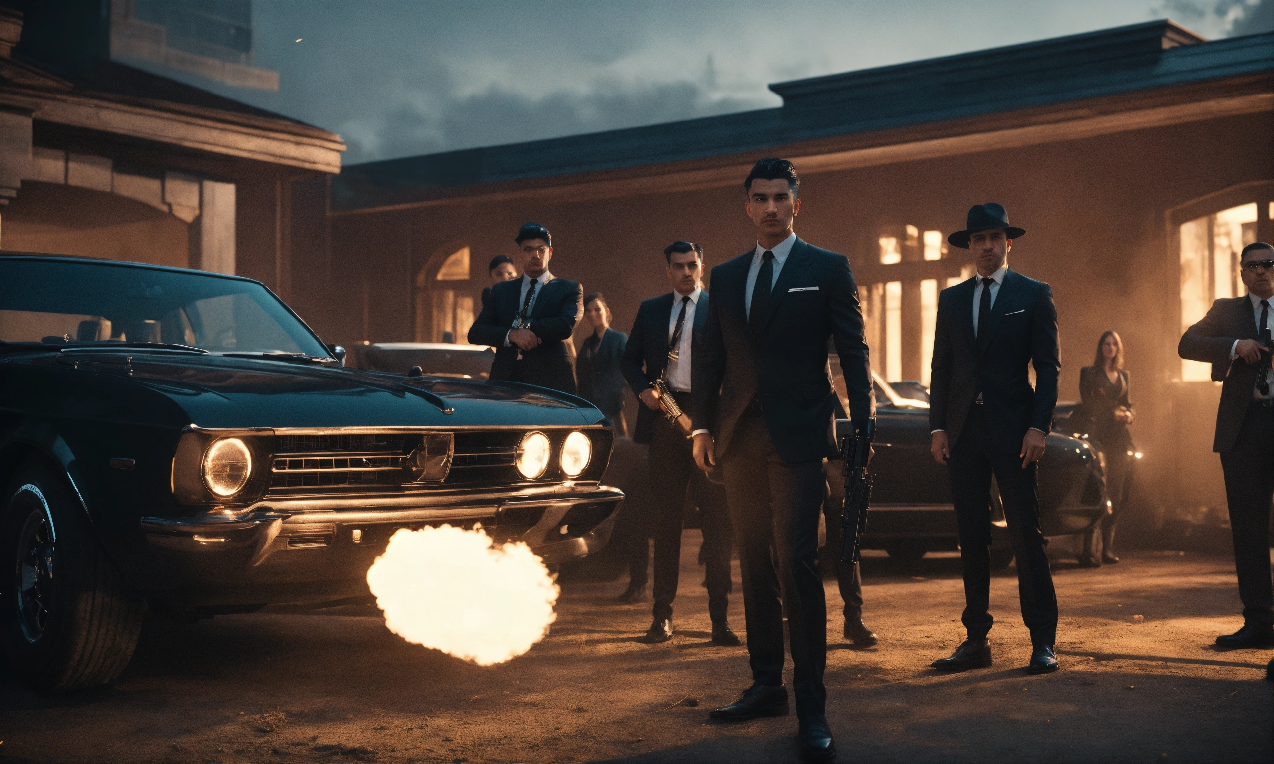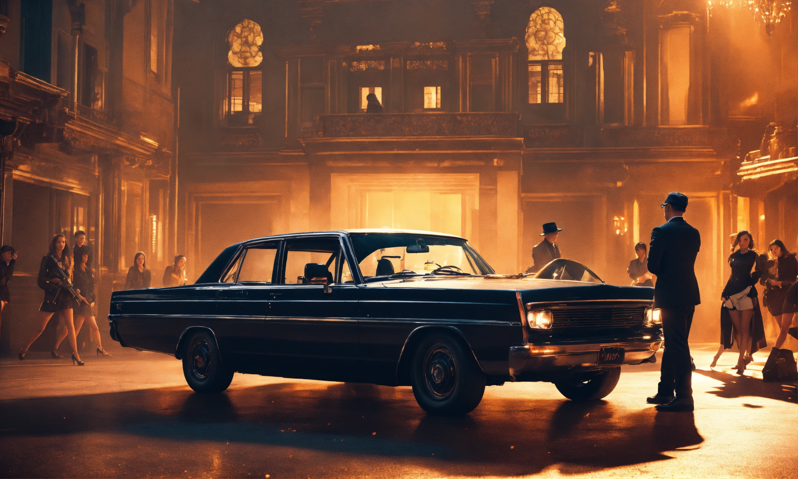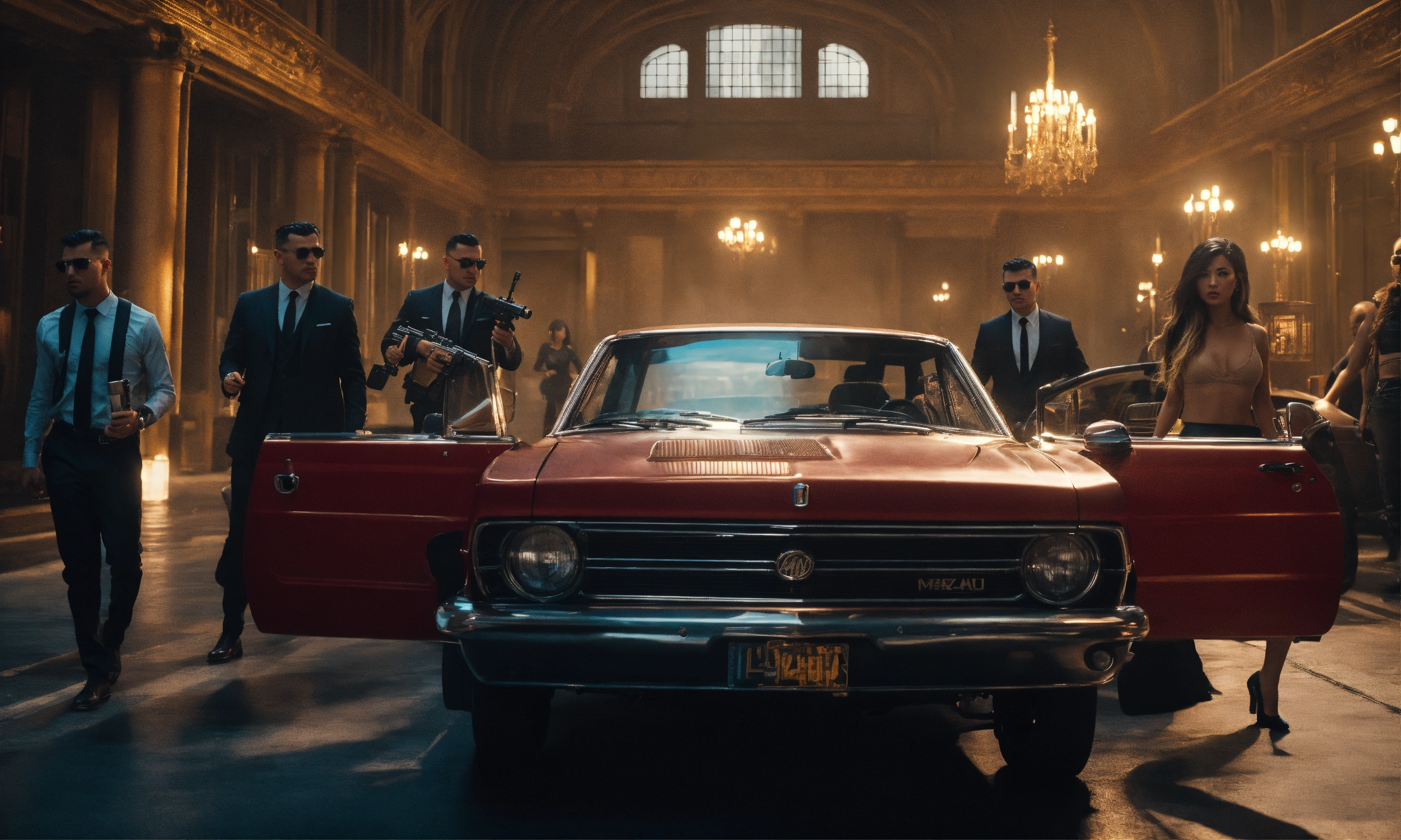 Group of mafia male with riffles surrounded by girls, interior set design day time, black car with machine gun coming out from sunroof, mood lighting, wide front shot, 8k, luxcorerender, earthly colour, cinematic photography, real humans, real images, matte finish, shot on arri anamorphic, extreme wide shot, smooth, sharp focus, ornate, highly dynamic, particulate, hyperreal, wide shot