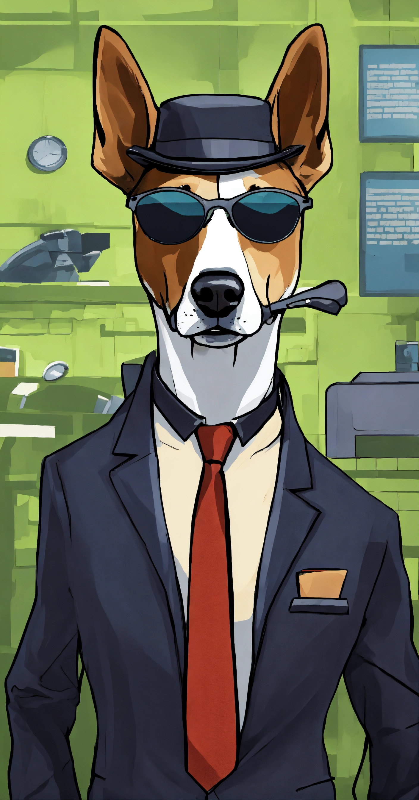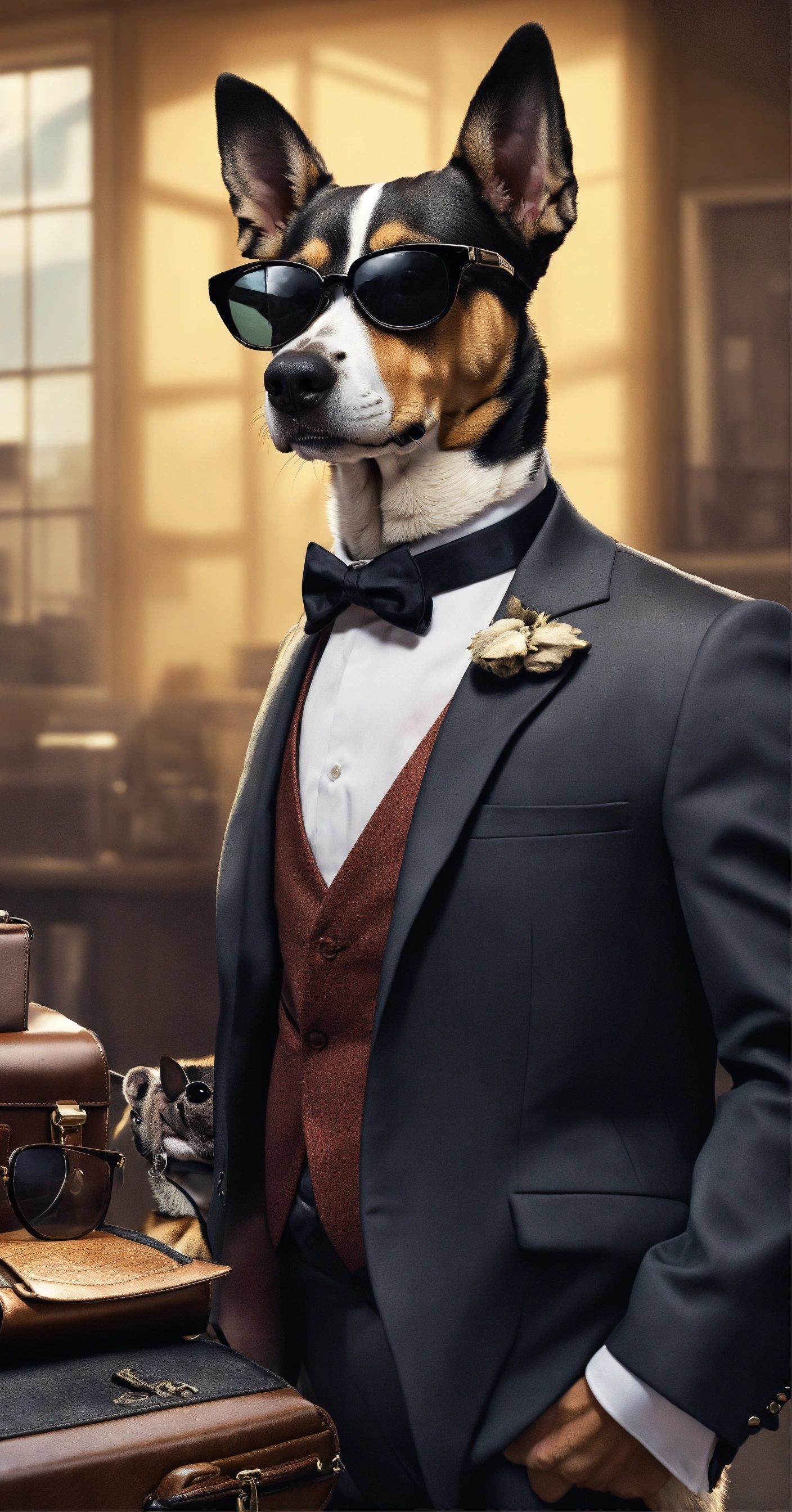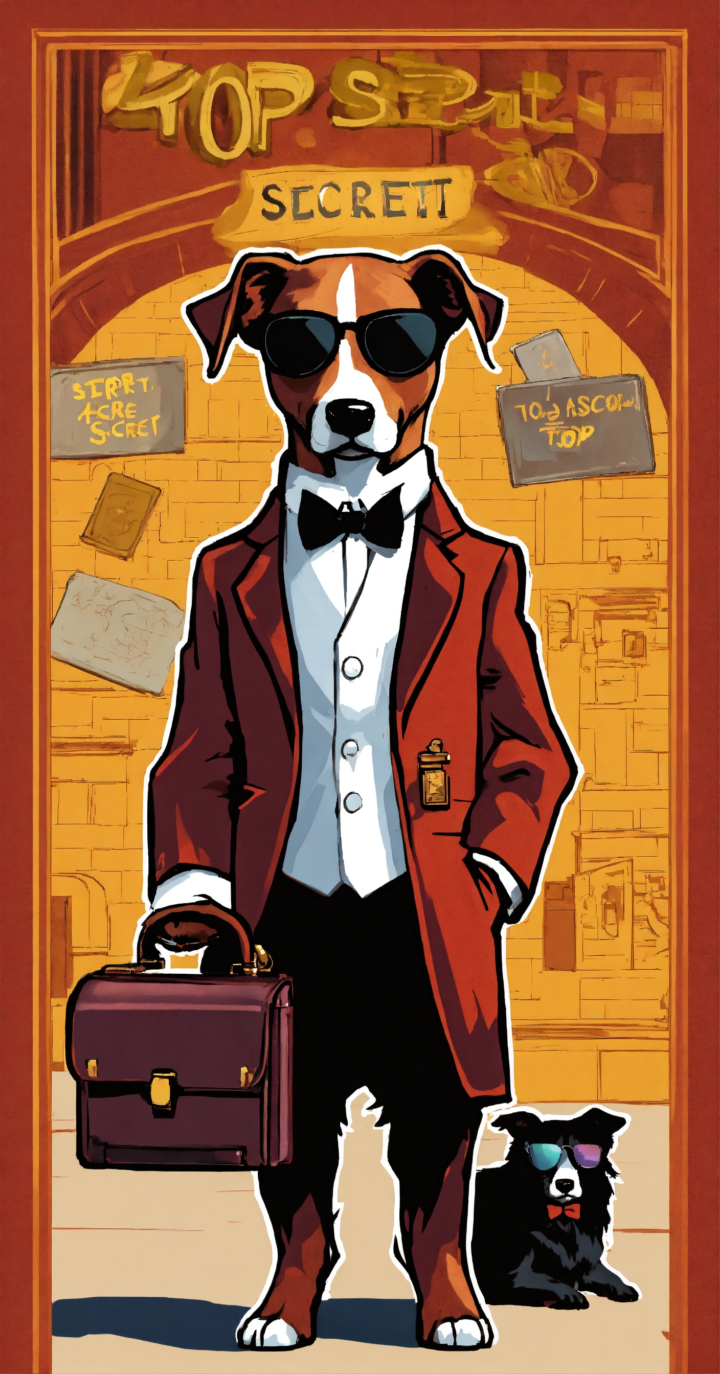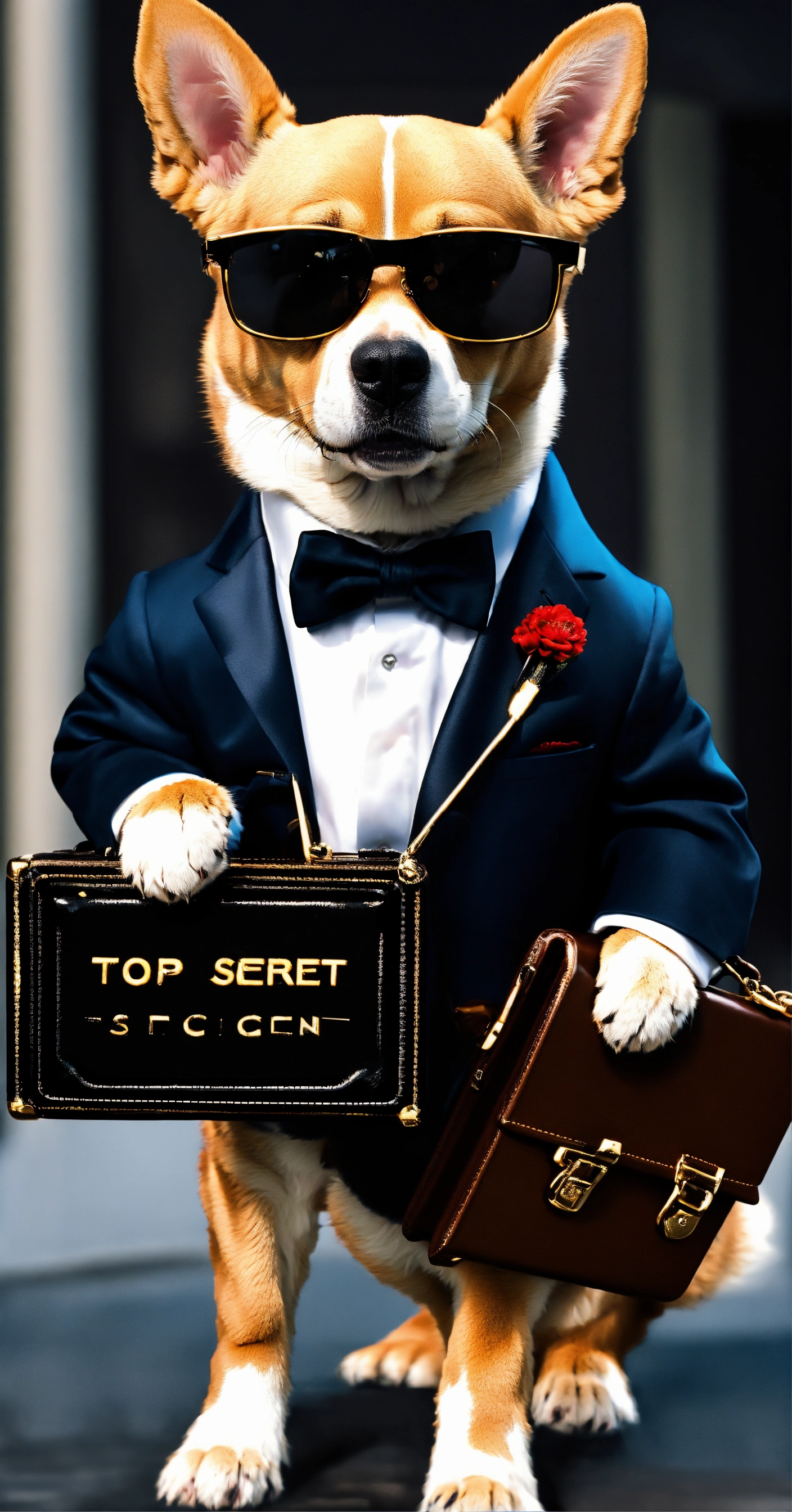 Generate an image of a dog a spy mission as a secret agent, wearing a tuxedo, sunglasses, and carrying a briefcase with 'top secret' written on it.