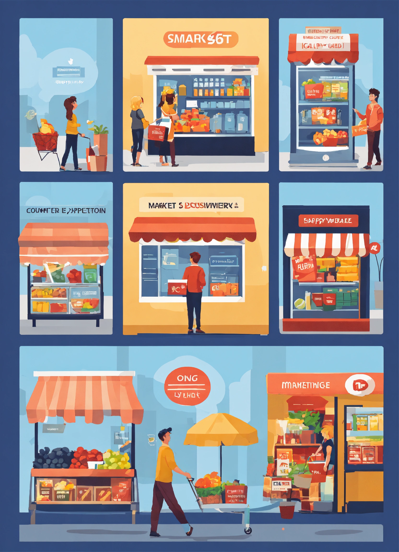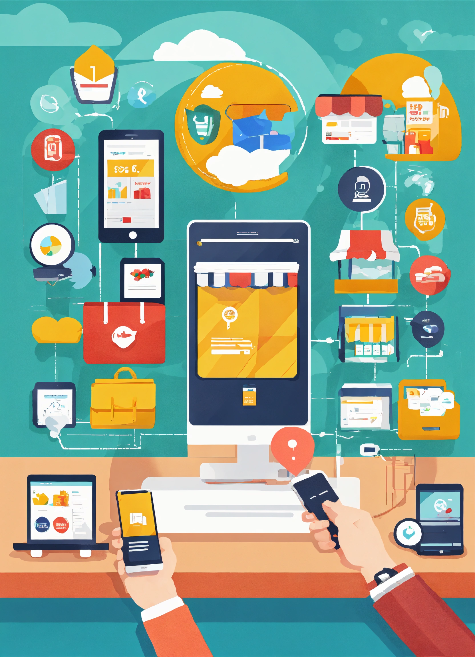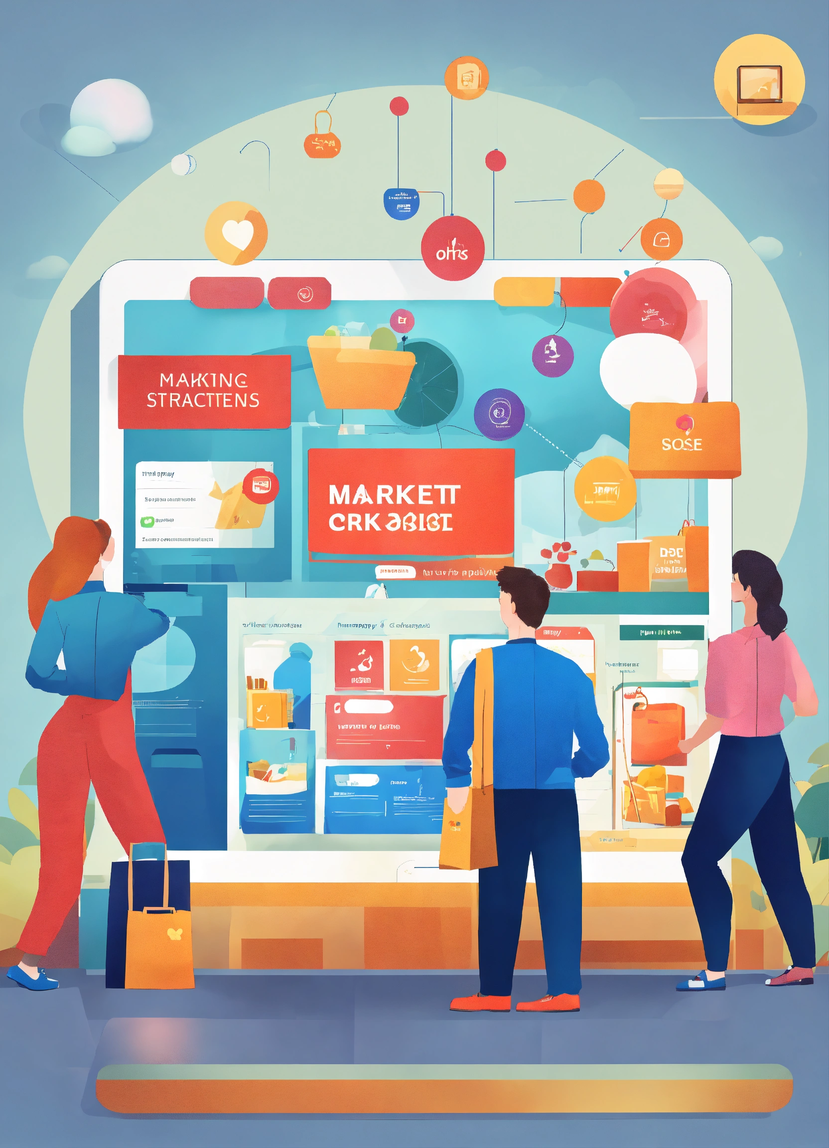 Design an image illustrating the concept of market-driven strategy. showcase happy consumers communicating with a business in various ways, such as making online purchases. emphasize the importance of meeting customer expectations.