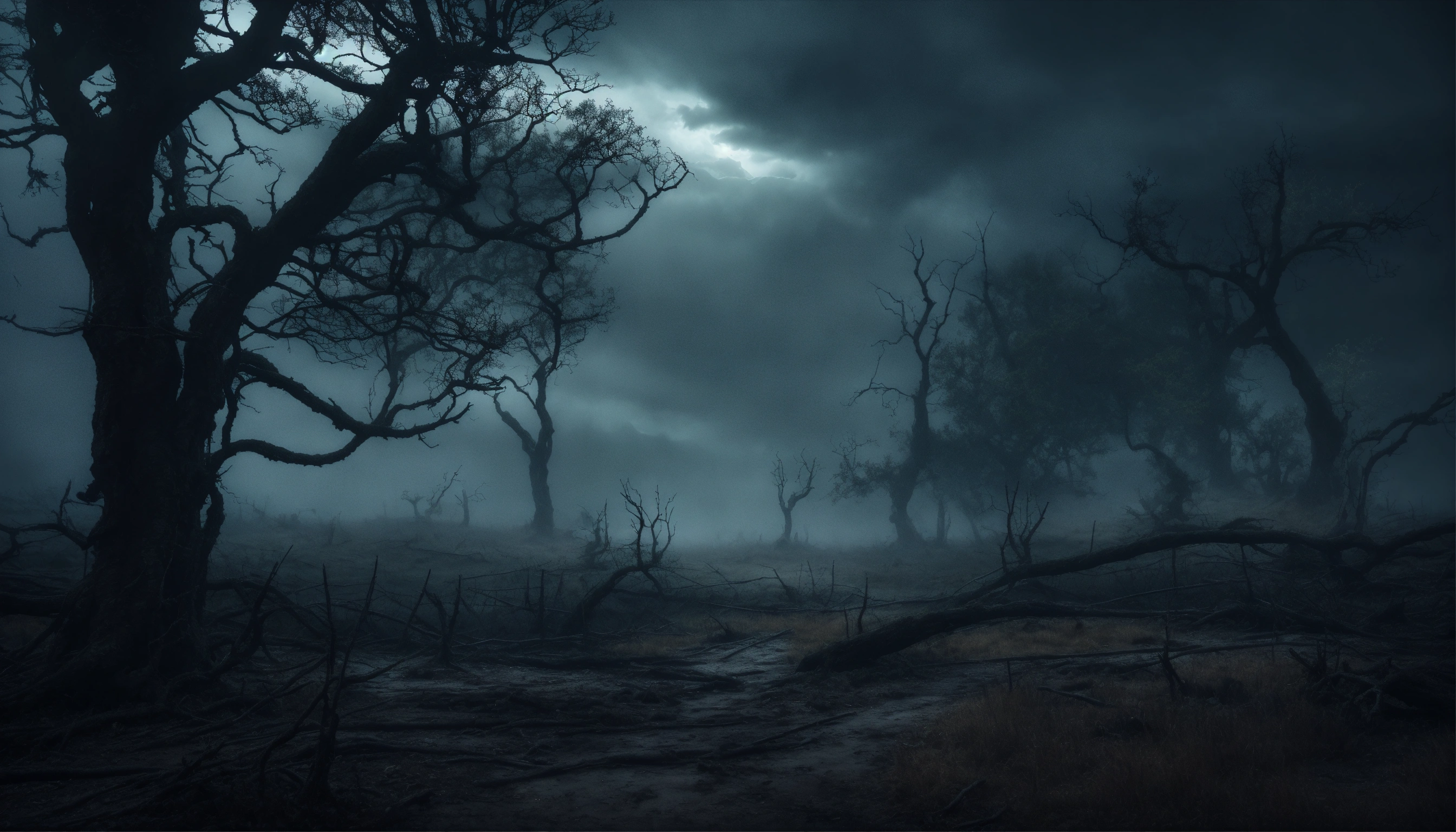 Night . dark night. digital image of a dark and eerie nature scene using v-ray. scene characteristics a foreboding and unsettling atmosphere, with twisted and gnarled plants, ominous clouds or fog, gloomy. setting characteristics a desolate and abandoned landscape. creation details high-quality camera, enhance the dark and eerie atmosphere, materials and textures based on real references of dark and twisted nature scenes. references artists and designers specializing in creating digital art of dark and eerie nature scenes, such as grzegorz wronkowski, social media platforms like instagram and pinterest for inspiration and reference images. --style 4b --chaos 0 --q 2 --stylize 1000 --v 4 --style 4b --chaos 0 --q 2 --stylize 1000