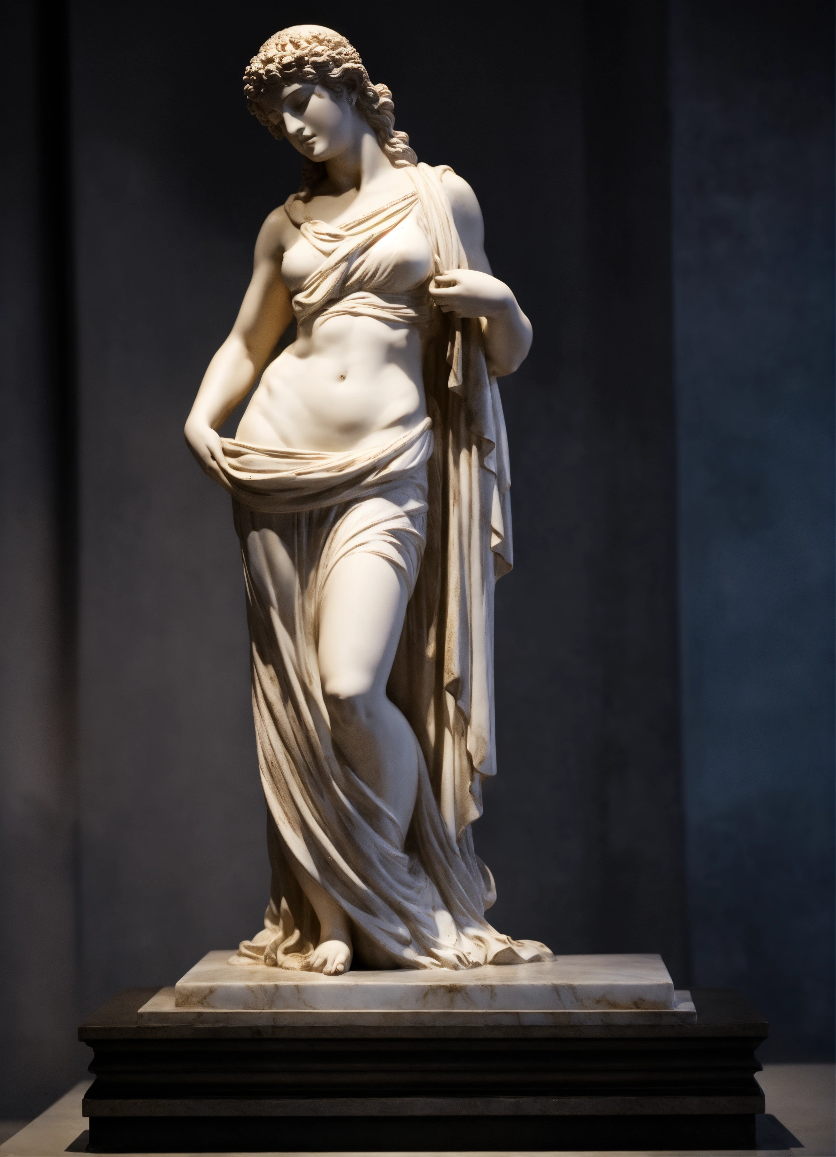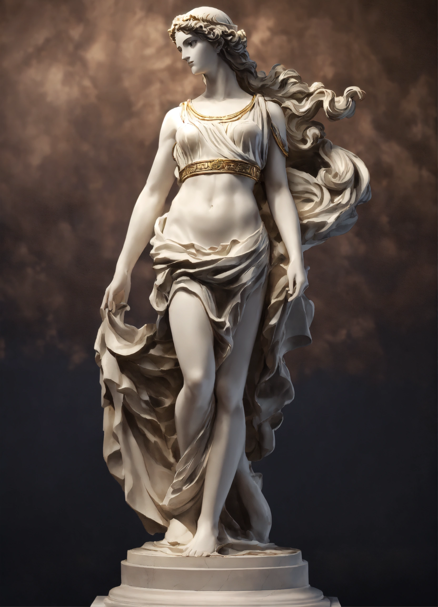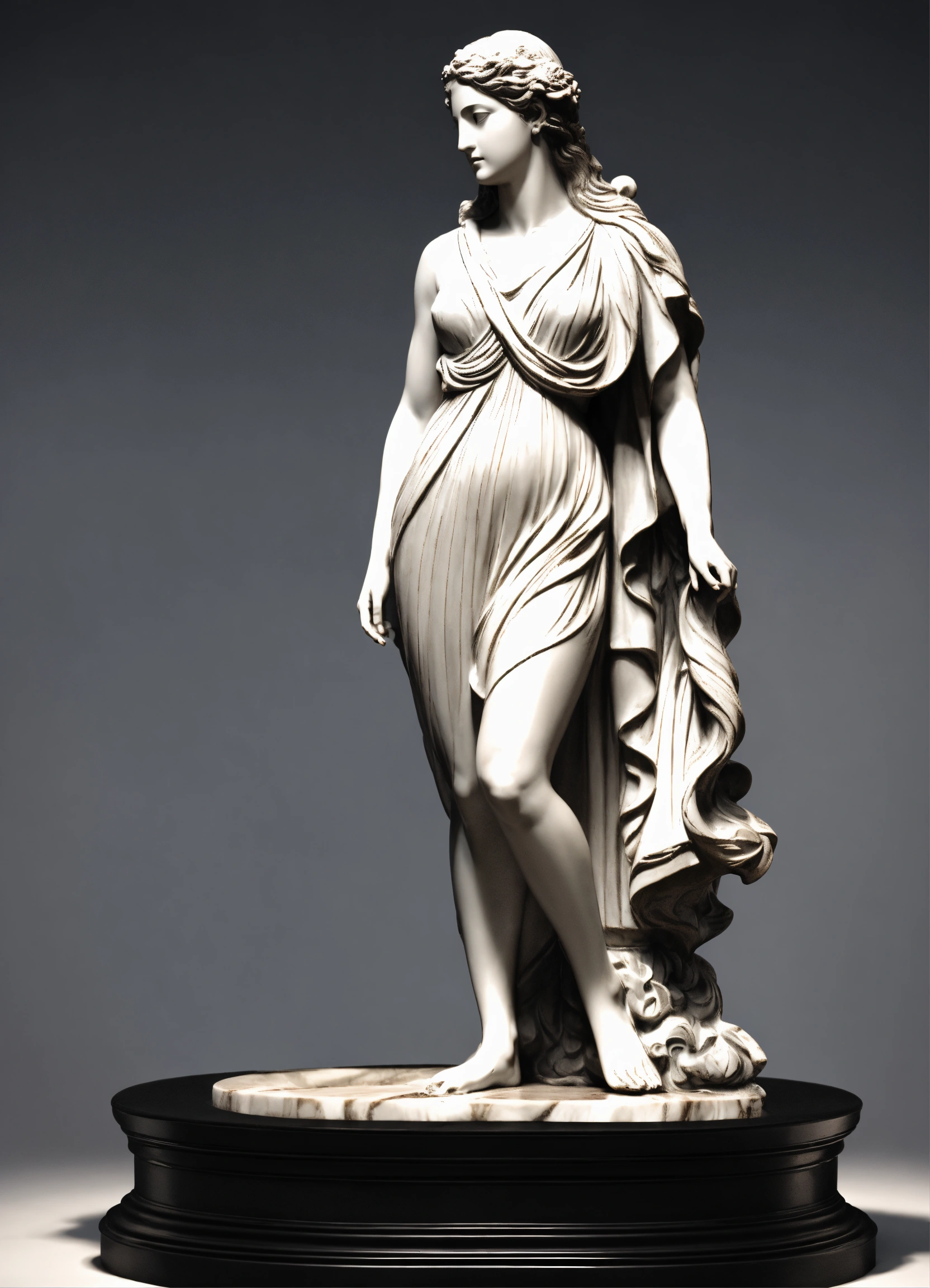 A statue from a greek goddess statue with a wavey middel parting hair out of white marbel with a black backround standing on a podest animeted style 8k