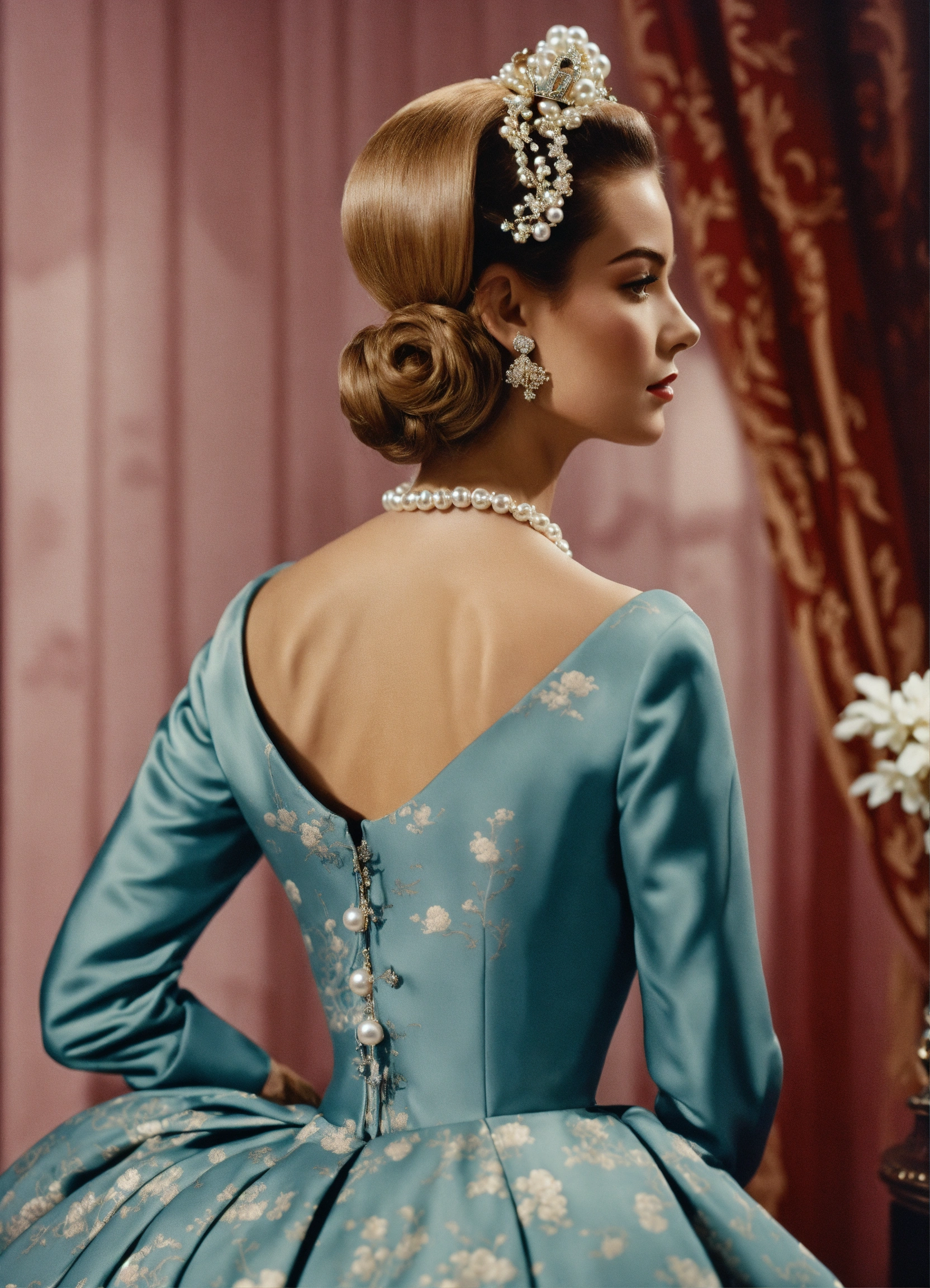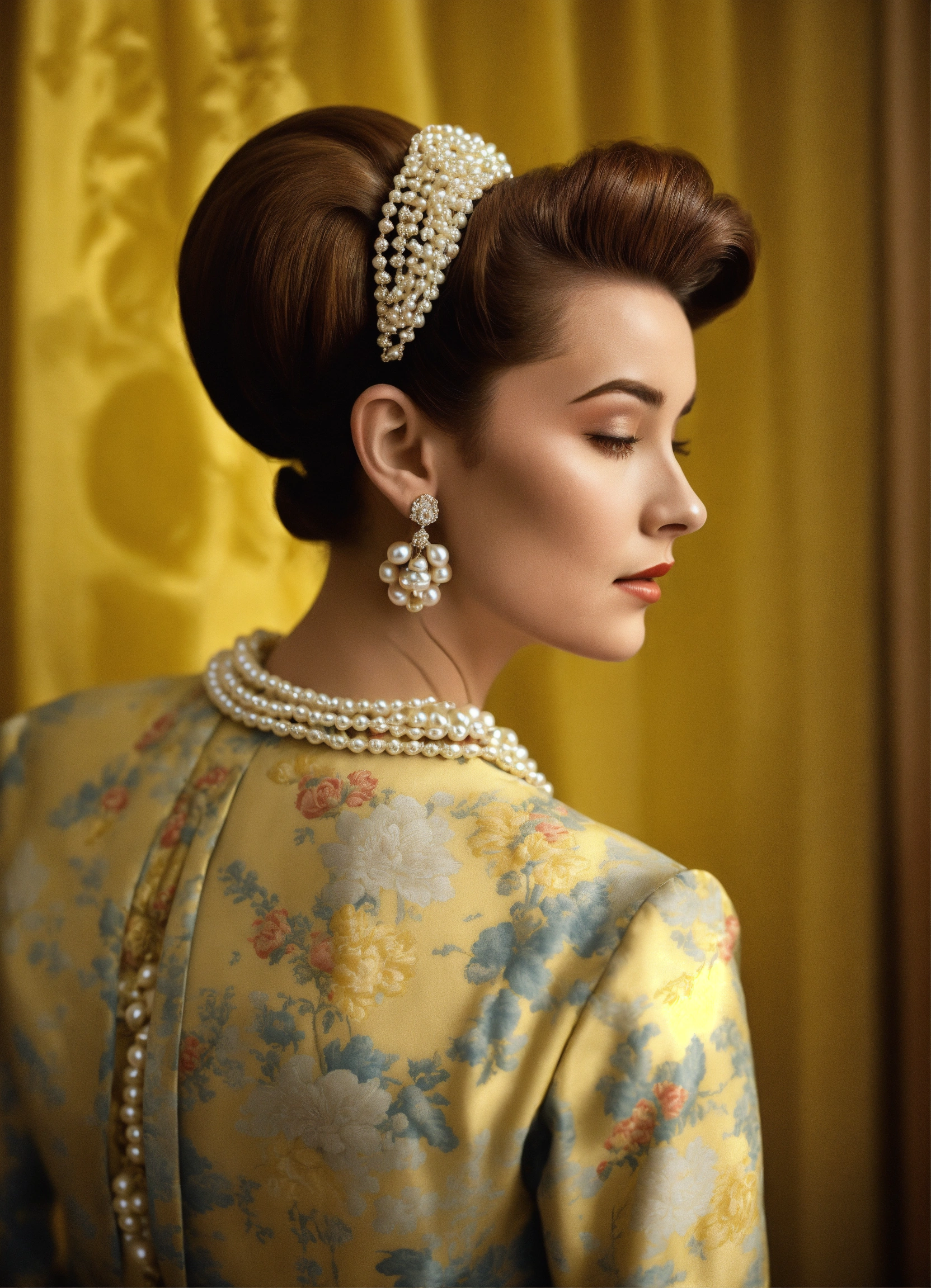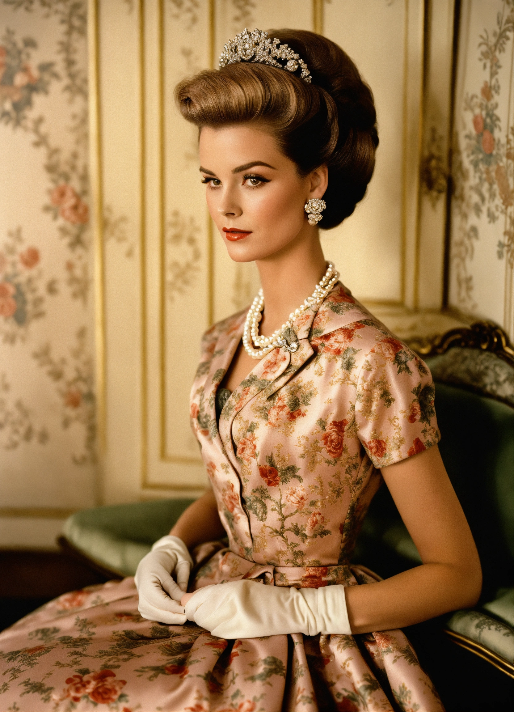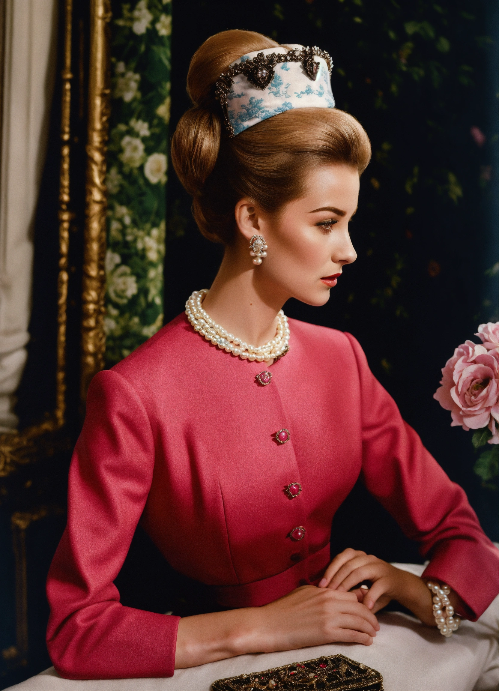 1950s glamour chignon chanel suit realistic pearls haute couture the crown bewitched cecile beaton realistic photographic toile de jouy