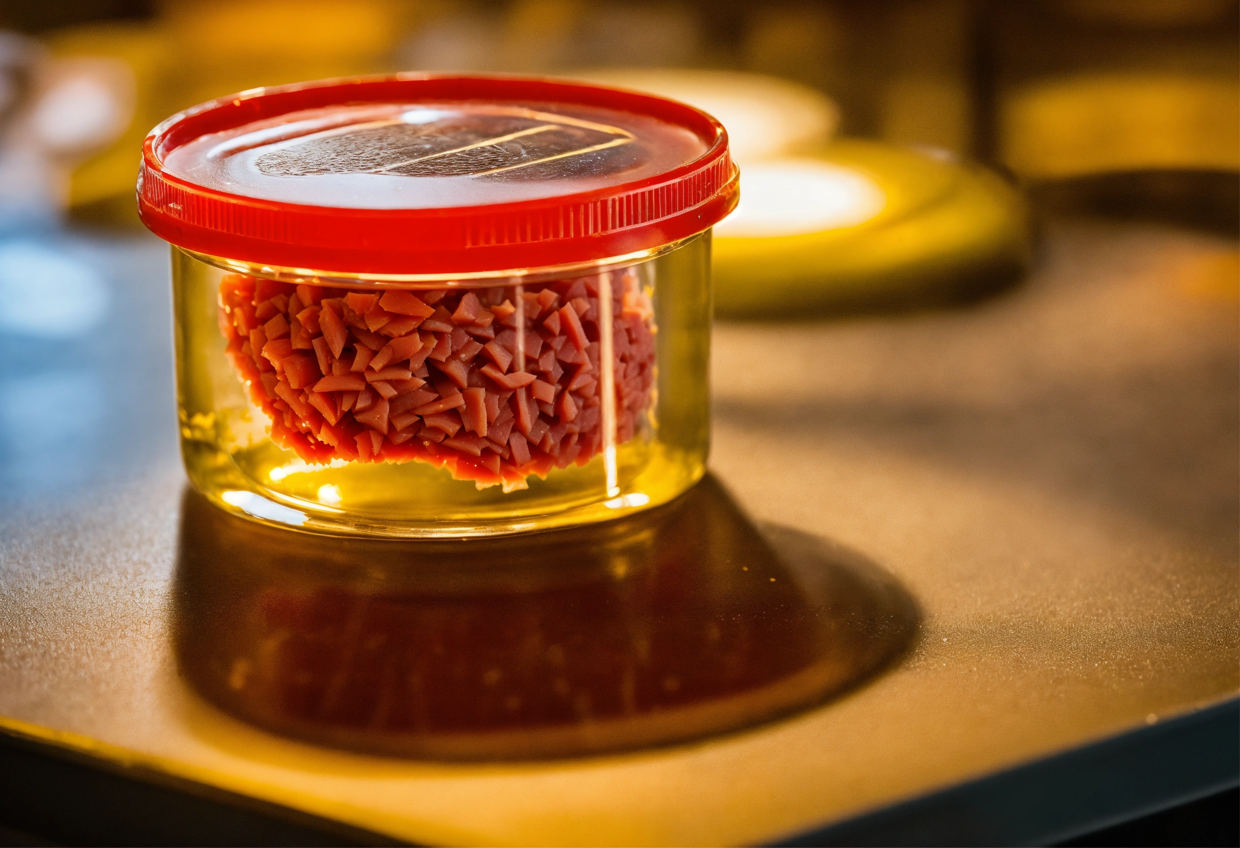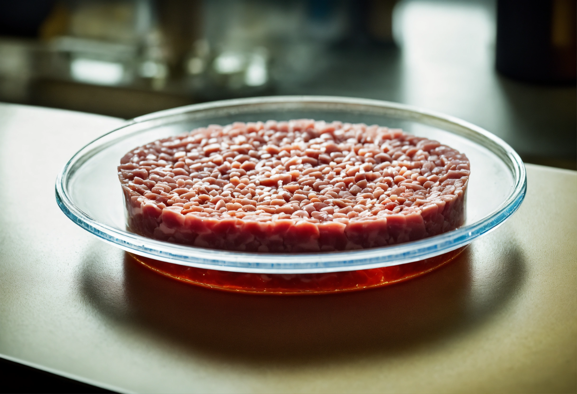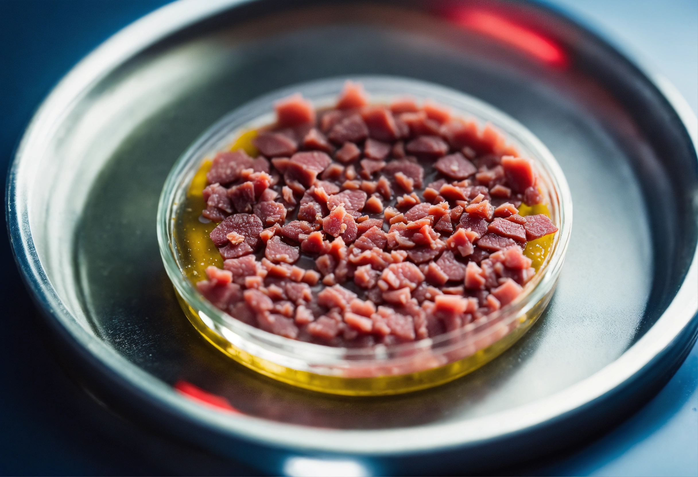 Miature piece of cultivated meat sample in a petri dish on a laboratory bench