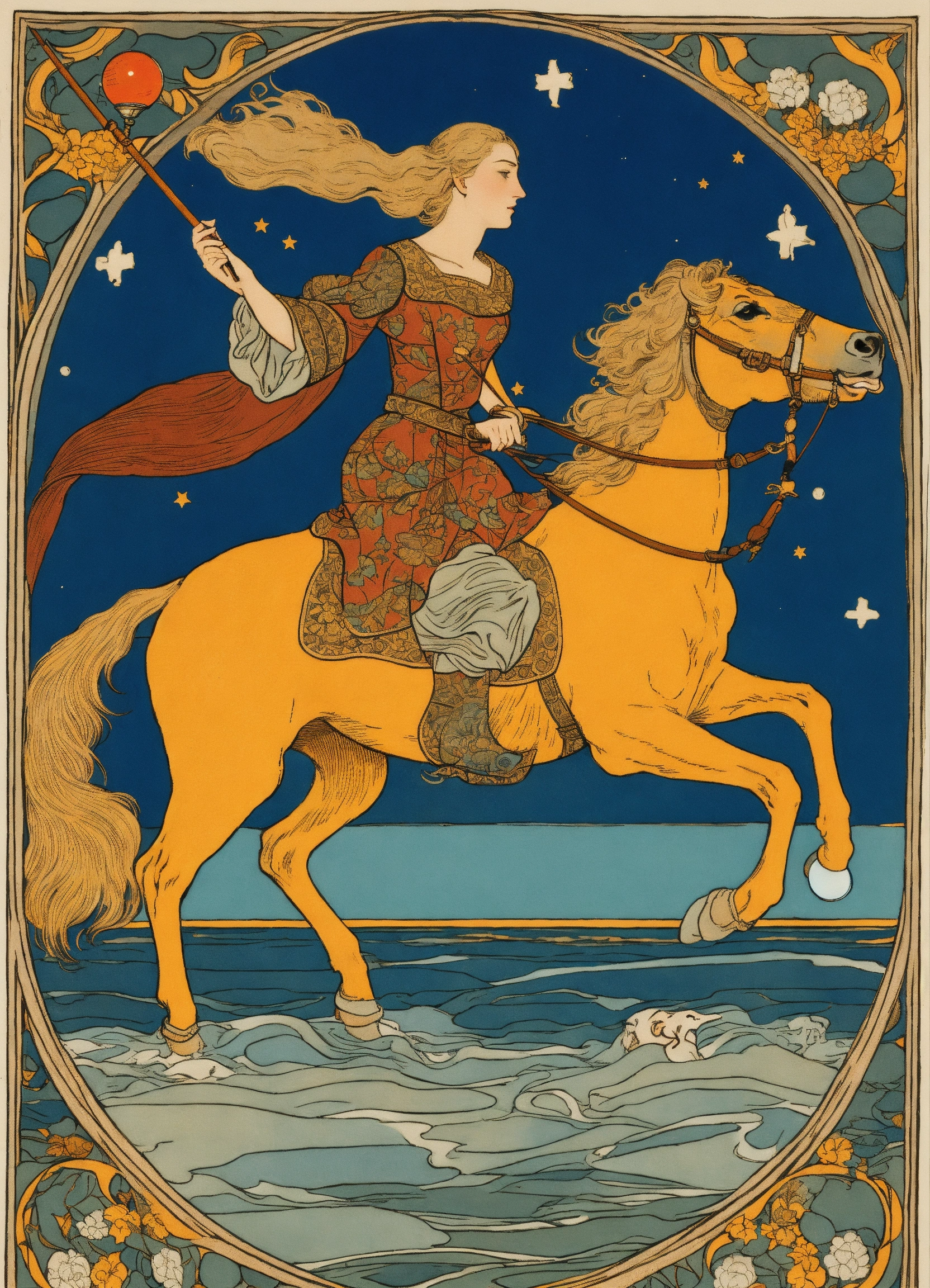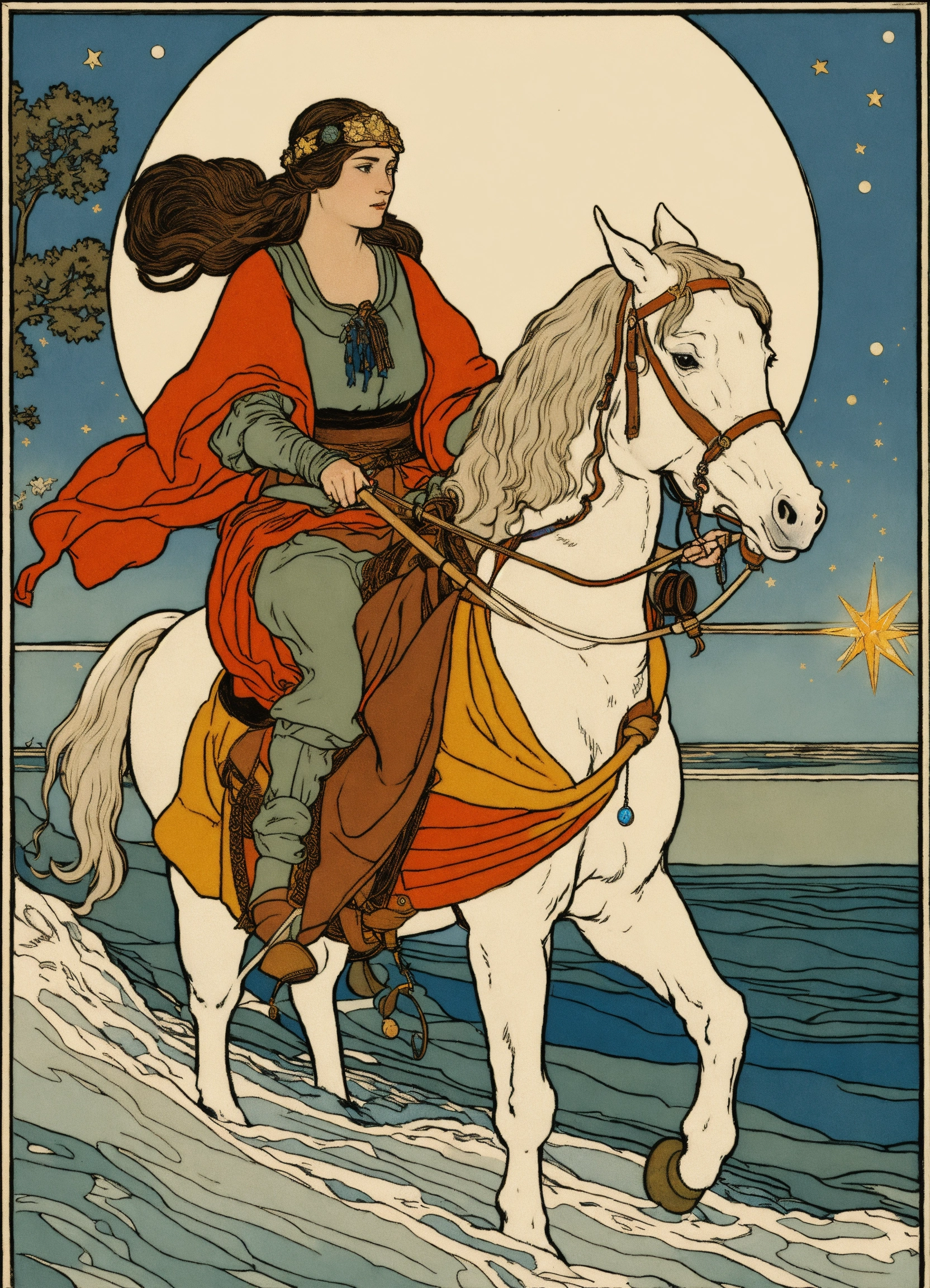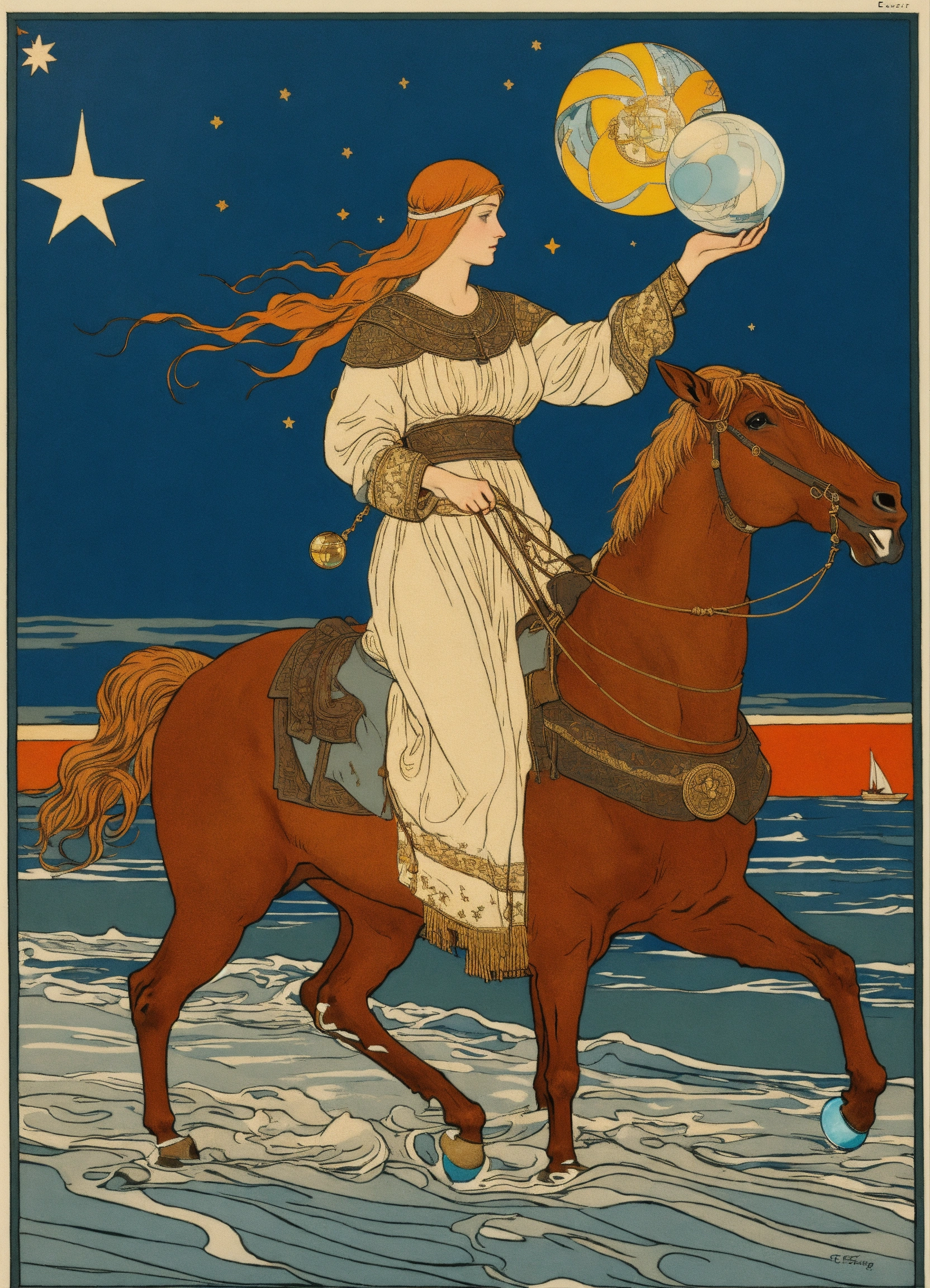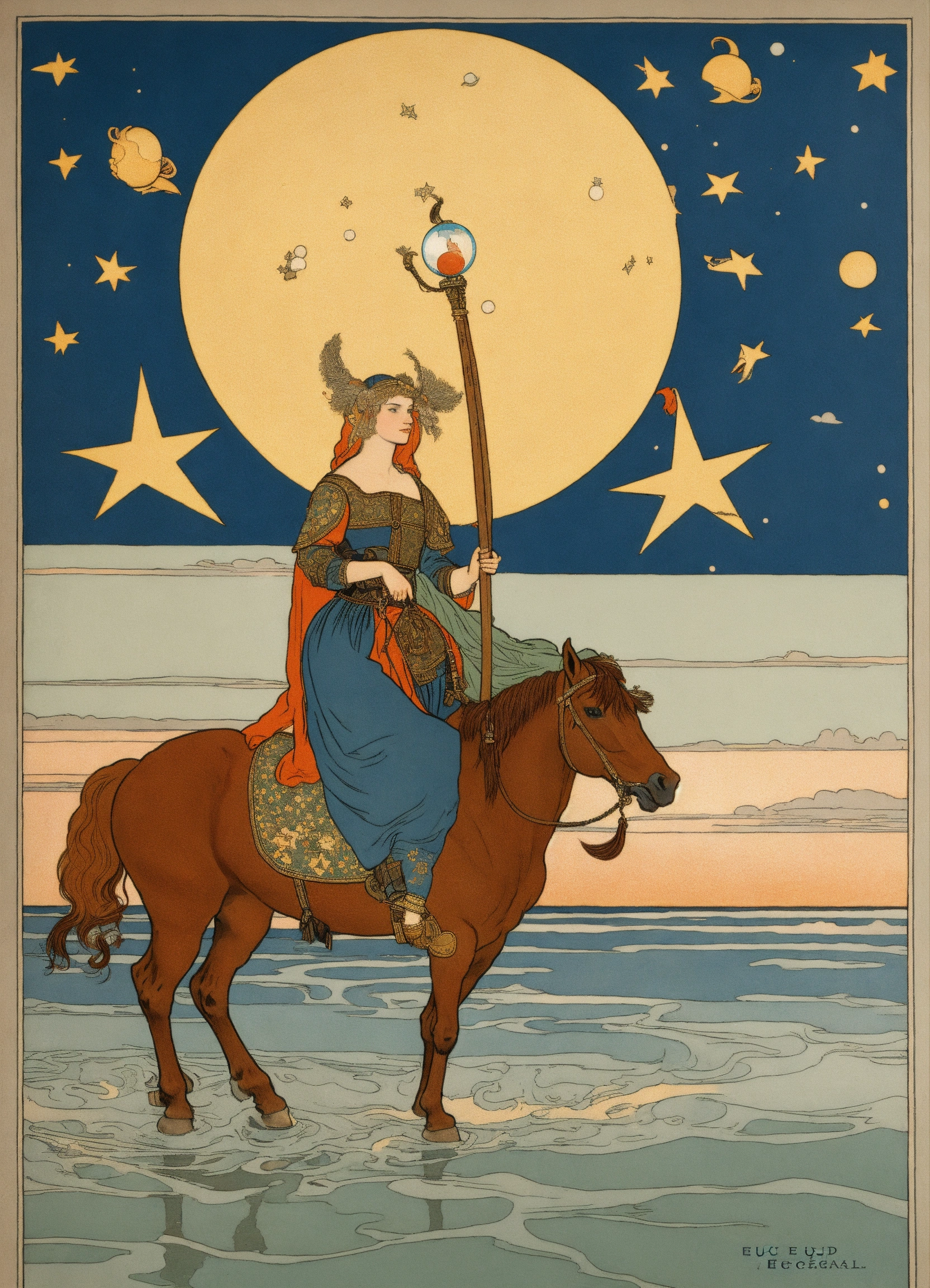 Artwork by eugène grasset old viking woman riding a horse across the sea holding a right cane he held a crystal ball in his left hand and looked up at the three stars