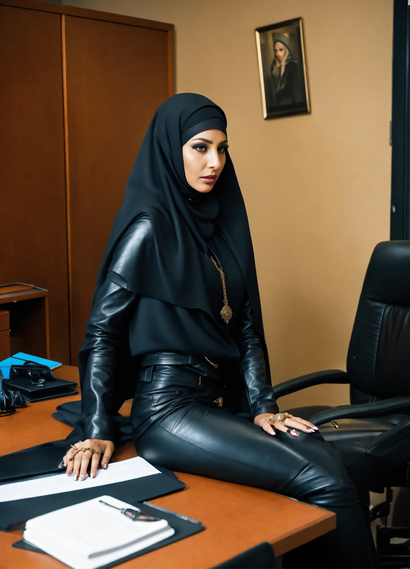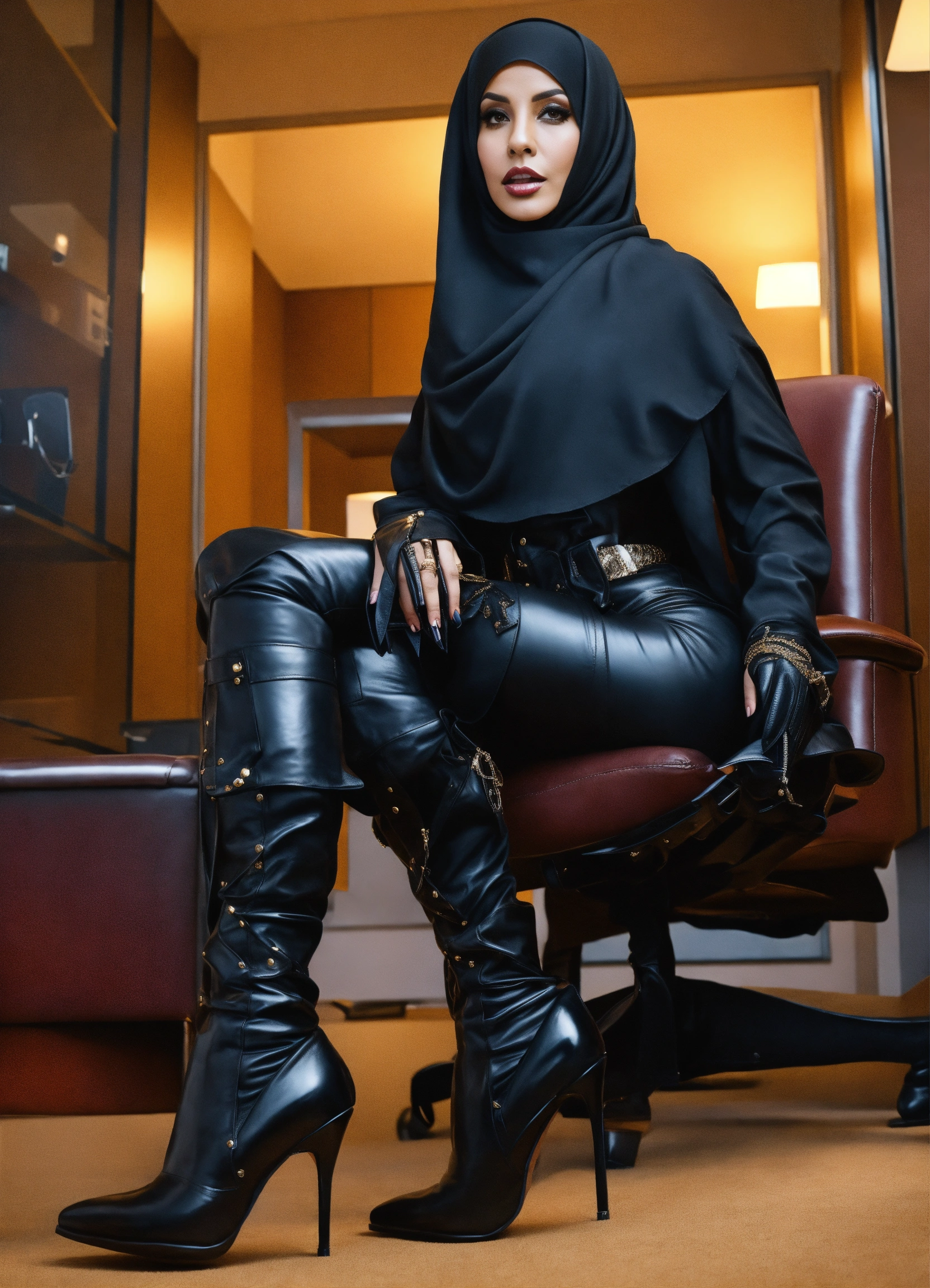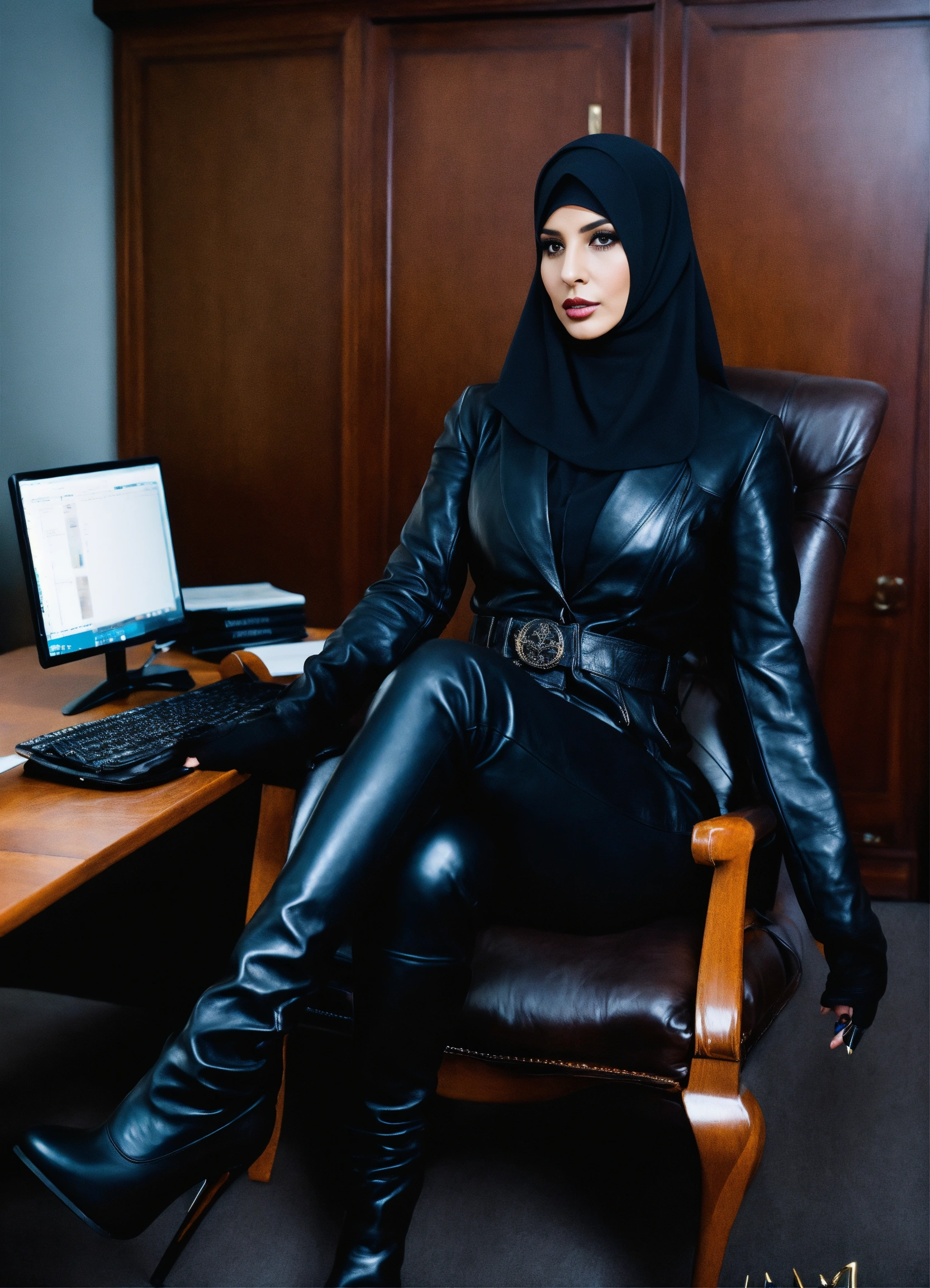 Sorceress in office suite wearing a black leather hijab niquab only her doom gaze eyes showing, black leather high heeled boots & blacl leather jobs, hypnotizng in her office