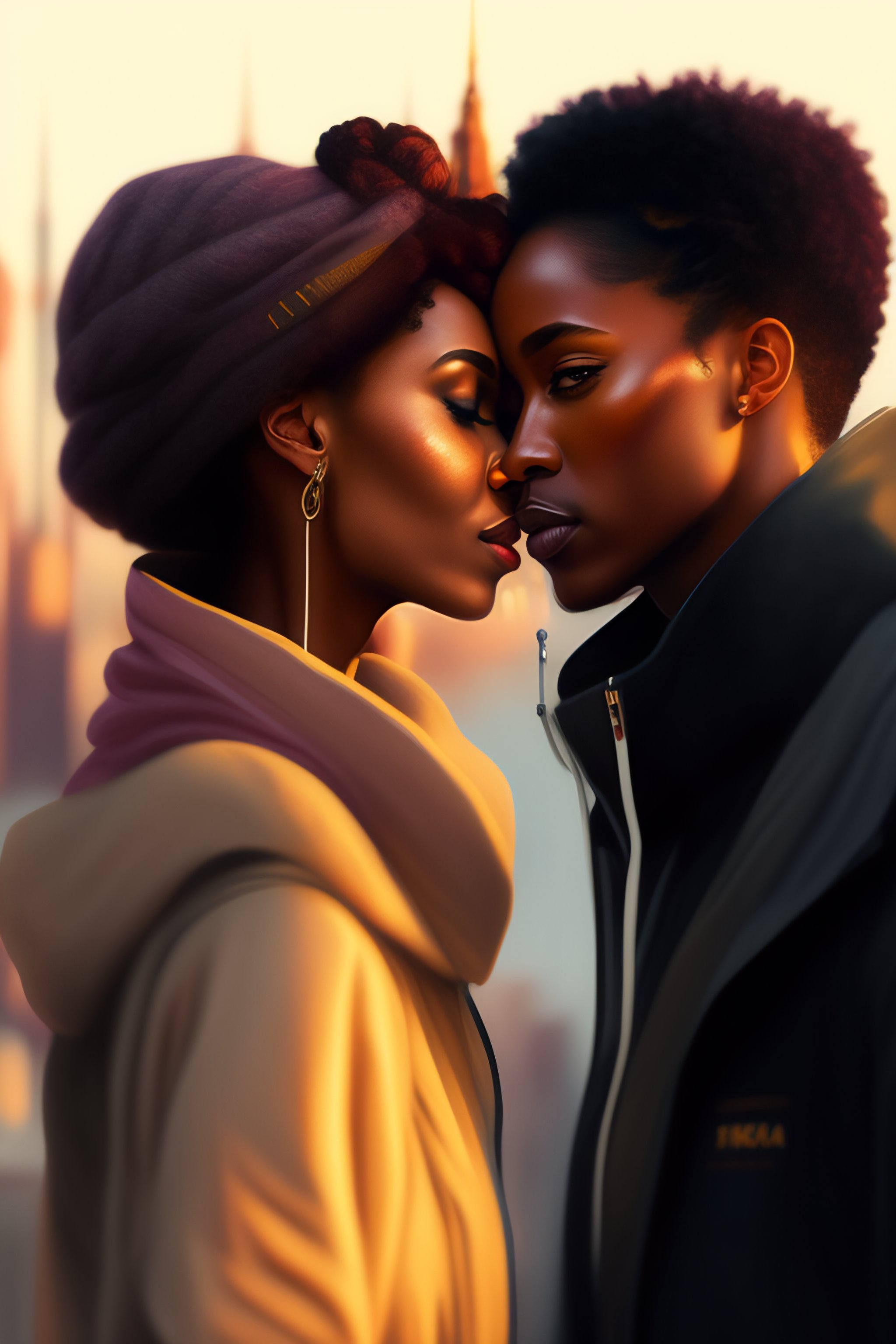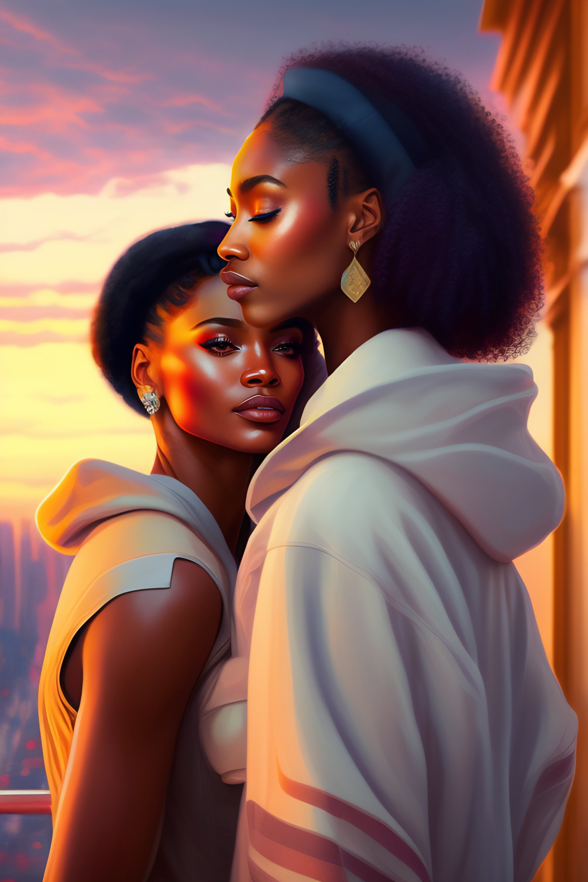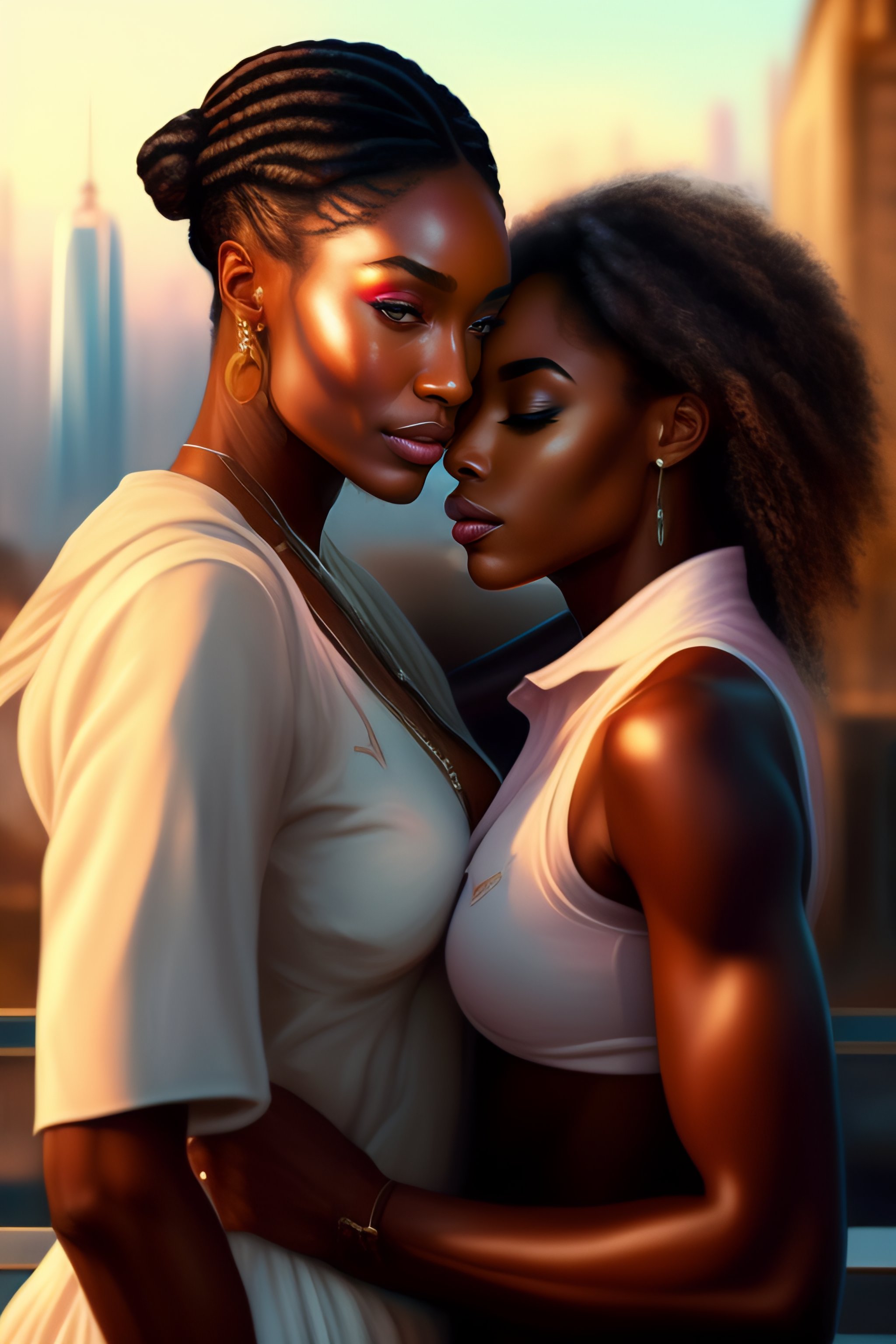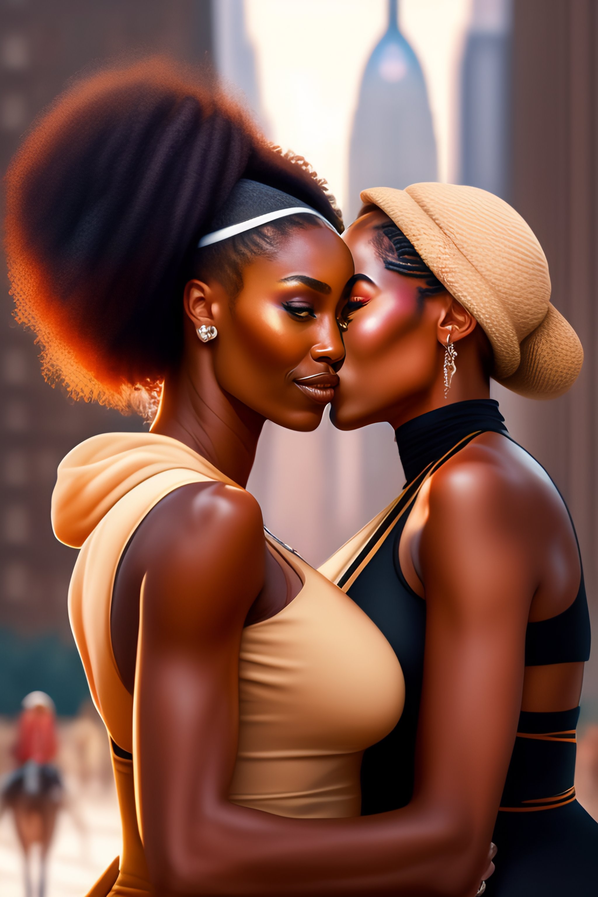 Full body potrait of jourdan dunn and serena williams kissing, lesbian love, anatananrivo city in background, highly detailed, digital painting, artstation, concept art, smooth, sharp focus, illustration, art by tian zi and wlop and alphonse mucha
