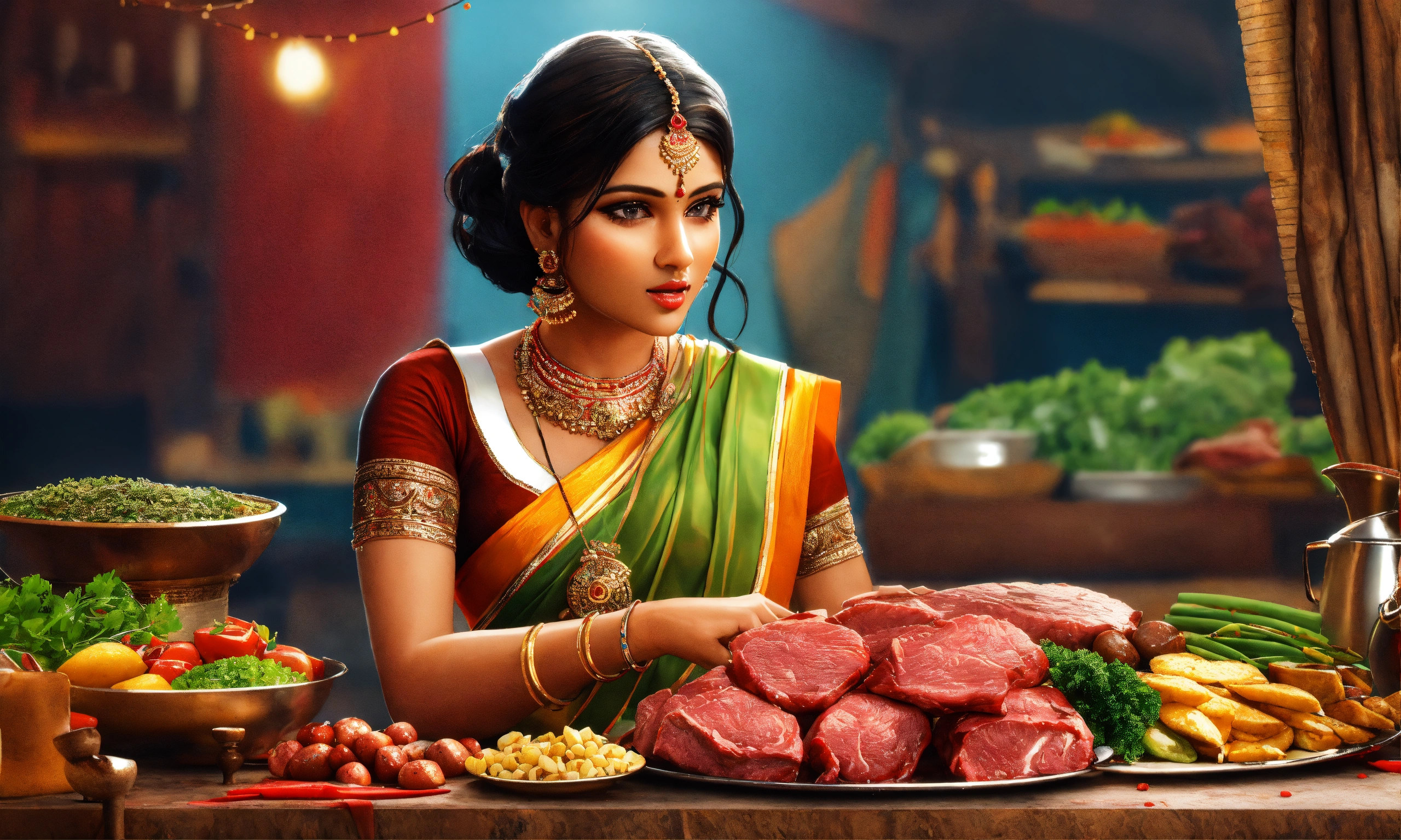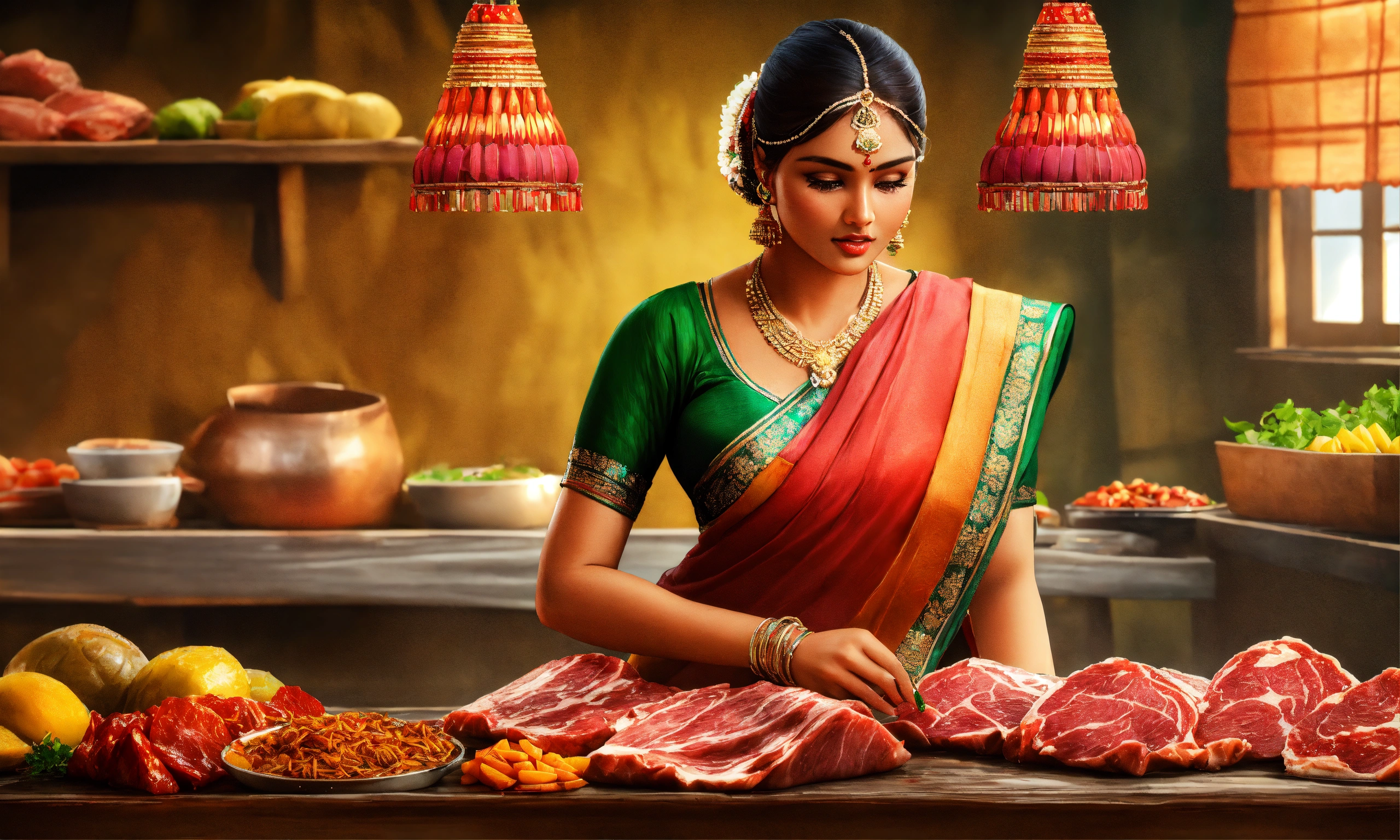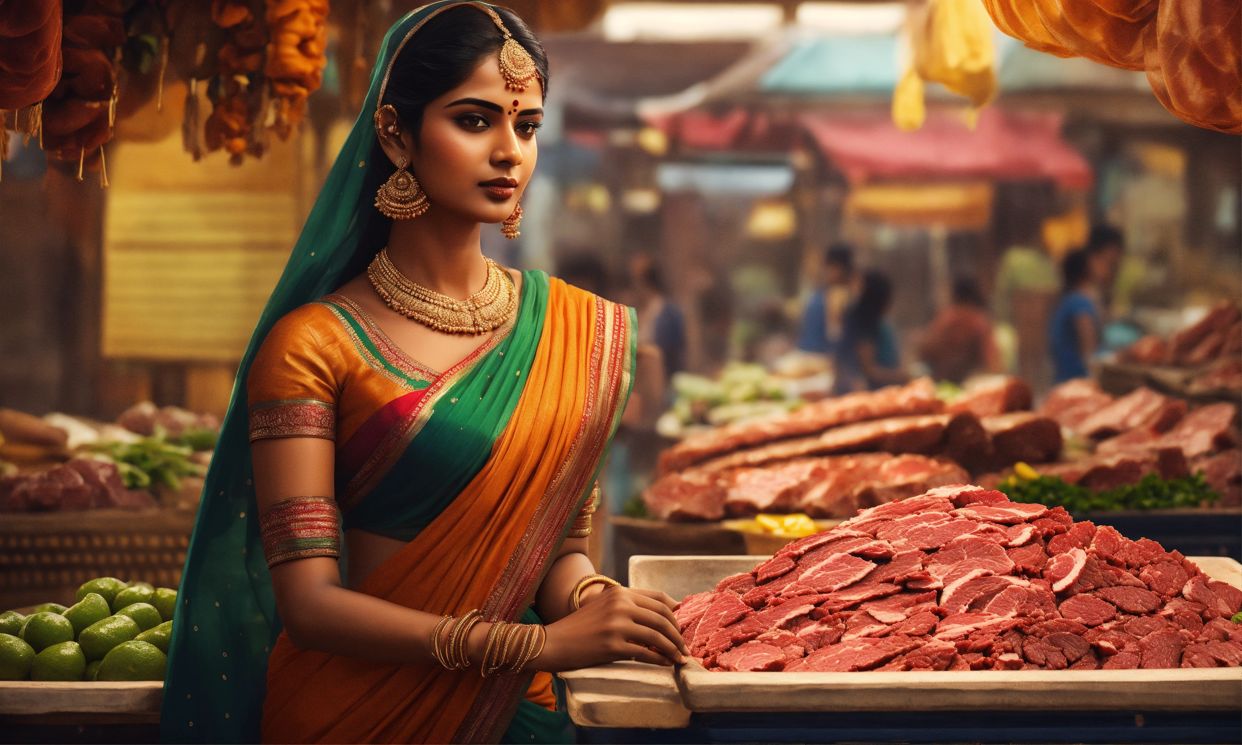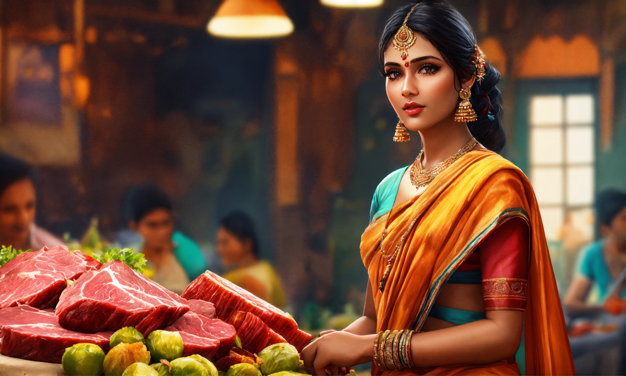 Very high detailed, ultra realistic, 3d illustration, very beautiful indian women in saree selling meat