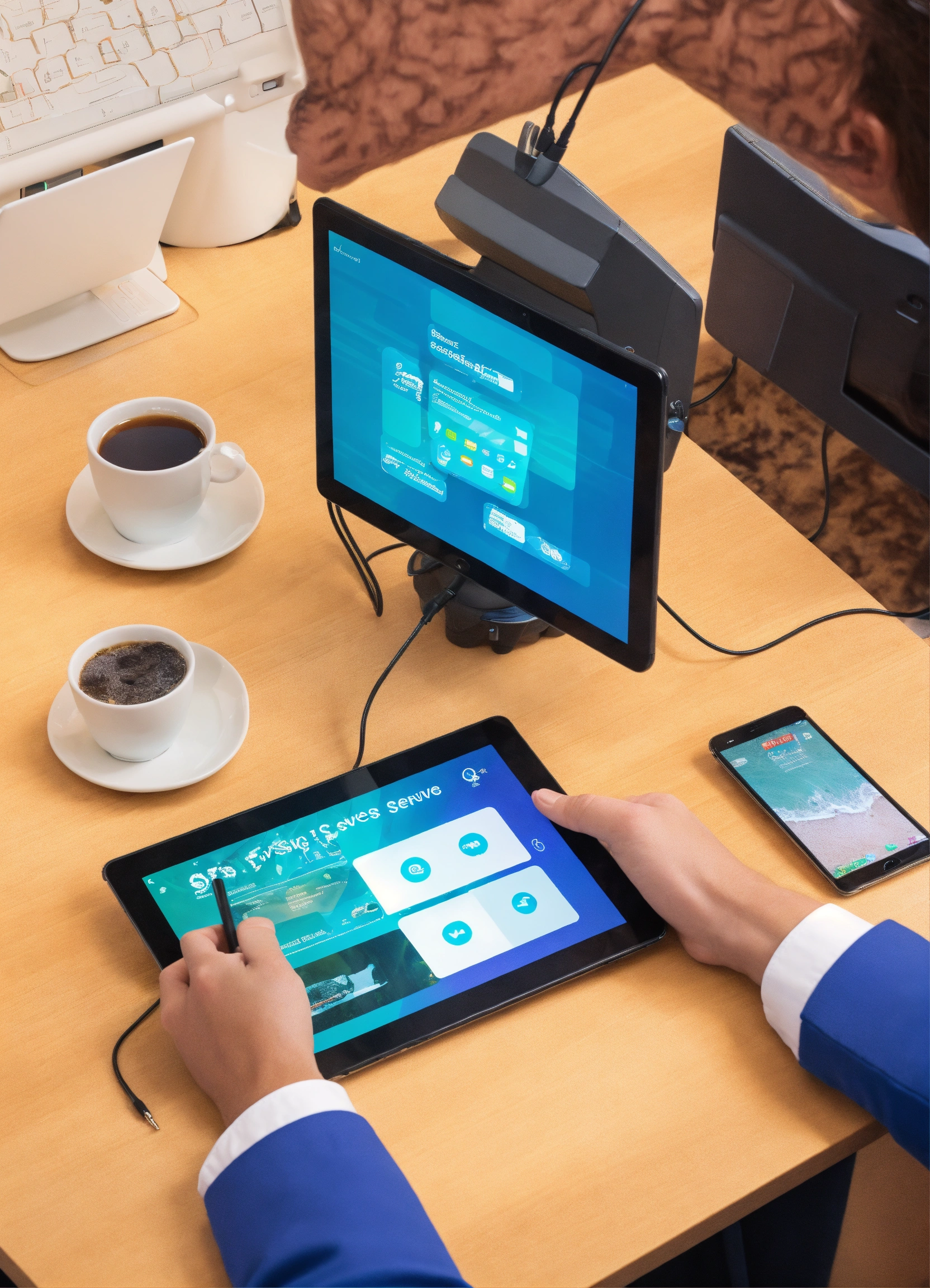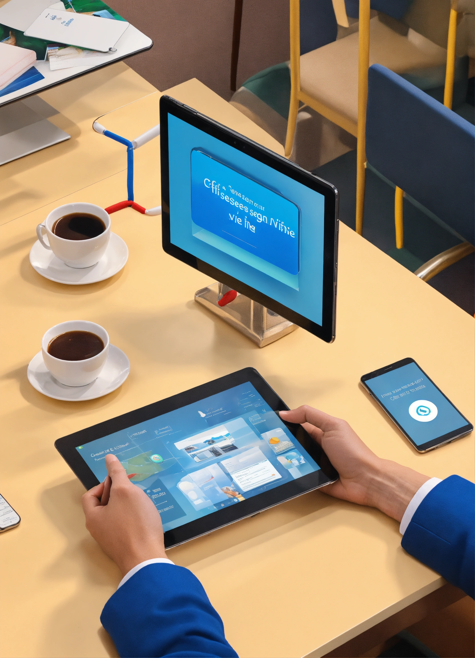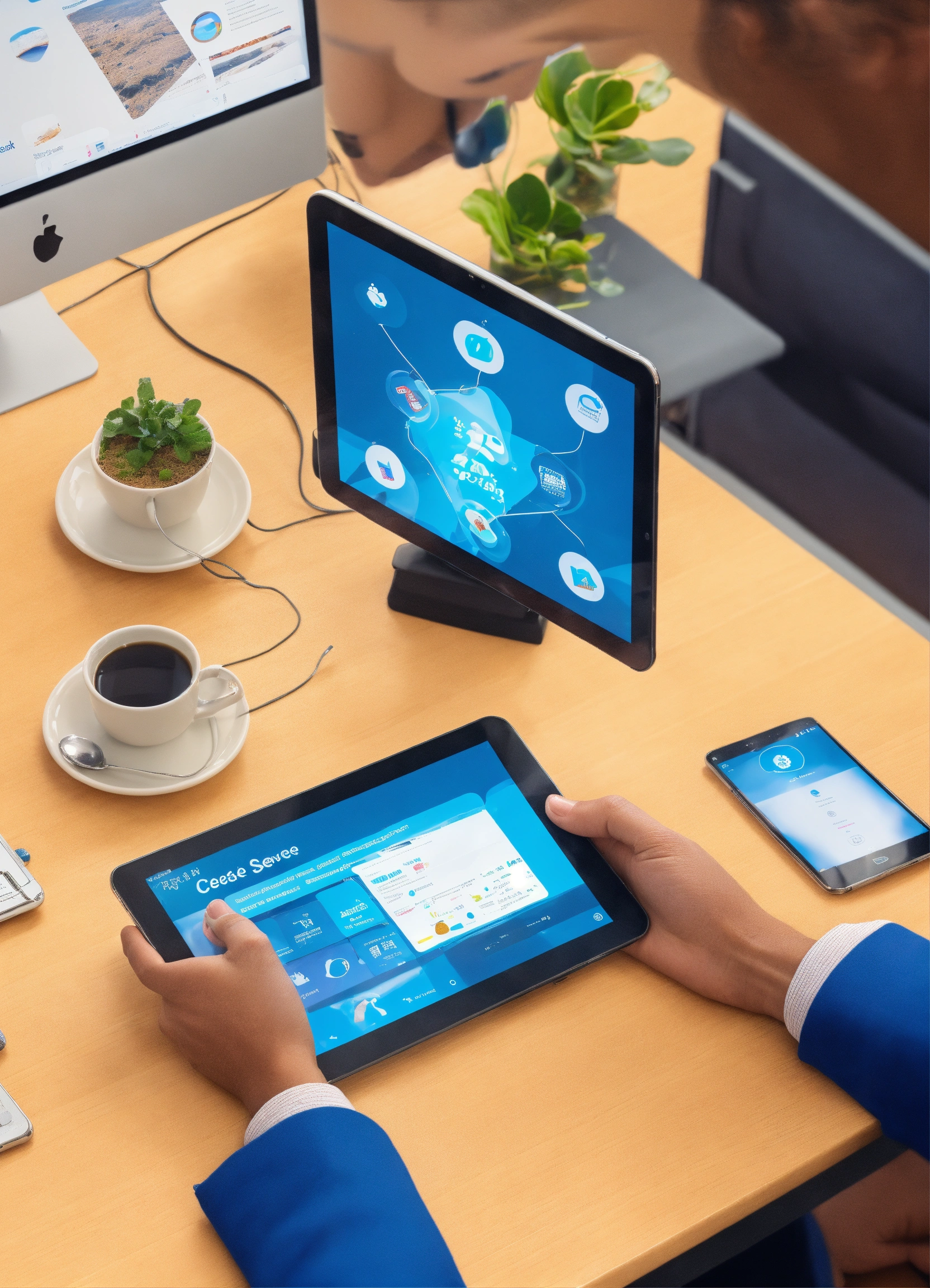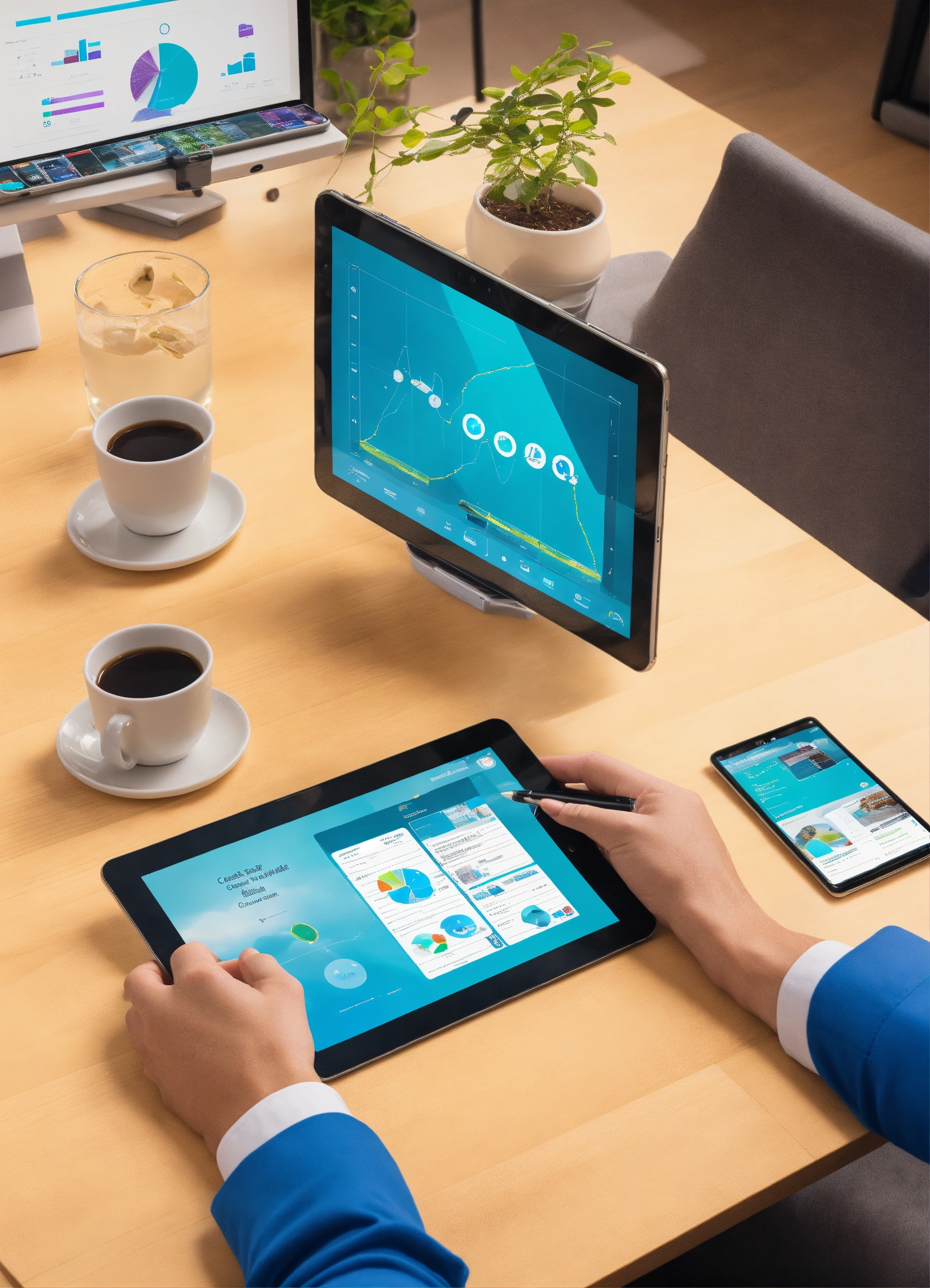 Create an office where two person serves, where there is a cell phone a tablet demonstrating visuals, big screen