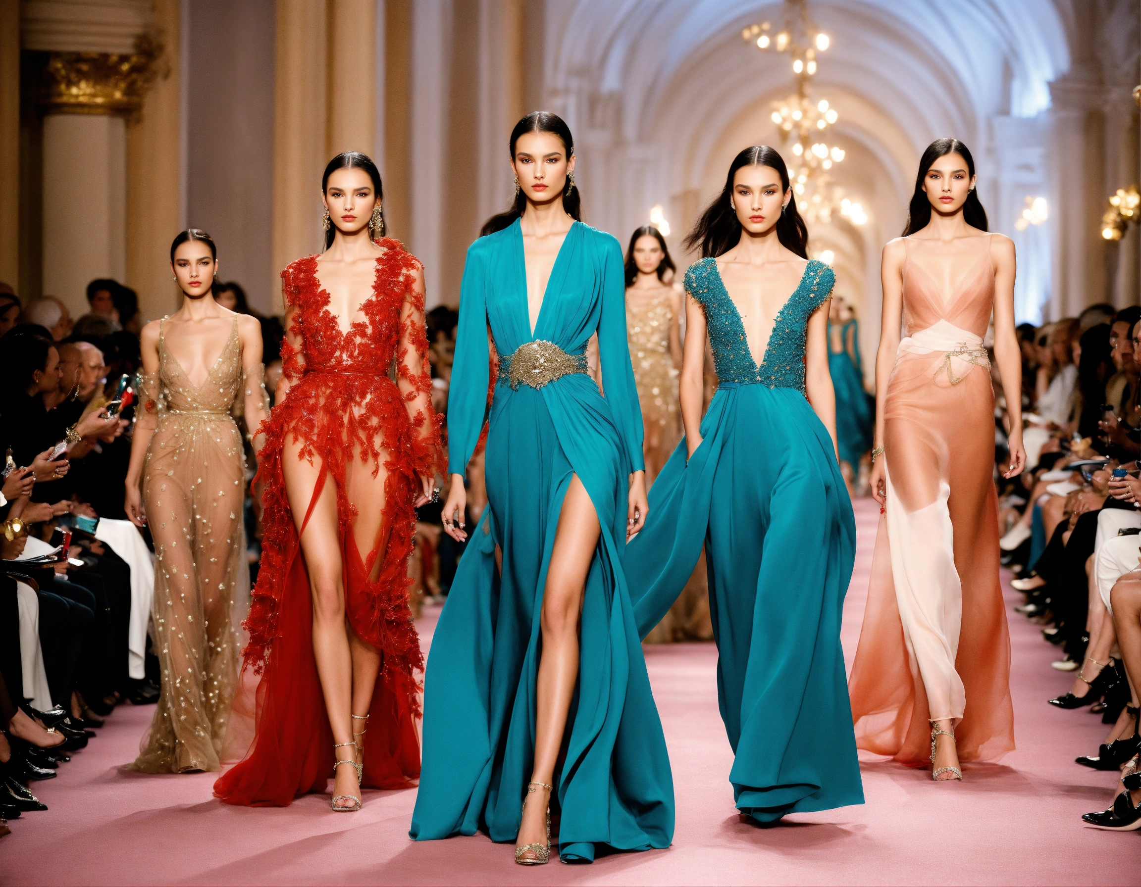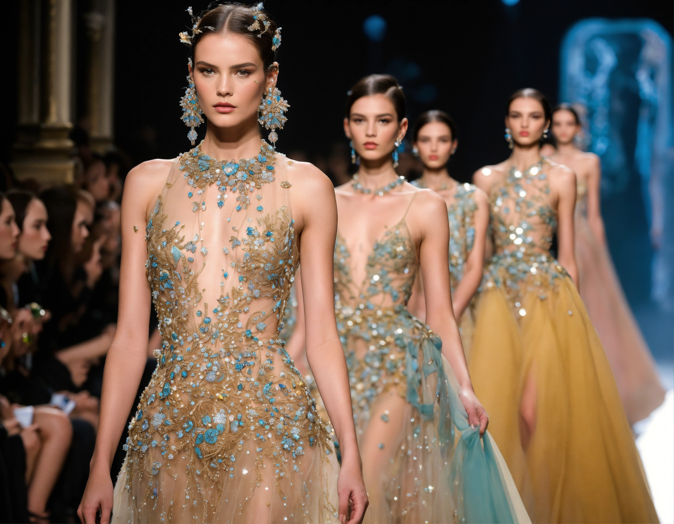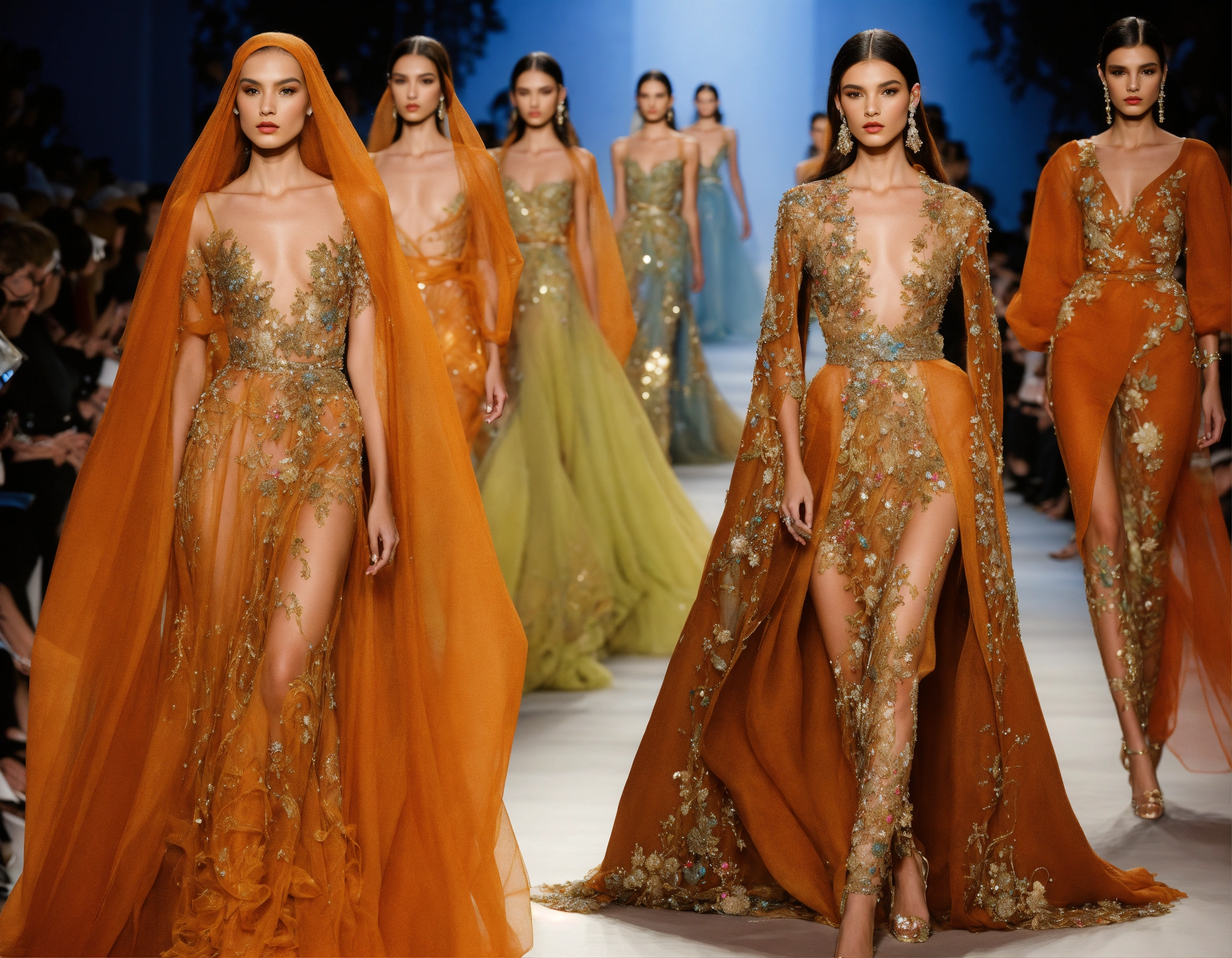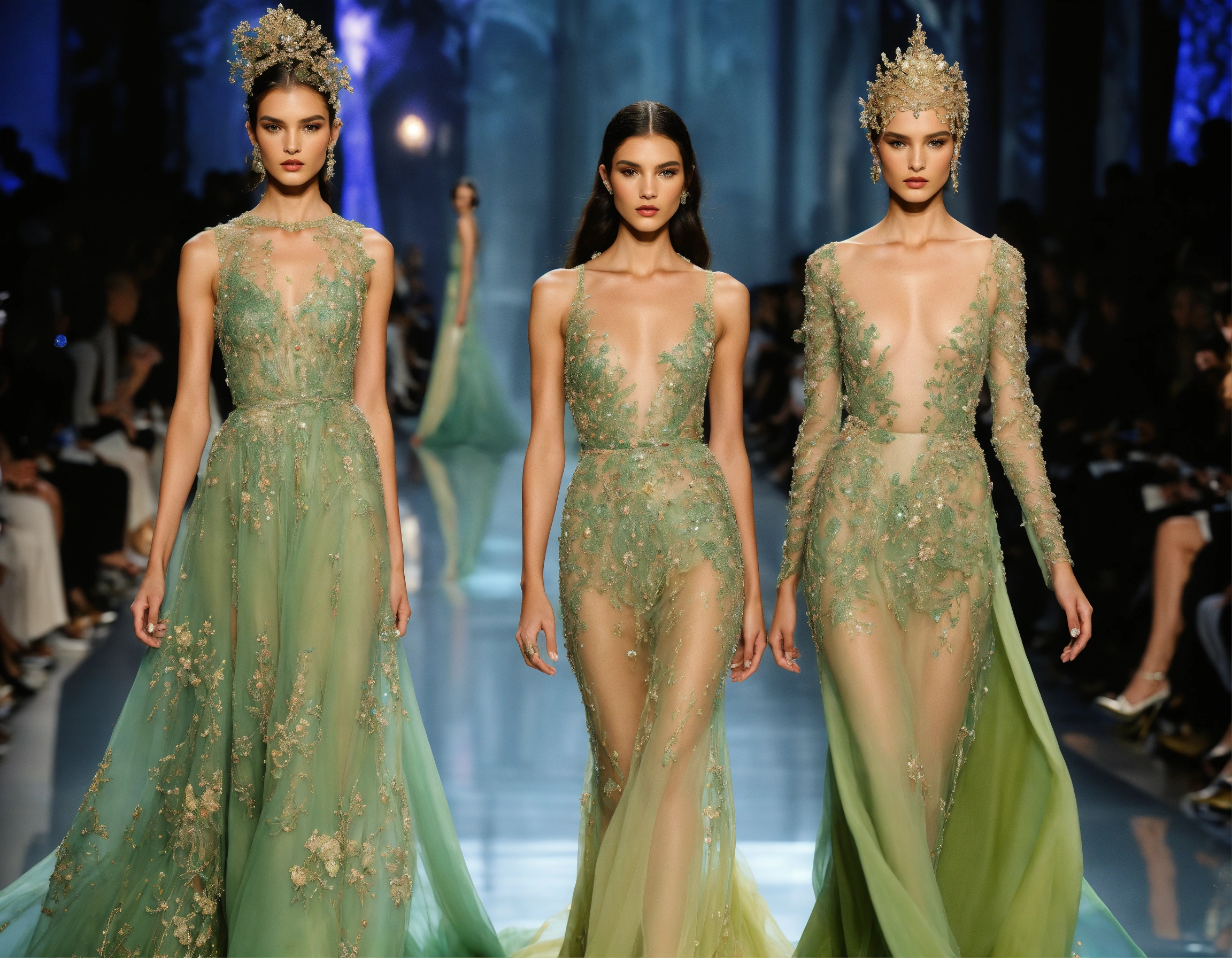 Models walking in a haute couture designer runway show, for elie saab, year is 2300, mythology and fashion are intertwined, we are on the brink of collapse and aliens have joined earth. these designs need to incorporate and become a sign of the times, yet dont make the garments too wildly out there, they need to be wearable couture. finest embellishments, silks, laces, beadworks, crystals, etc. expensive