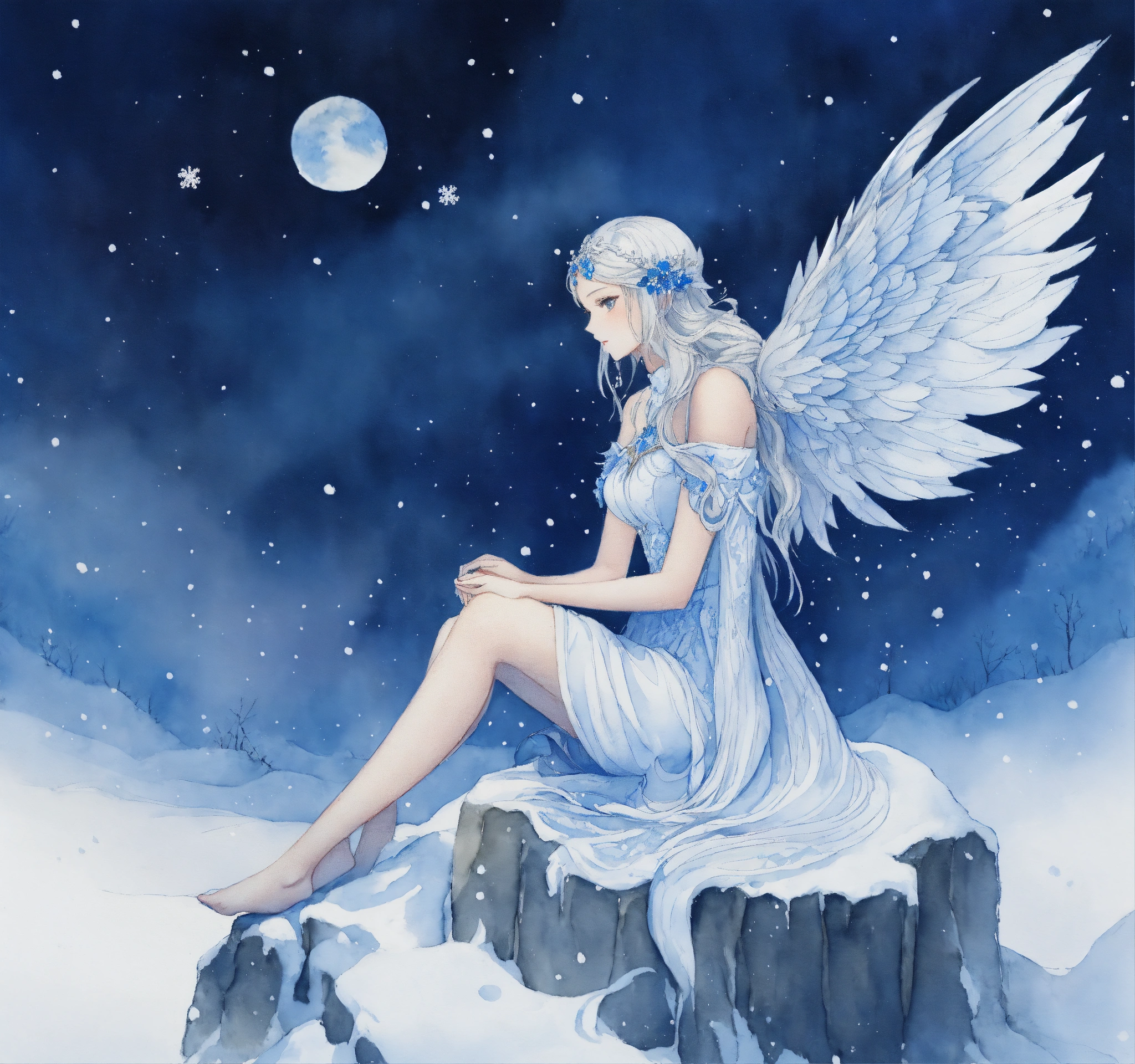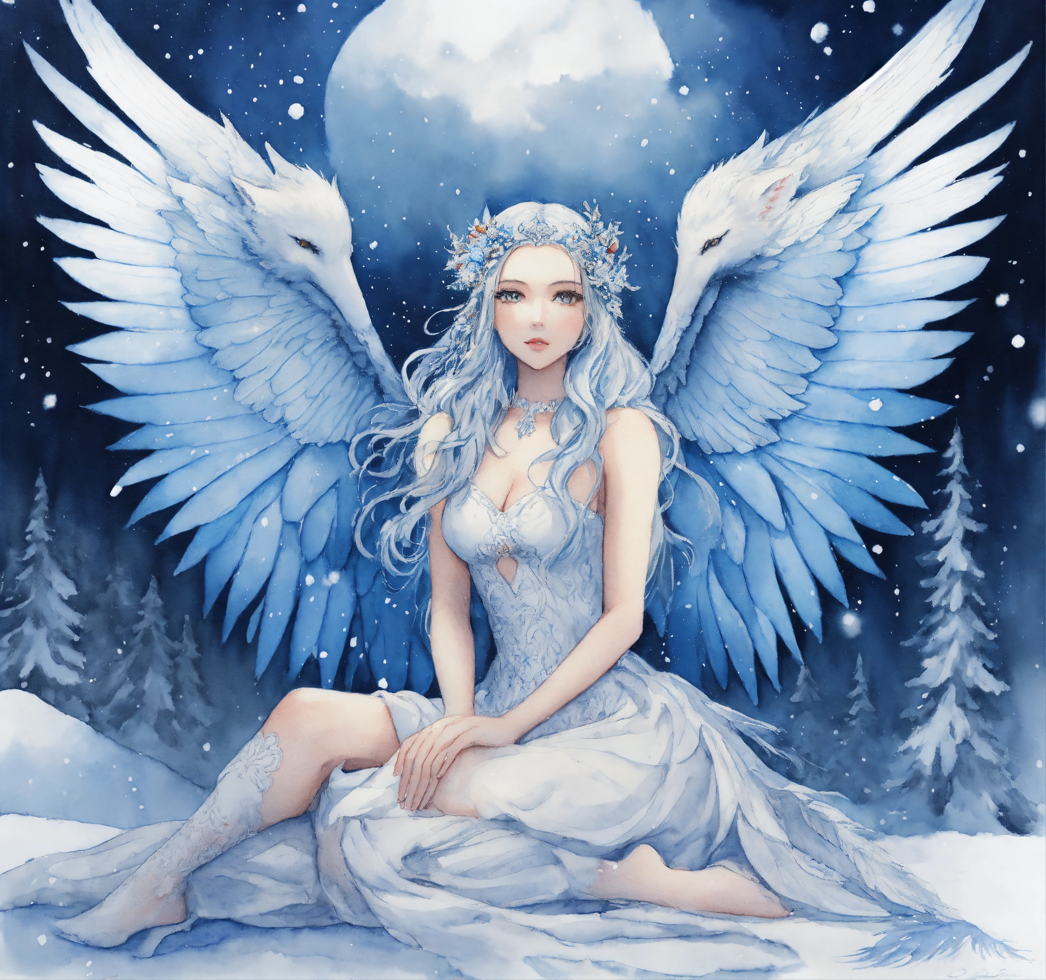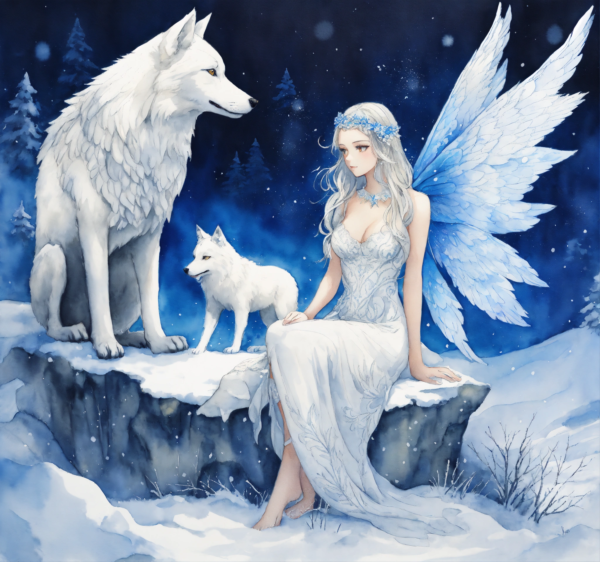 Illustration, drawing, intricate features, winged female fairy front facing wearing a white dress sitting in the snow beside a white wolf sitting in the snow, watercolour, snow background, deviant art, blue wings on fairy