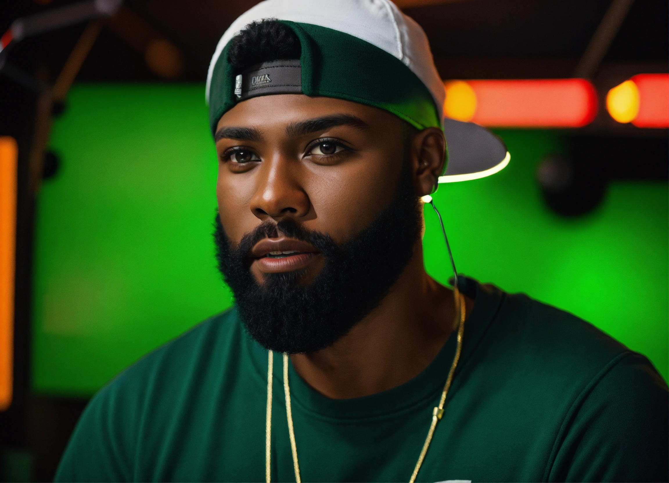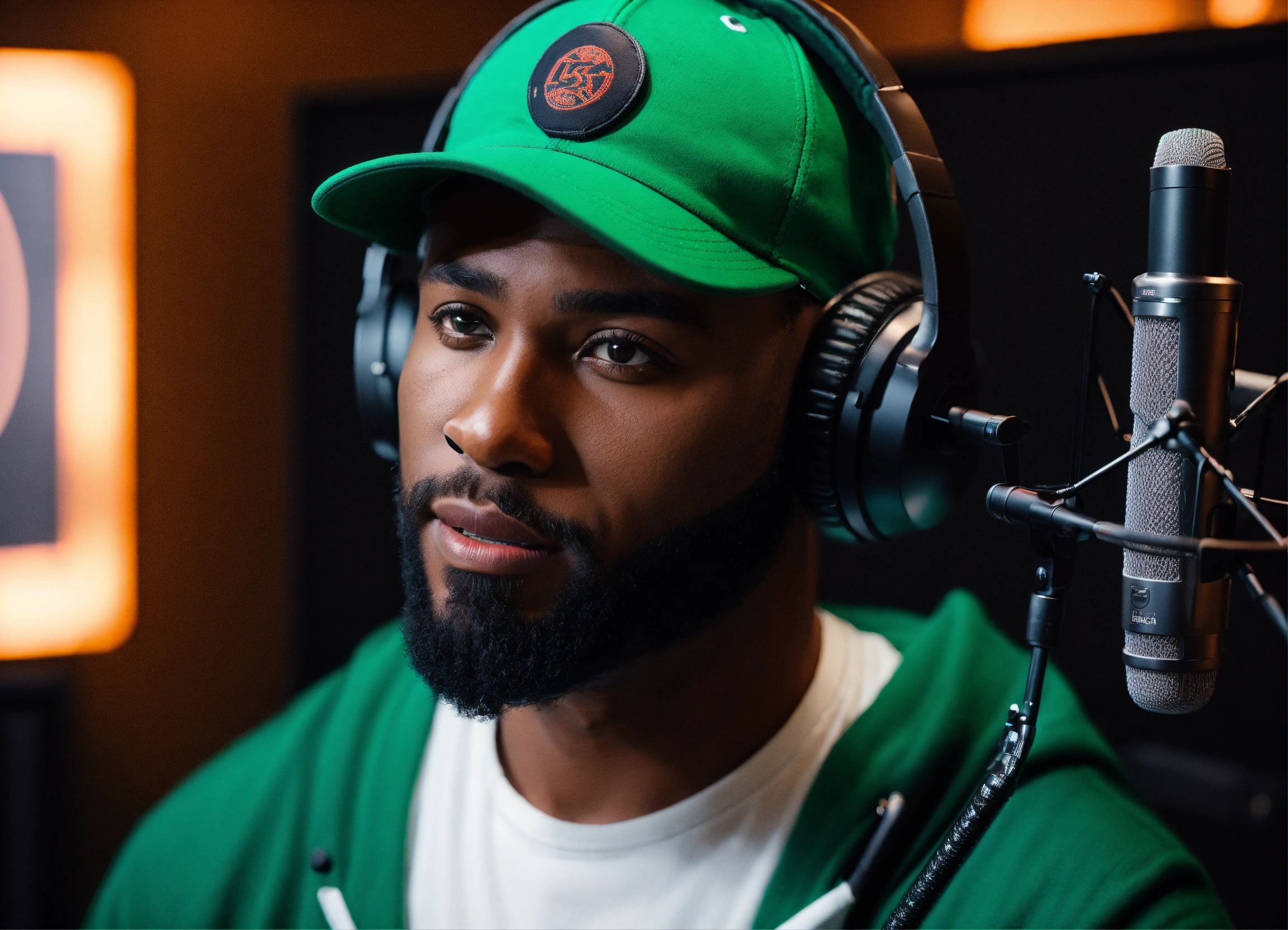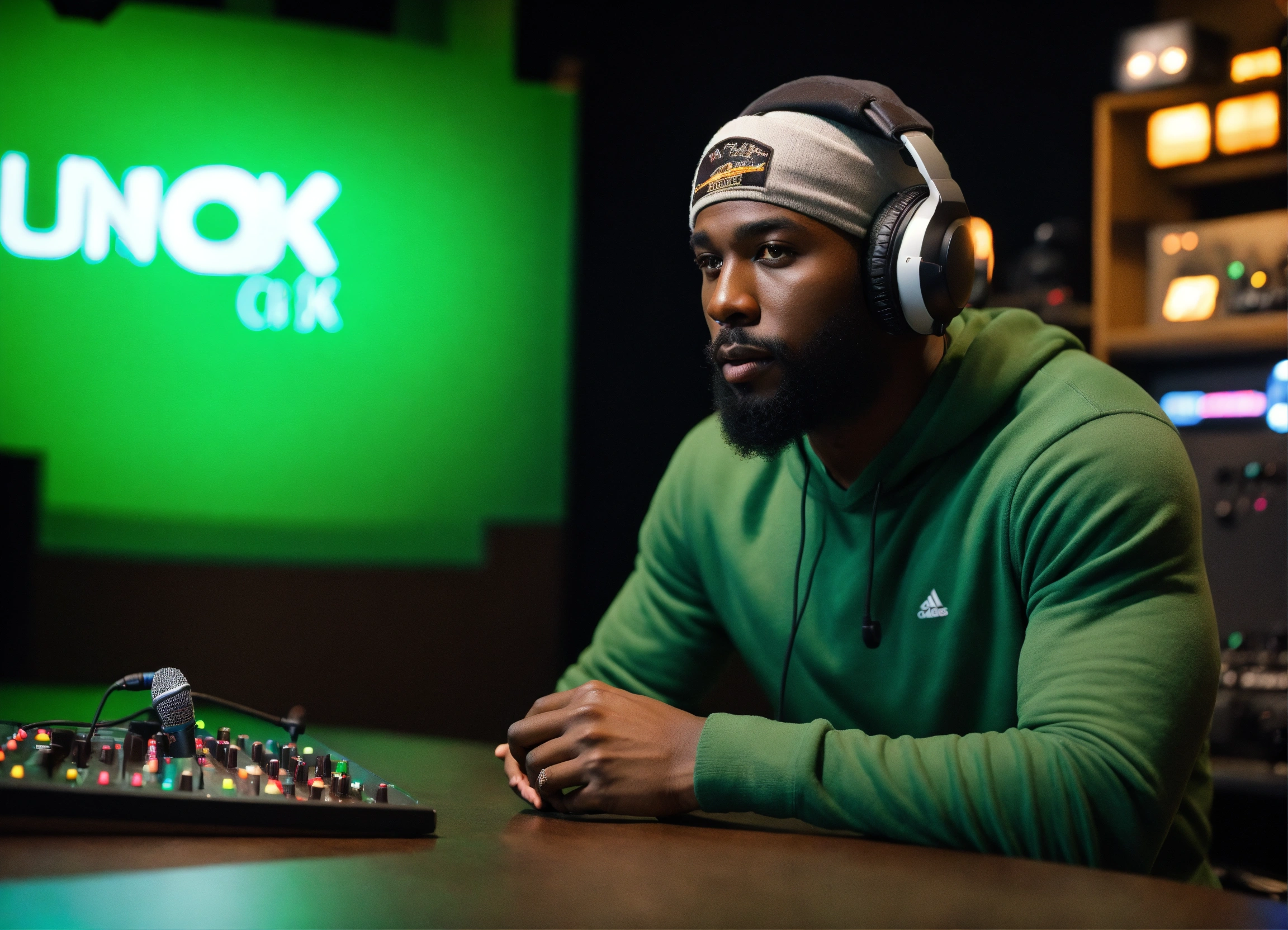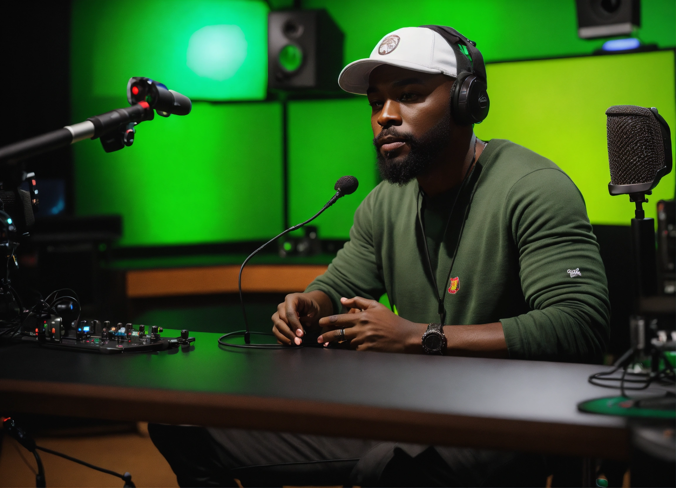 Real photo of a gugu e michaels chocolate dark skin tone handsome black man with beard, bald with white cap, talking into a mic with a short mic stand at a podcast studio, in a very large fancy studio, wearing long sleeve to the writst green sweat shirt and white atlanta sun visor, black jeans, very realistic, ultimate detail, 8k, face front looking straight into the camera, 8k, expensive recording studio with dark brown background, extreme detail, cinematic lighting, face front, brown eyes looking at camera.